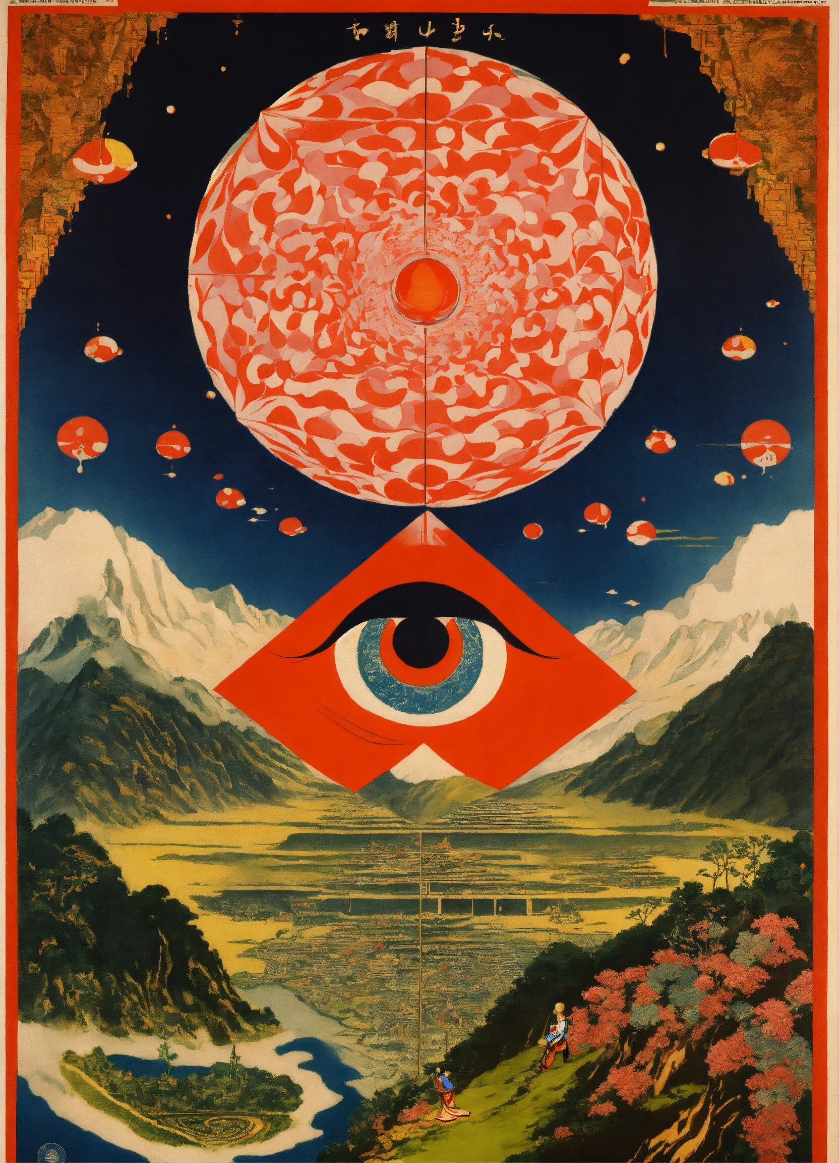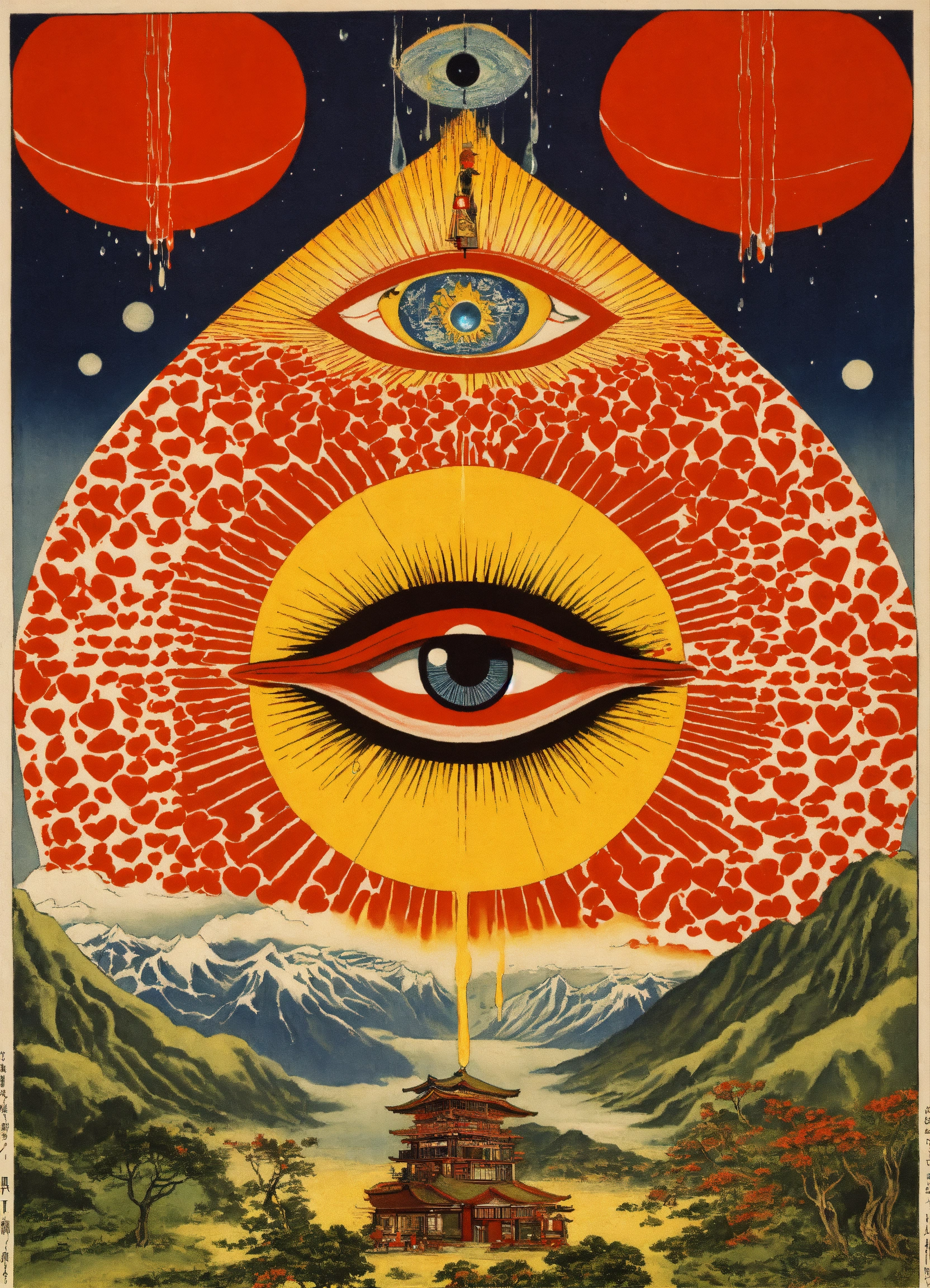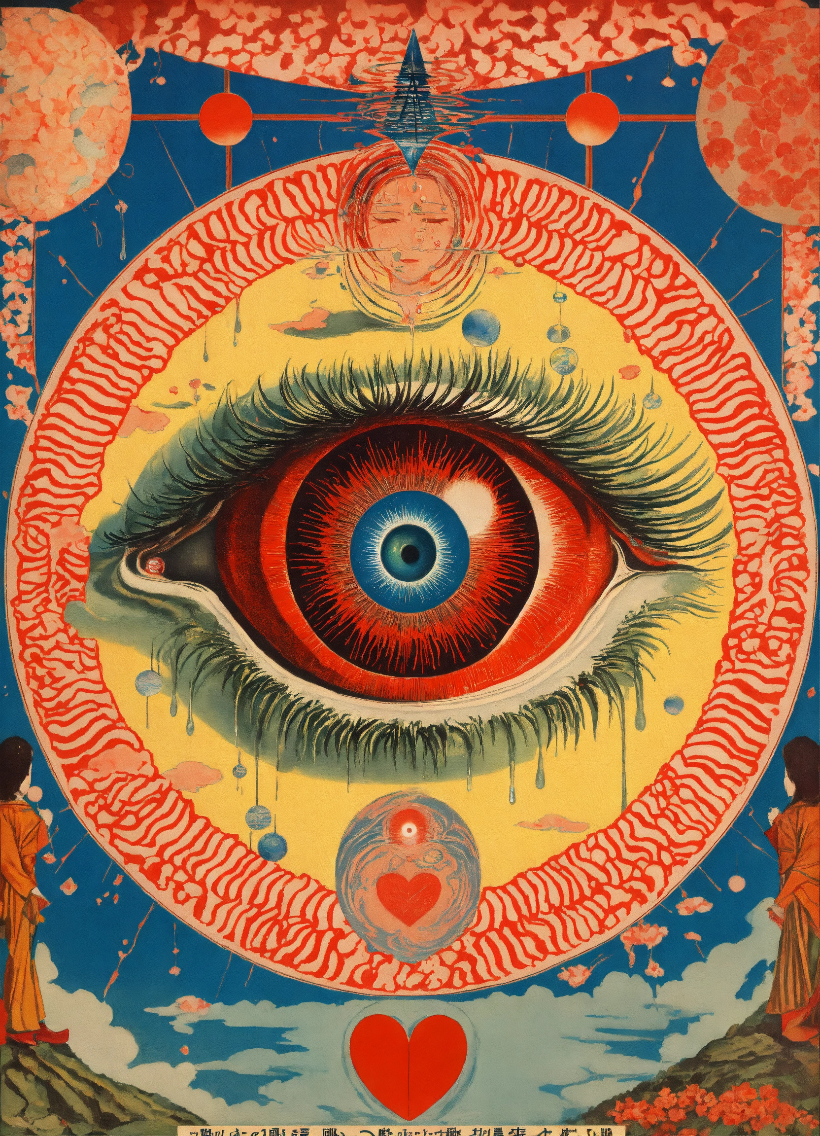 Japanese vintage poster, third eye emerging from man head containing all four corners of the earth, dripping love heart dripping onto psychedelic background by maurits cornelis escher