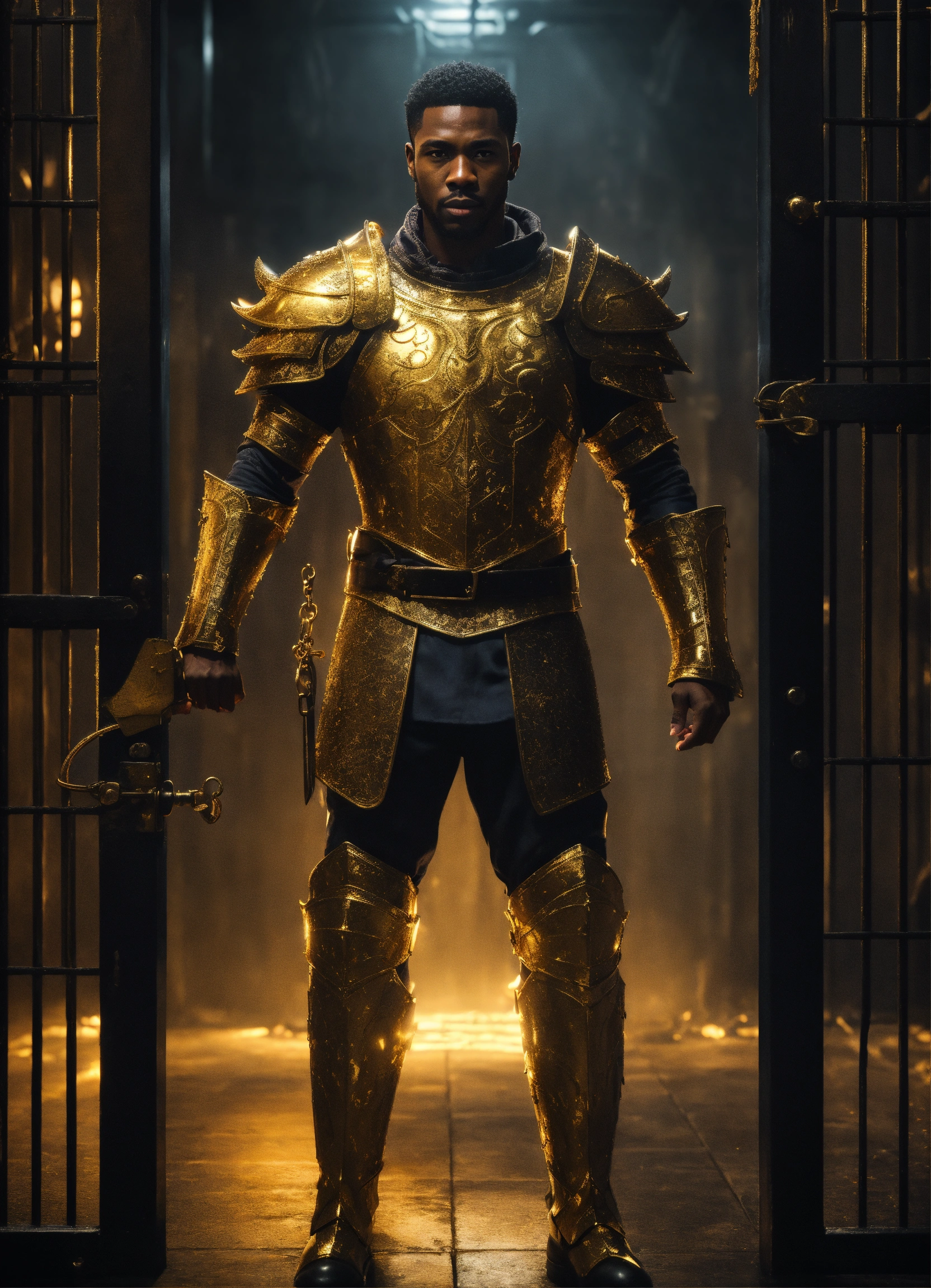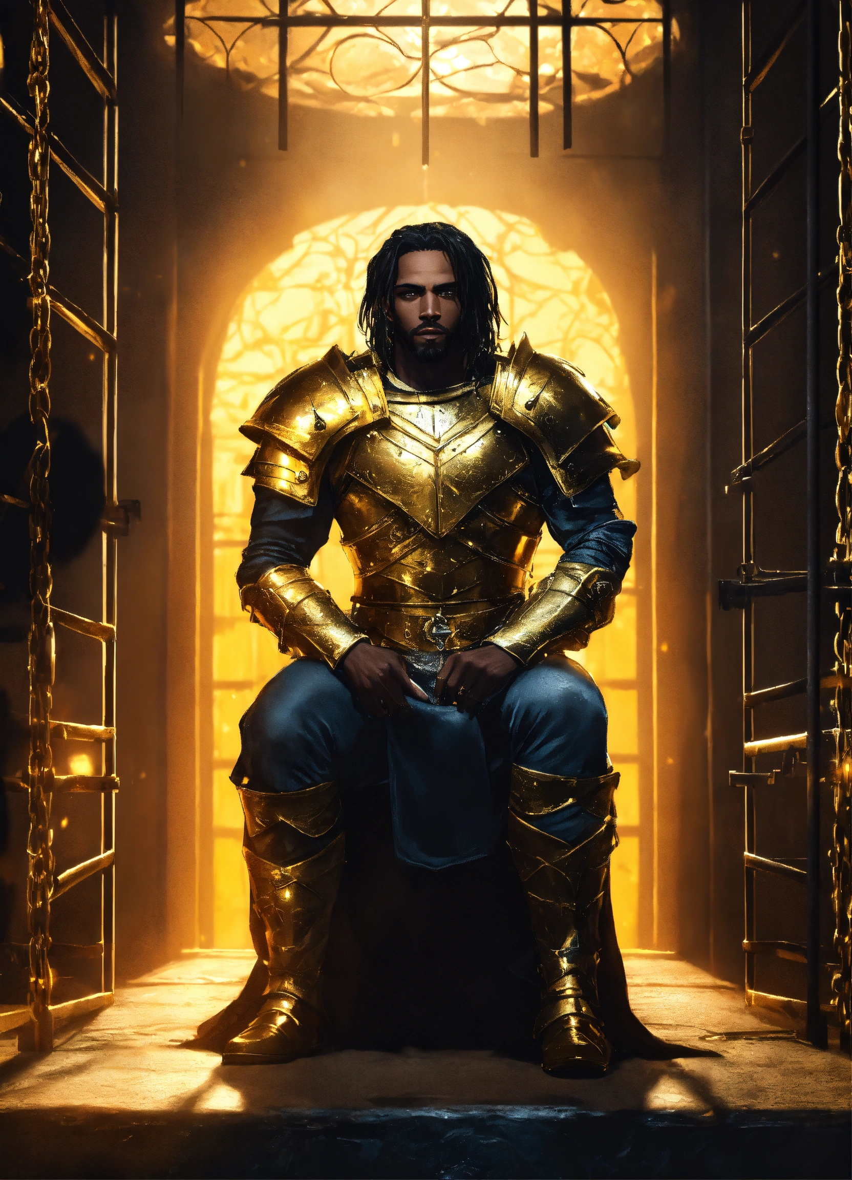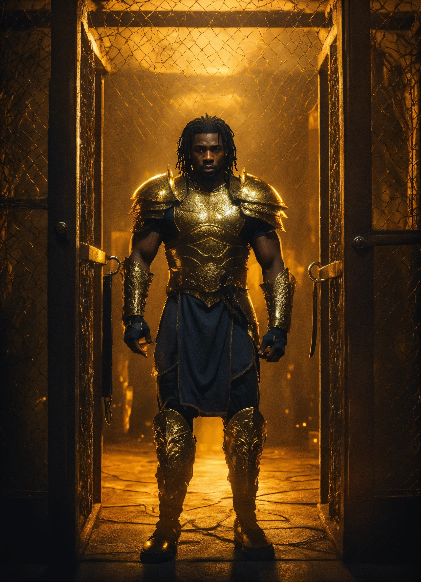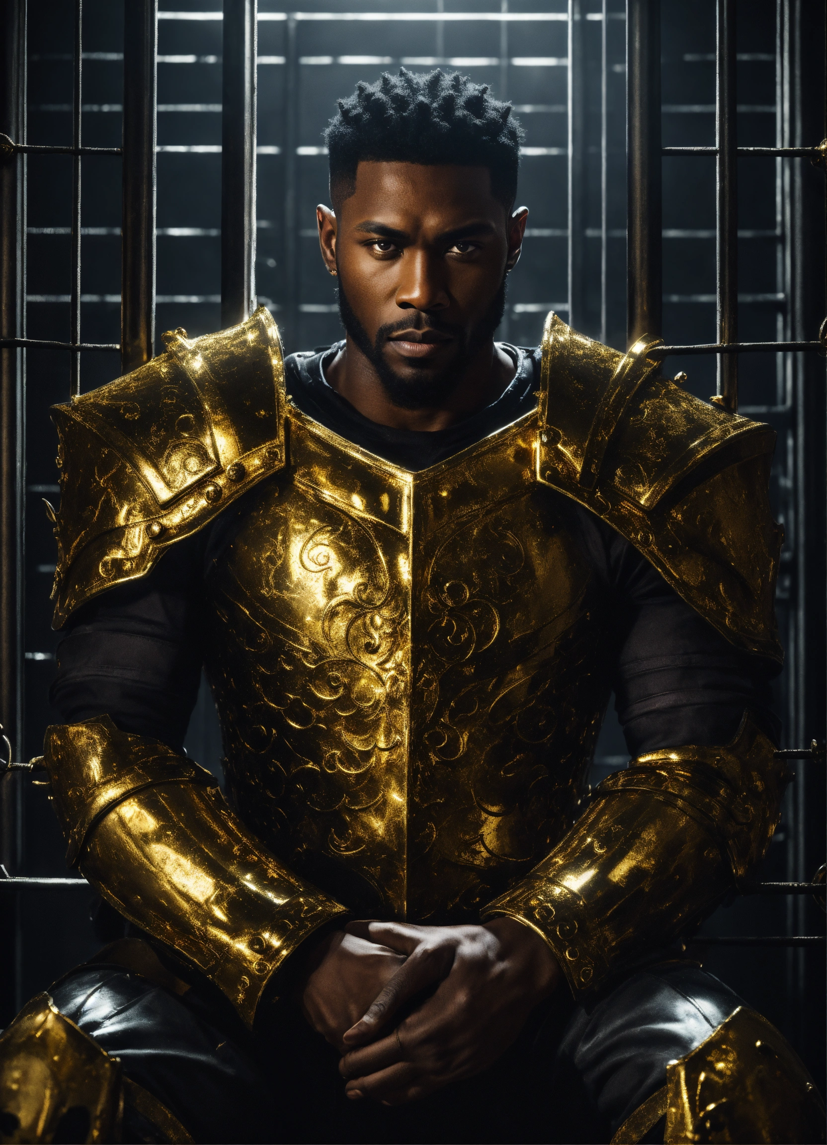 Handcuffed, a strong handsome black male god, a handsome prisoner with dark hair wearing gold armor, held captive in a spooky dark cell with monstrous guards in the backgrounds, resolution 8k, insanely detailed