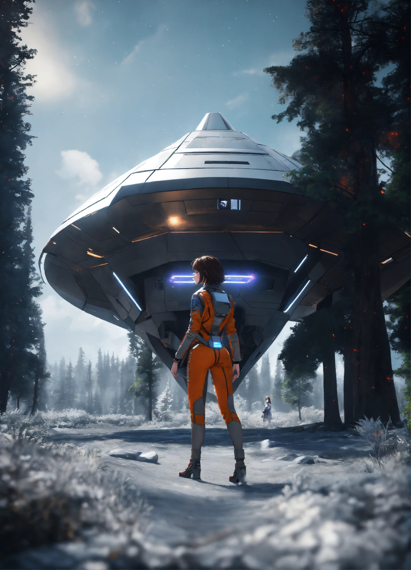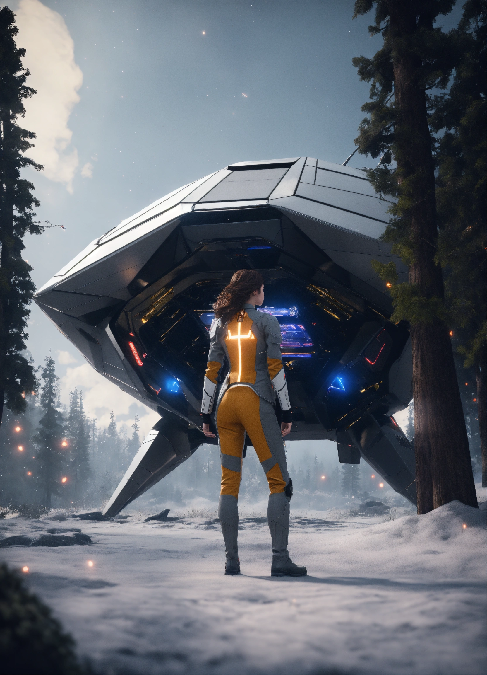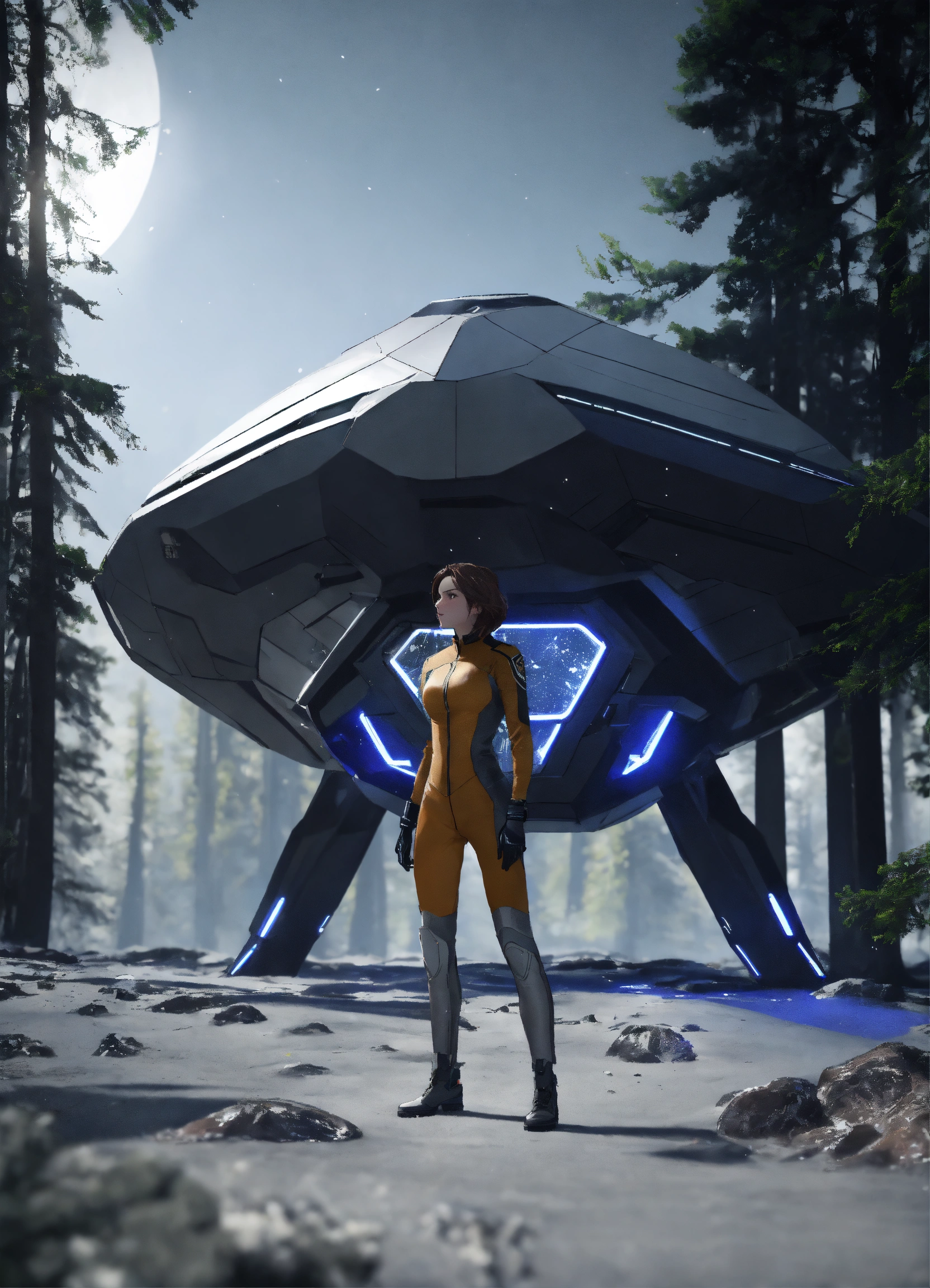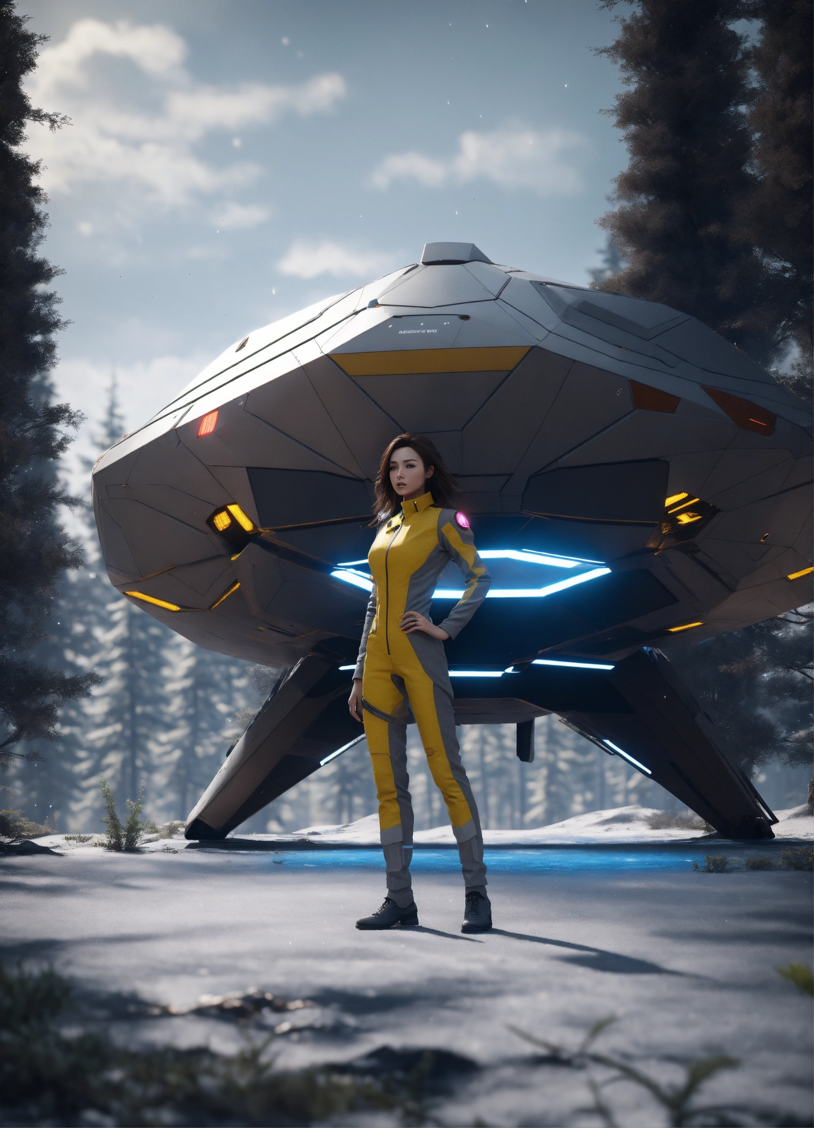 A brown hair girl is standing in the dark forest, early spring, she is wearing hi-tech grey suite, full-body frame and dynamic pose, vivid and vibrant, in the background rhomboid starship is standing and preparing to takeoff, realistic style, high resolution, unreal engine, 8k