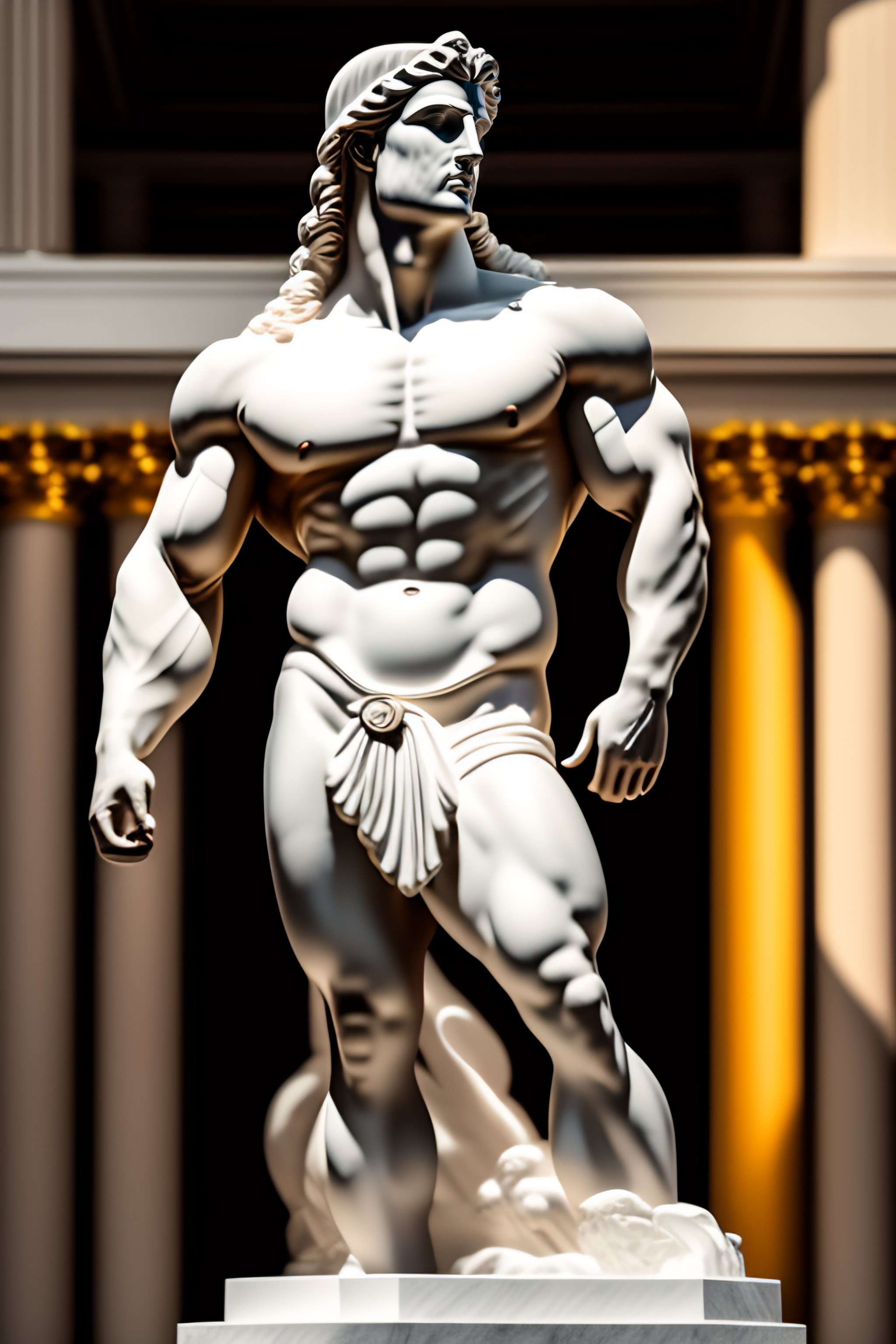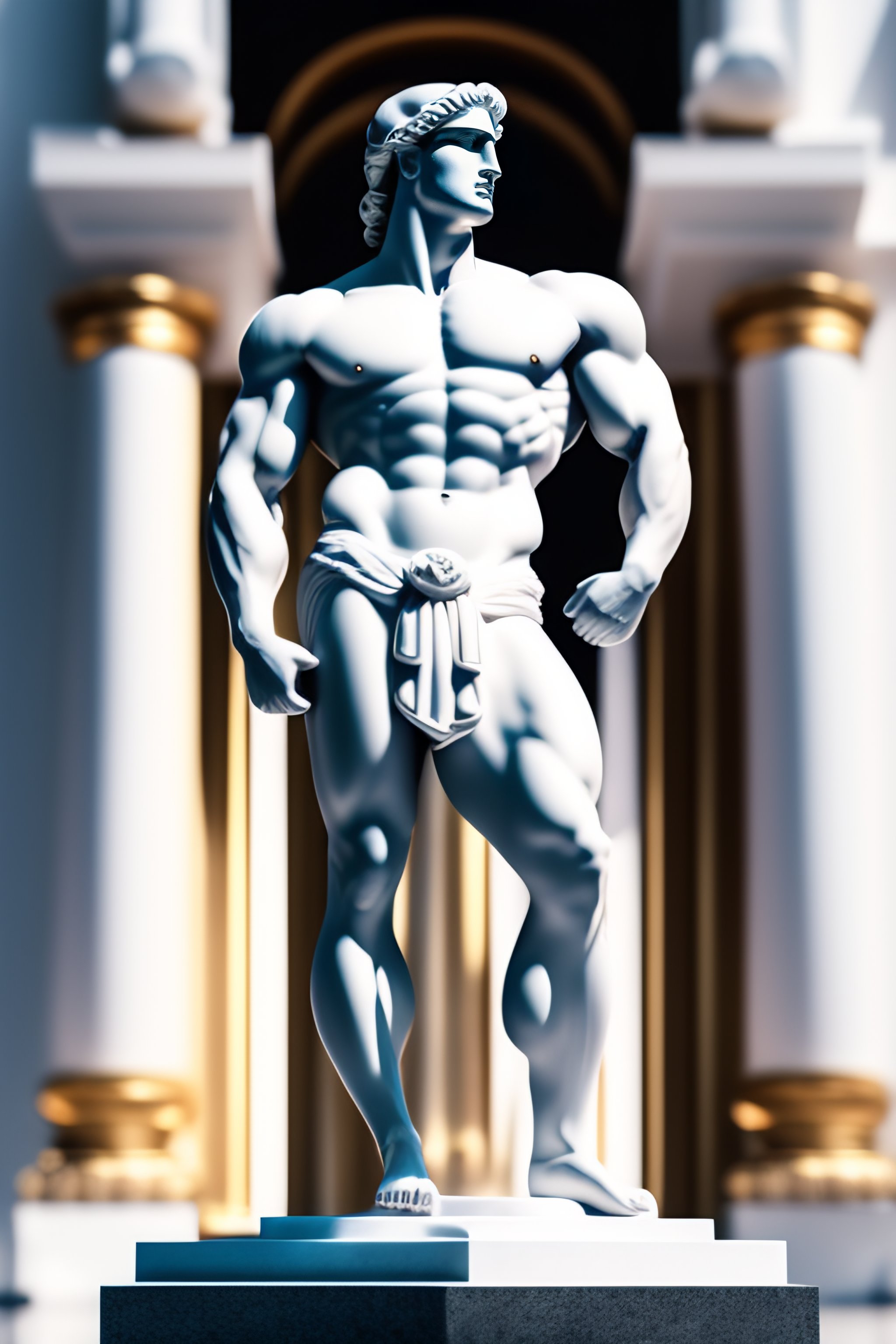Muscular greek statue in a white temple with millions of dollars in front