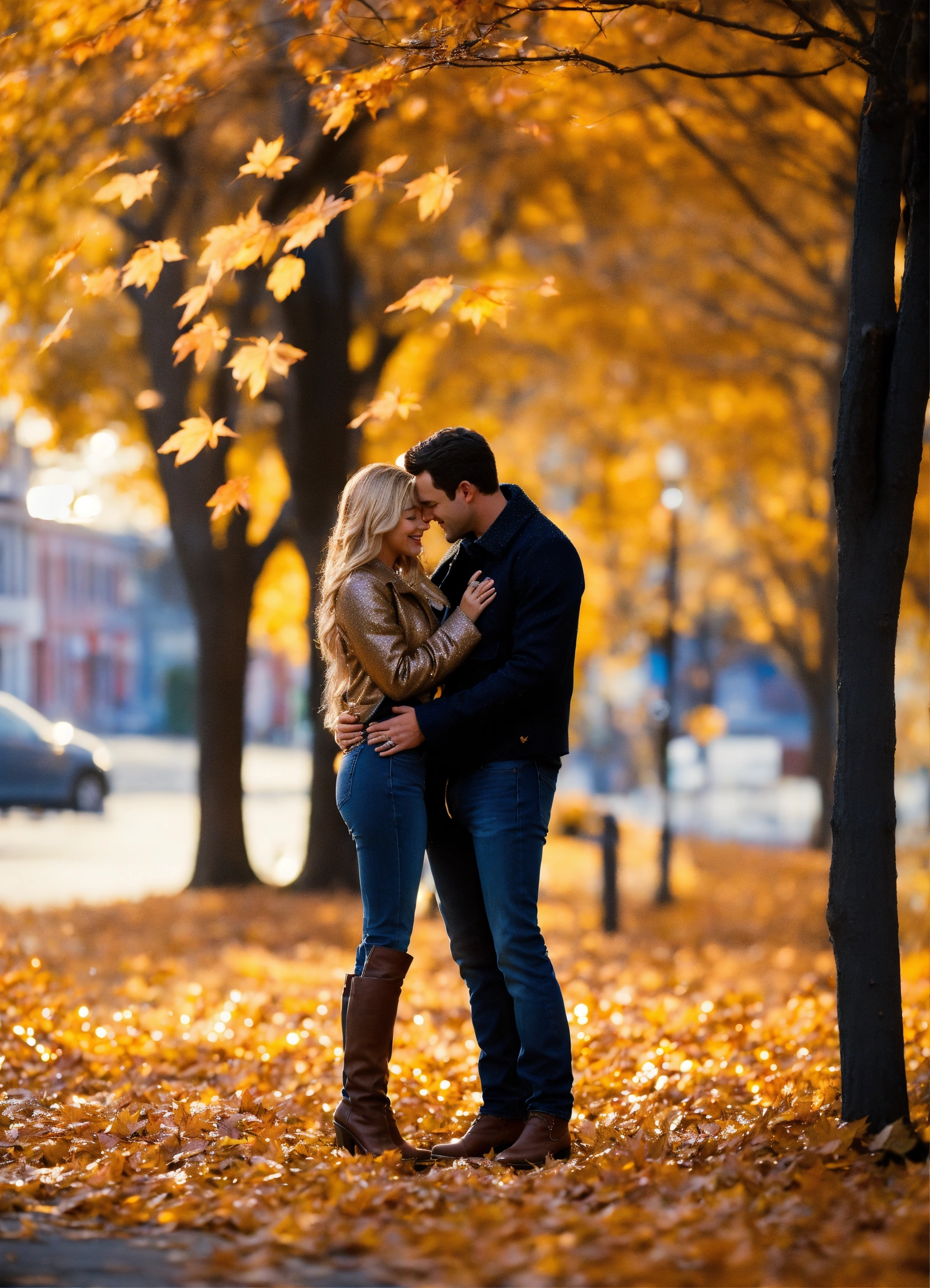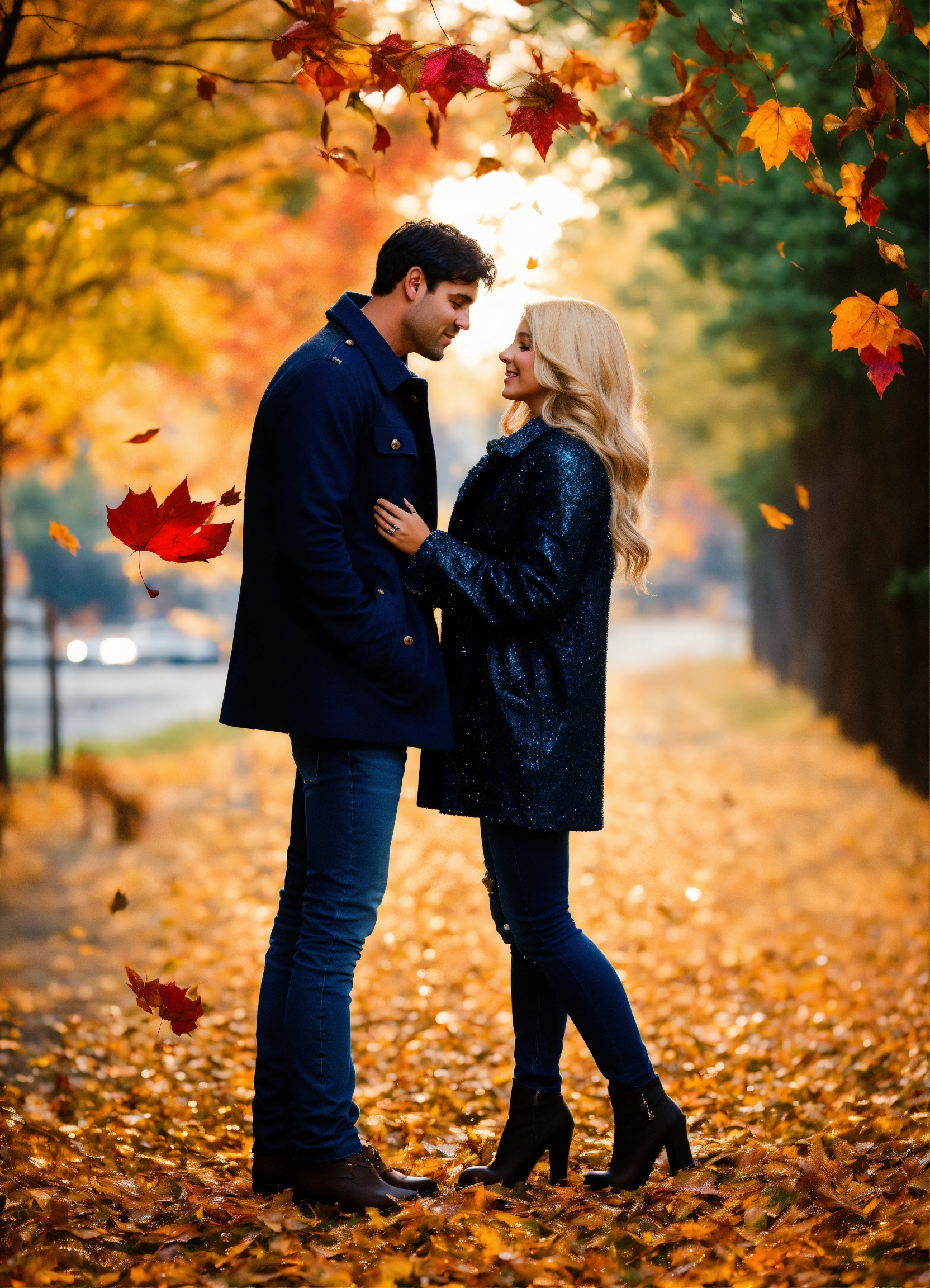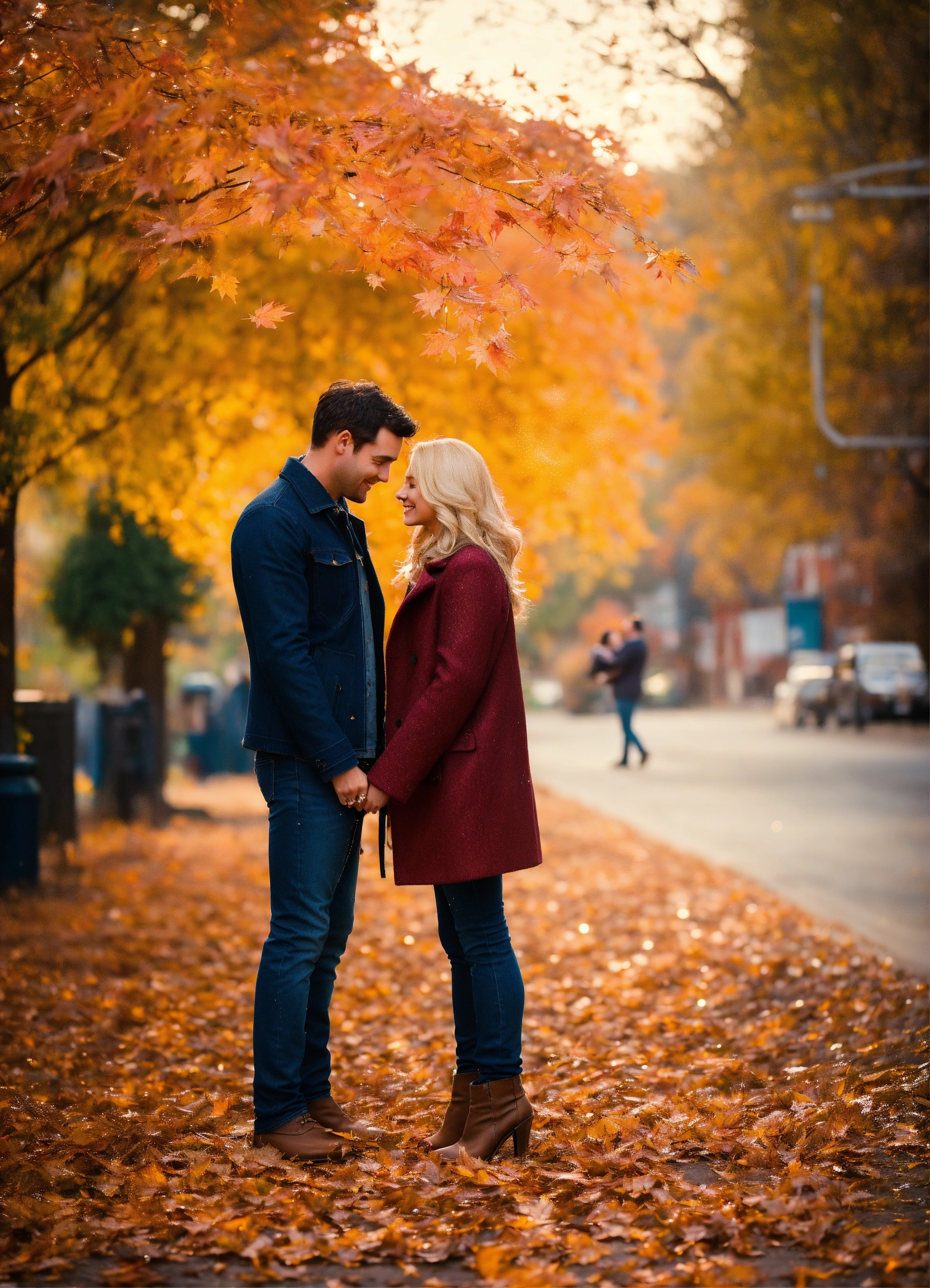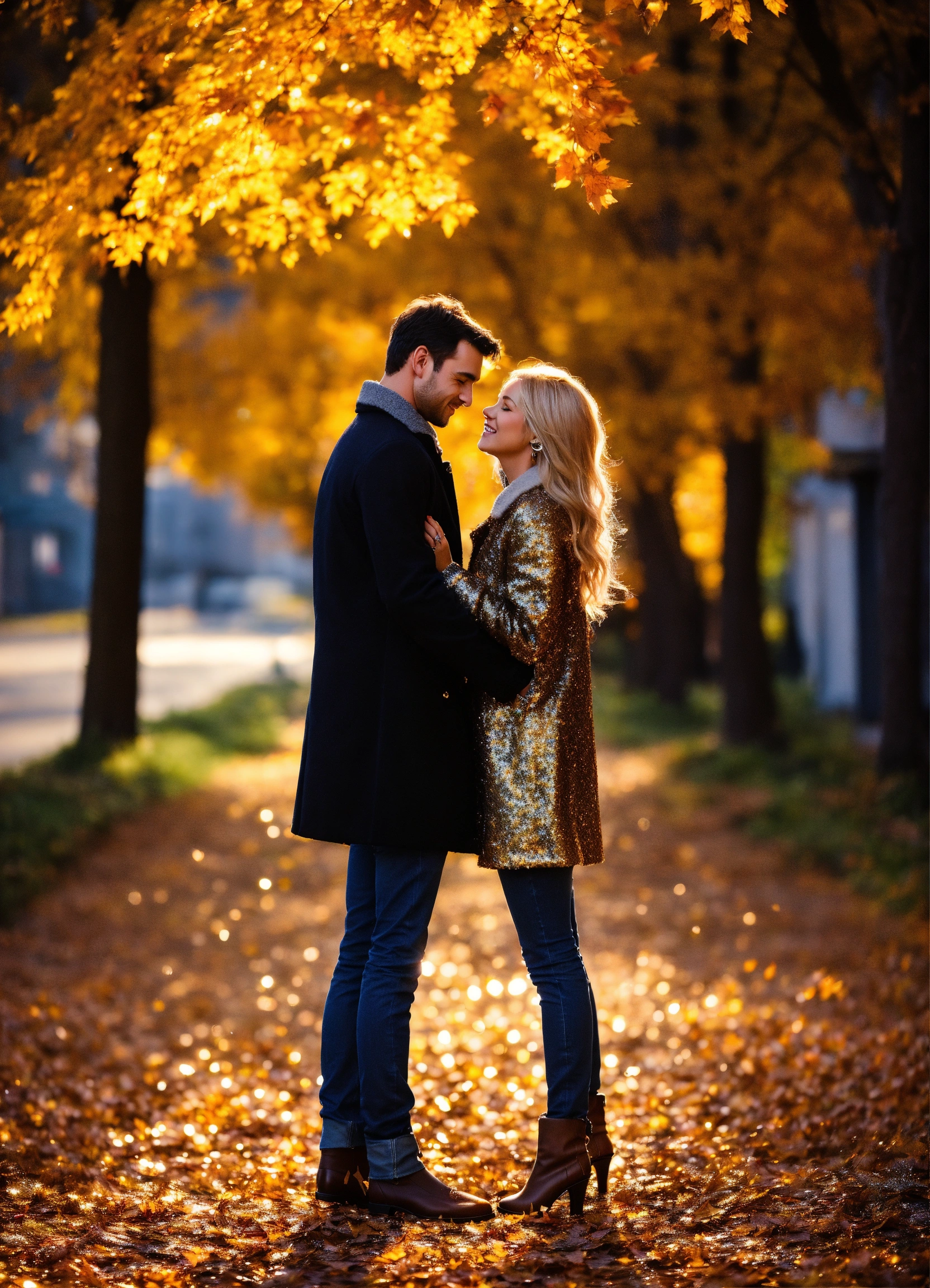 A photo quality image of a couple in love, small town romance, autumn, blonde woman wearing jeans and a coat, man with dark hair, magical, sparkly, enchanting, falling glittery leaves