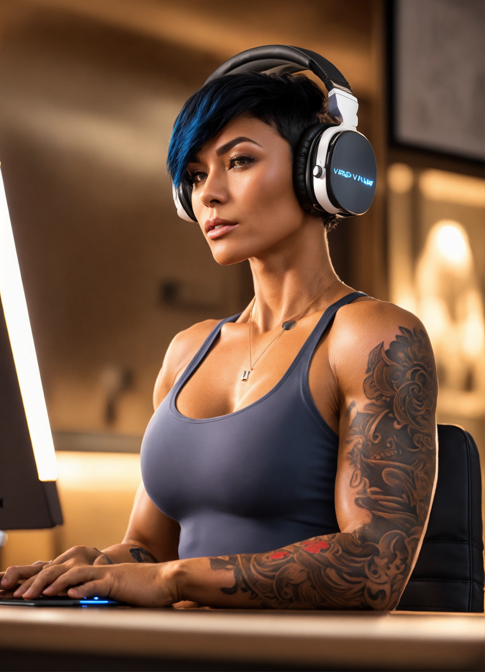Wearing a big vr headset. a woman with short black hair standing at a front desk. oiled tan skin. wearing headphones with a microphone. bigger lips and in her 40s, bodybuilder, lots of muscle mass, chiseled body, 350 pounds, bigger chest. bodybuilder, broad shoulders, slim waist, wider hips. sharp focus. 3d blender. tattooed sleeves. leather gloves. big smartwatch on her wrist.
