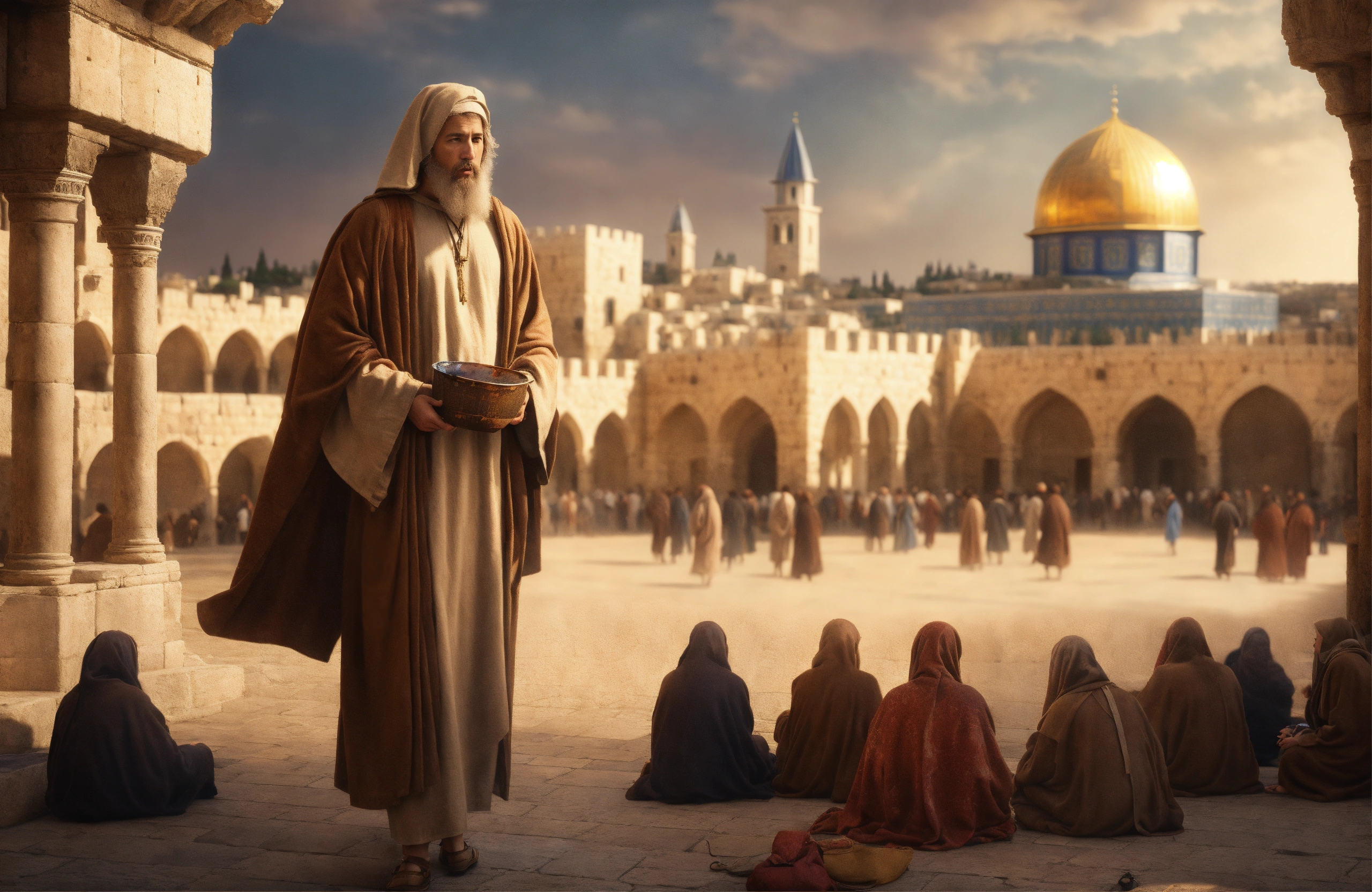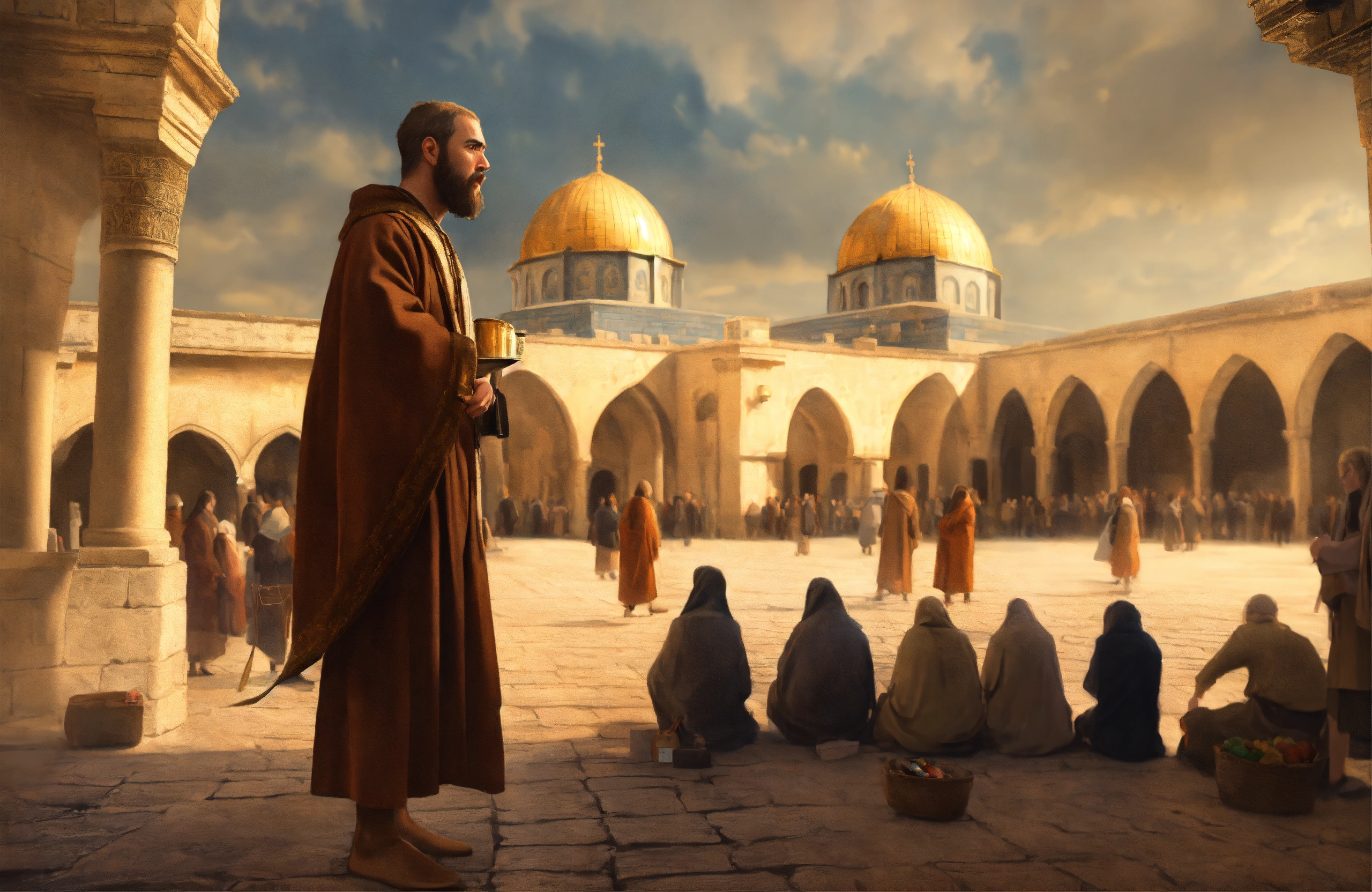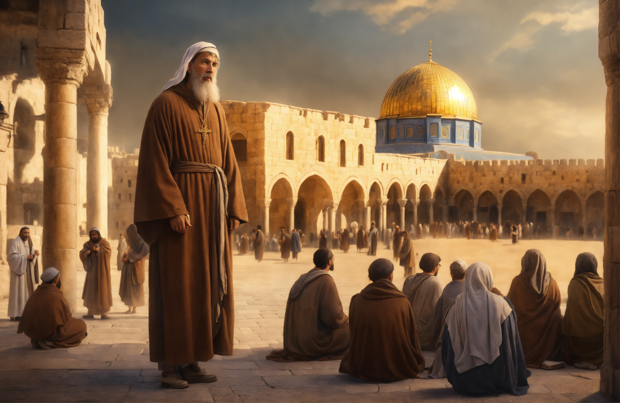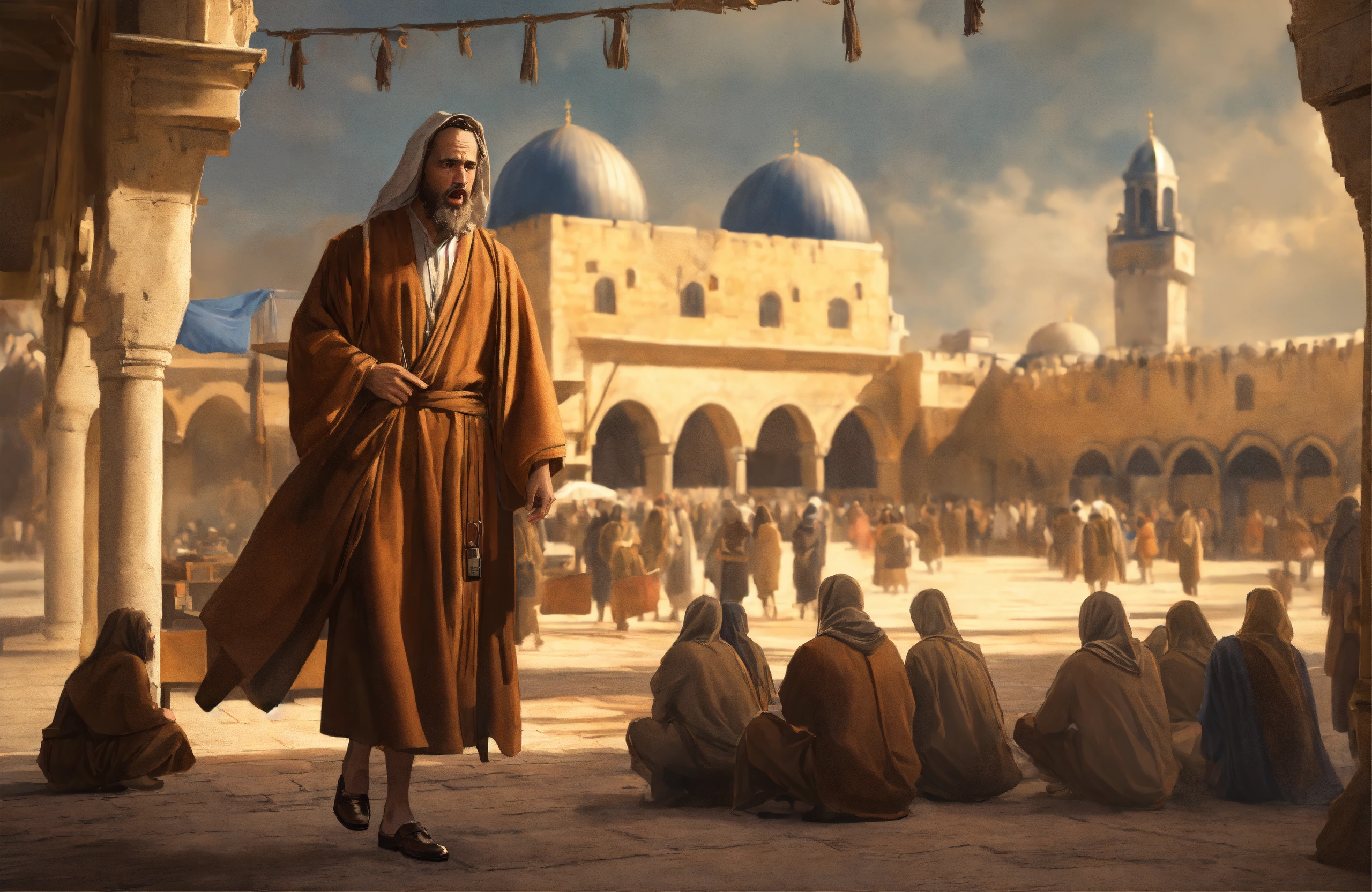 Painting peter disciple, brown robe, market place, many disciples, old jerusalem background, looking frontal close up, surprised, scared, realistic, highly detailed, professional digital painting, artstation, photorealism, 4k quality, resolution, beautiful, cinematic, lighting
