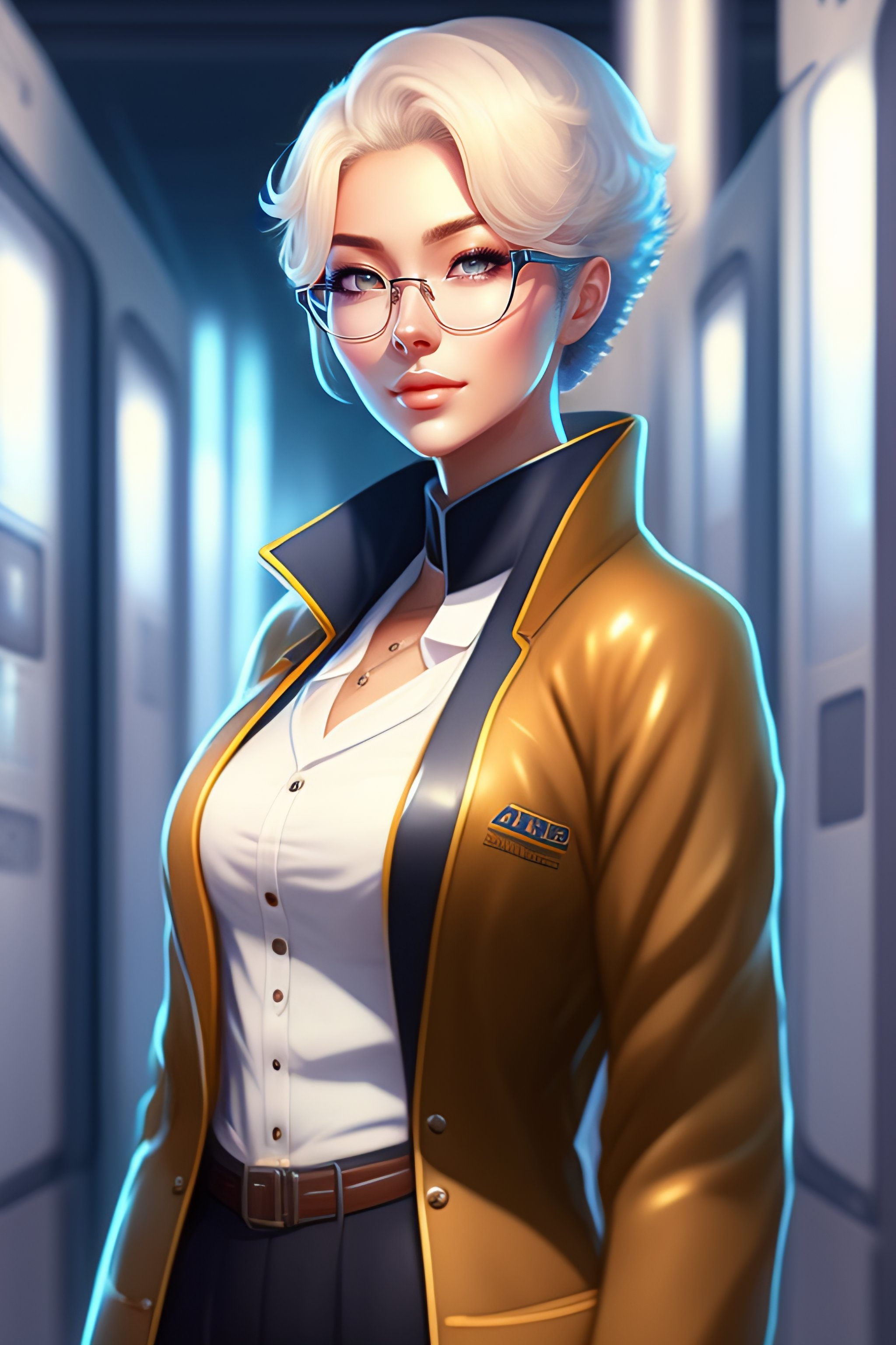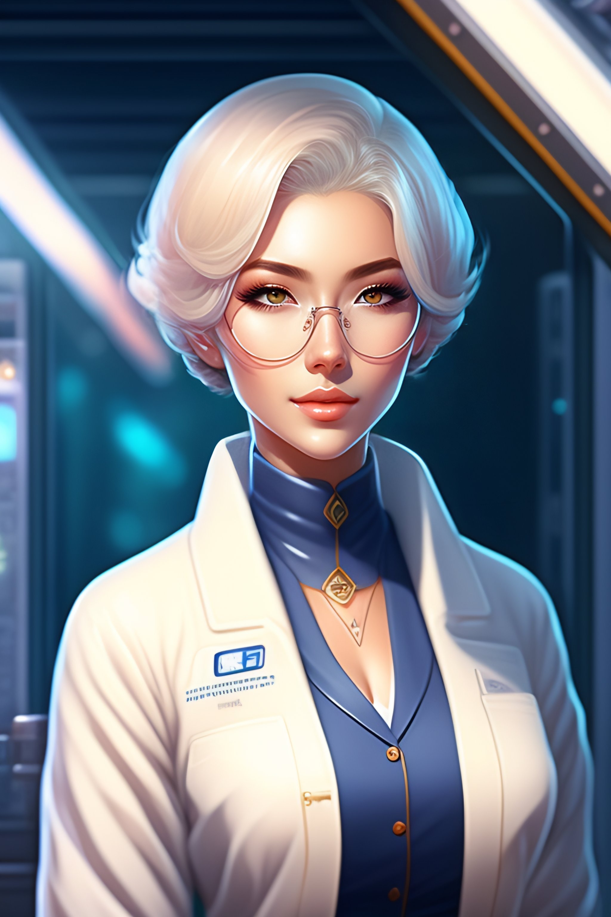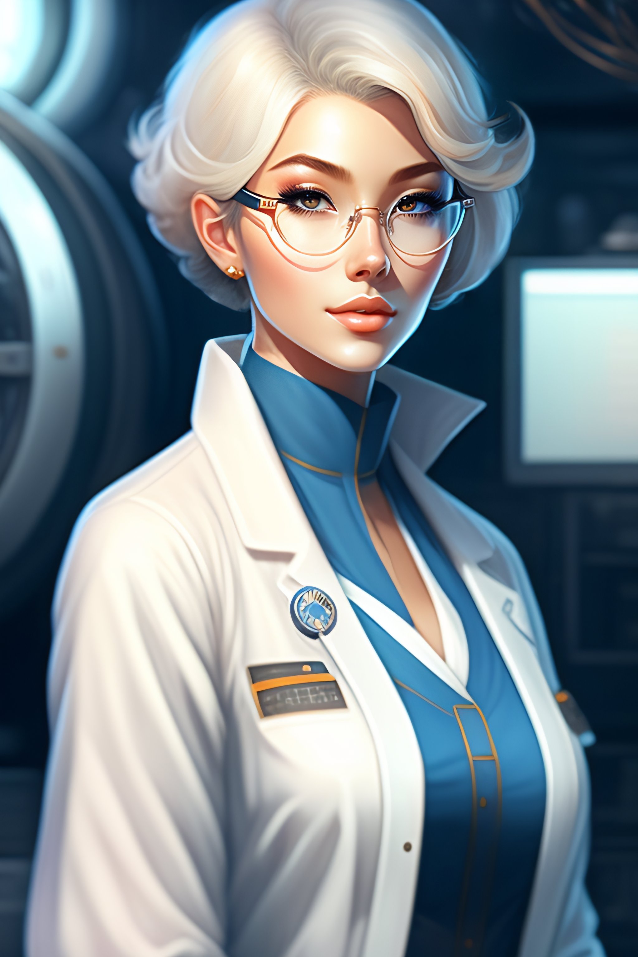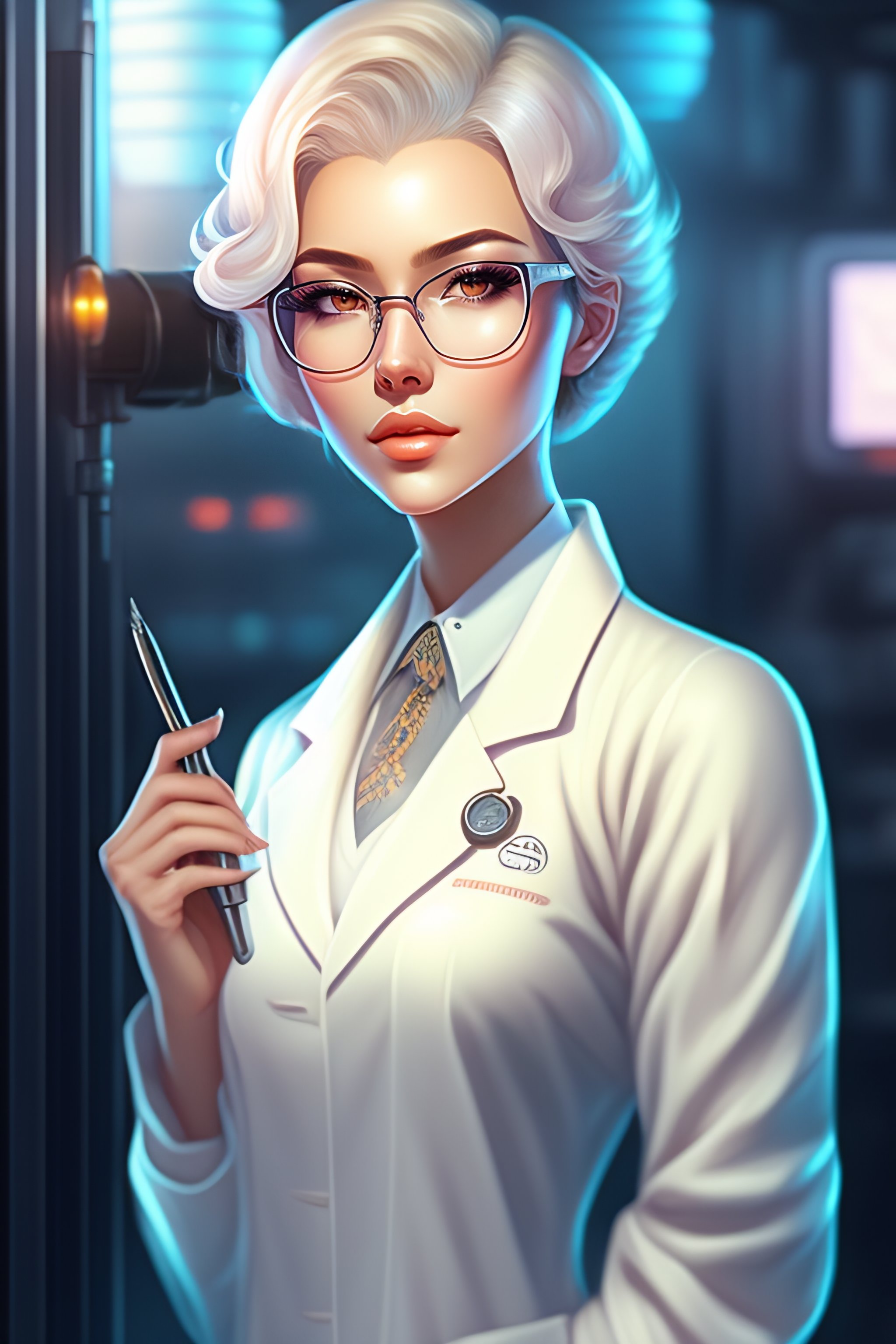 Beautiful anime girl with short white hair, wearing lab coat and glasses, holding a clipboard, standing inside a research facility, character portrait, 1 9 6 0 s, long hair, intricate, elegant, highly detailed, digital painting, artstation, concept art, smooth, sharp focus, illustration, art by wlop, charlie bowater and alexandra fomina