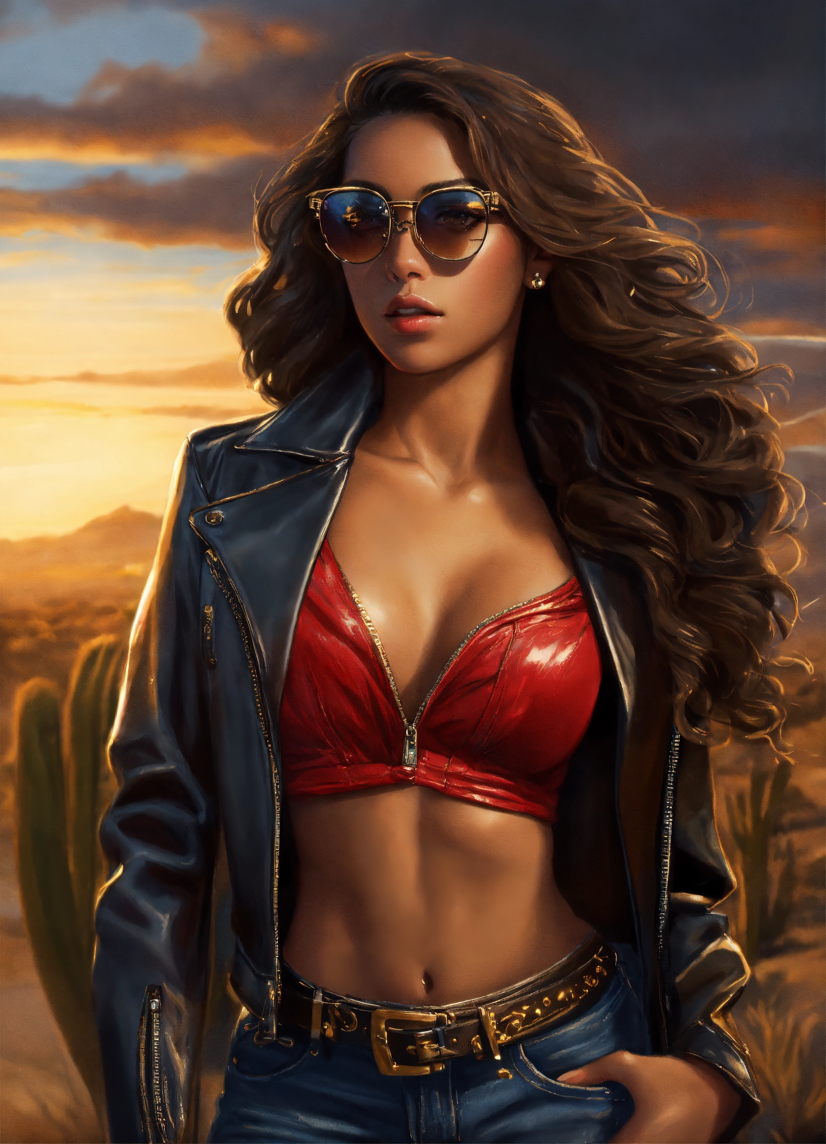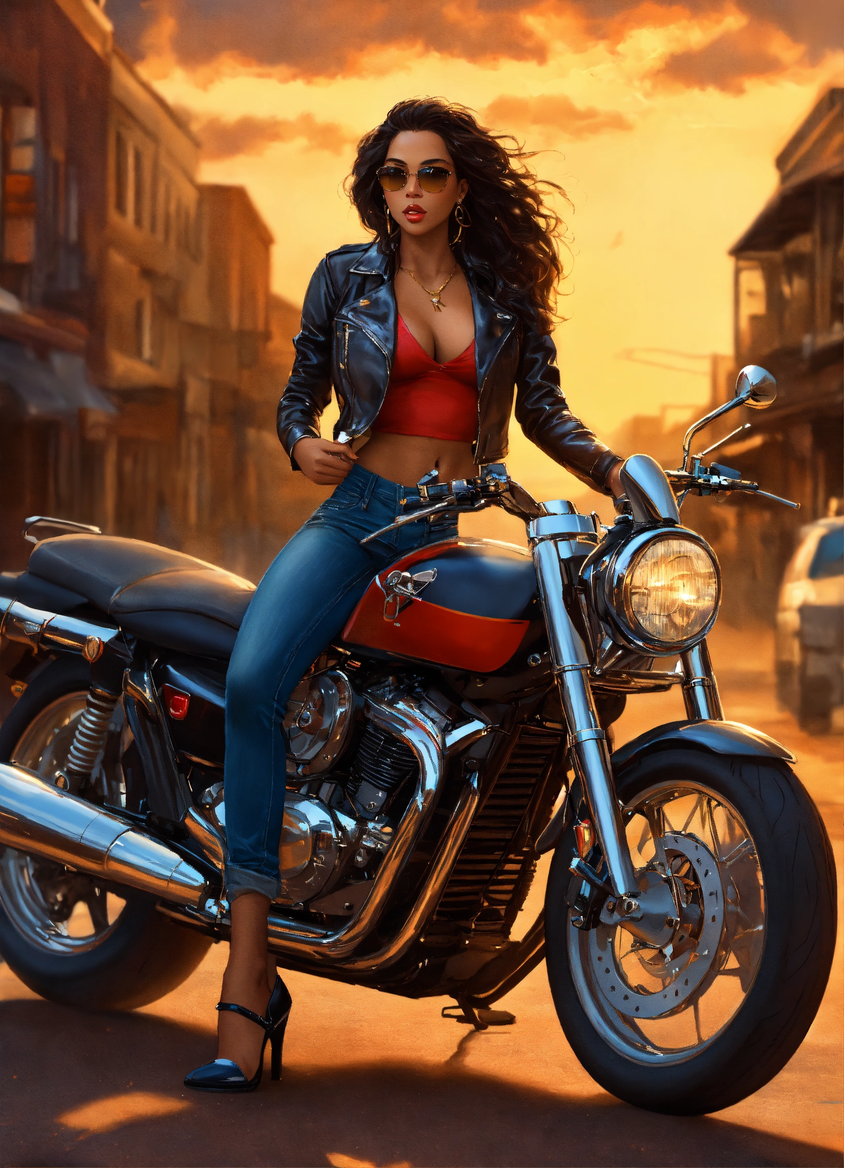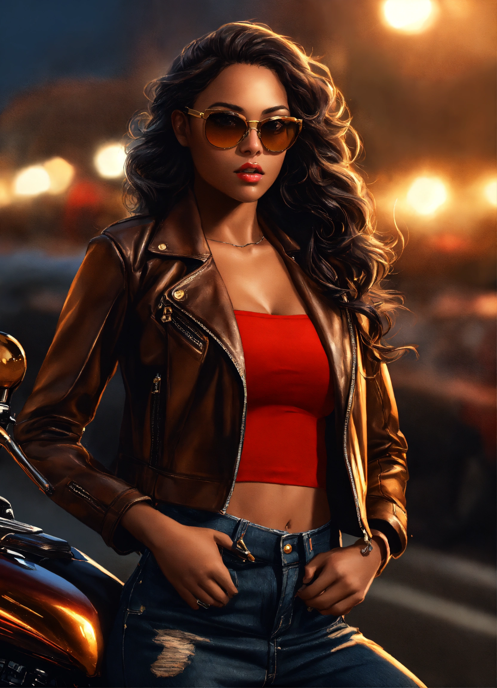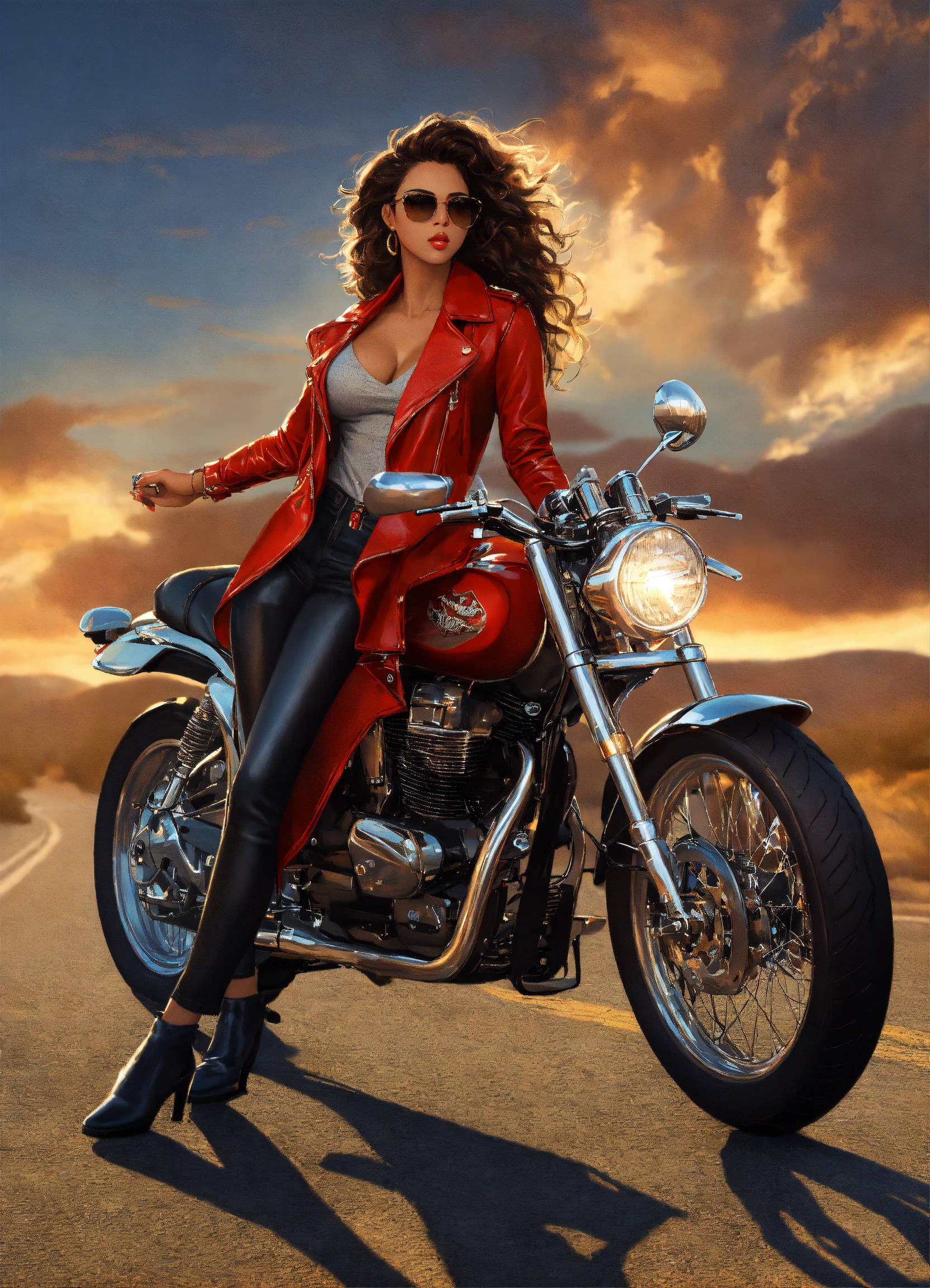Hyperrealistic full body beautiful mixed race goddess with light brown skin, beautiful mixed race woman pin up girl with light brown skin, beautiful perfect face, shapely hour-glass figure long flowing hair, fully clothed black leather jacket, jean pants and red blouse with gold accessories and sunglasses, she's standing by a motorcycle with a desert road gold lightning dark clouds behind her, high detail, realistic photo, high detail, digital painting, cinematic, stunning, hyper-realistic, sharp focus, high resolution 8k, insanely detailed