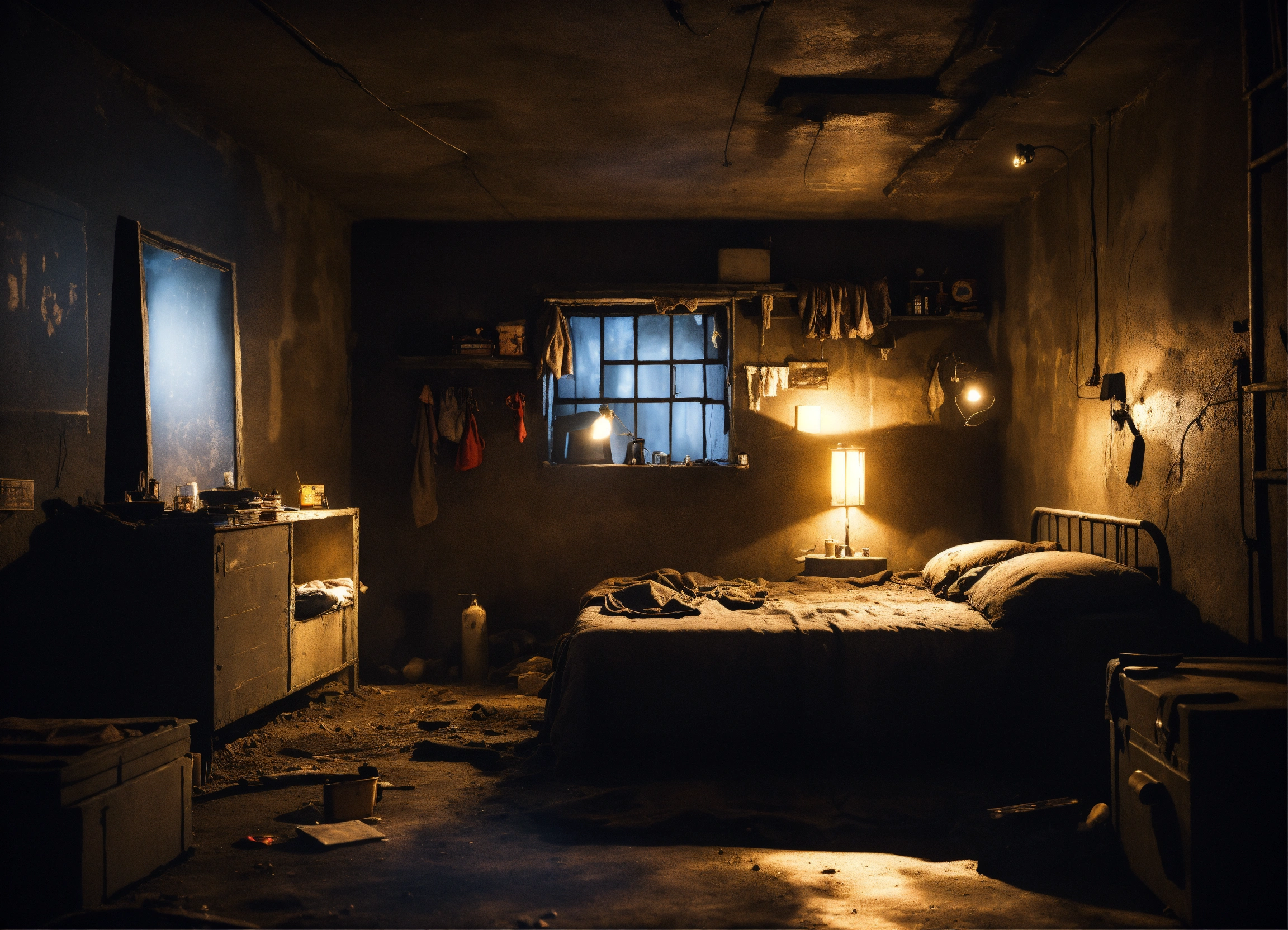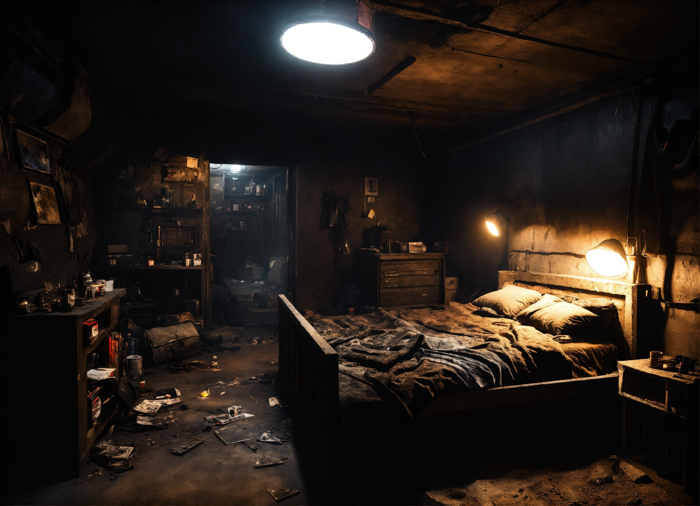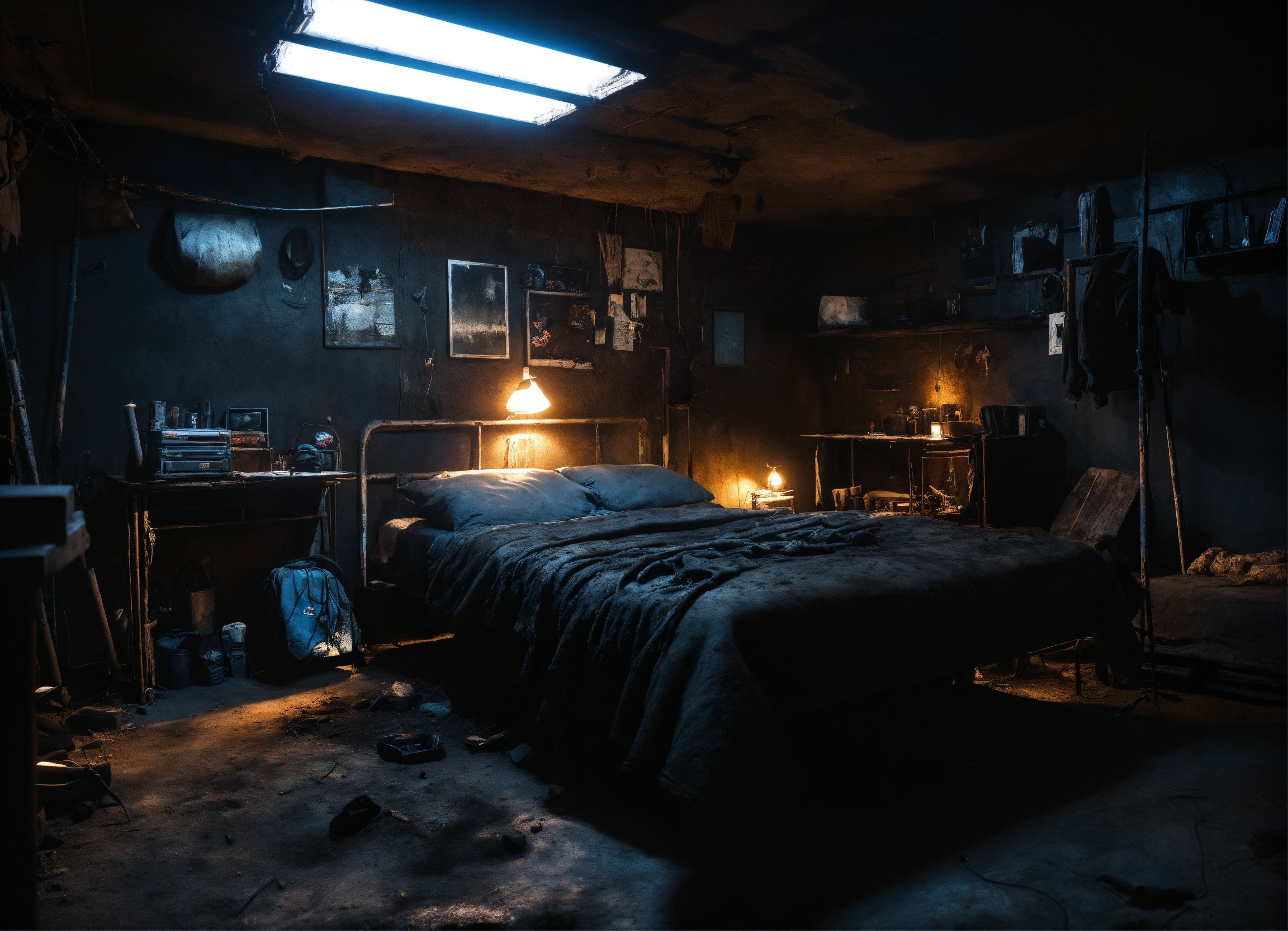An ultrarealistic dark picture of a post-apocalyptic dark bedroom in a subterranean bunker, with a little messy bed, without windows, dark walls, low ceiling, and typical bedroom furniture, dark cold illumination