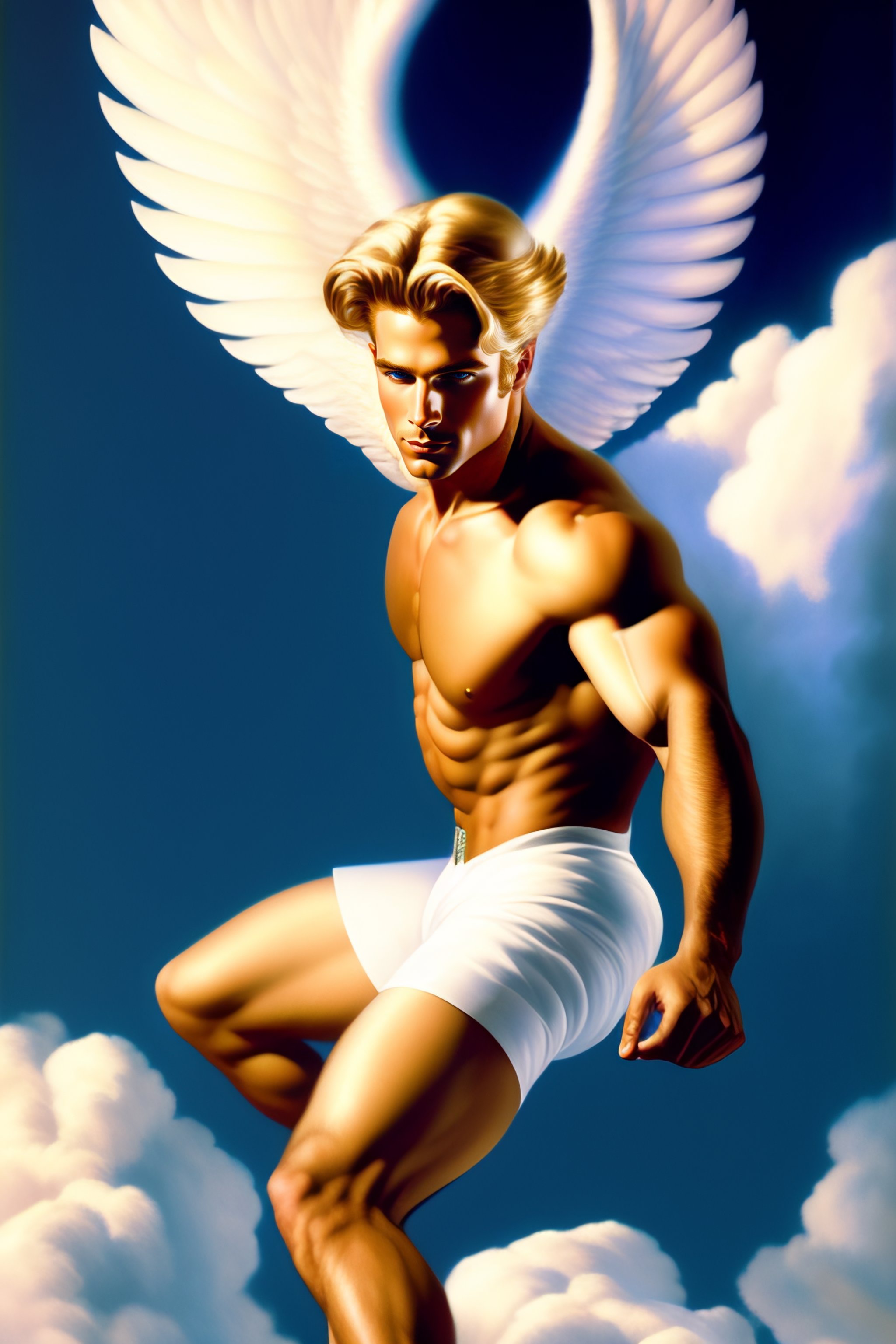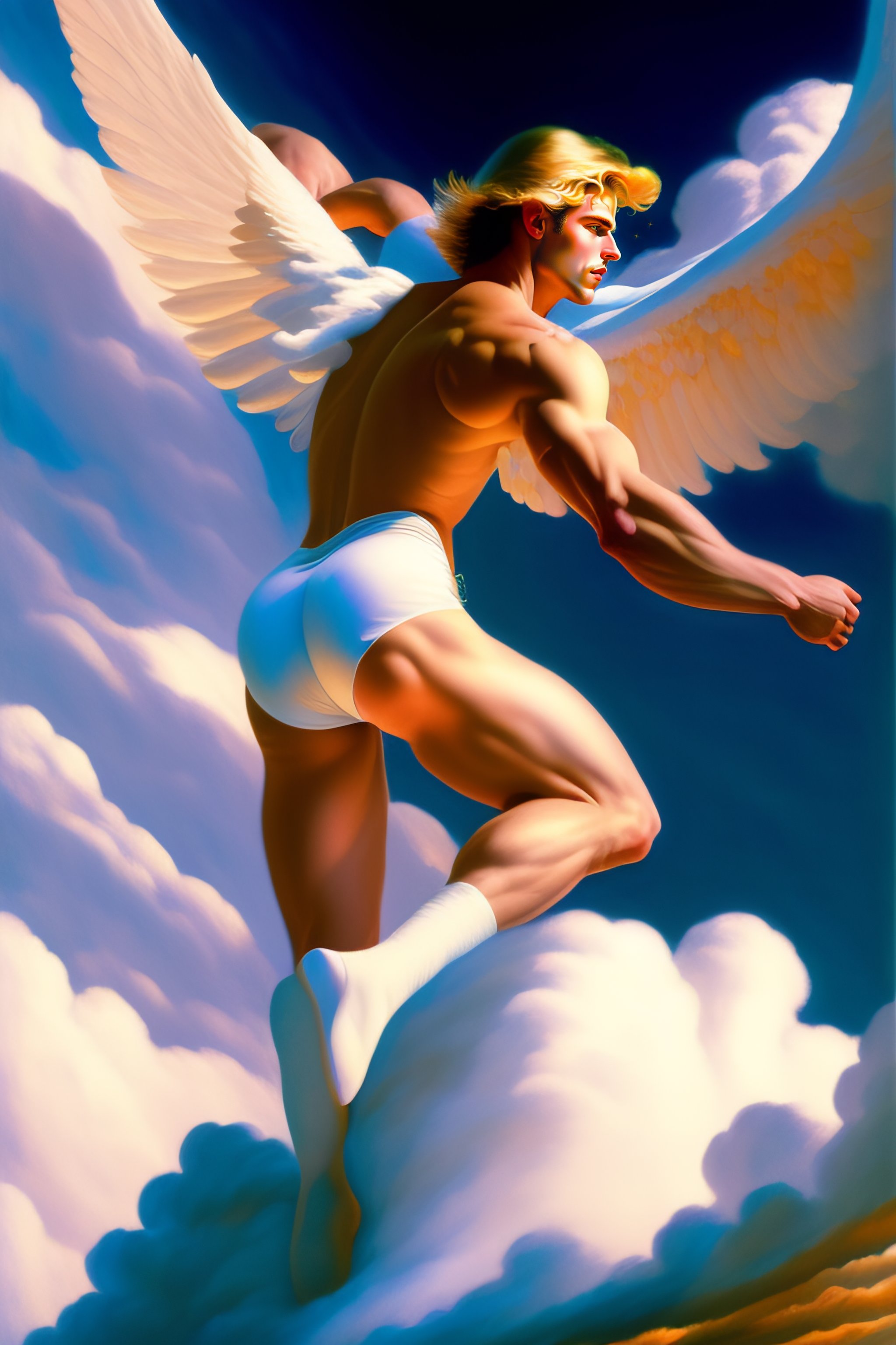 A male angel flying and dancing among the clouds, blond hair, in the center of the images, hyper realistic, ultra realistic, intricate, dynamic, white pants, 8k, art by edward hopper and gilbert williams