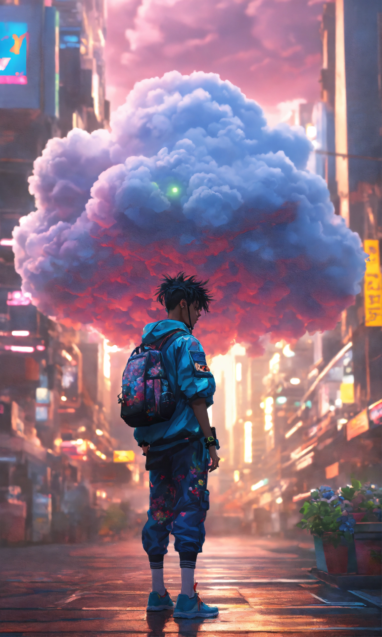 90s anime, cyberpunk style, of a person in urban floral wear, with a cloud as a head, photorealistic, volumetric lighting, 8k, highly detailed