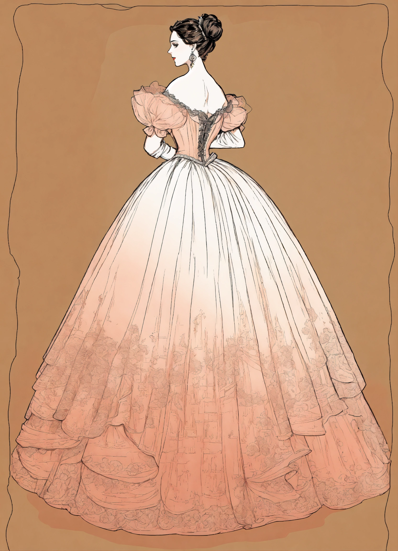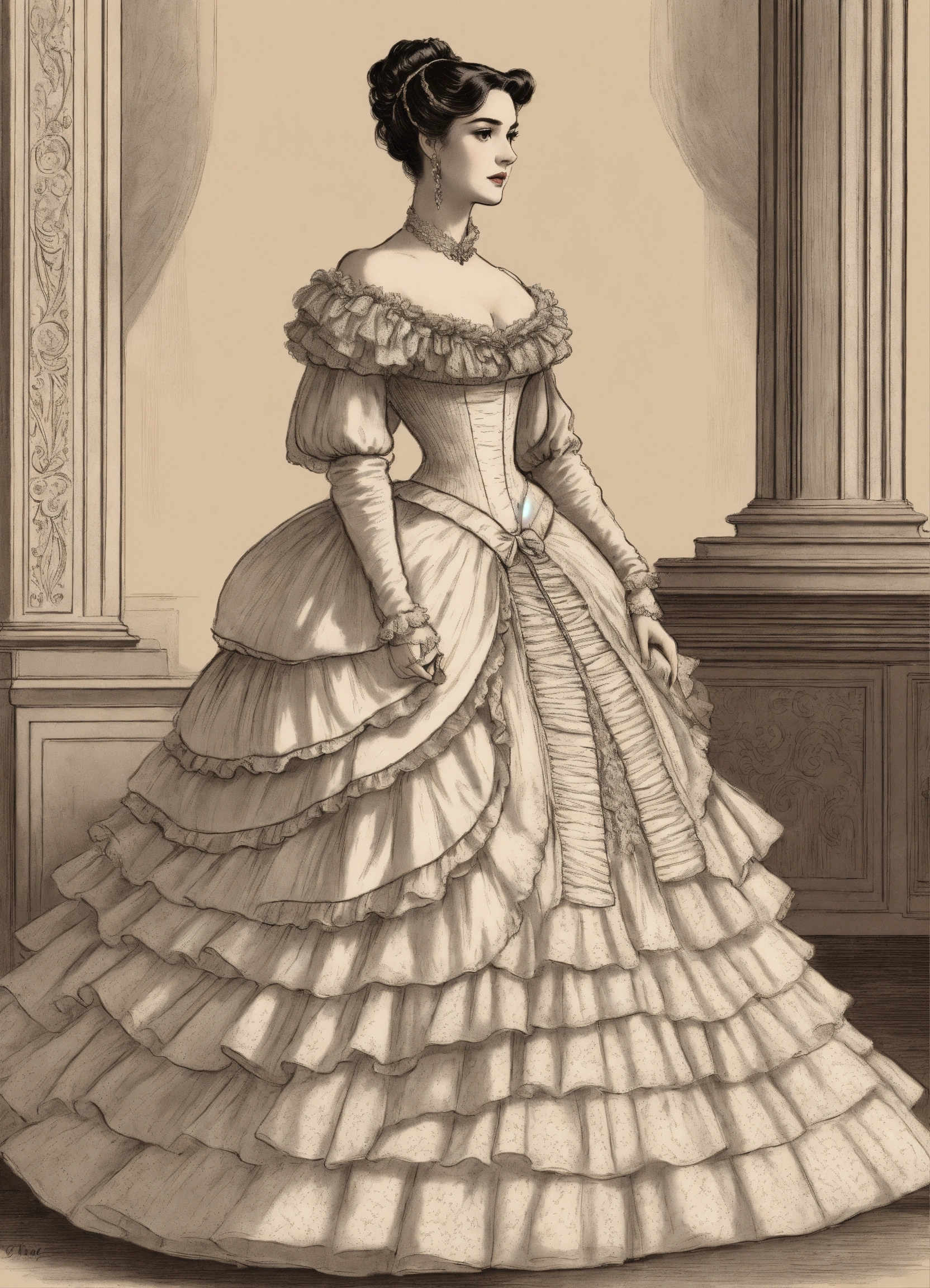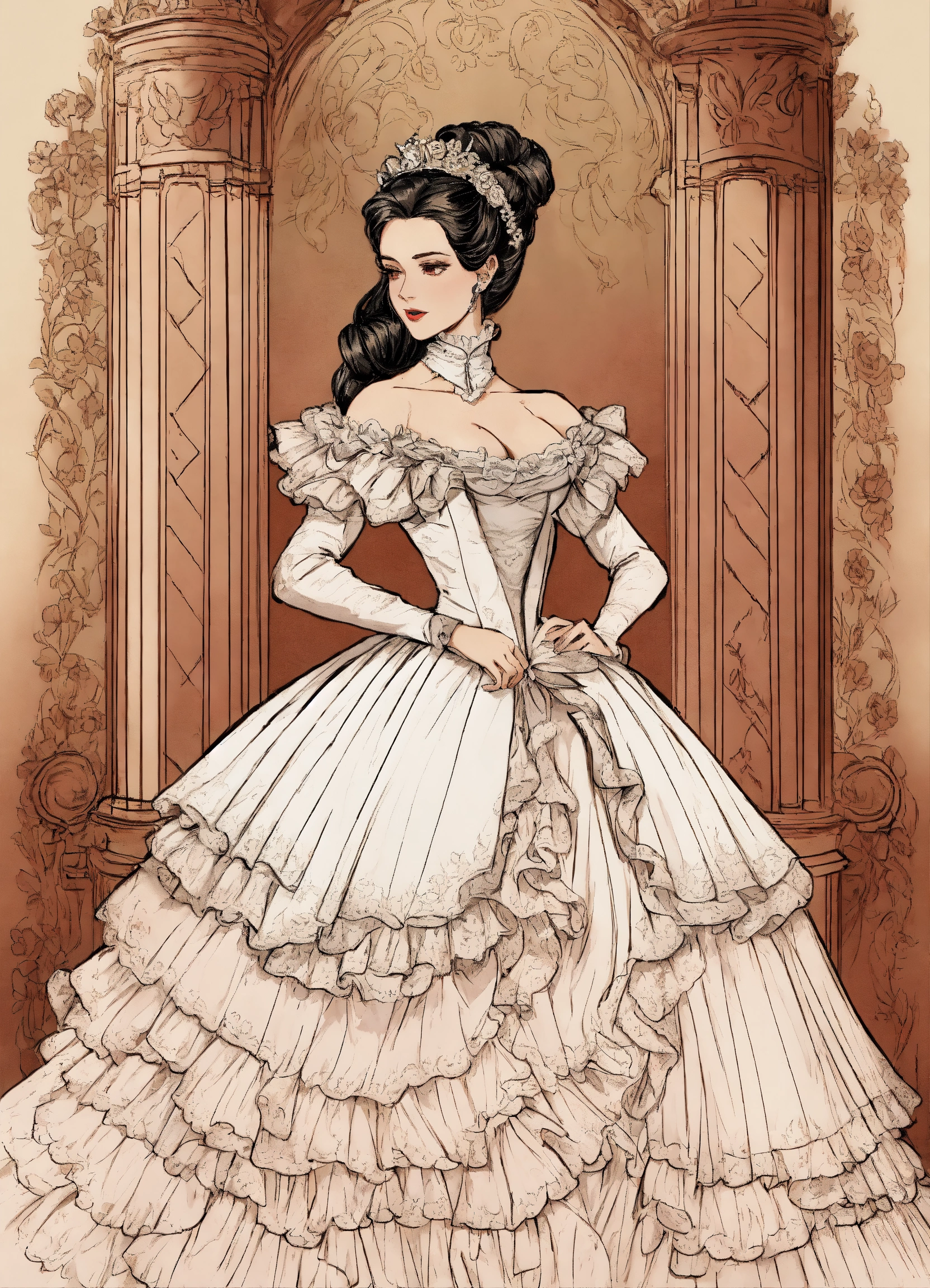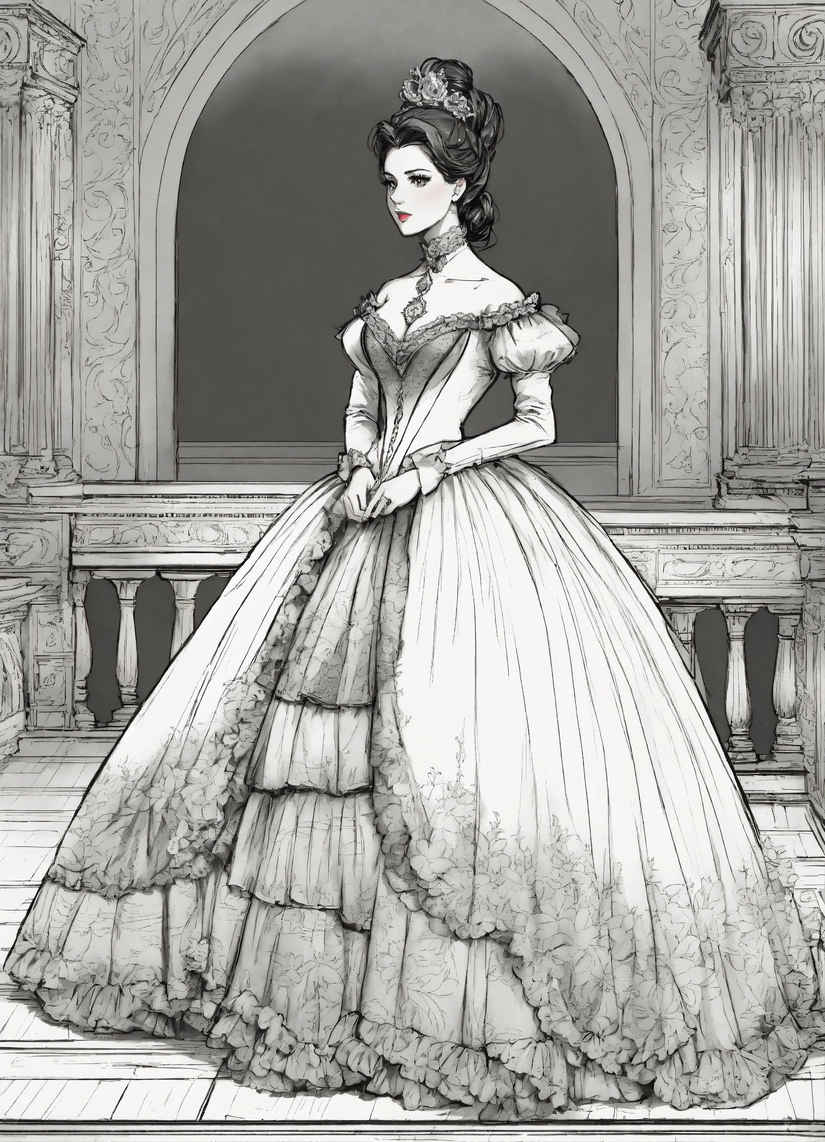 "veronica lodge as christine daae", victorian opera star, huge opera updo, elaborate opera gown, petticoats, bustle, historical, fantasy art, line art