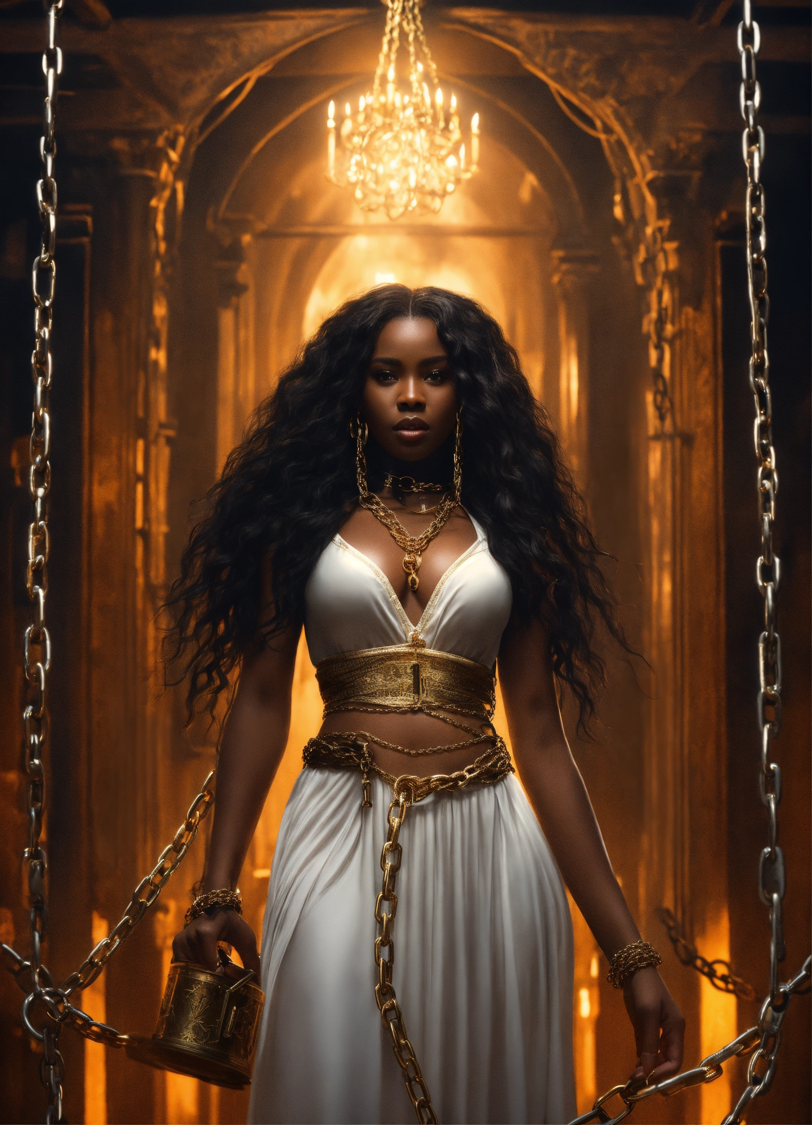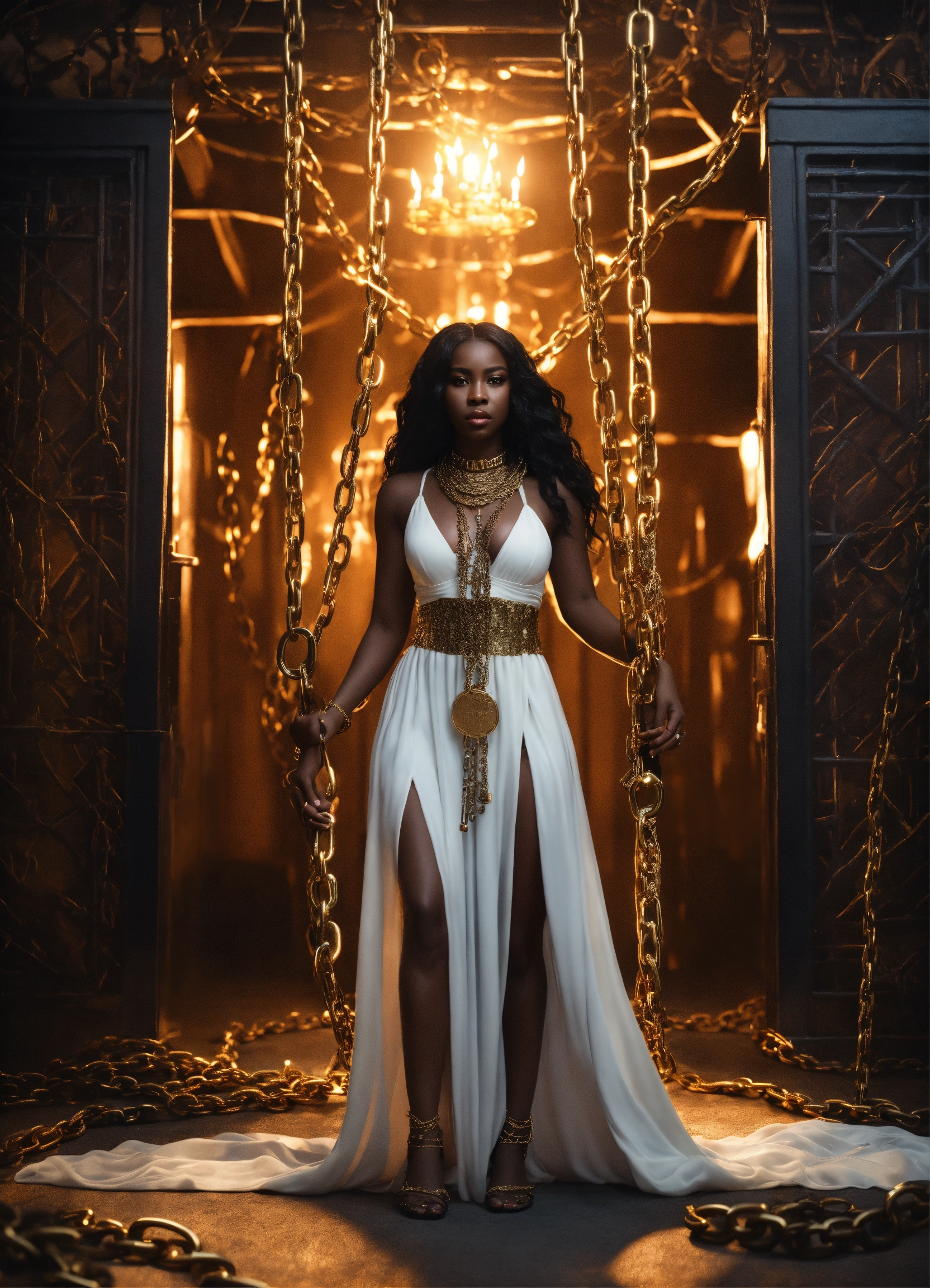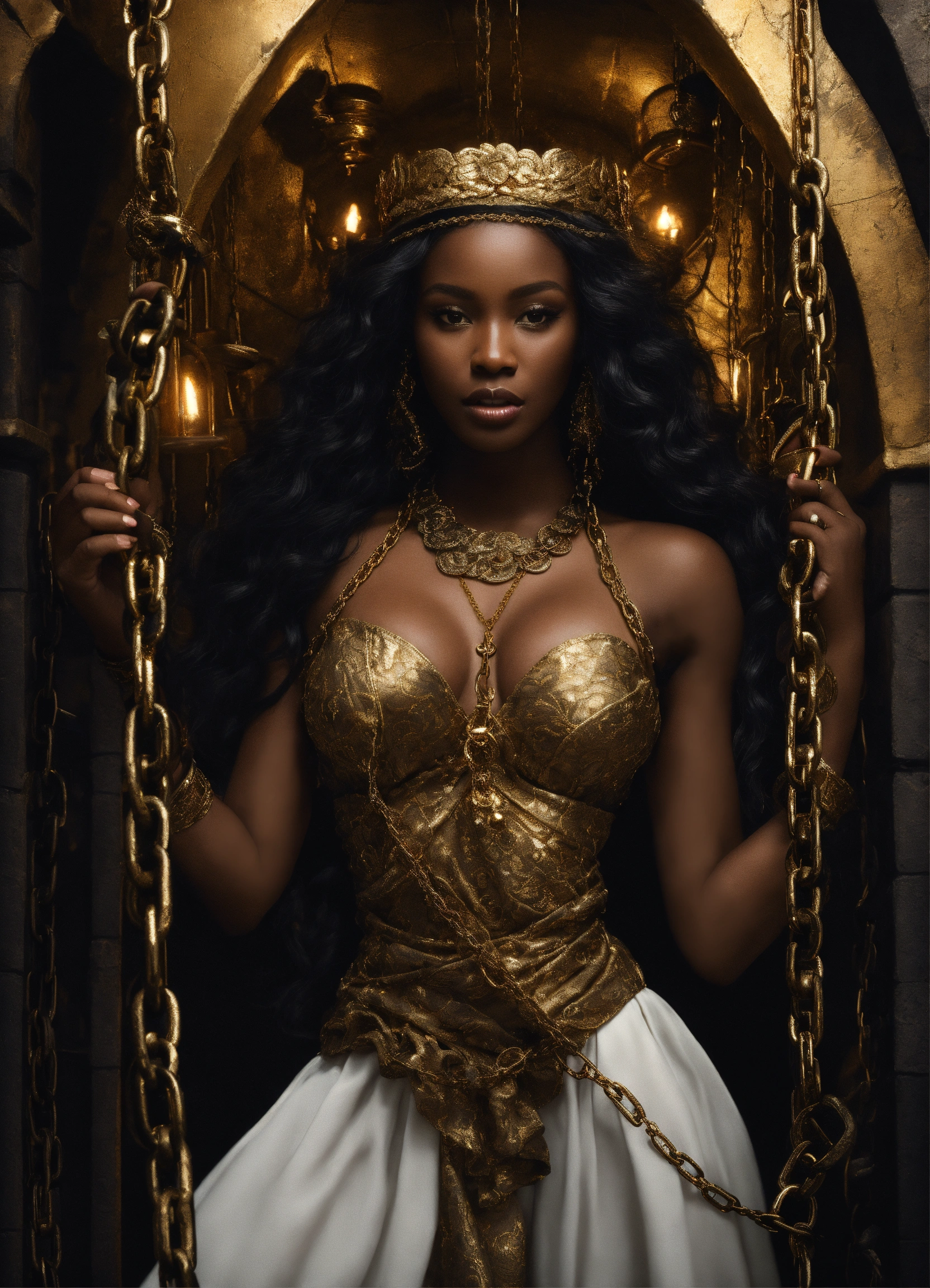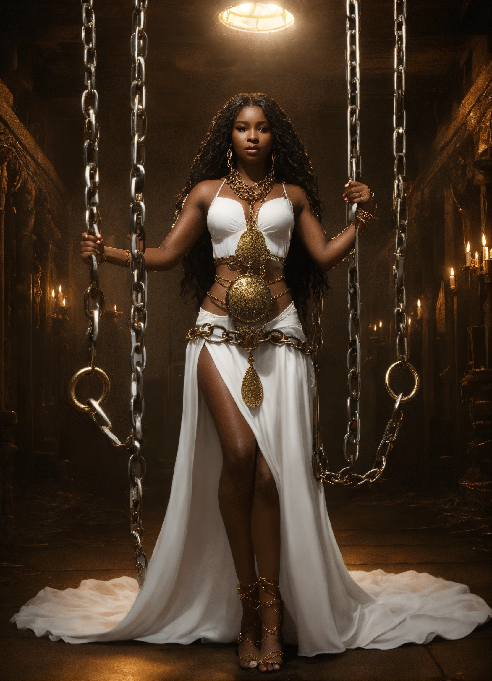 Full body beautiful black goddess chained by enemies chained to the ceiling of a dark dungeon hands chained above her, beautiful black woman with dark brown skin, beautiful perfect face, shapely hour-glass figure long flowing hair, fully clothed flowing white dress and gold accessories, chained by enemies chained to the ceiling of a dark dungeon hands chained above her, high detail, realistic photo, high detail, digital painting, cinematic, stunning, hyper-realistic, sharp focus, high resolution 8k, insanely detailed