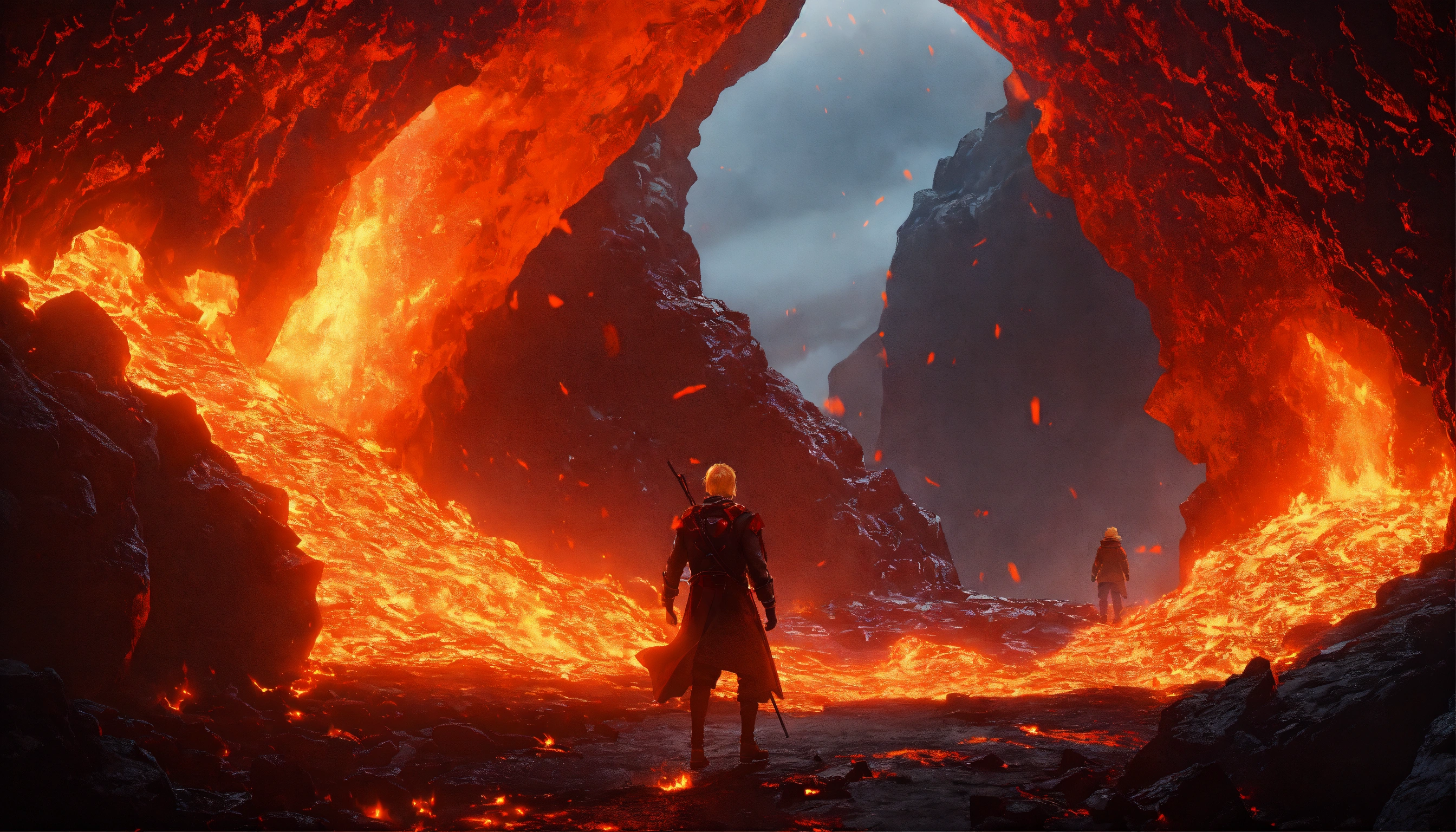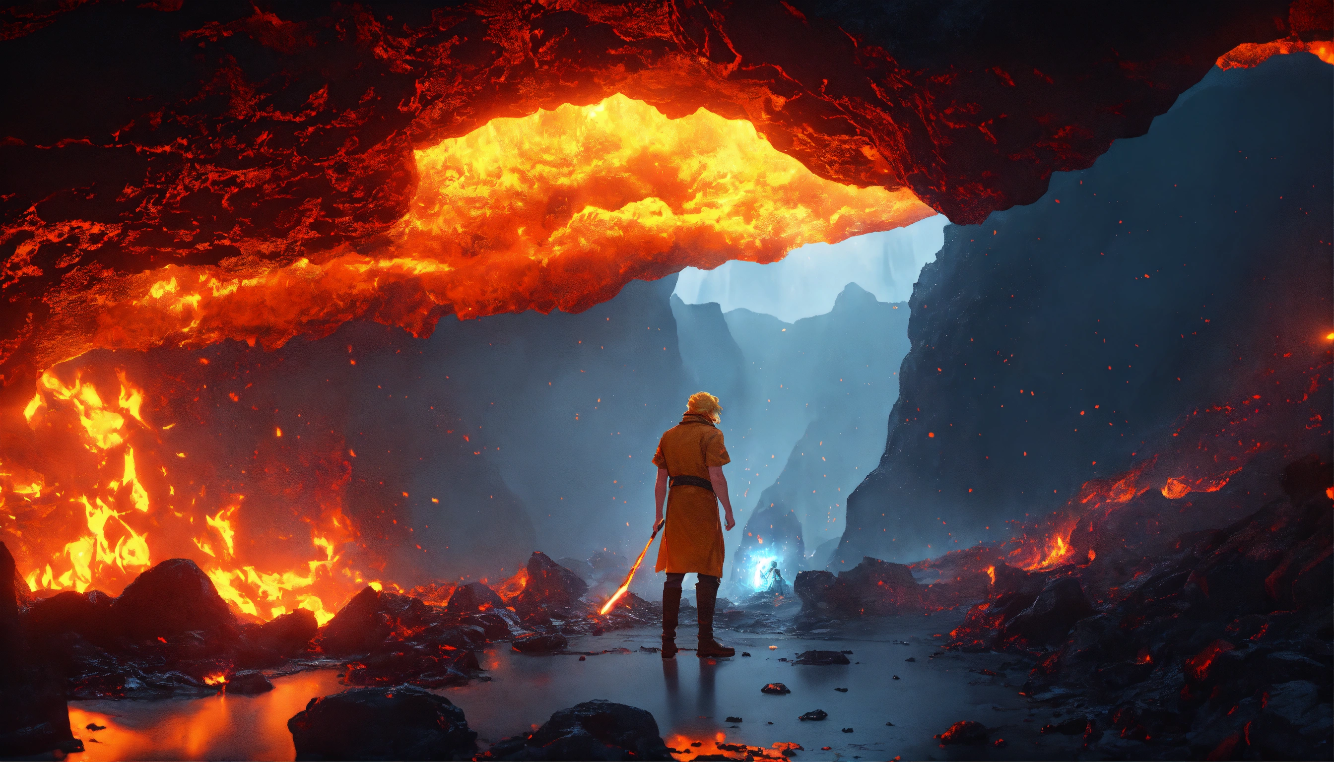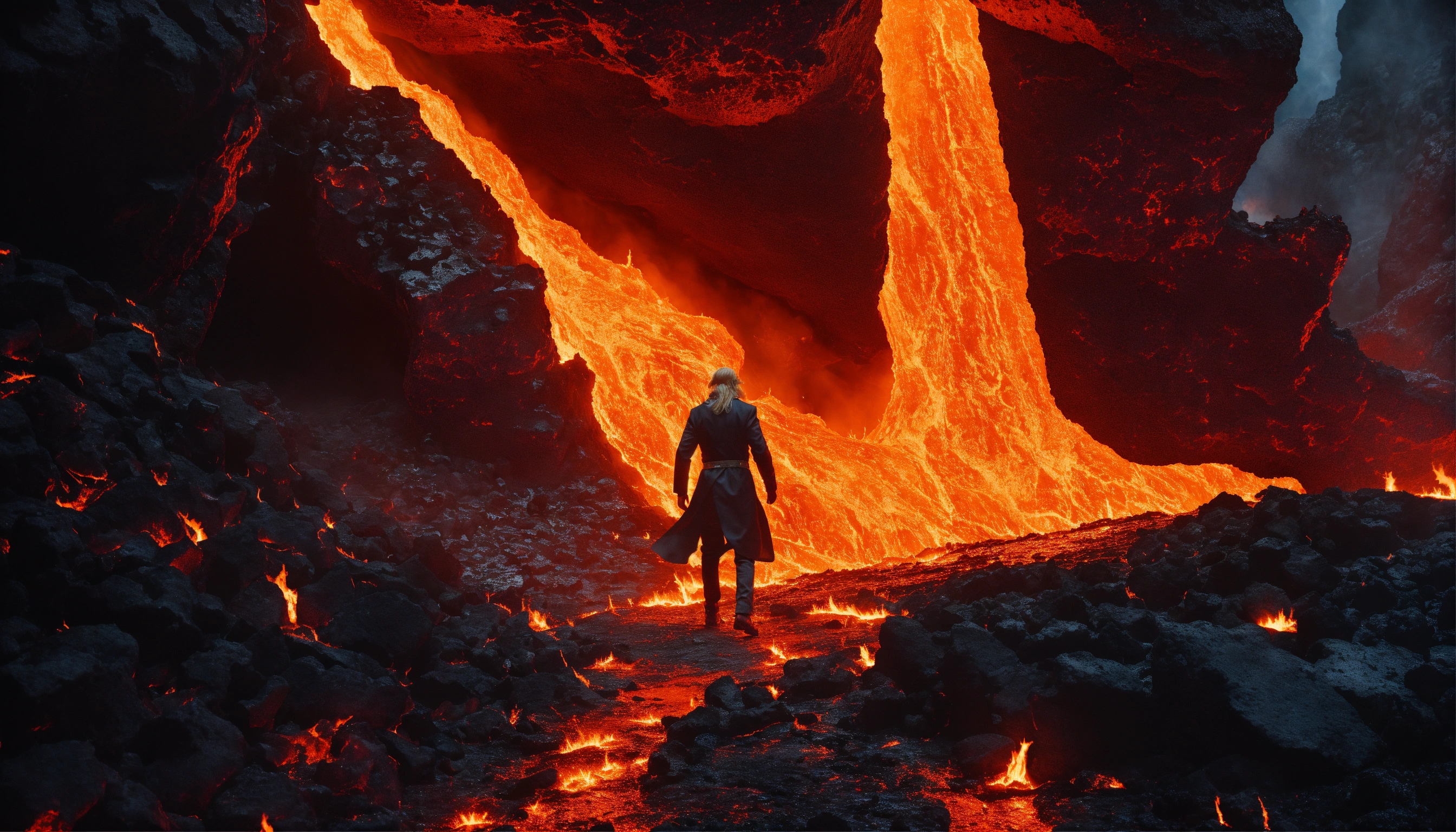 Deep inside of a dark cave with a sea of lava, and a man, dressed in might, blonde hair, walking across the lava, cold rock under his feet, with fire surrounding him, sharp