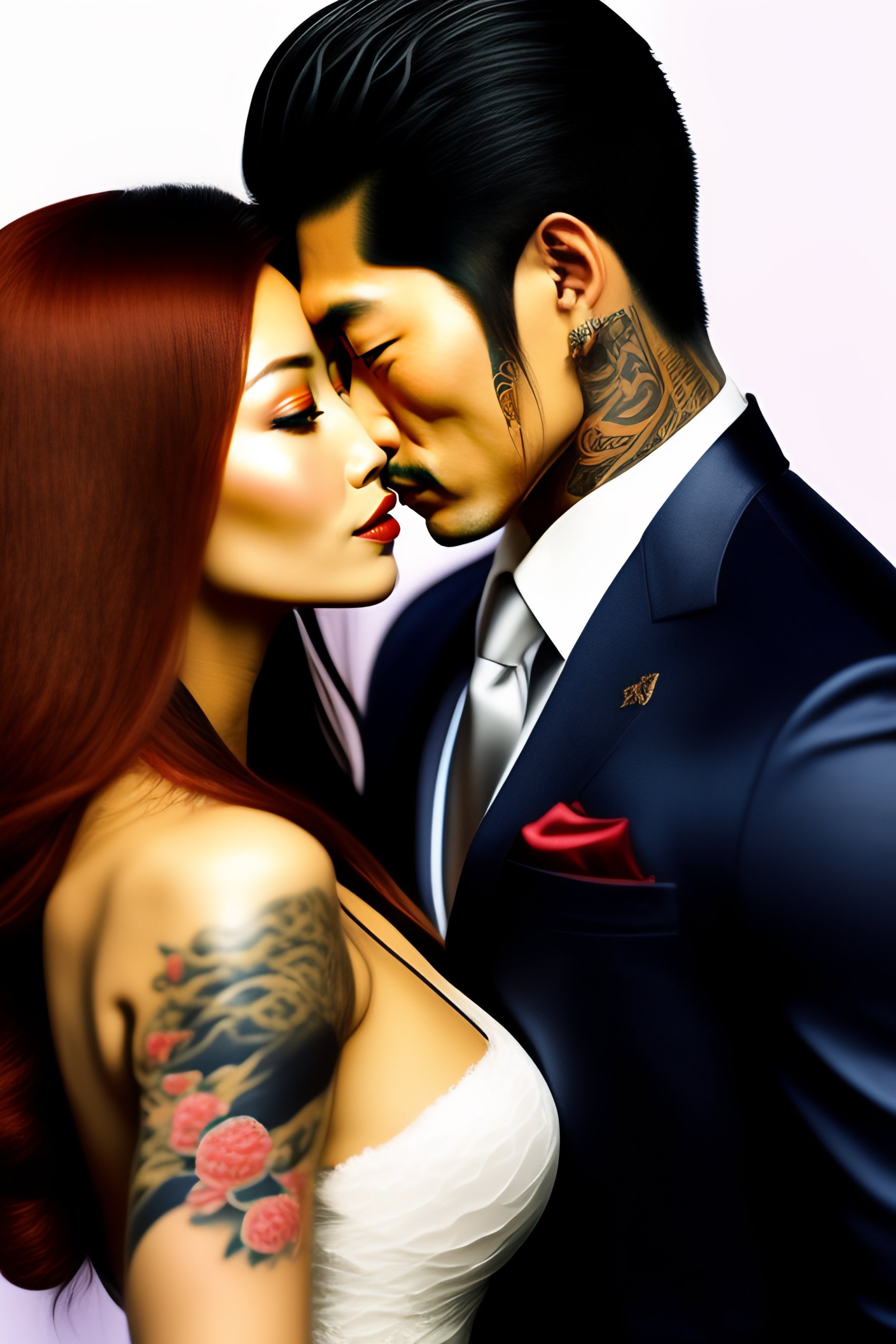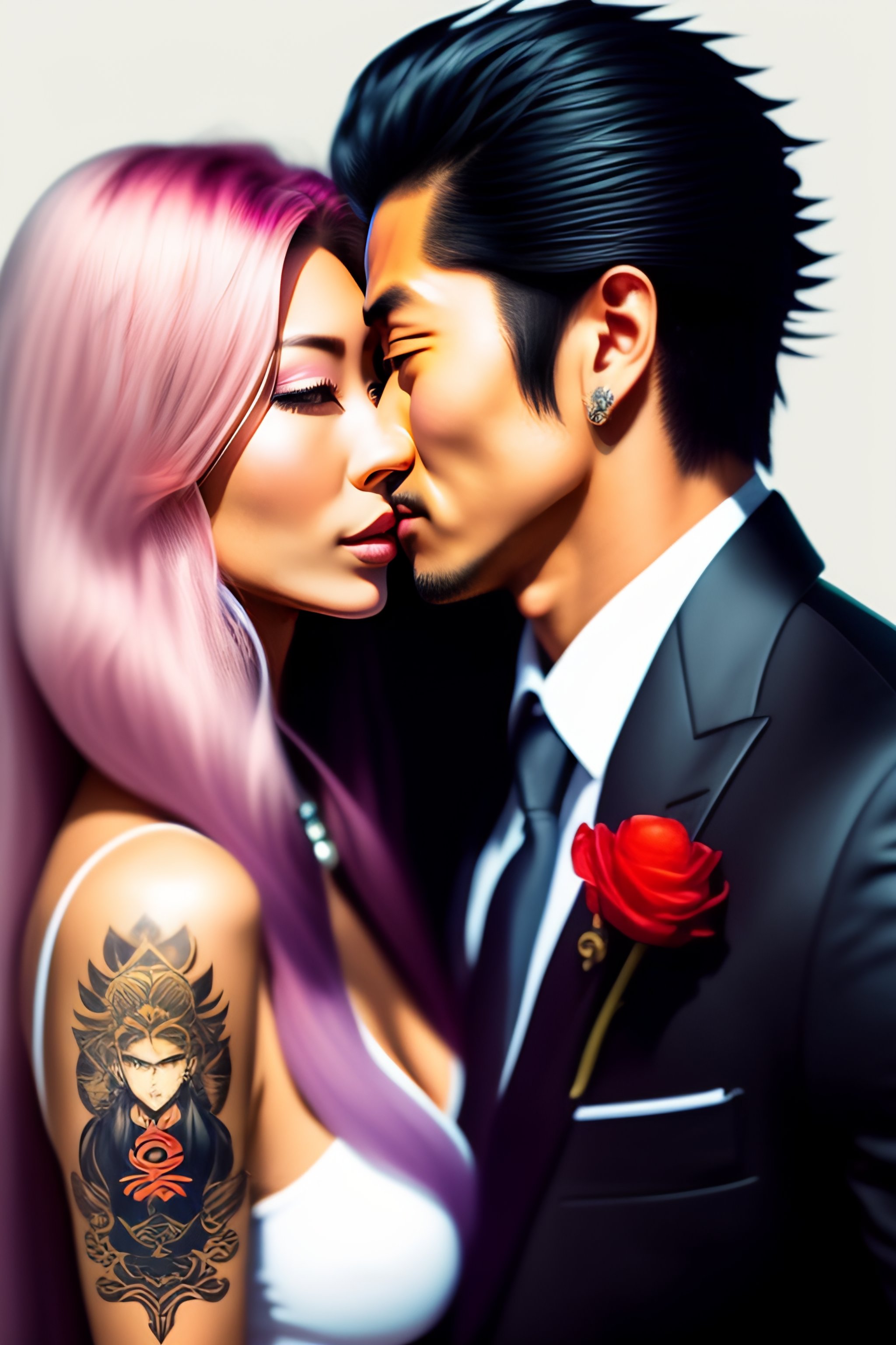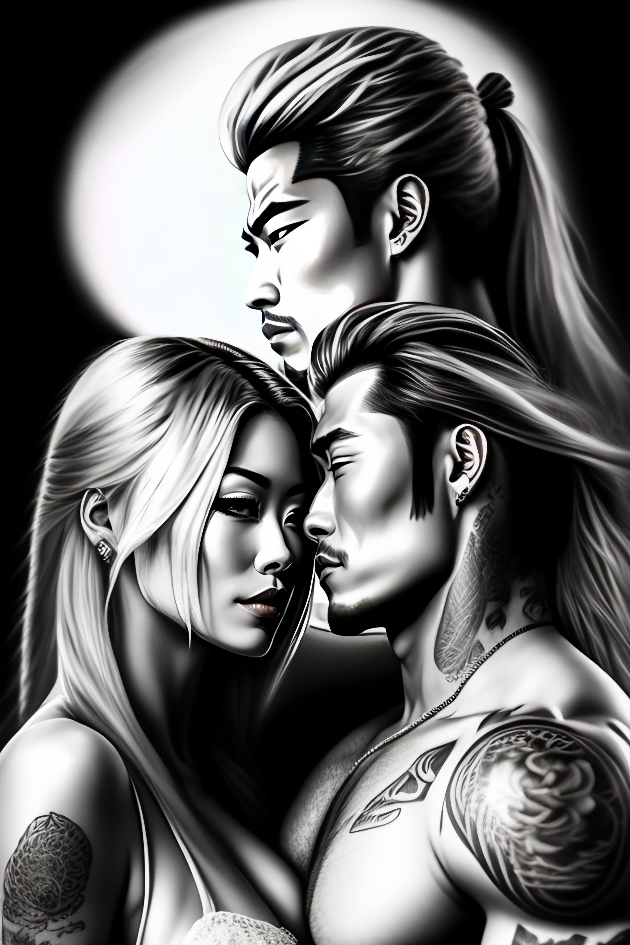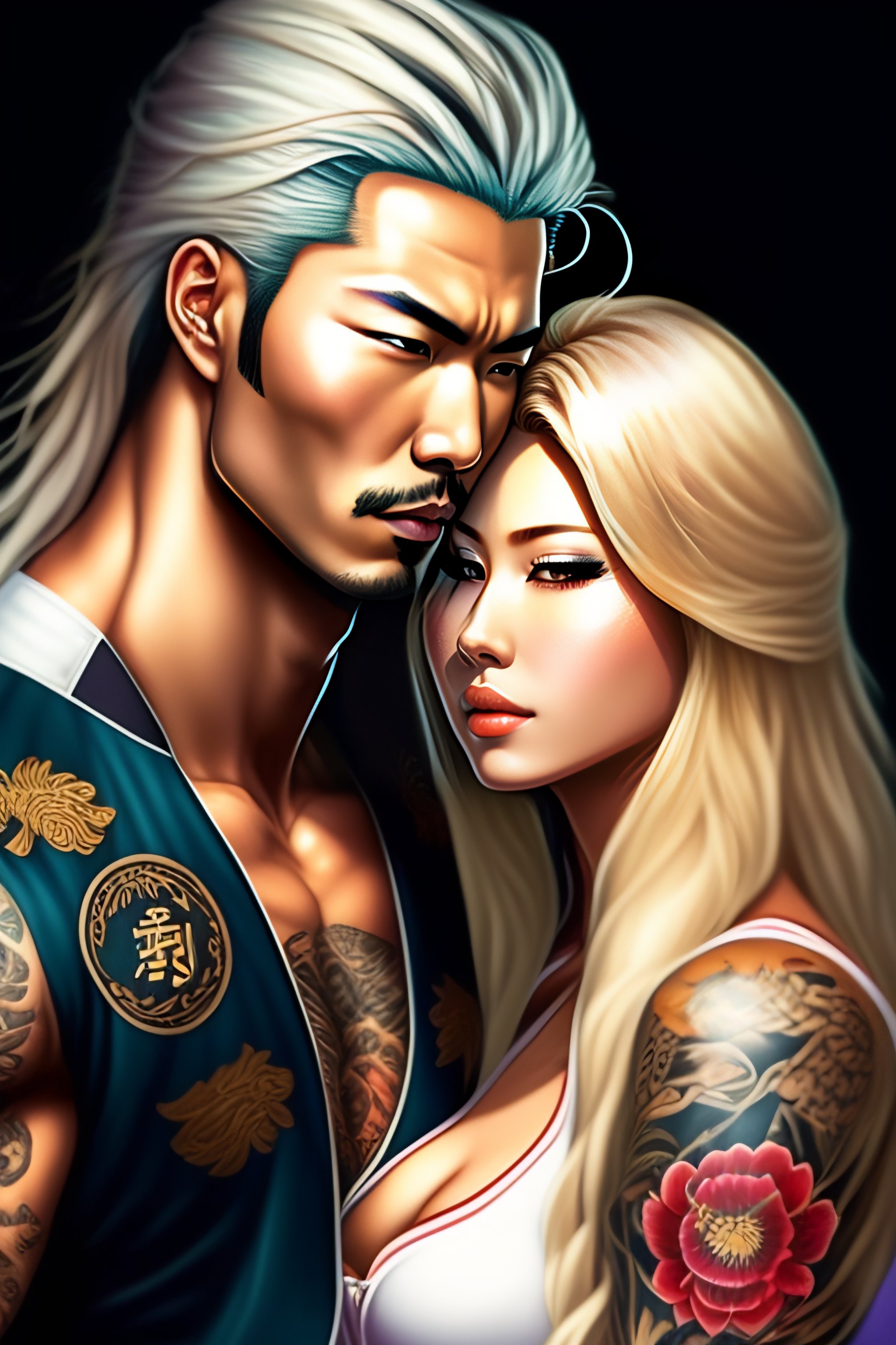 A strong beautiful yakuza man with tattoos kissing a beautiful blond long hair woman in japanese manga style