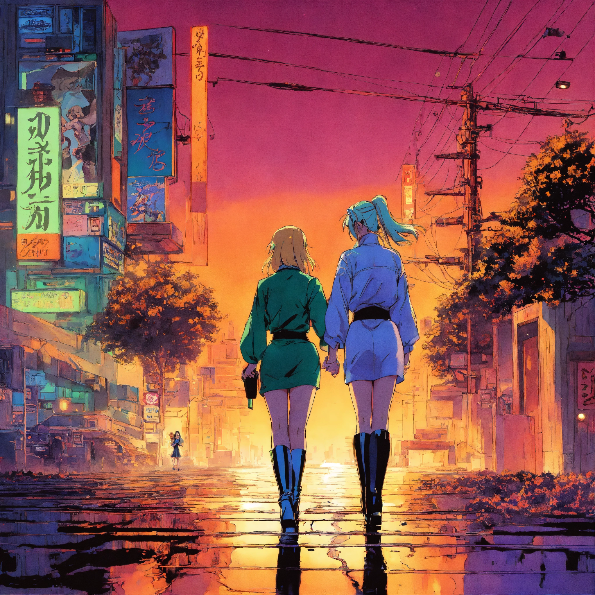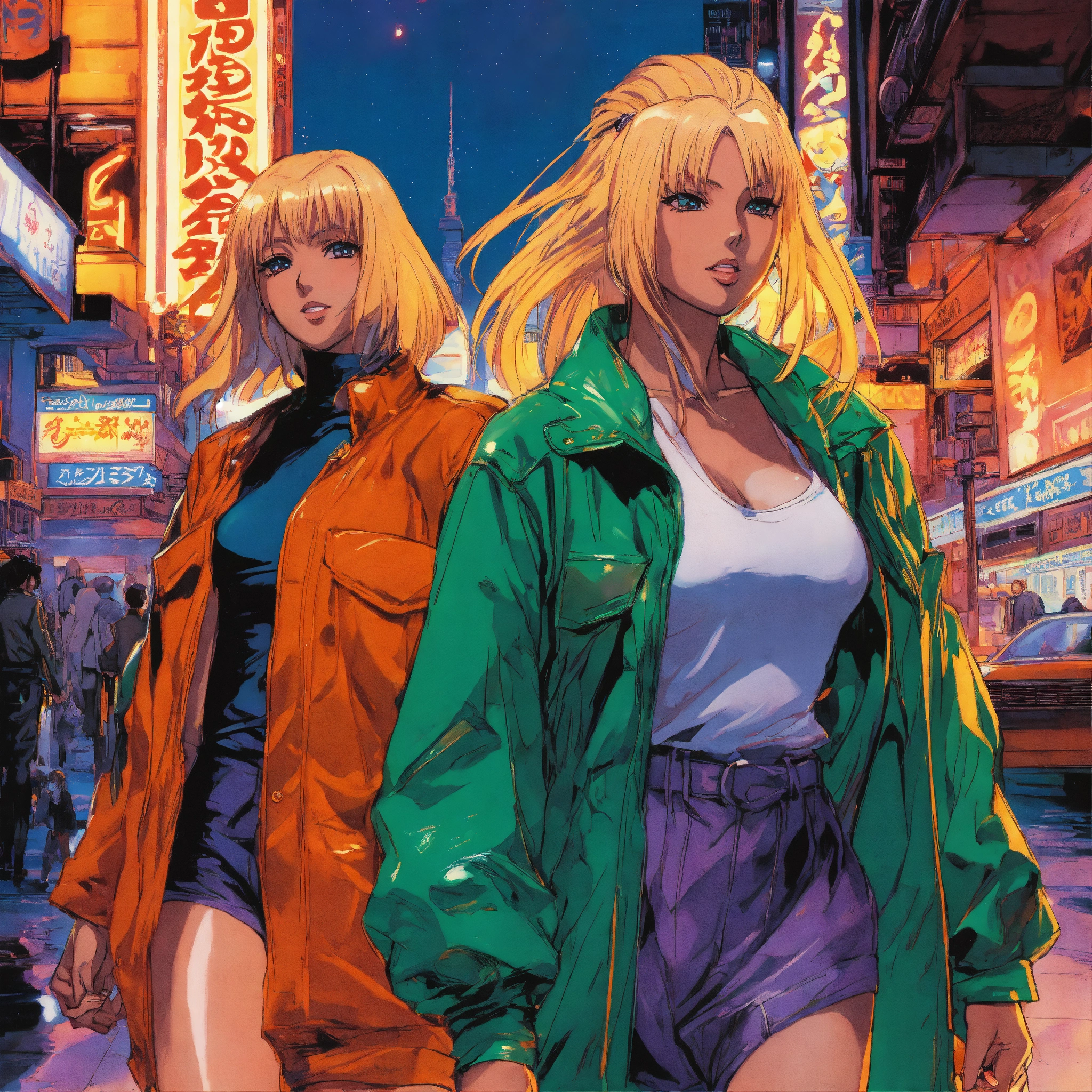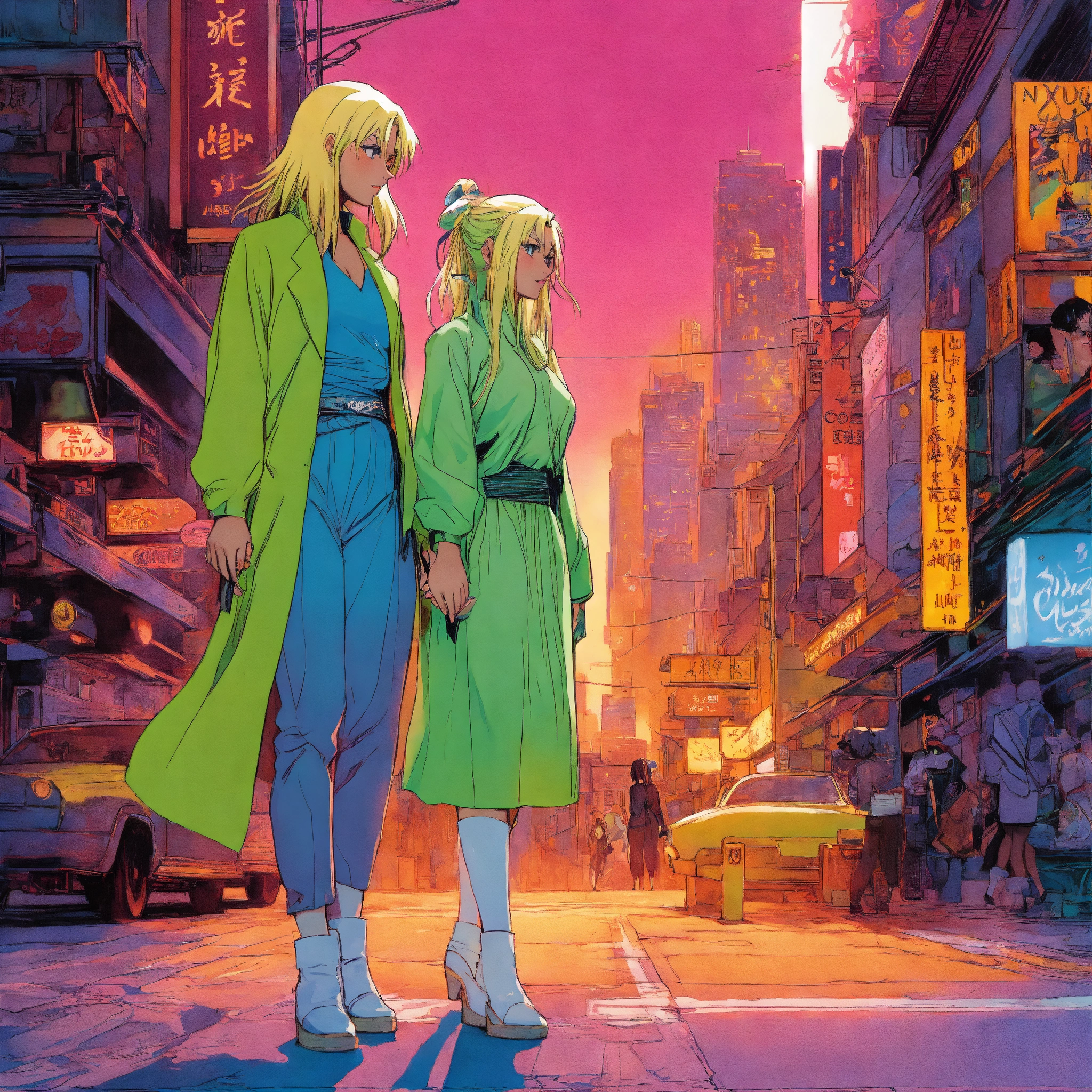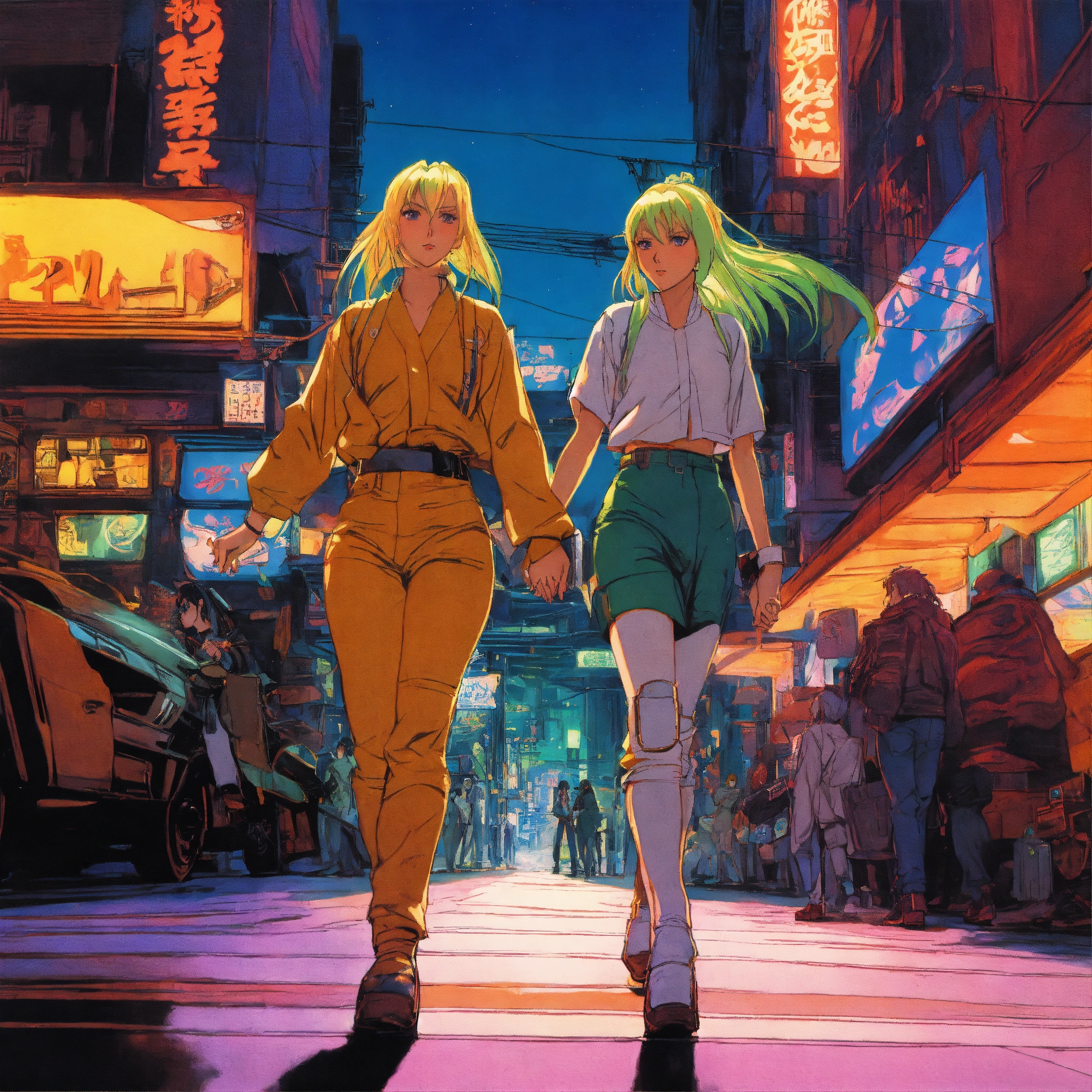 Lady tsunade and princess hinata holding hands in vintage 90's anime style. in a city; by hajime sorayama, greg tocchini, virgil finlay, sci-fi, colors, neon lights