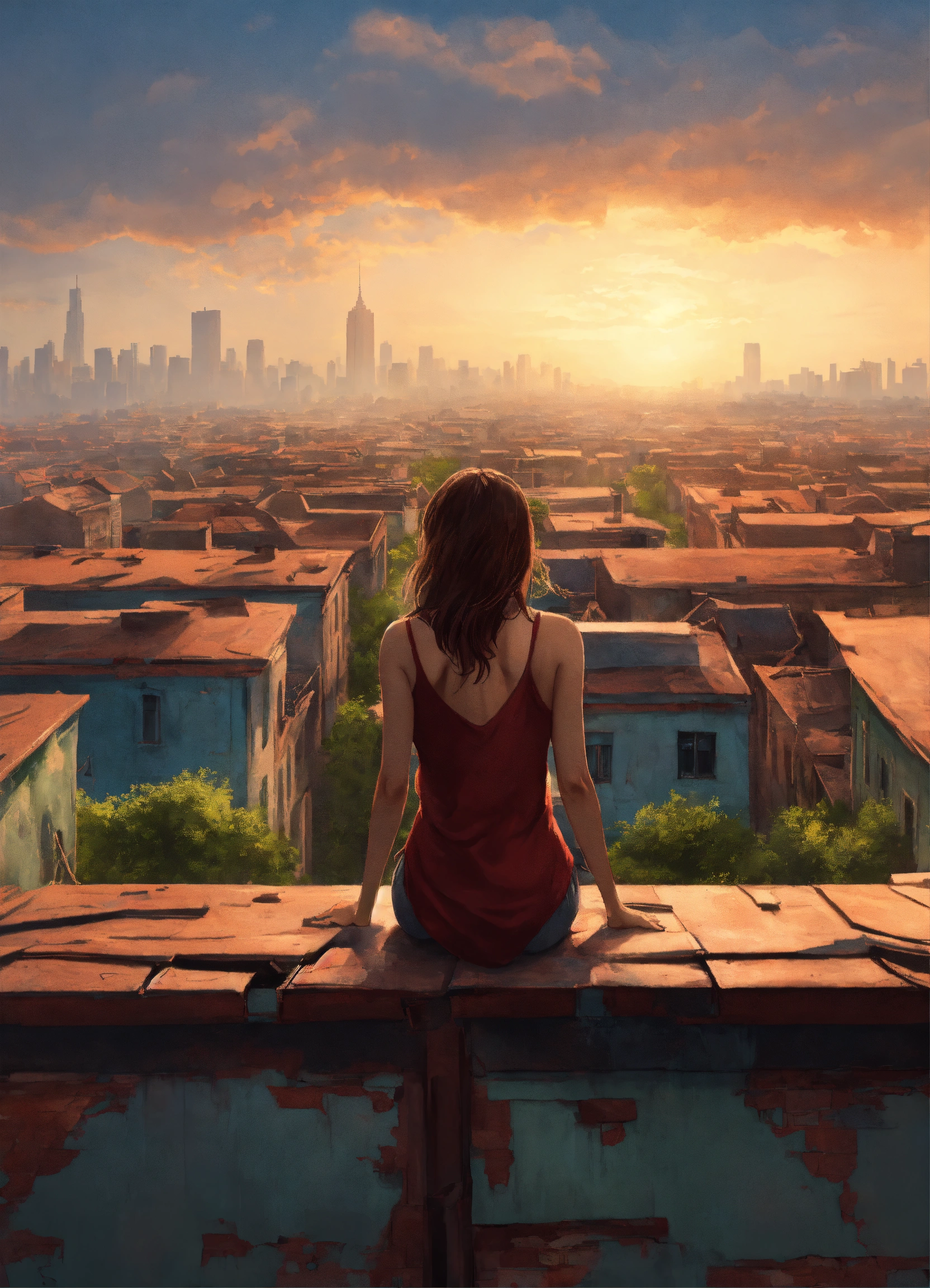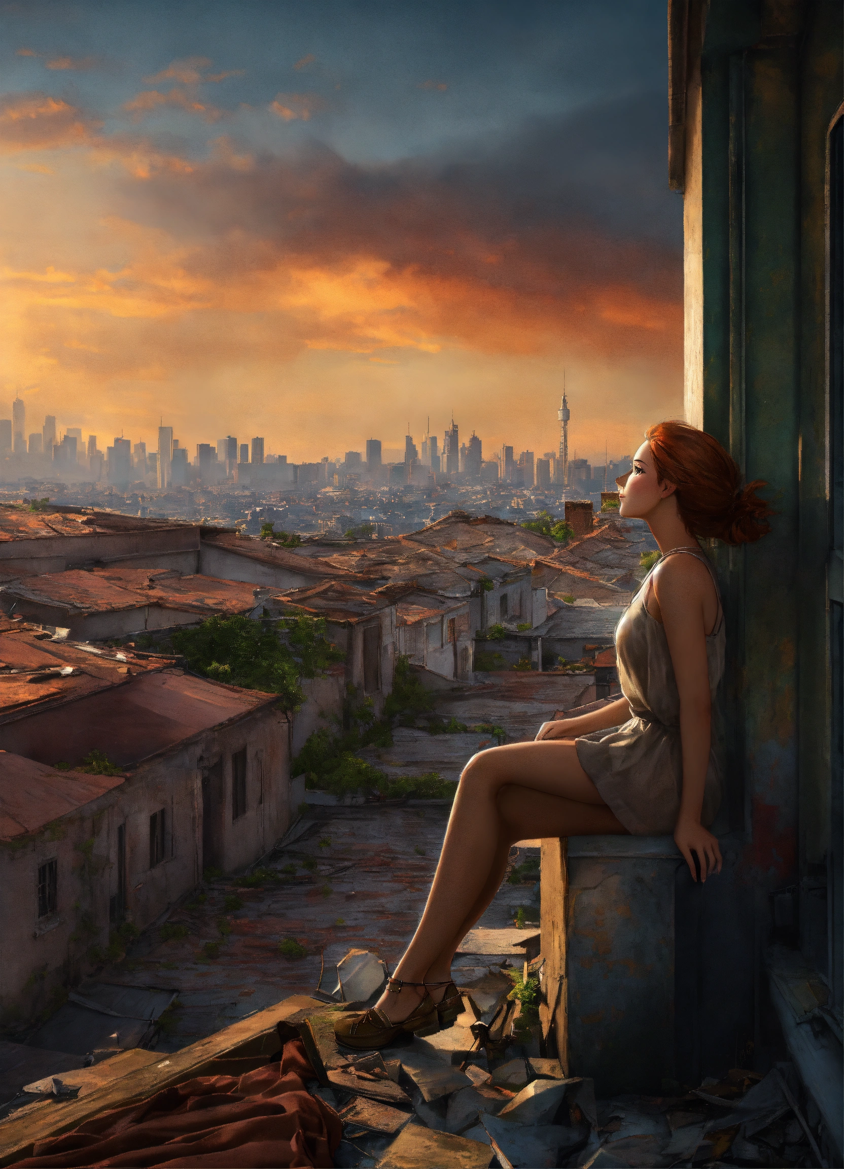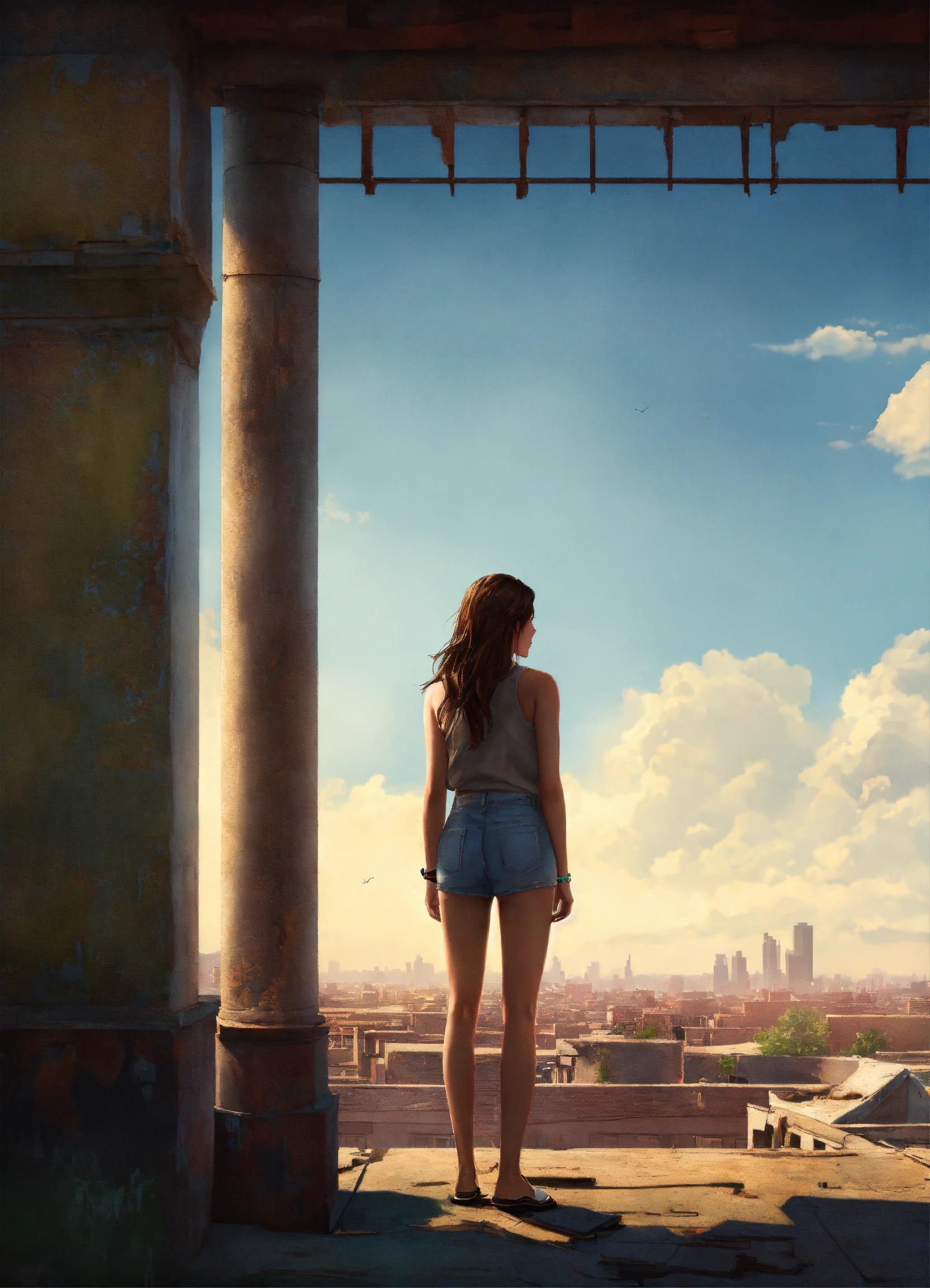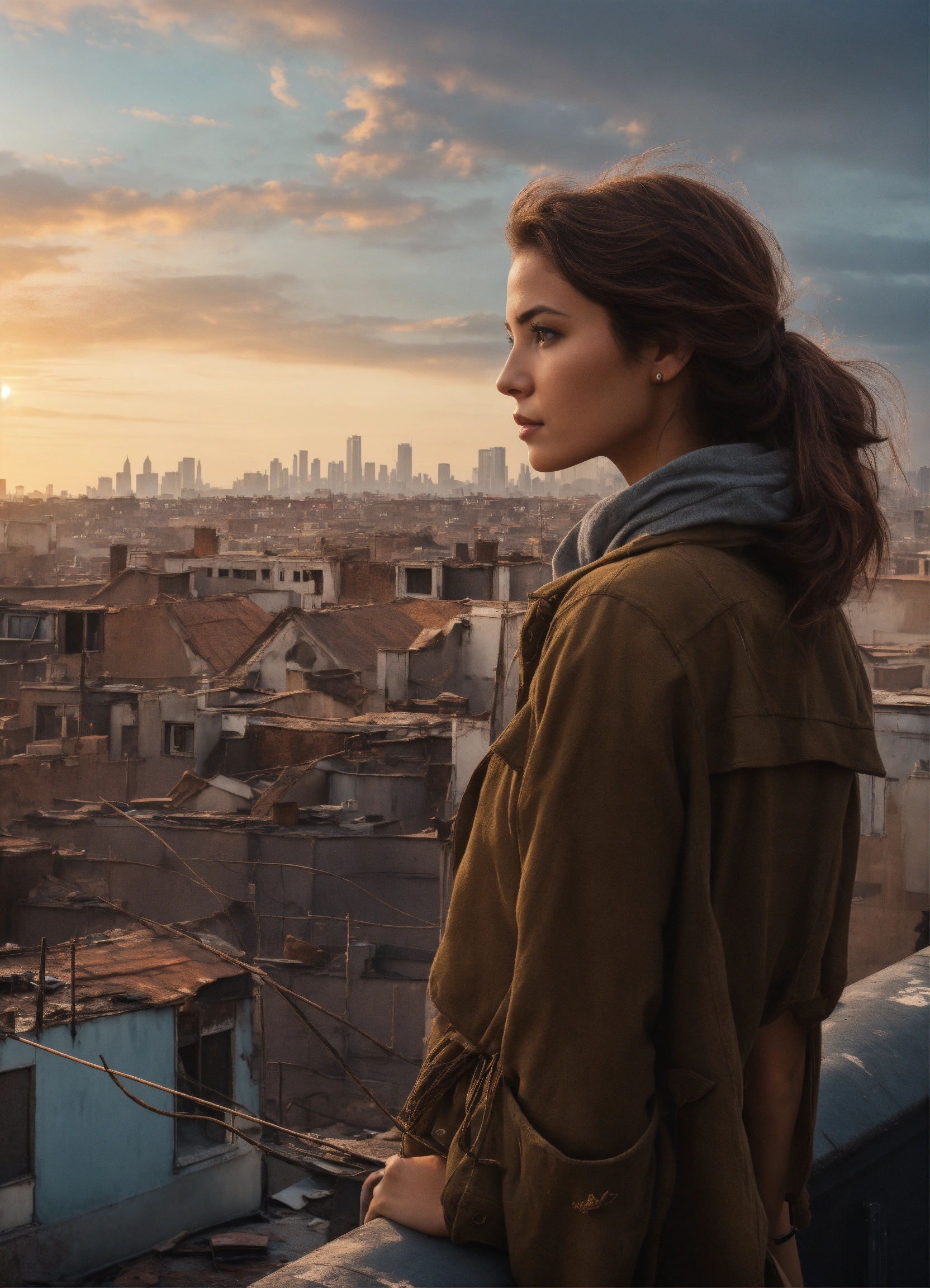 A woman looking at the horizon from an abandoned rooftop, in the background you can see a city, it is very realistic