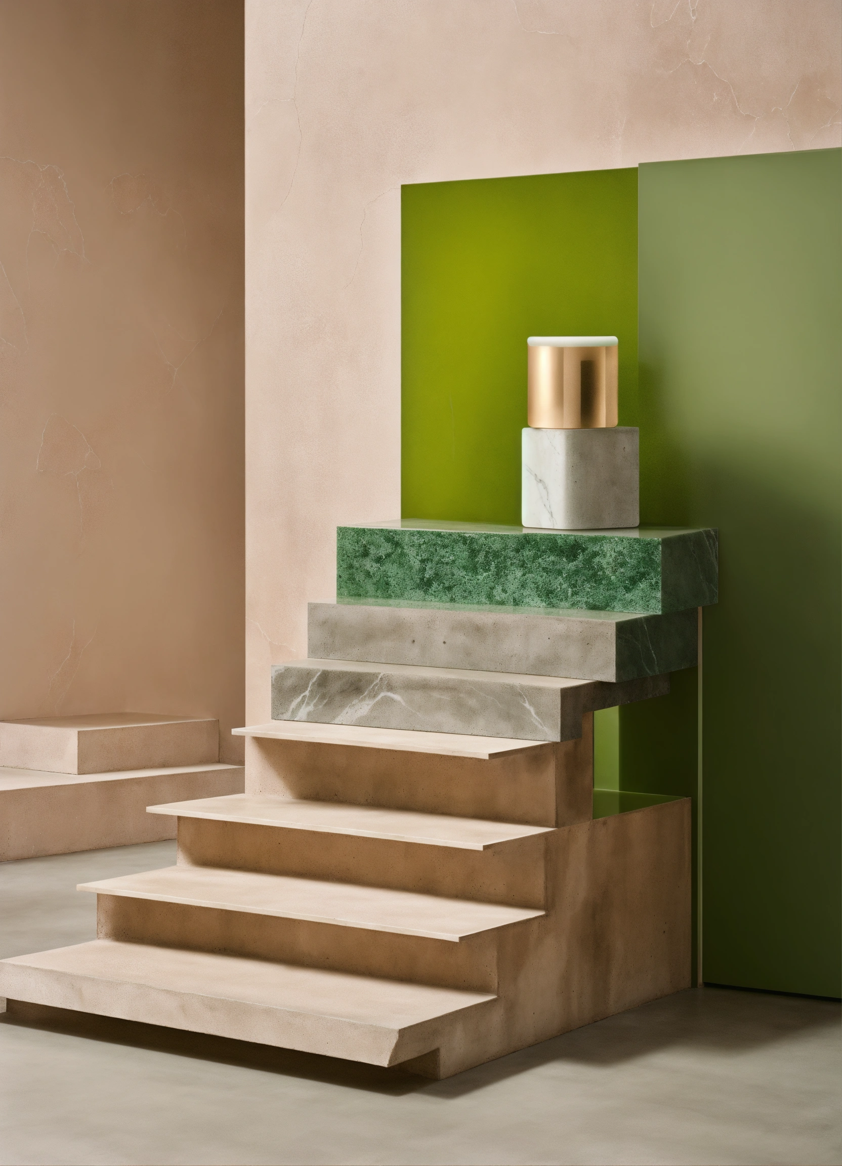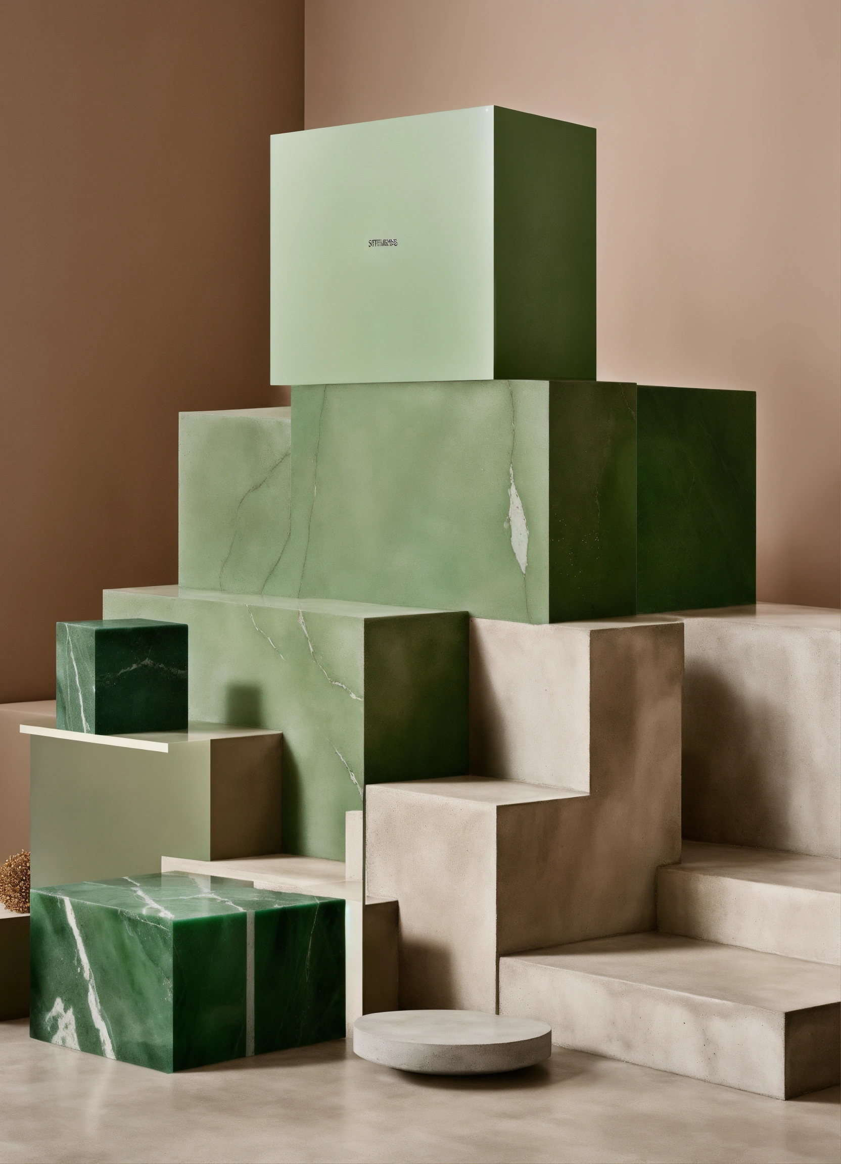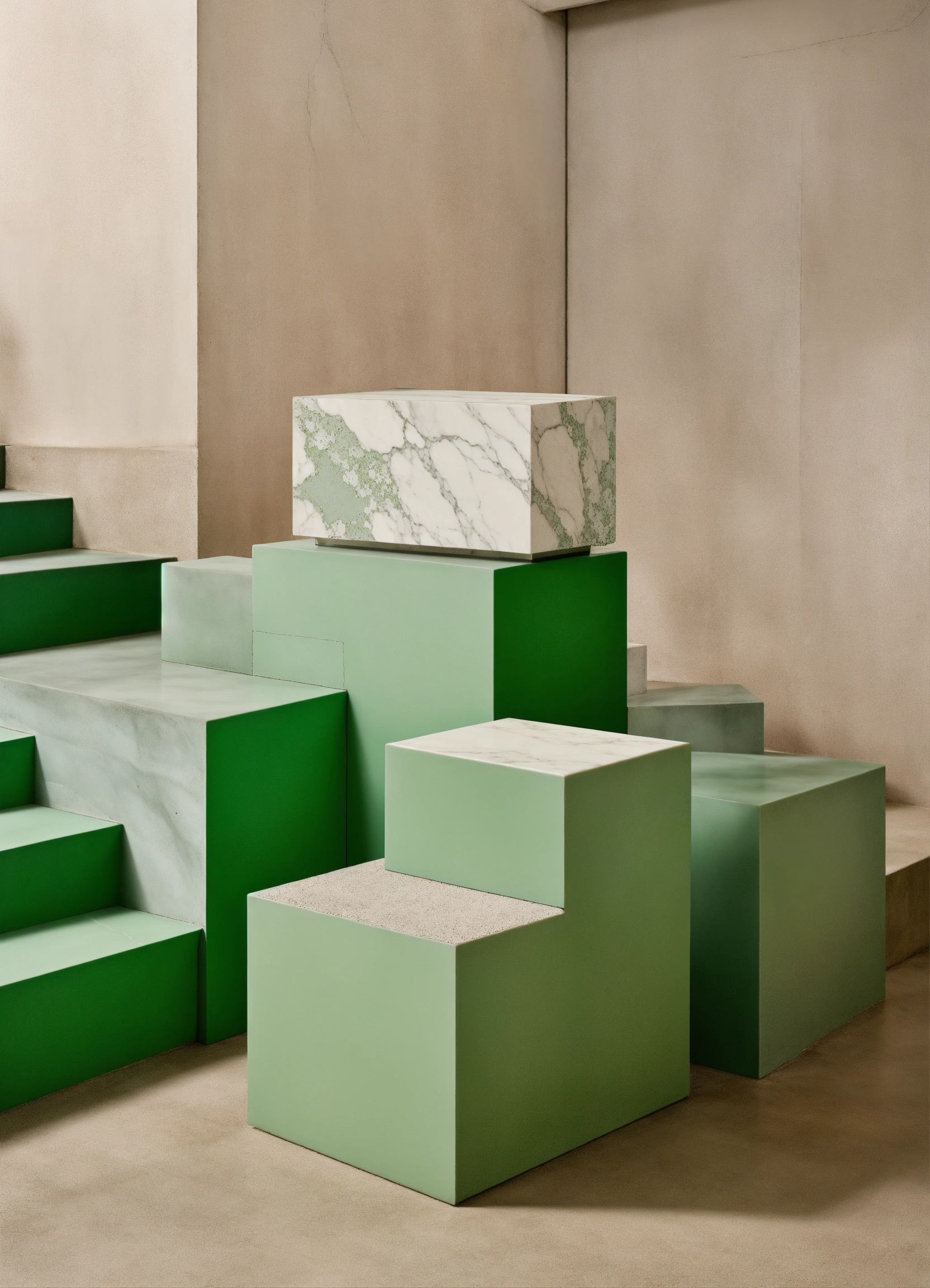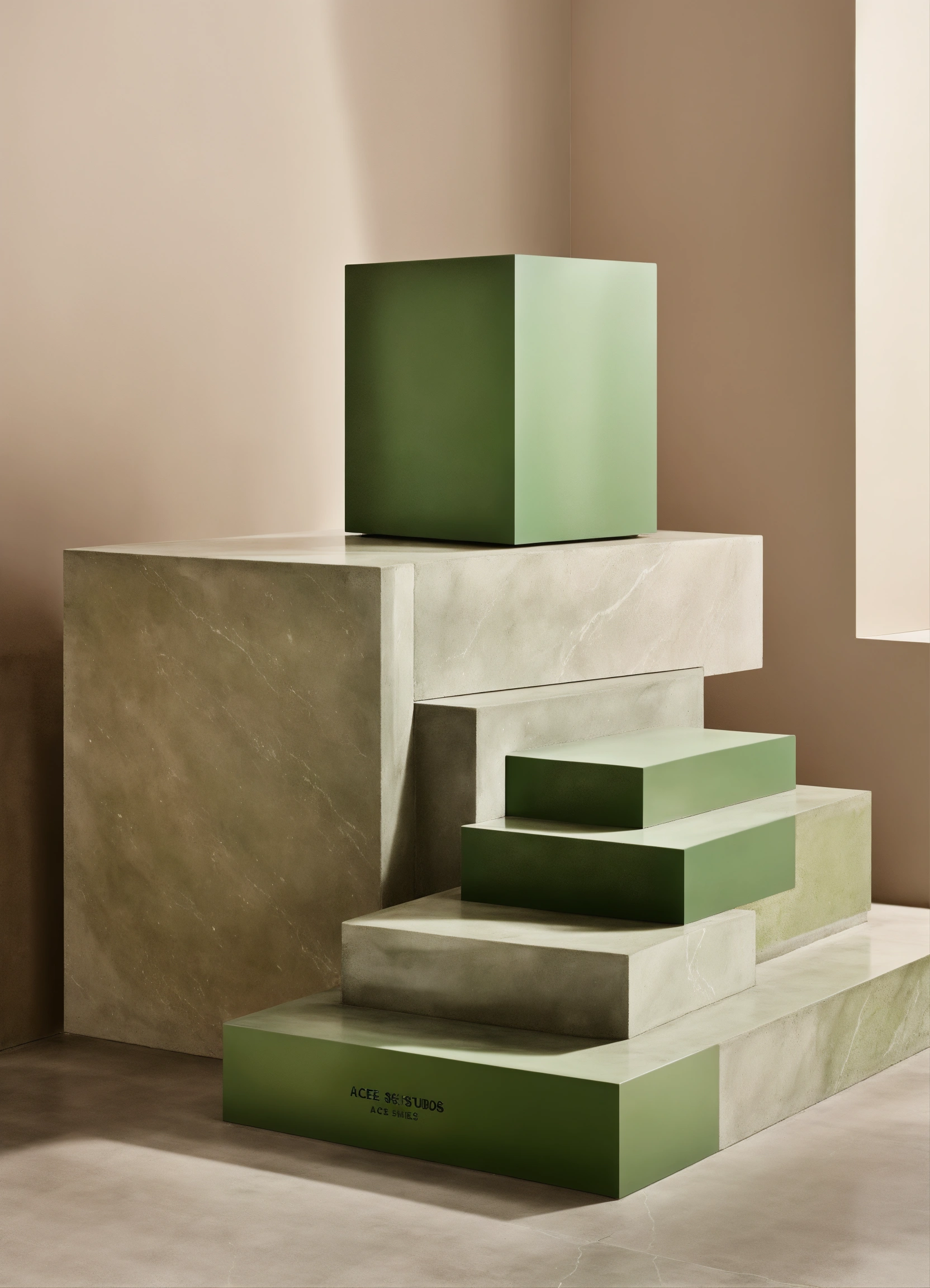 Store product display, acne studios, studio photography, minimal, stacked products on stairs, resin cube, neutral tones, pop of green, concrete and marble