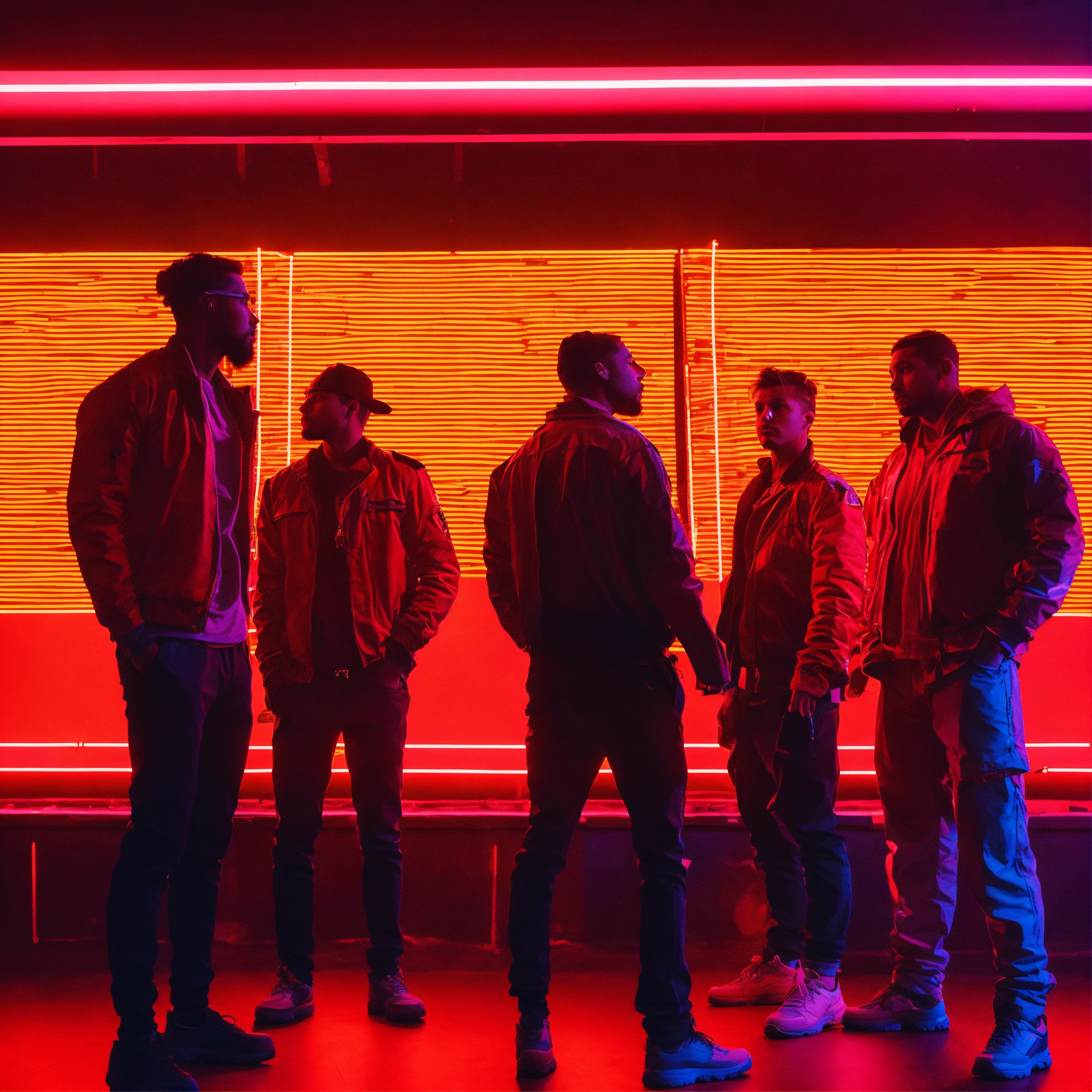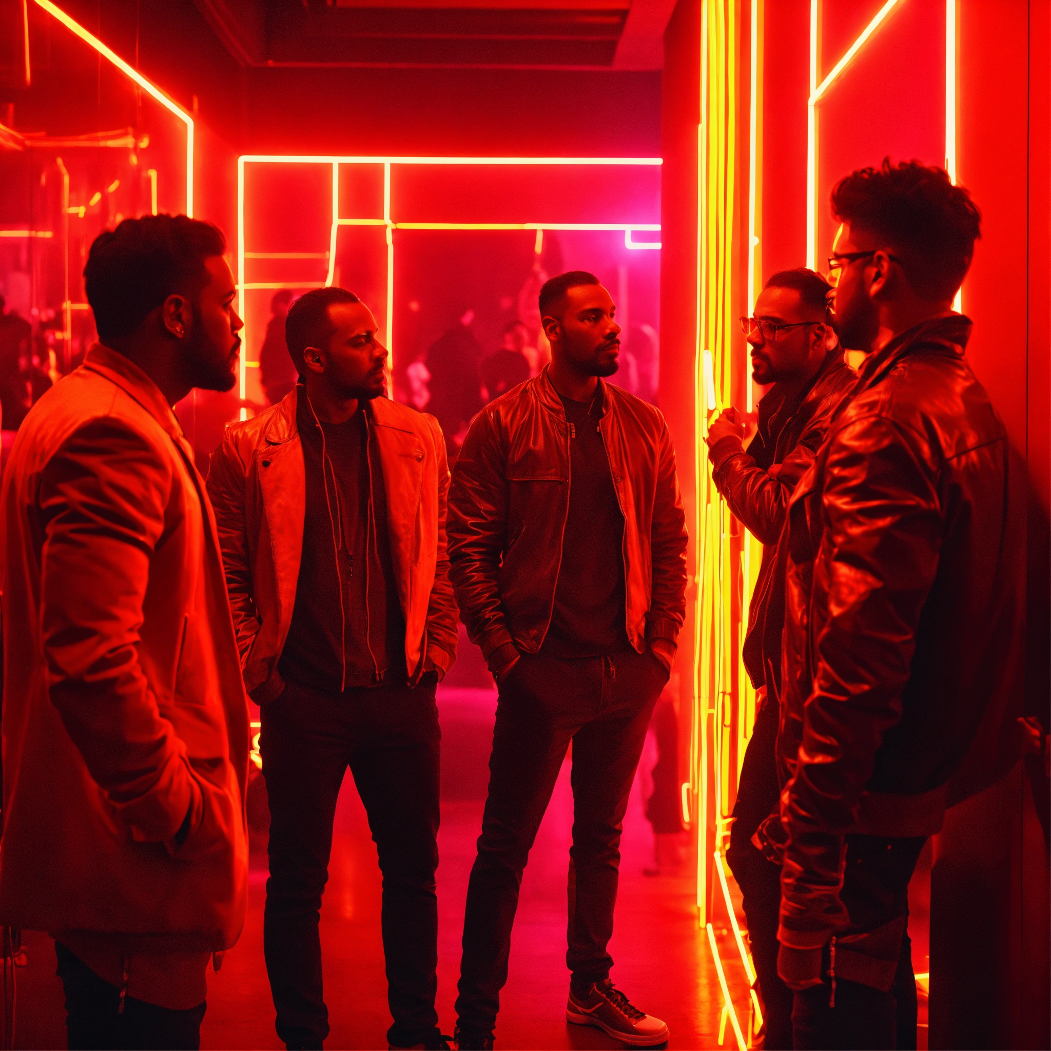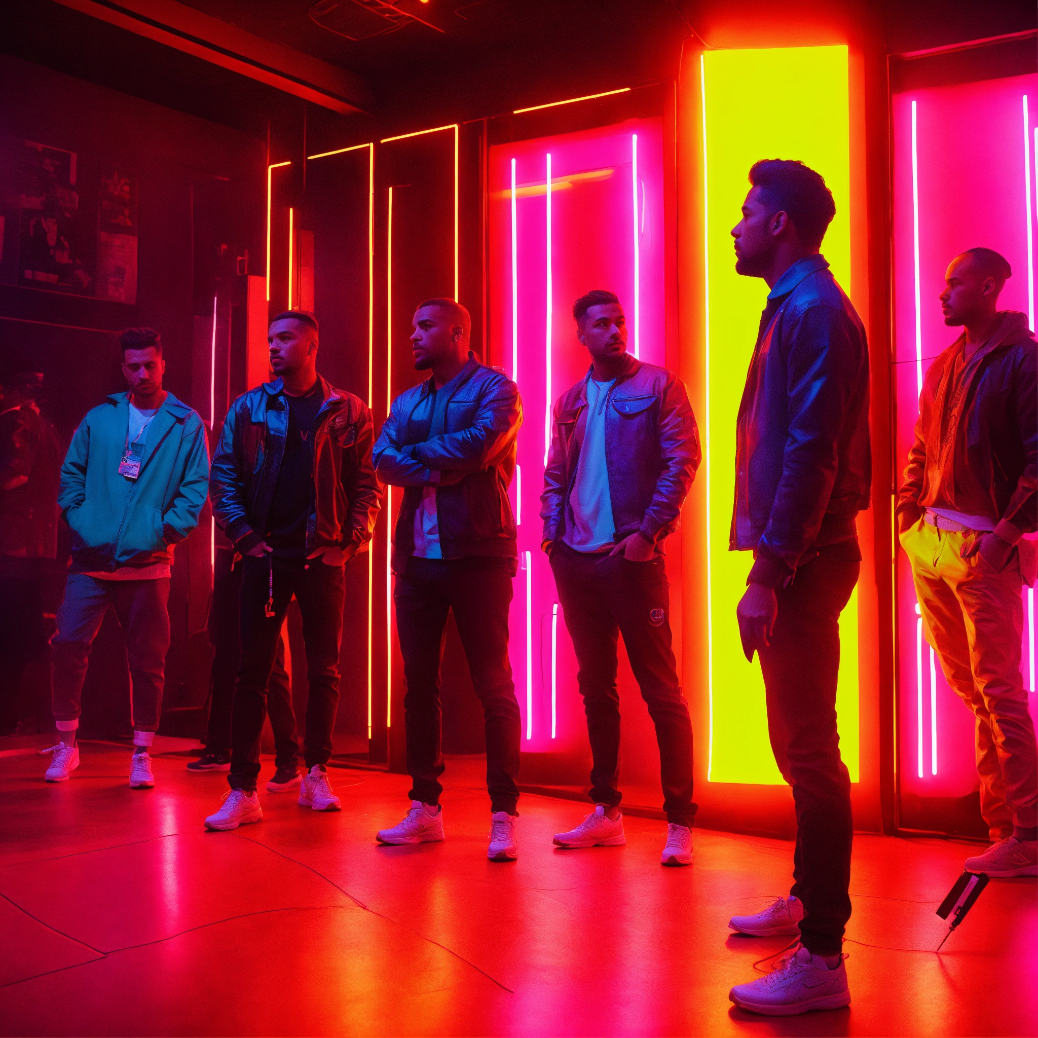 Inside a club, one man is in front of 4 others, the 4 ones are in a line, the first man is pointing to one a them, like, he looks like he is thinking, 8k, realistic, picture, neon