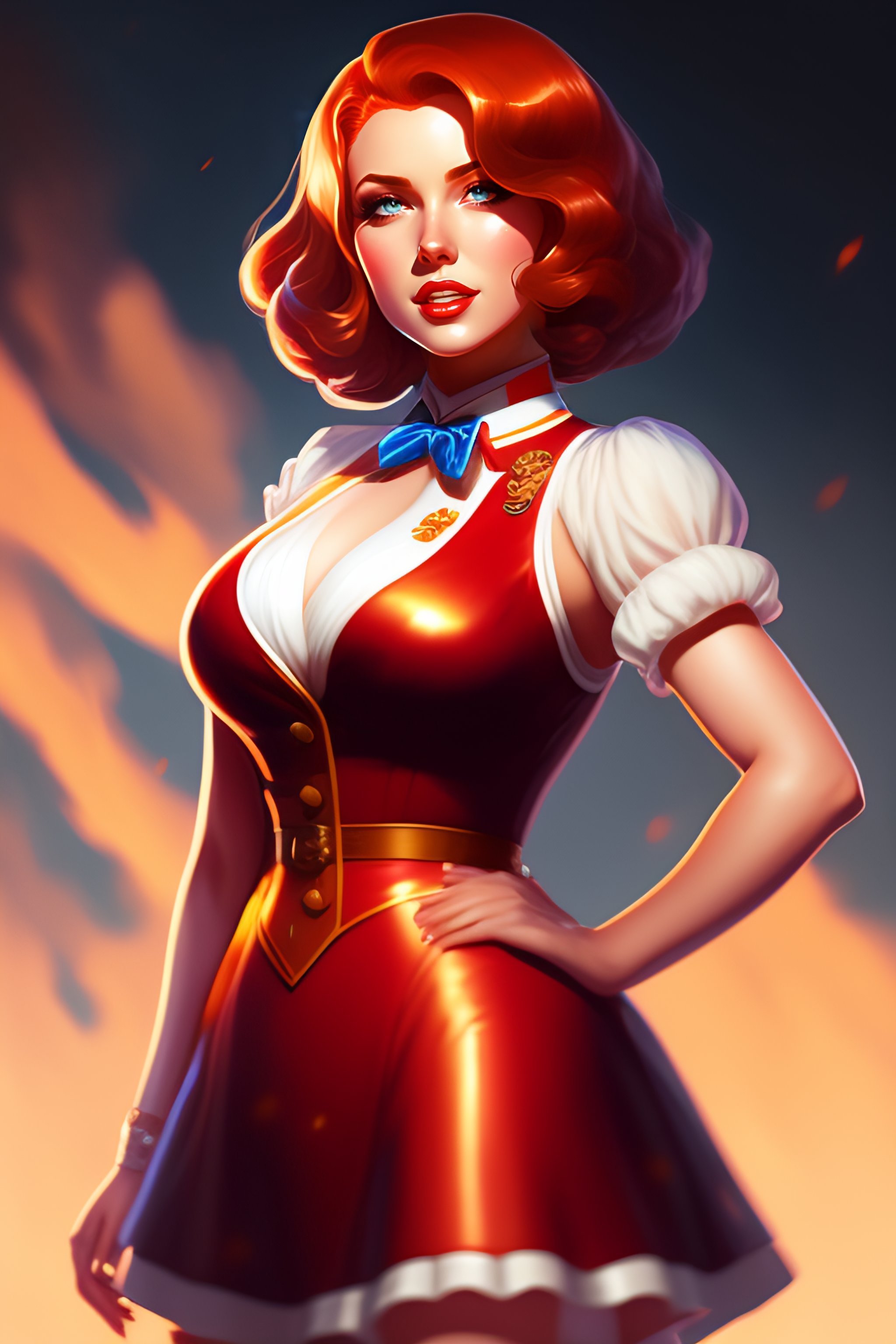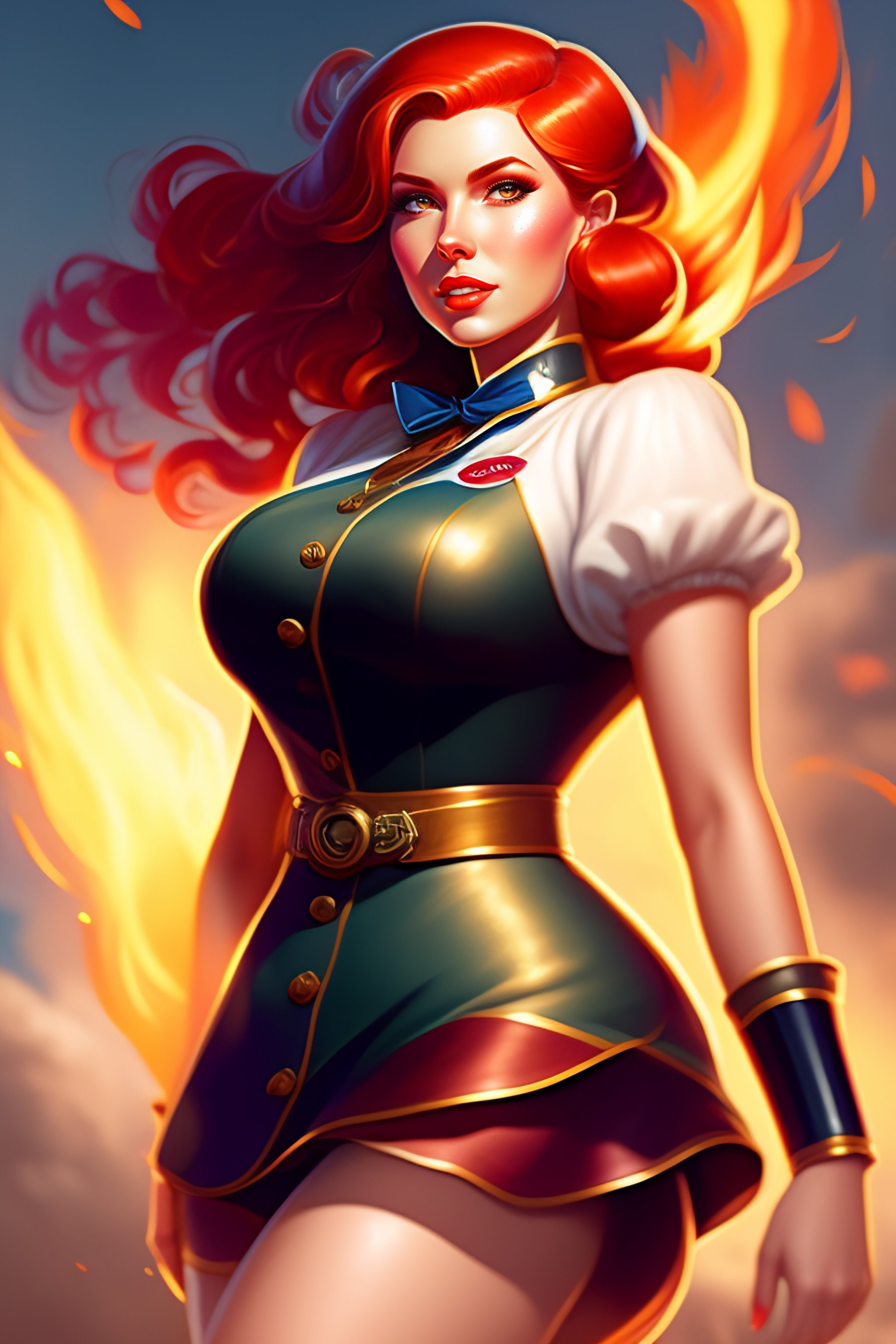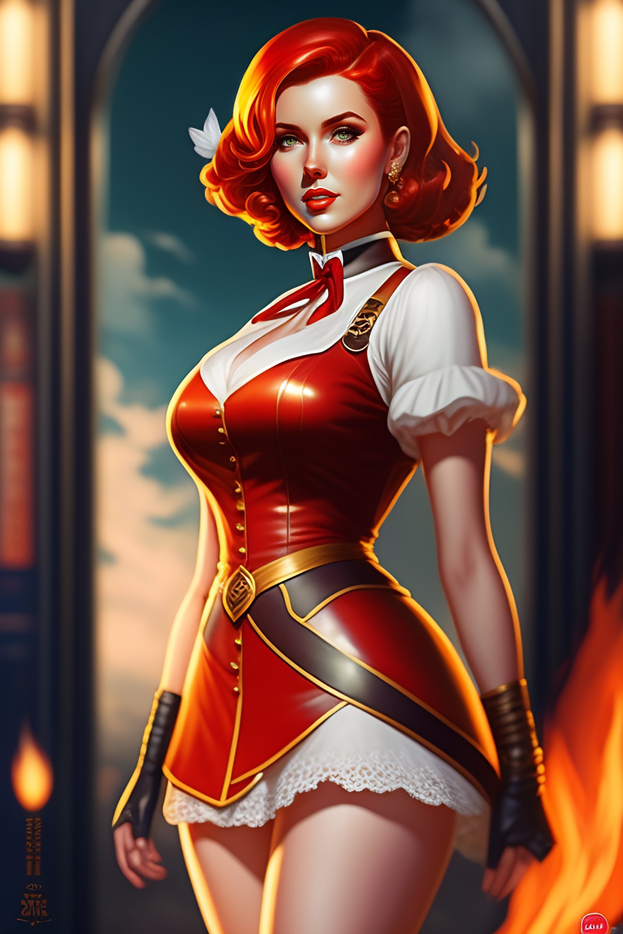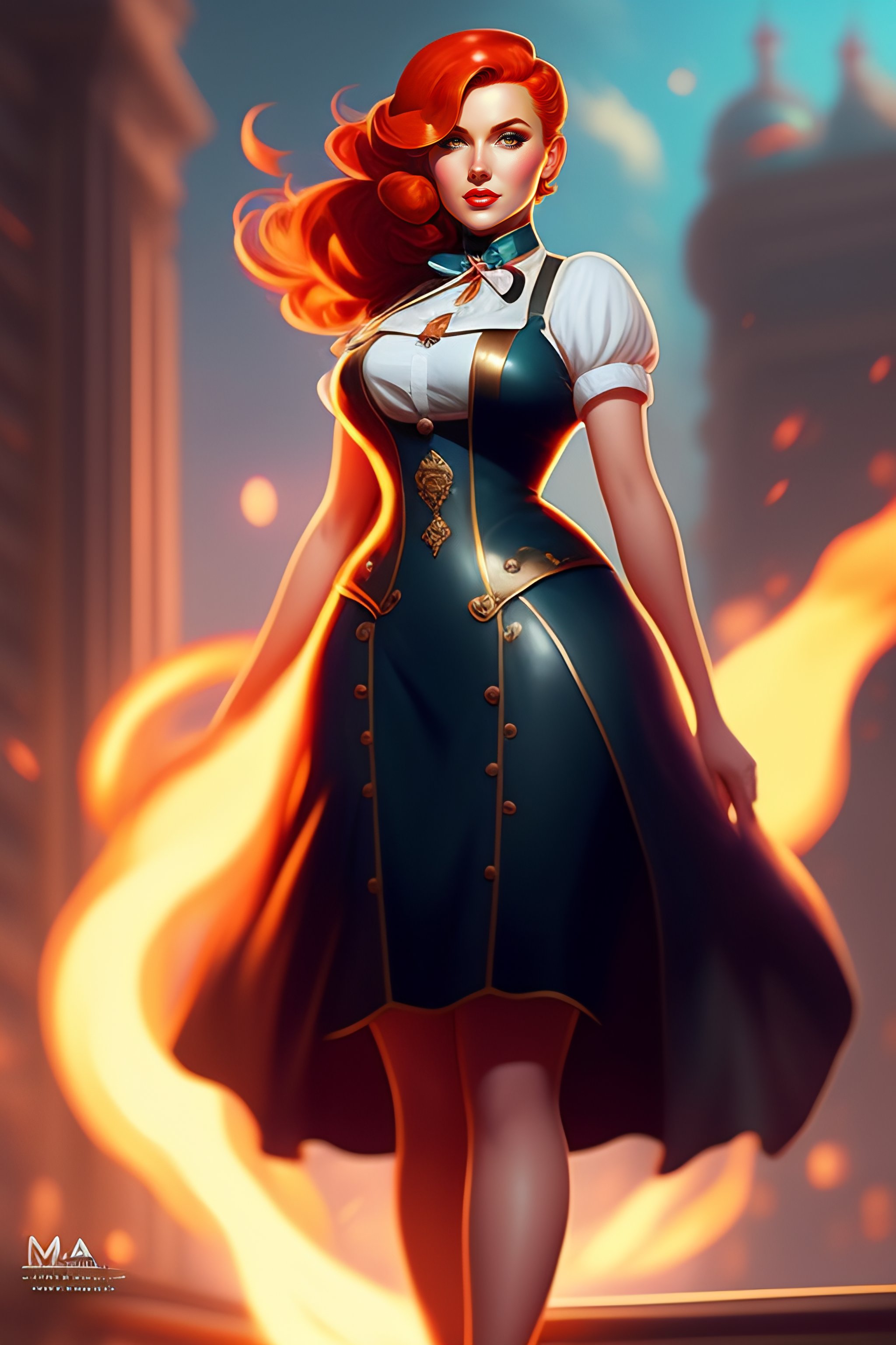 Full body, from above, mia malkova as elizabeth from bioshock infinite, red hair, marilyn monroe style, doe eyes, fire in the background, by shinkai makoto studio ghibli studio key hideaki anno sakimichan stanley artgerm lau rossdraws james jean marc simonetti elegant highly detailed digital painting artstation pixiv