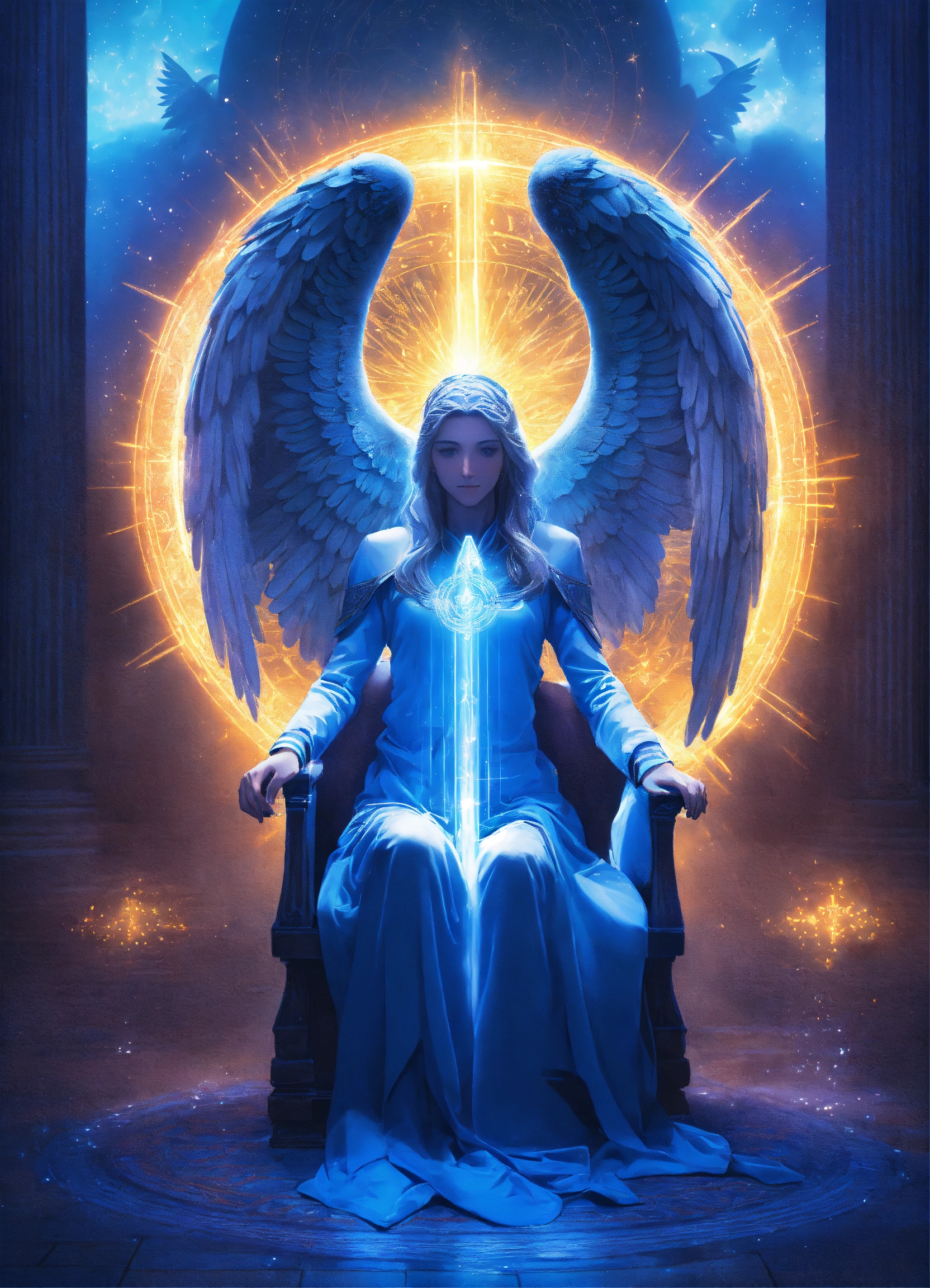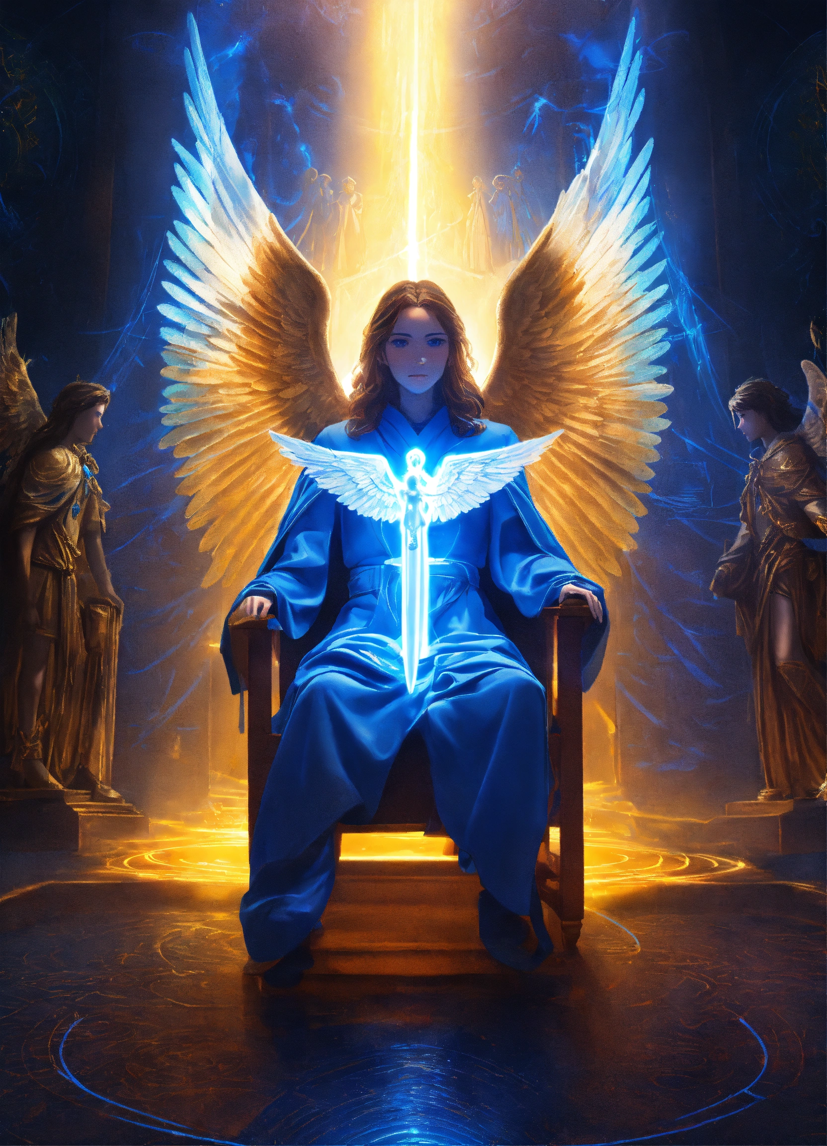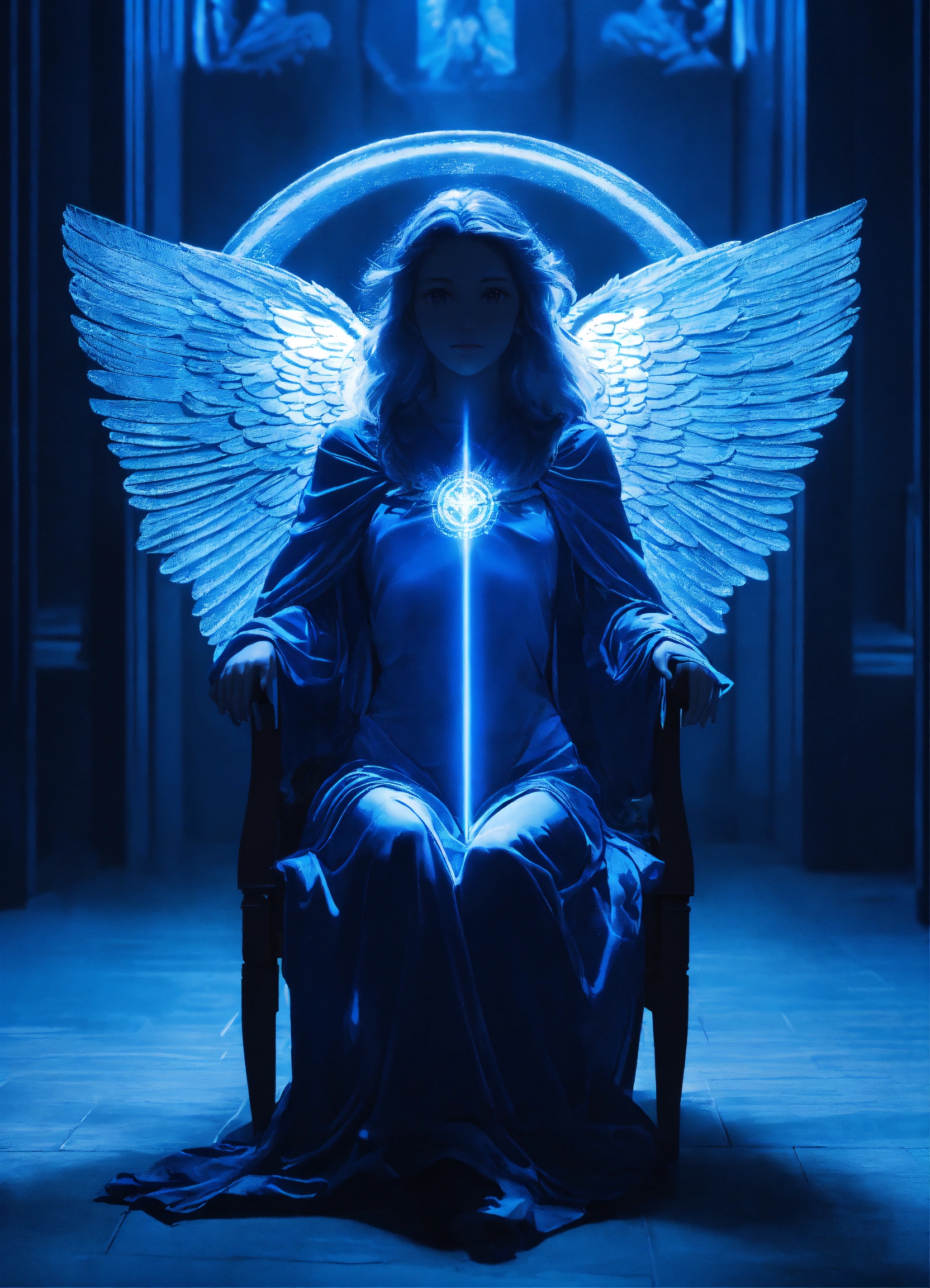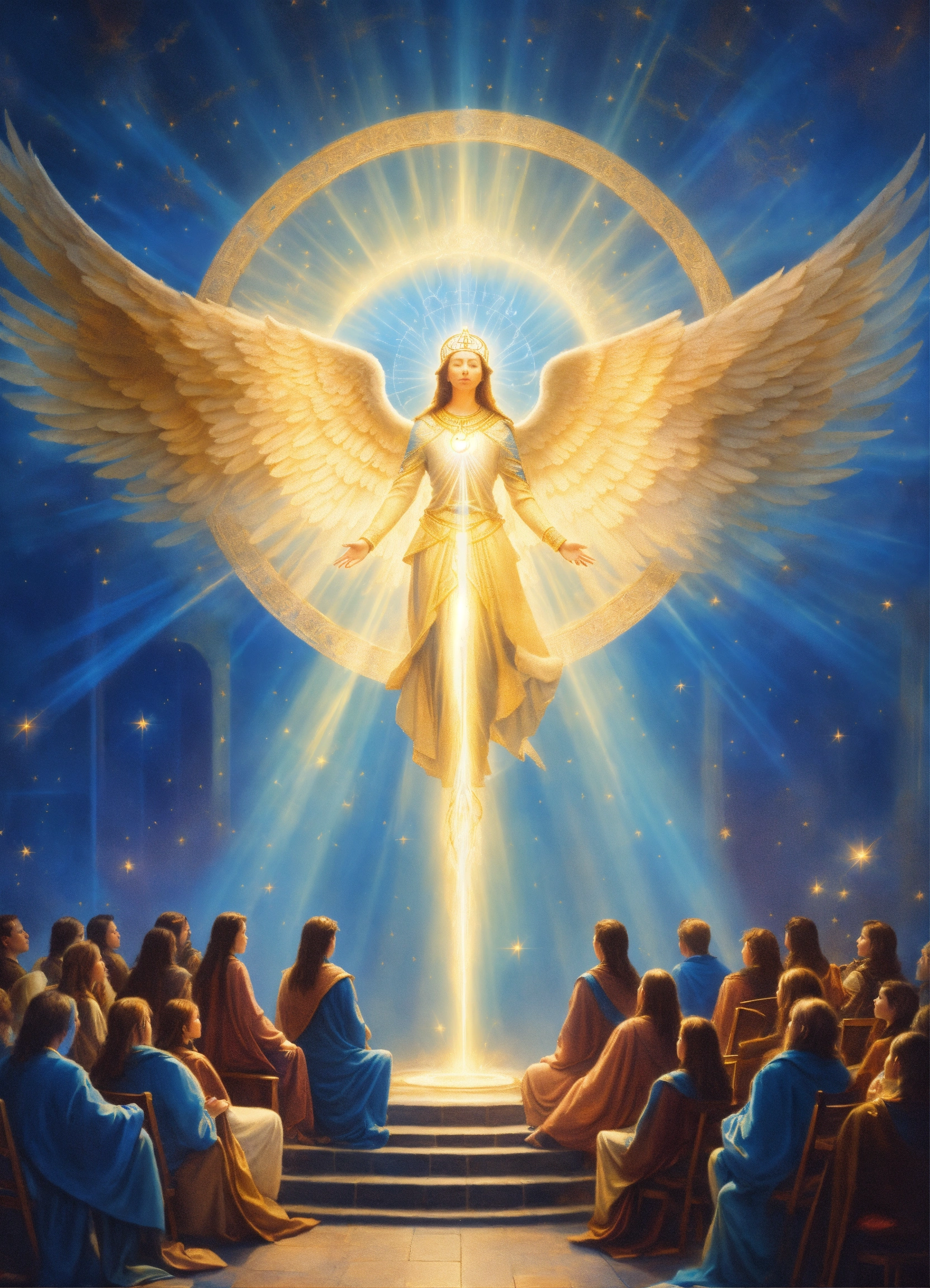 Many people siting on a chair in a circle archangel michael surrend her with blue light, blue rays of light, inner transformation, sacred symbols. spiritual awekening, mystic symbols