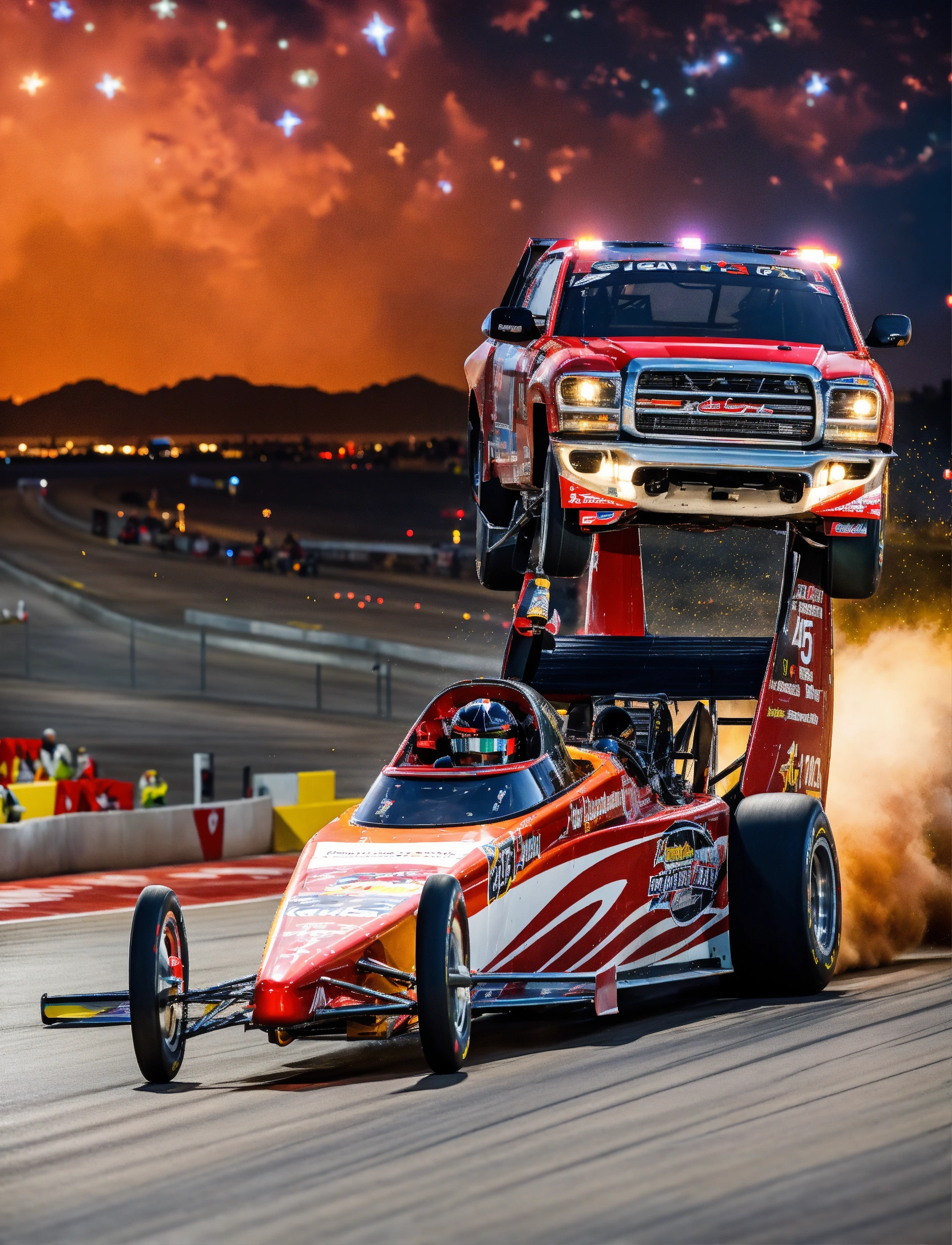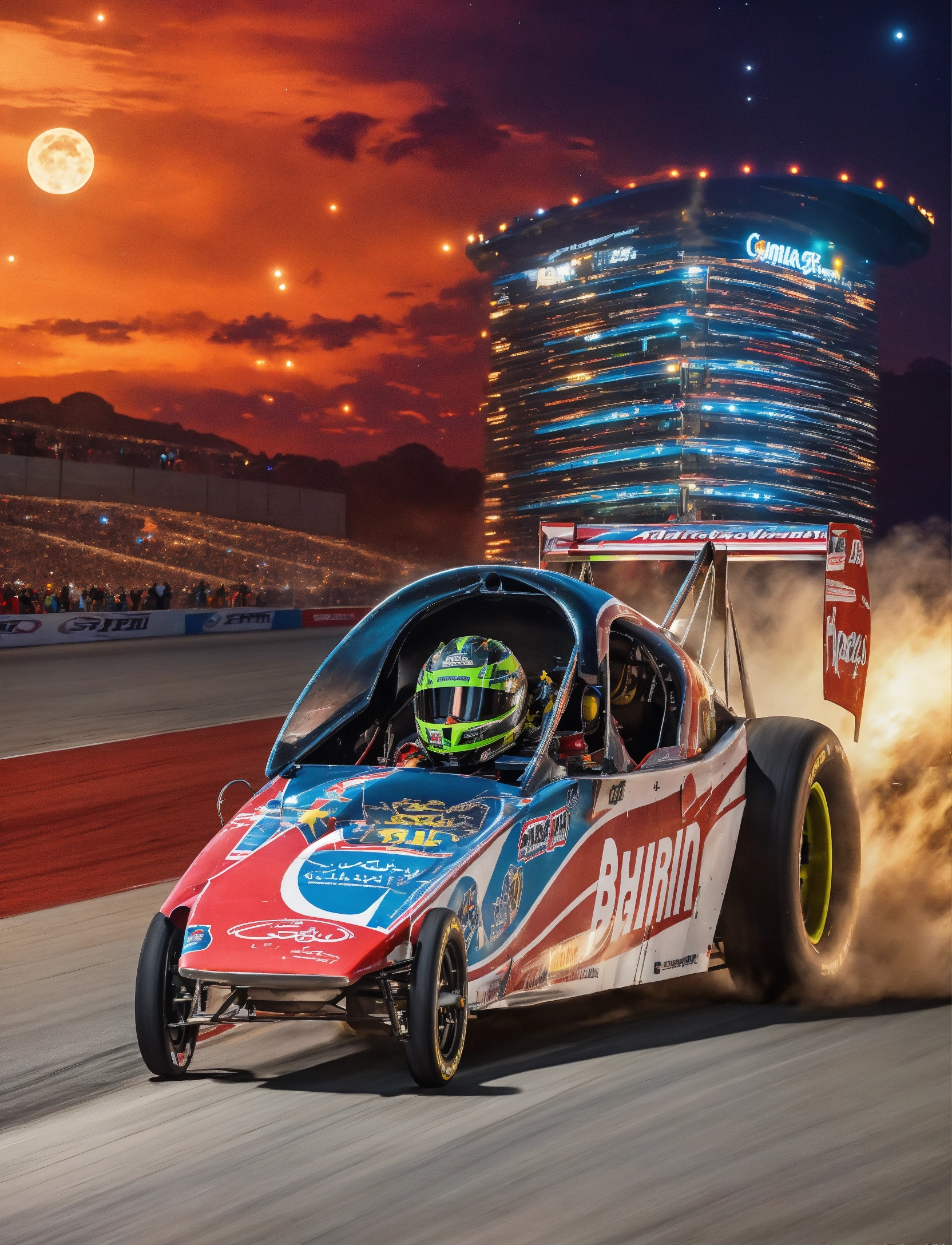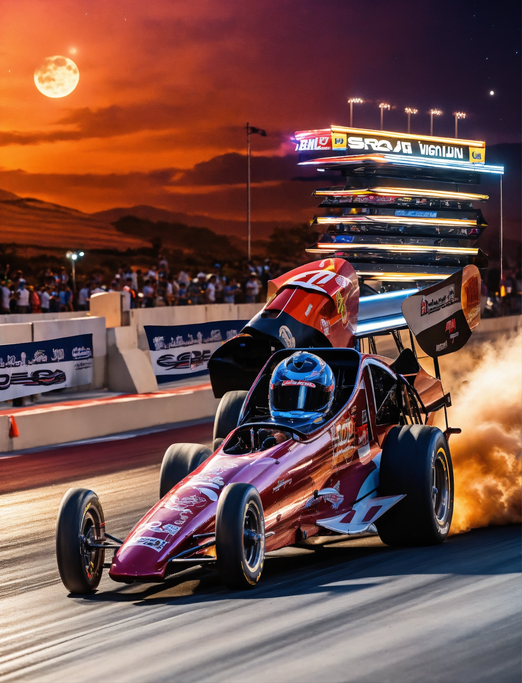 Generate a captivating digital illustration of a bahrain dragster racing championship event unfolding on a meticulously detailed high-octane dragstrip beneath a dramatic, star-studded night sky. convey the intense speed, excitement, and the thundering engines of drag racing, while emphasizing the atmospheric beauty of the dark night with stars and possibly a moon shining down. the composition should capture the thrill and energy of the race, highlighting the drag racers in action and the sleek high-octane dragstrip, all against the stunning backdrop of the arabian night sky.