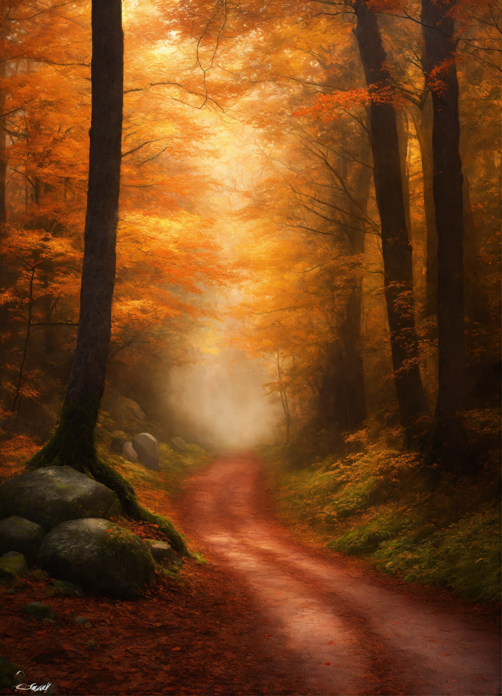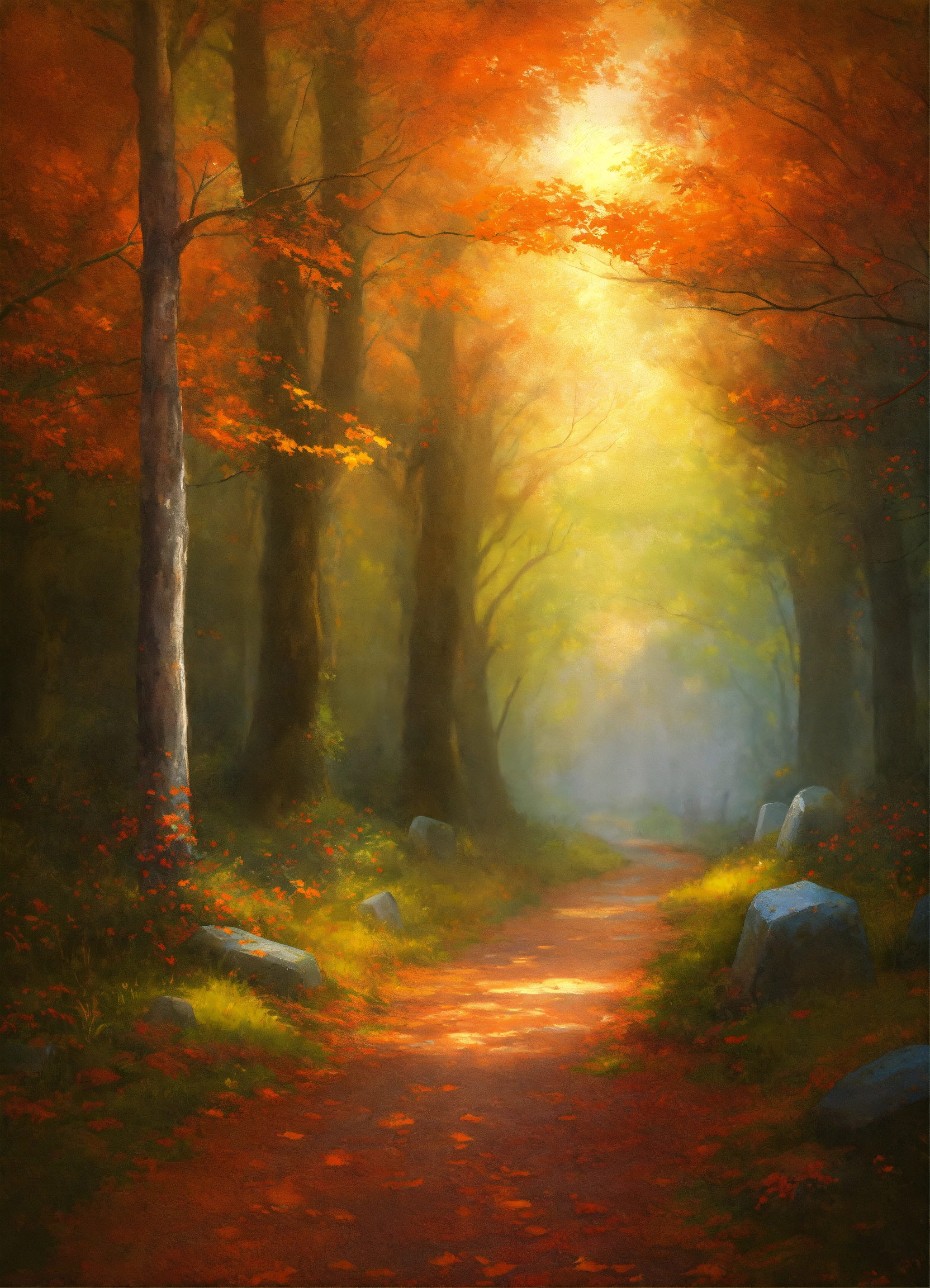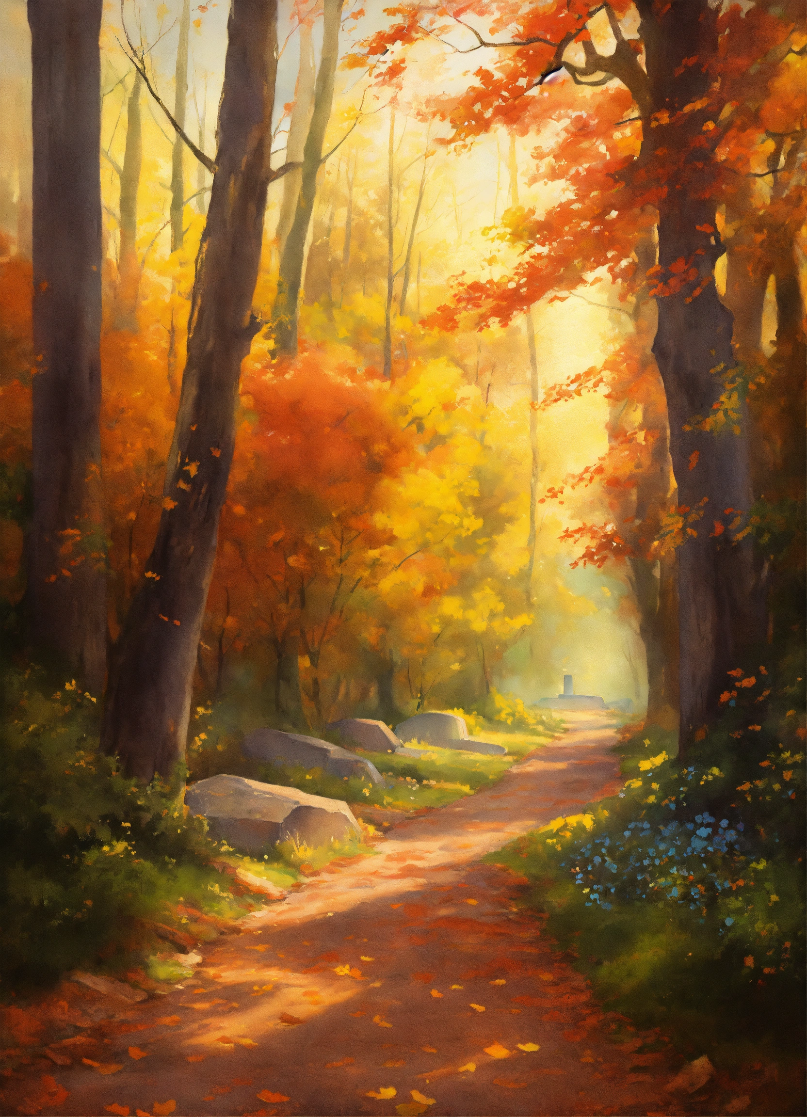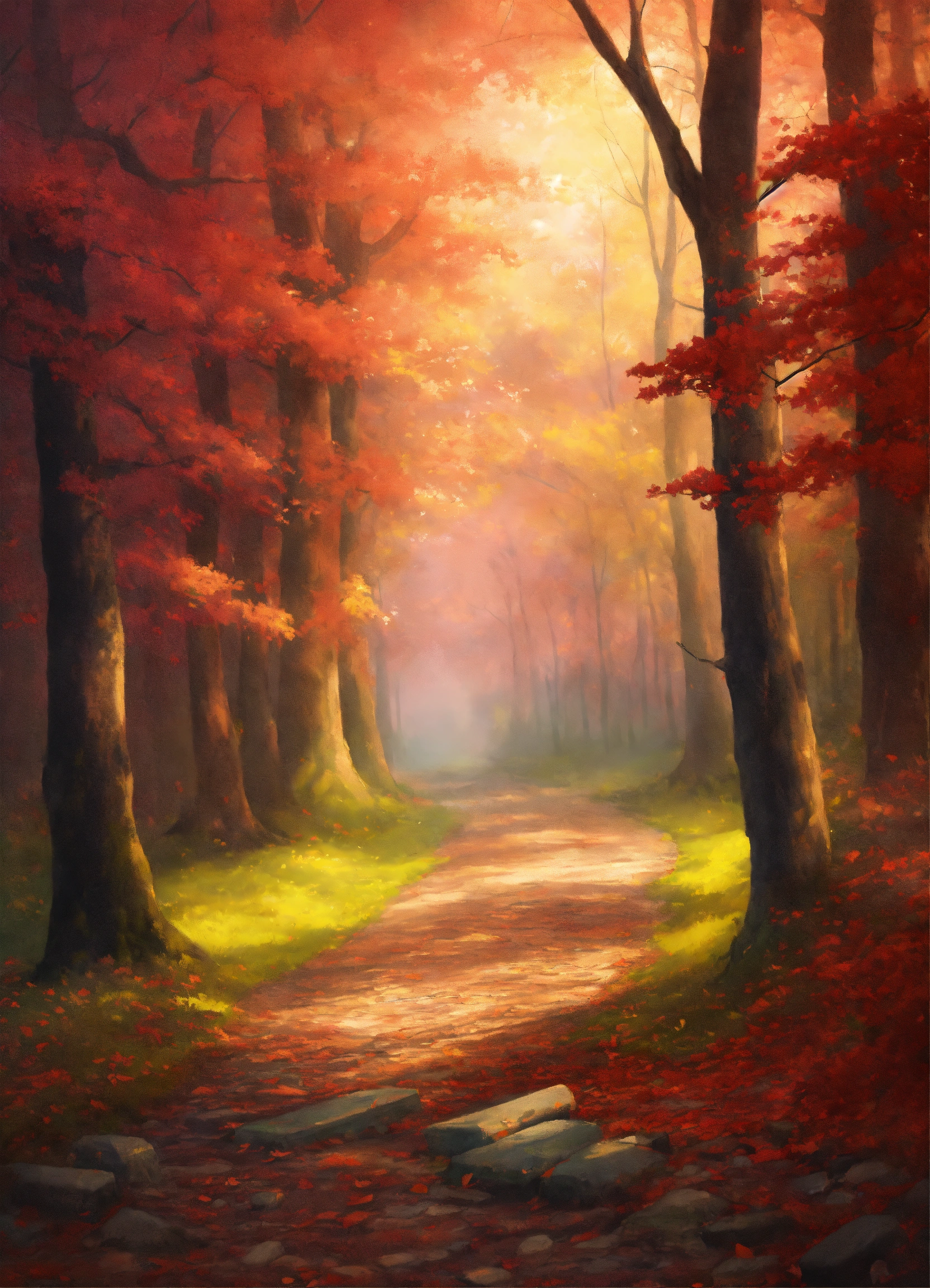 Create a painting of an enchanted forest scene with a dirt road surrounded by trees, rocks, and fallen leaves. the road is lined with old, weathered tombstones, giving the impression of an enchanted forest. the atmosphere should be eternity, with the rosy tint filtering through the trees. the tombstones should be strewed across the path, creating depth and a sense of distance. the overall composition should evoke a feeling of solitude.