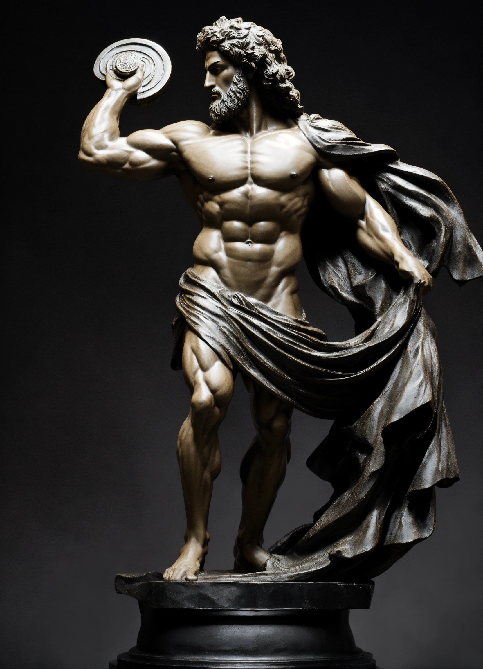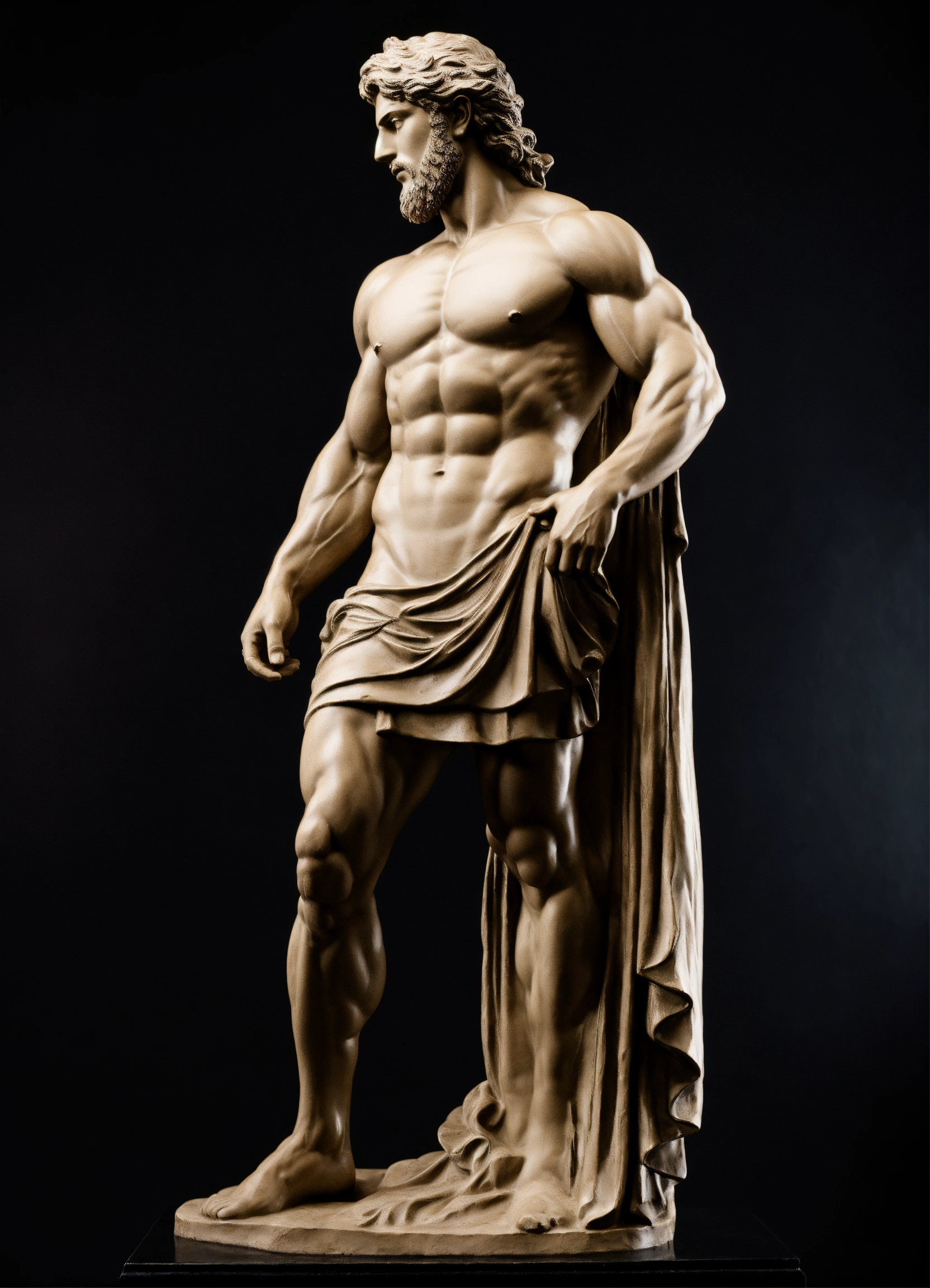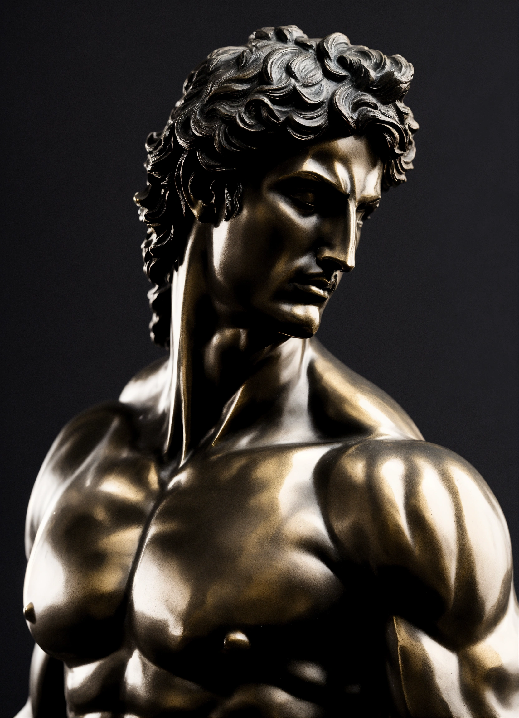 A statue from a muscular greek god statue with a wavey middel parting hair out of matt black with a black backround standing on a podest animeted style