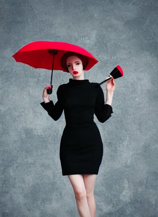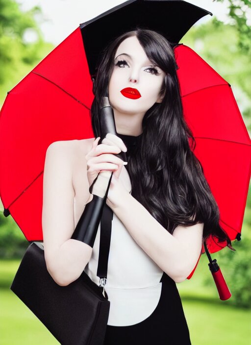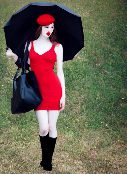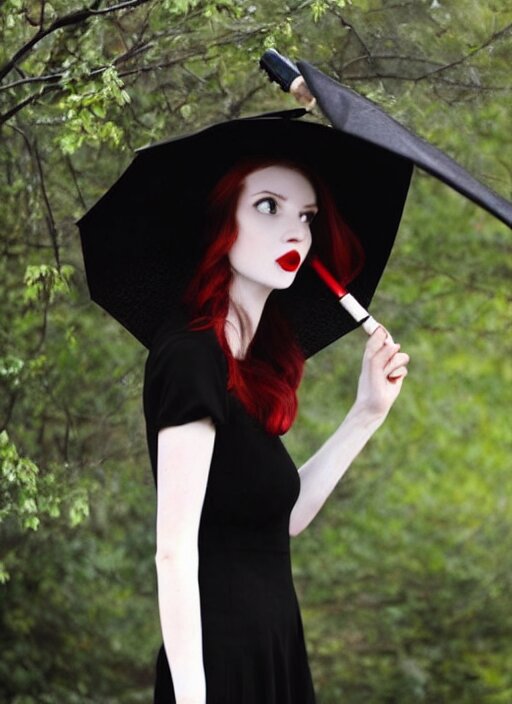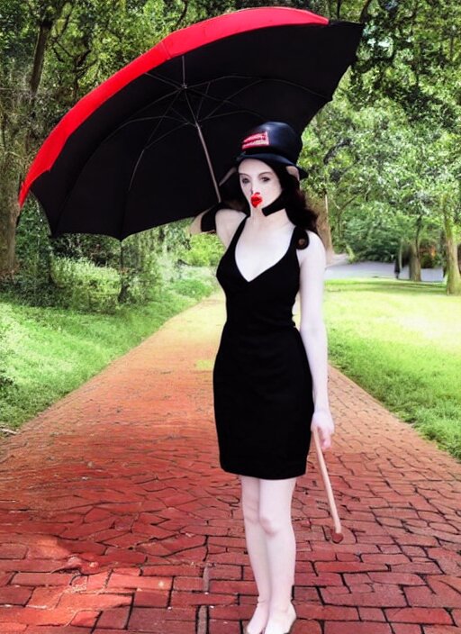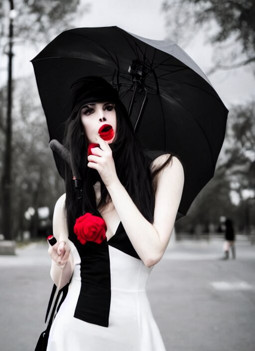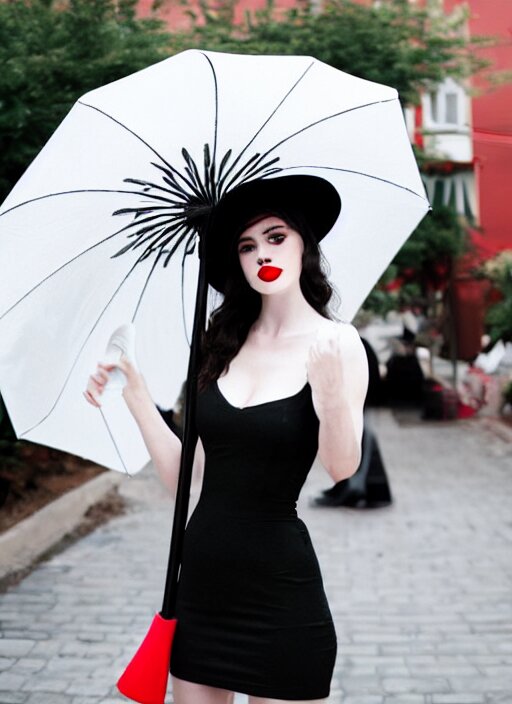 A beautiful white pale skin girl, full body, black dress, vibrent red lipstick, a black hat, black umbrella