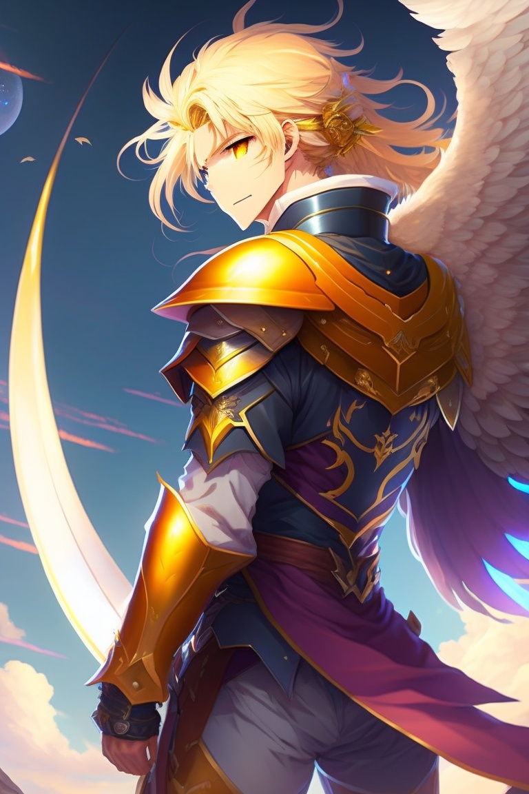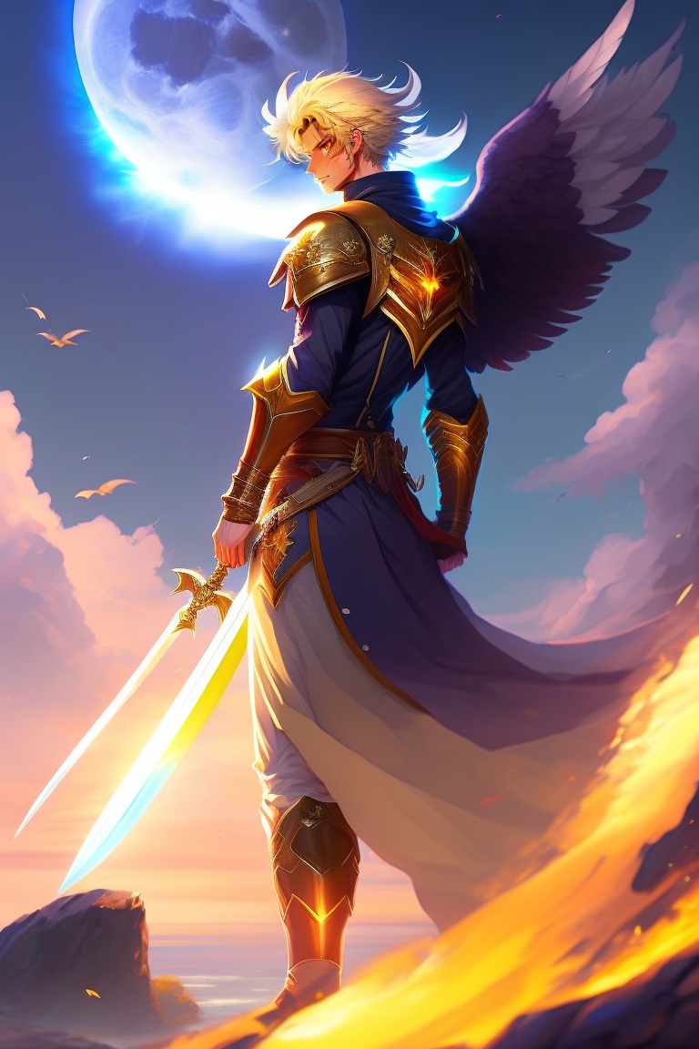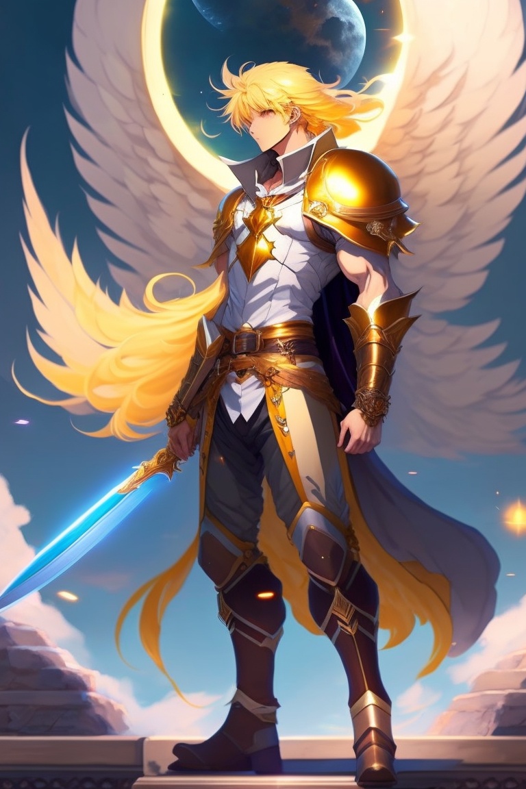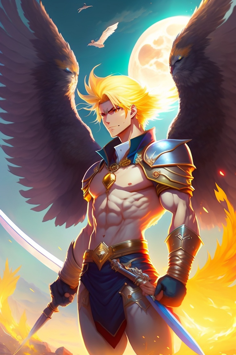 Man, sun, blonde hair, yellow eyes, art style anime, wings, sword, background moon, the combination god and human
