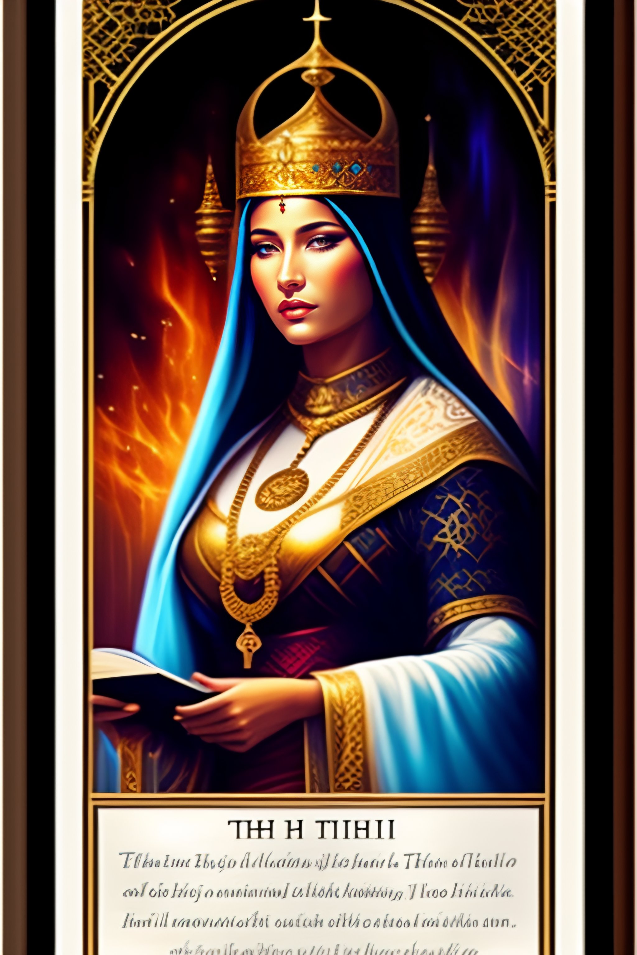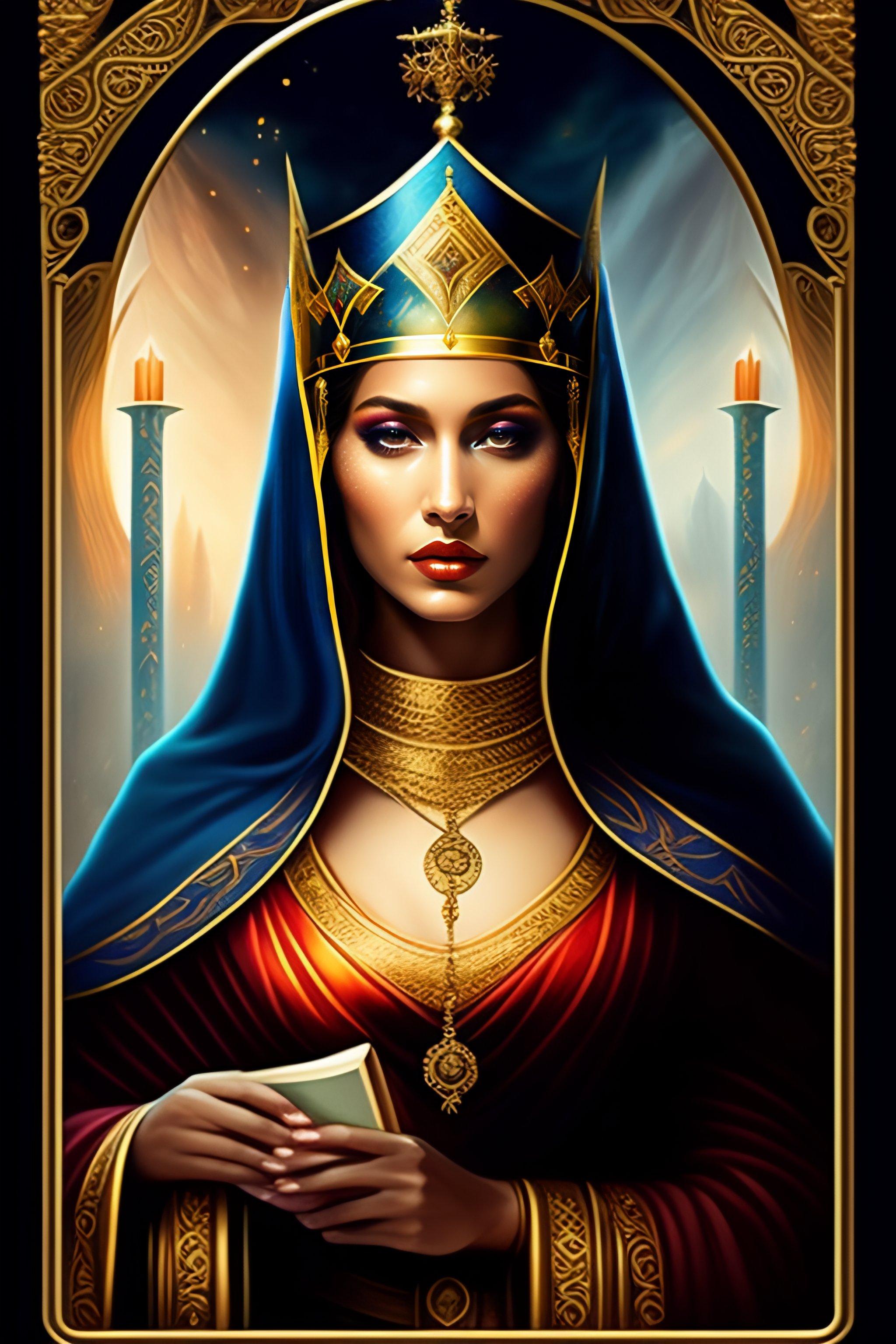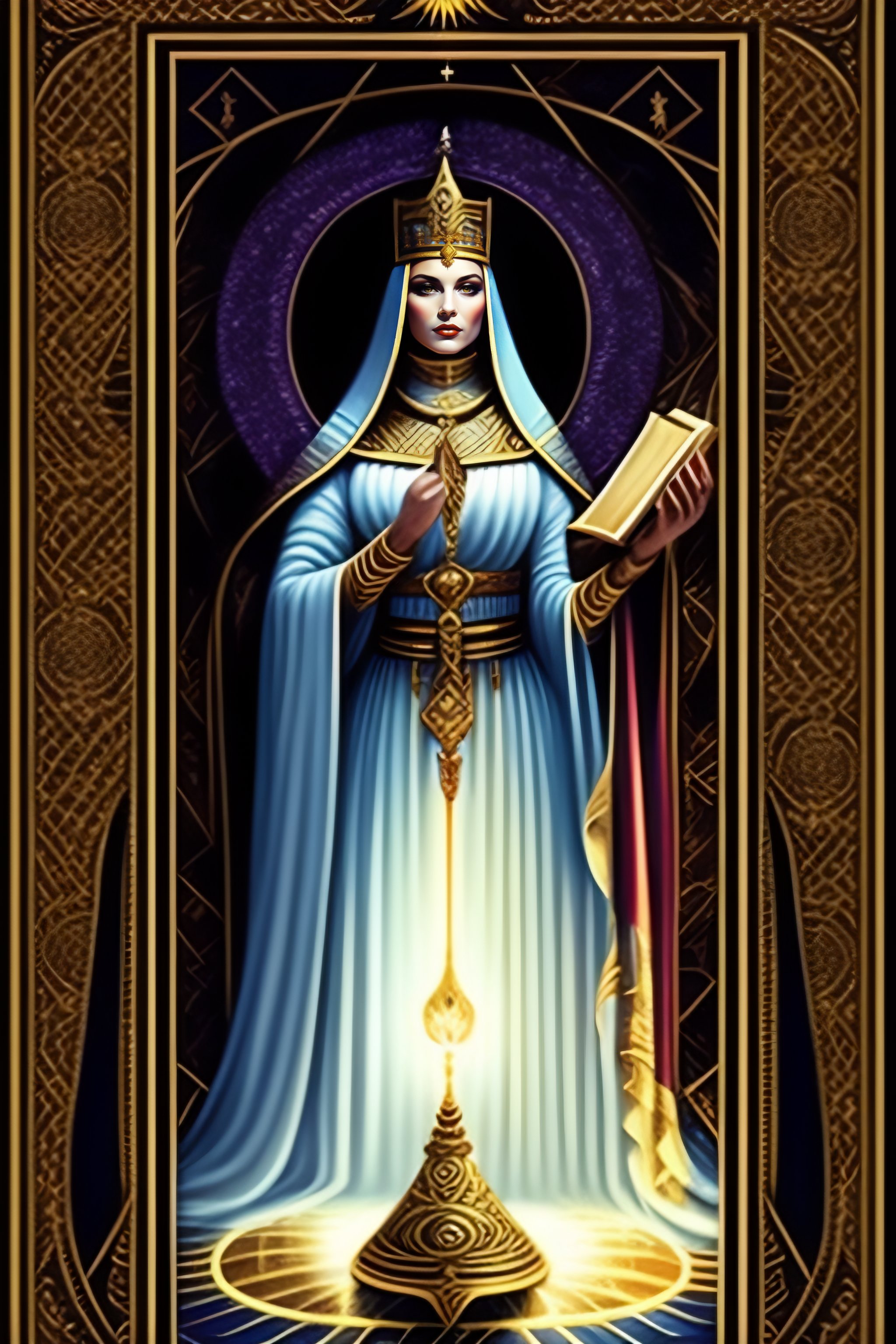 Tarot card the high priestess: the high priestess is a mysterious and enigmatic figure, often depicted seated between two pillars or holding a book of secrets.