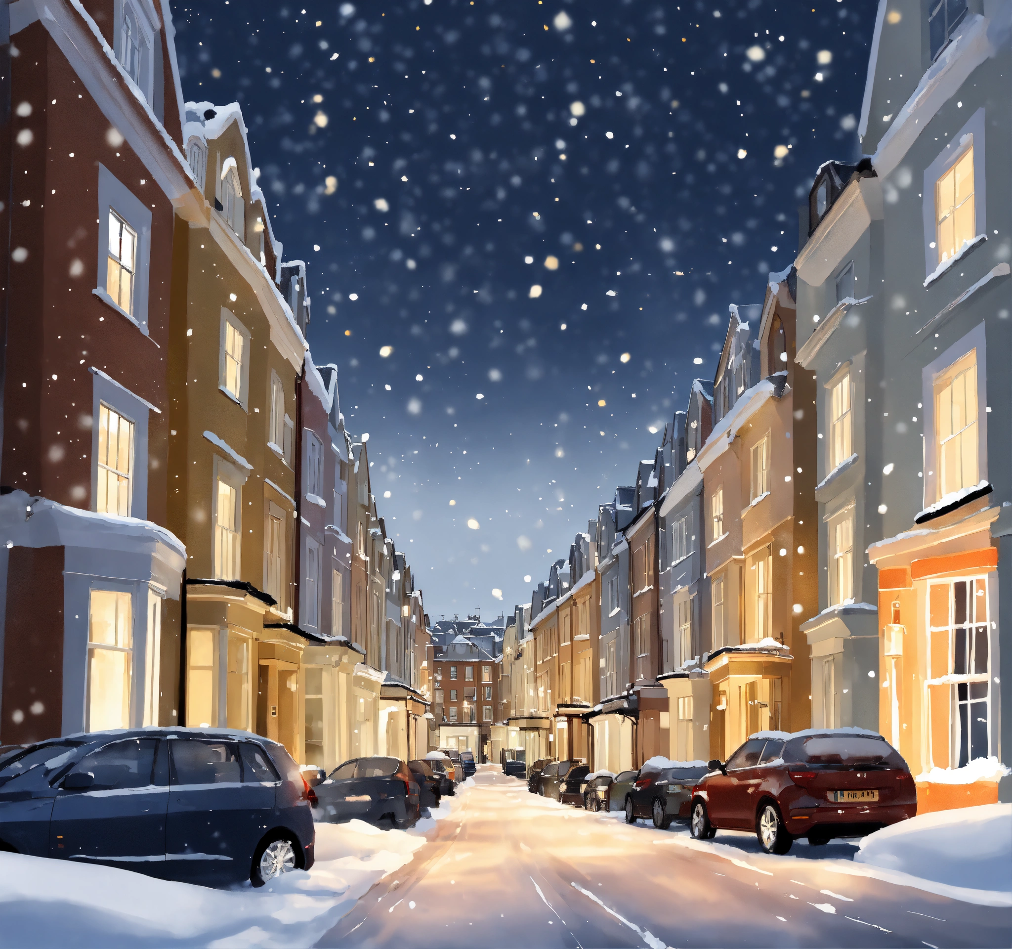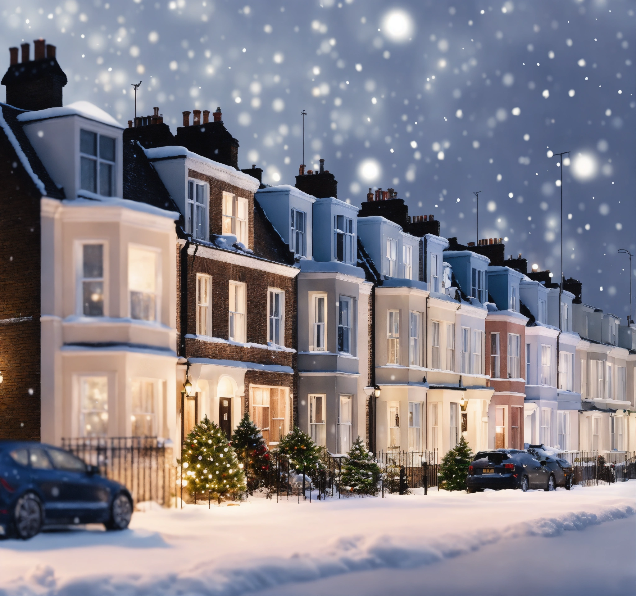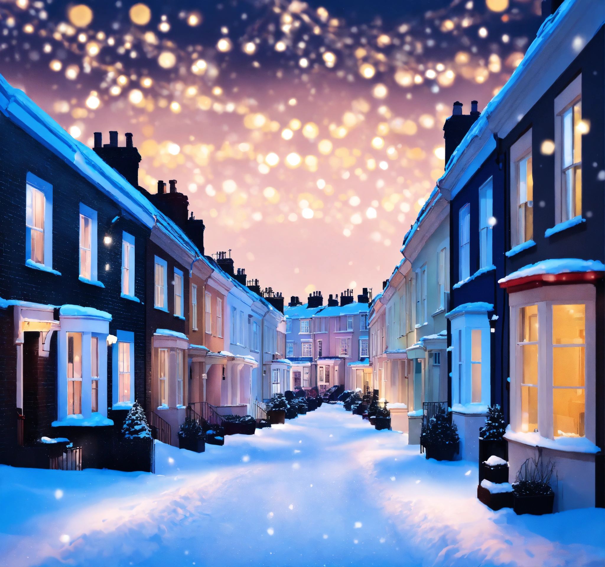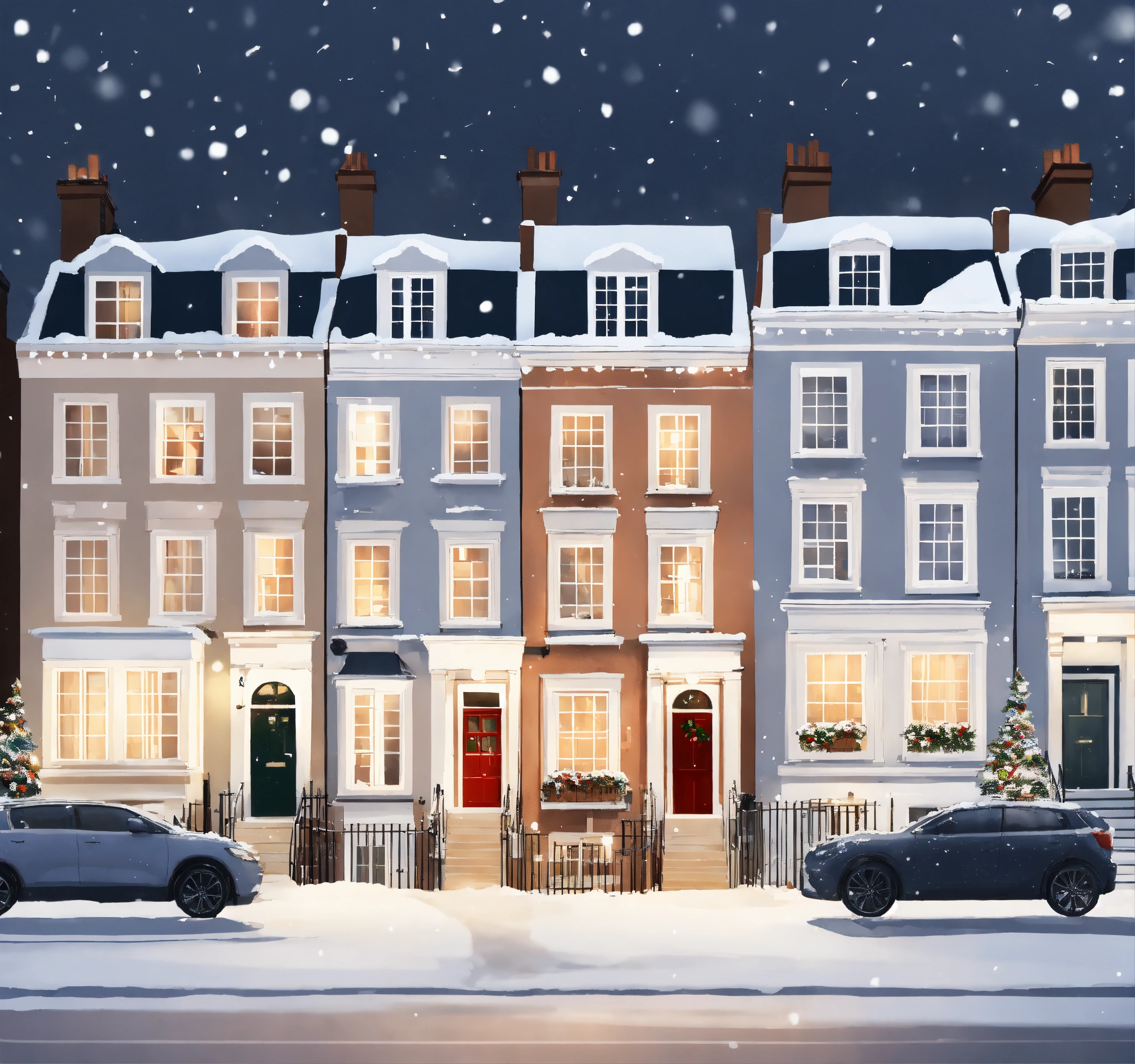Realistic illustration of five houses on a notting hill type street in light colors on a snowy christmas night. all the houses look complete. no cars. there is bokeh. all the houses are seen from a bottom-up view, and complete.