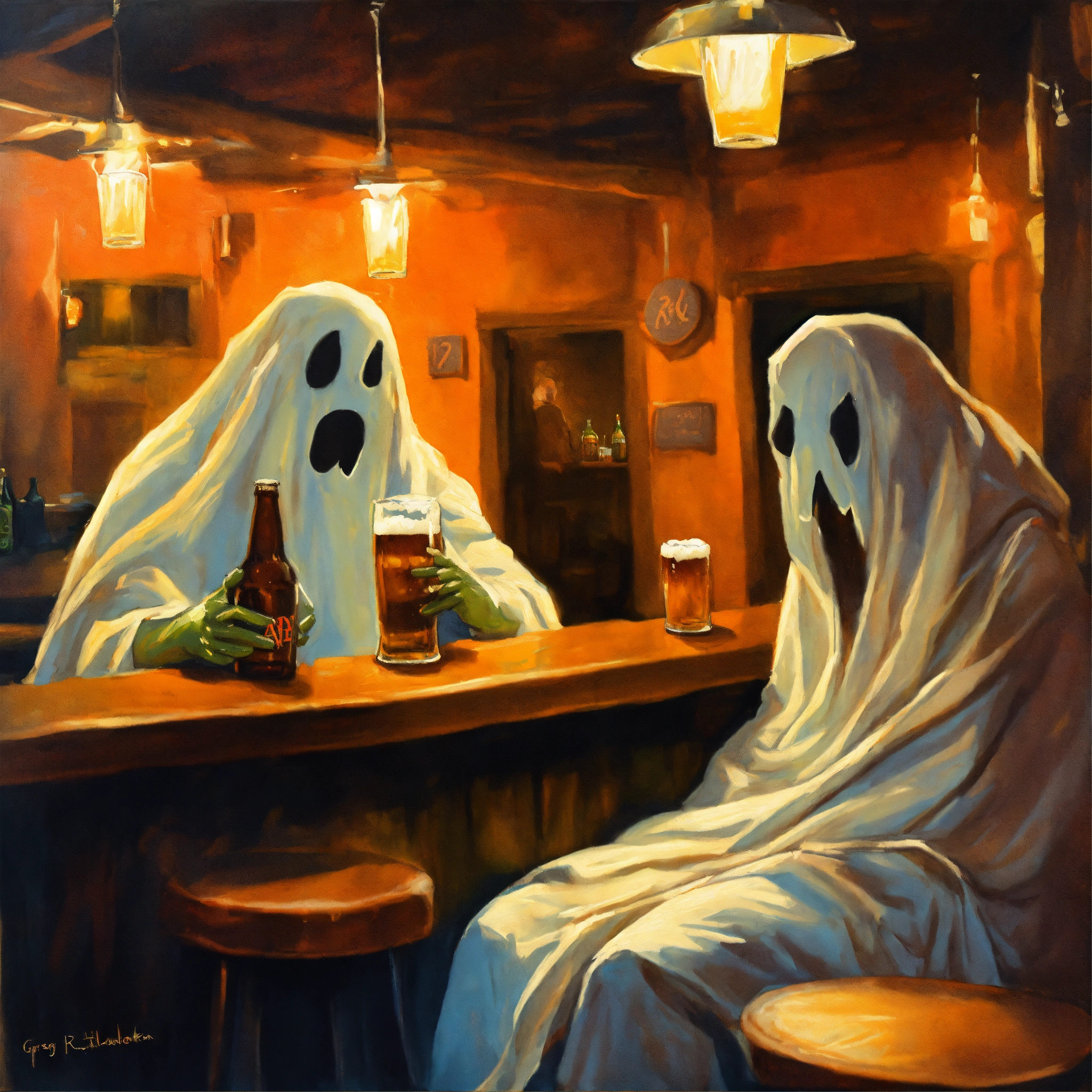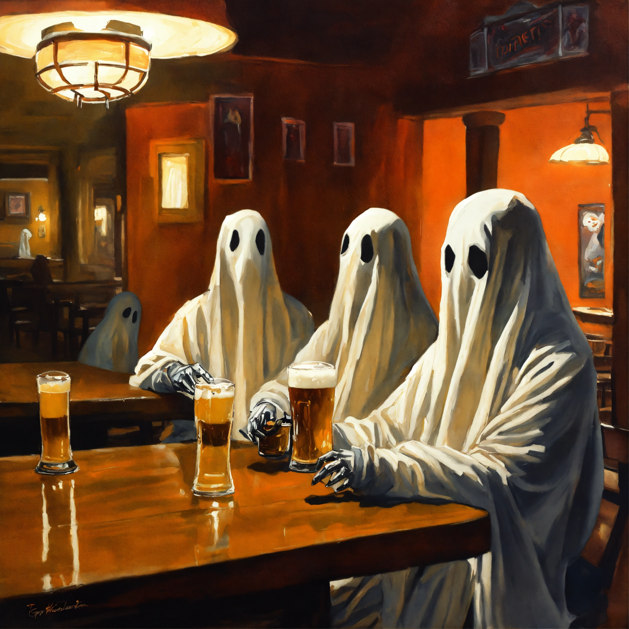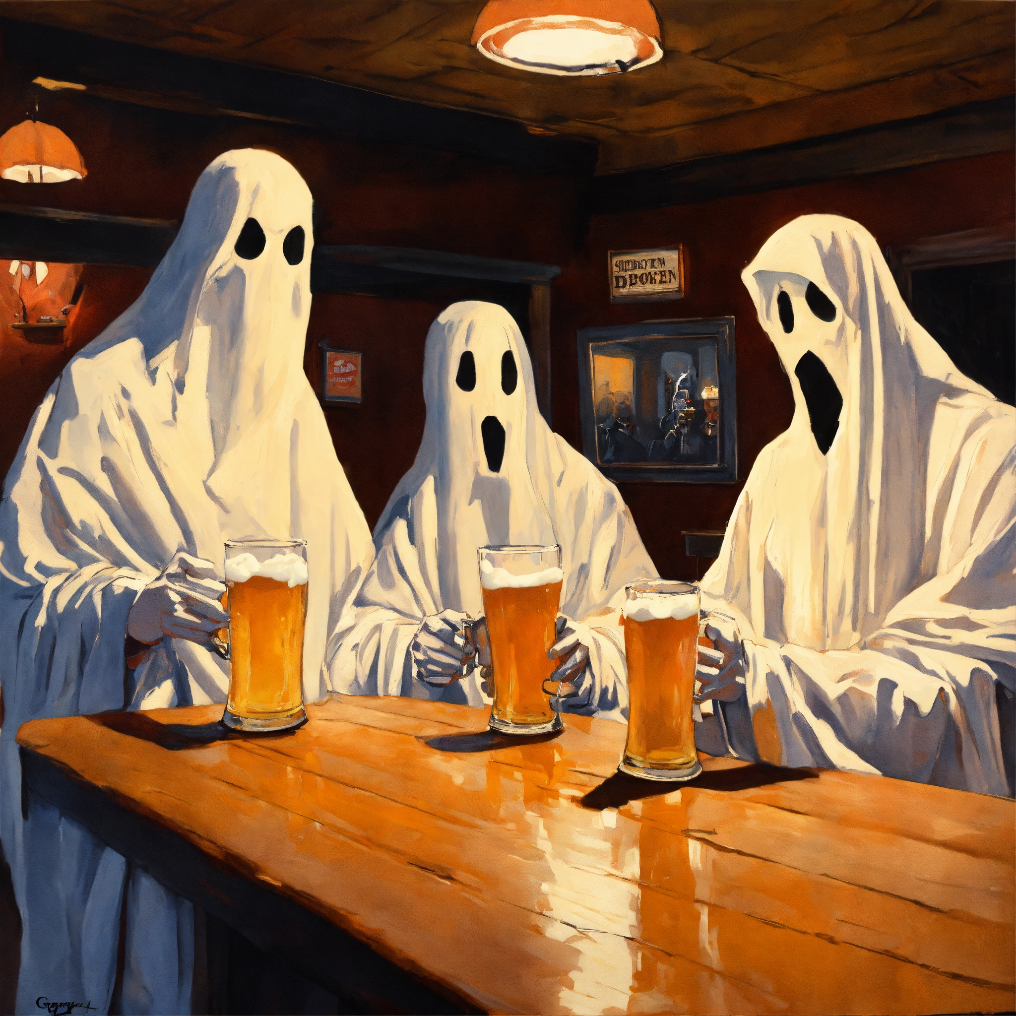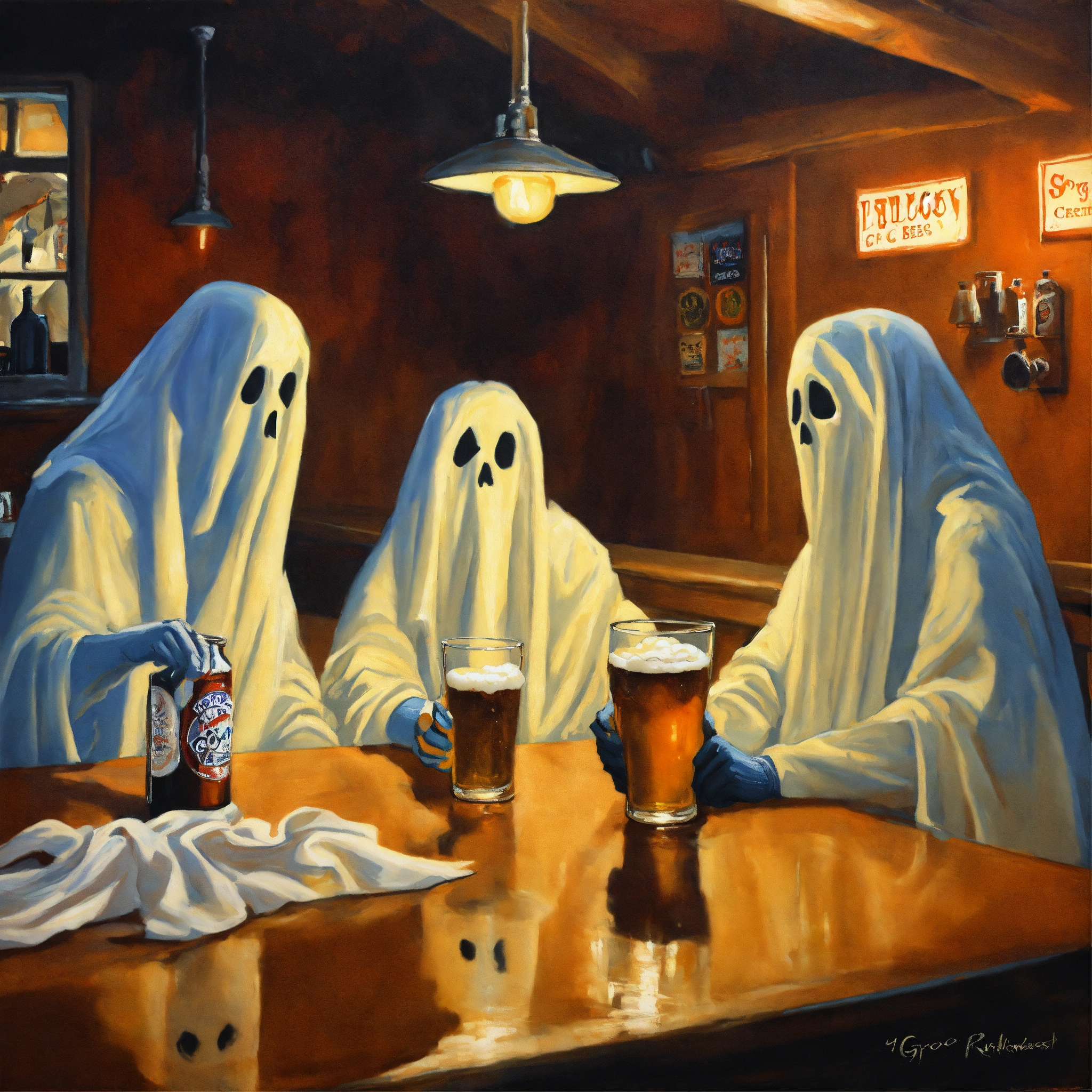 Painting of bedsheet ghosts drinking beer at a bar. greg rutkowski, spooky, halloween, autumn, creepy, scary