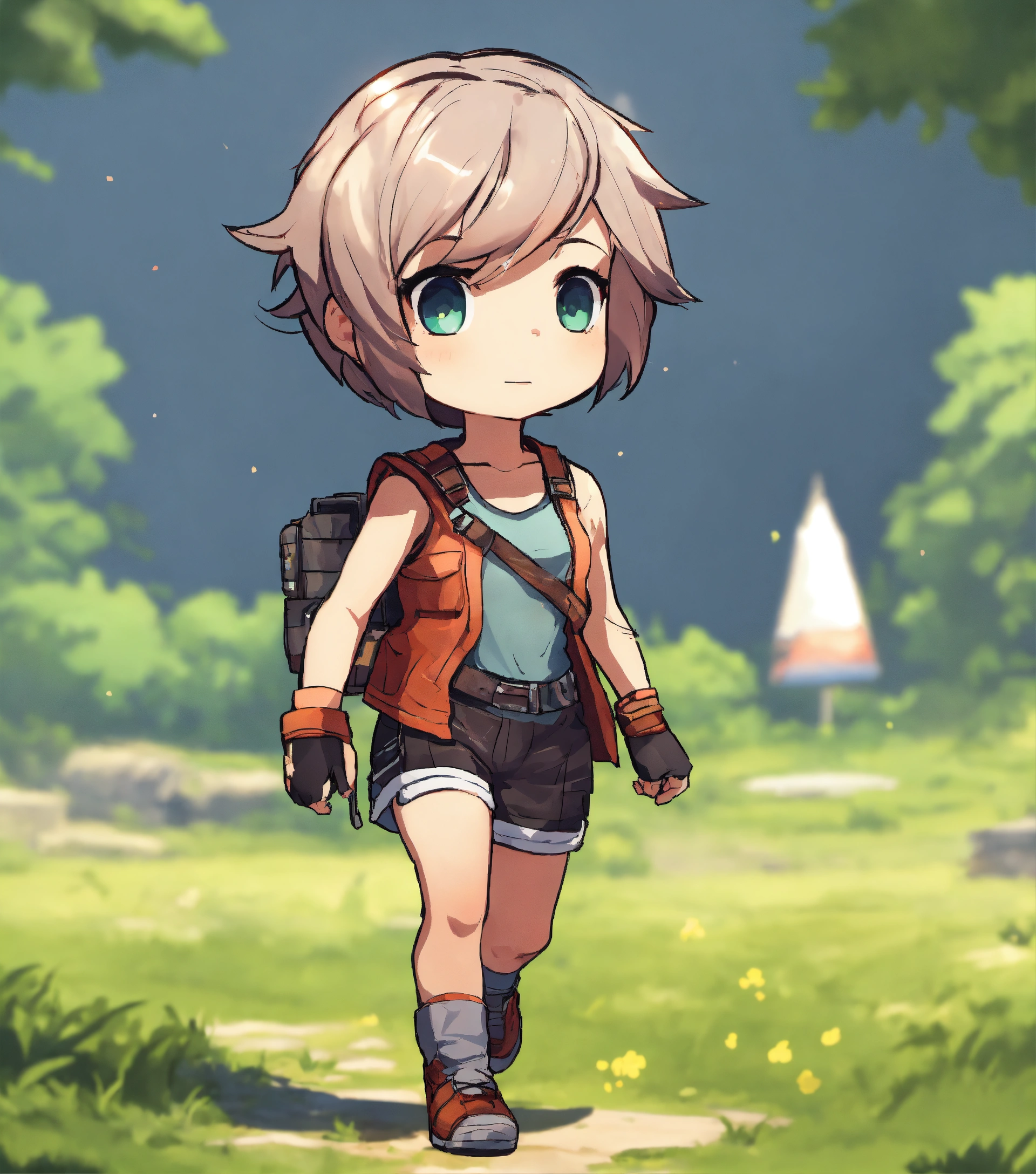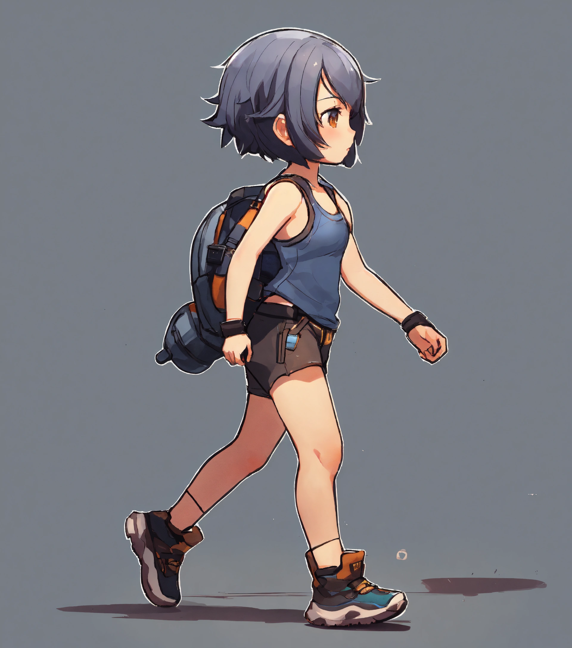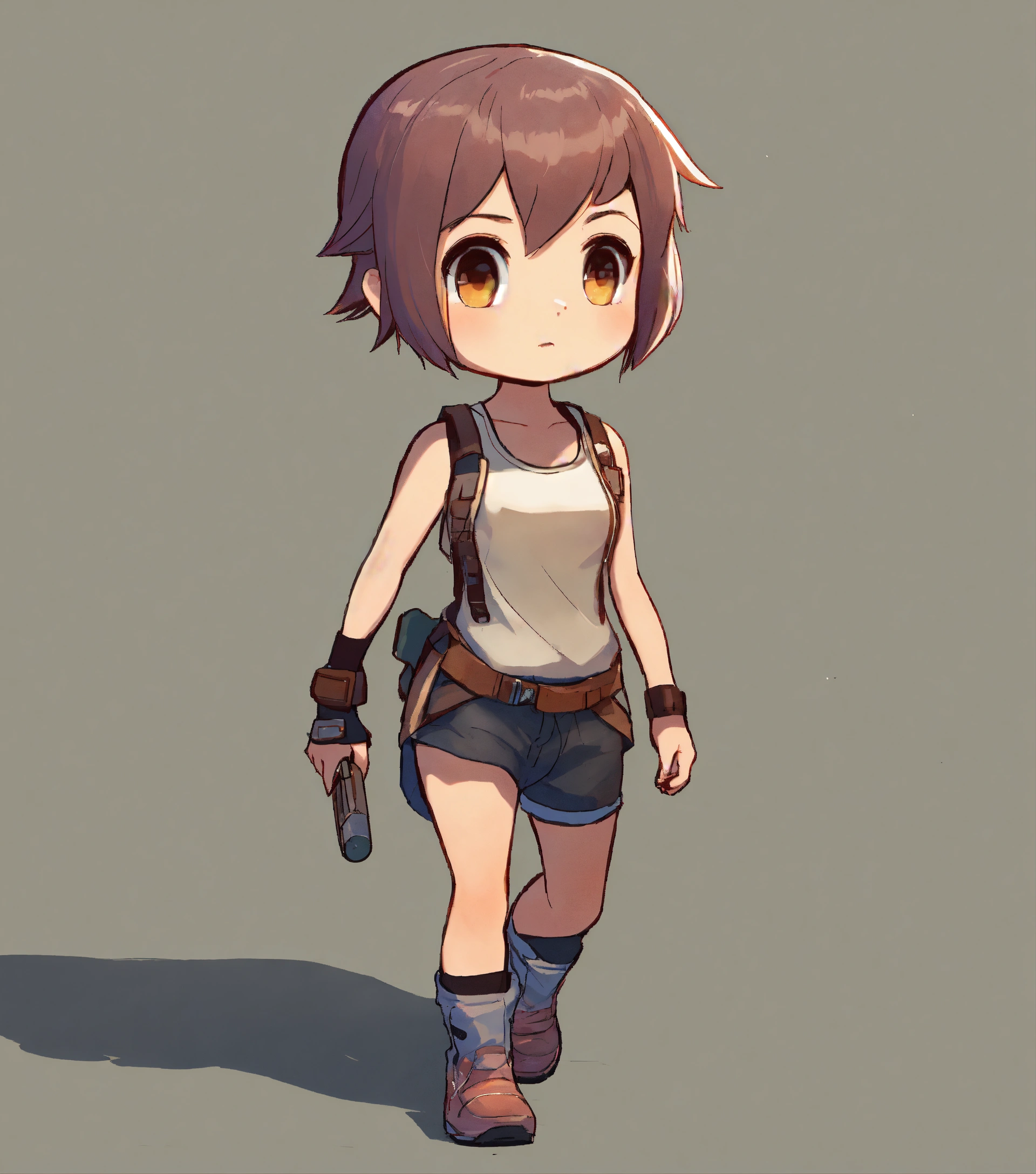 Short haired girl wearing tank top and shorts, walking, game art, full body view, side view, chibi proportions, blank background, artstyle from the game ragnarok