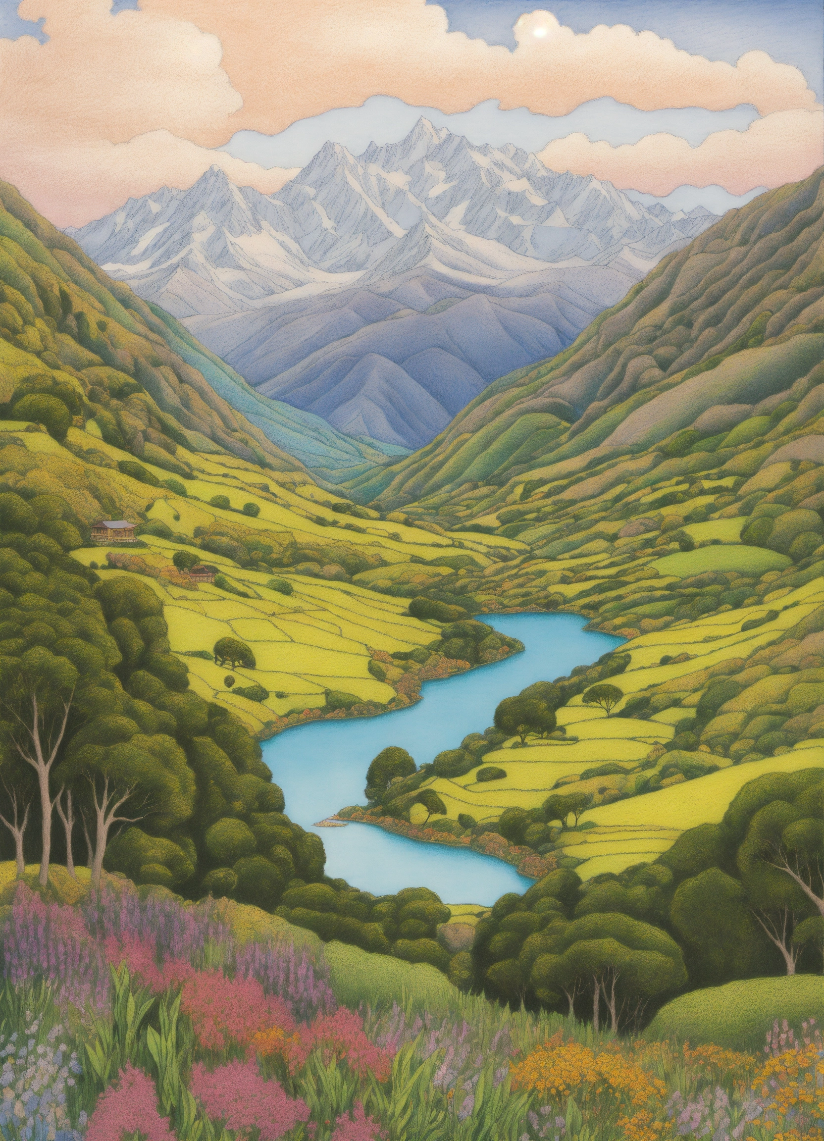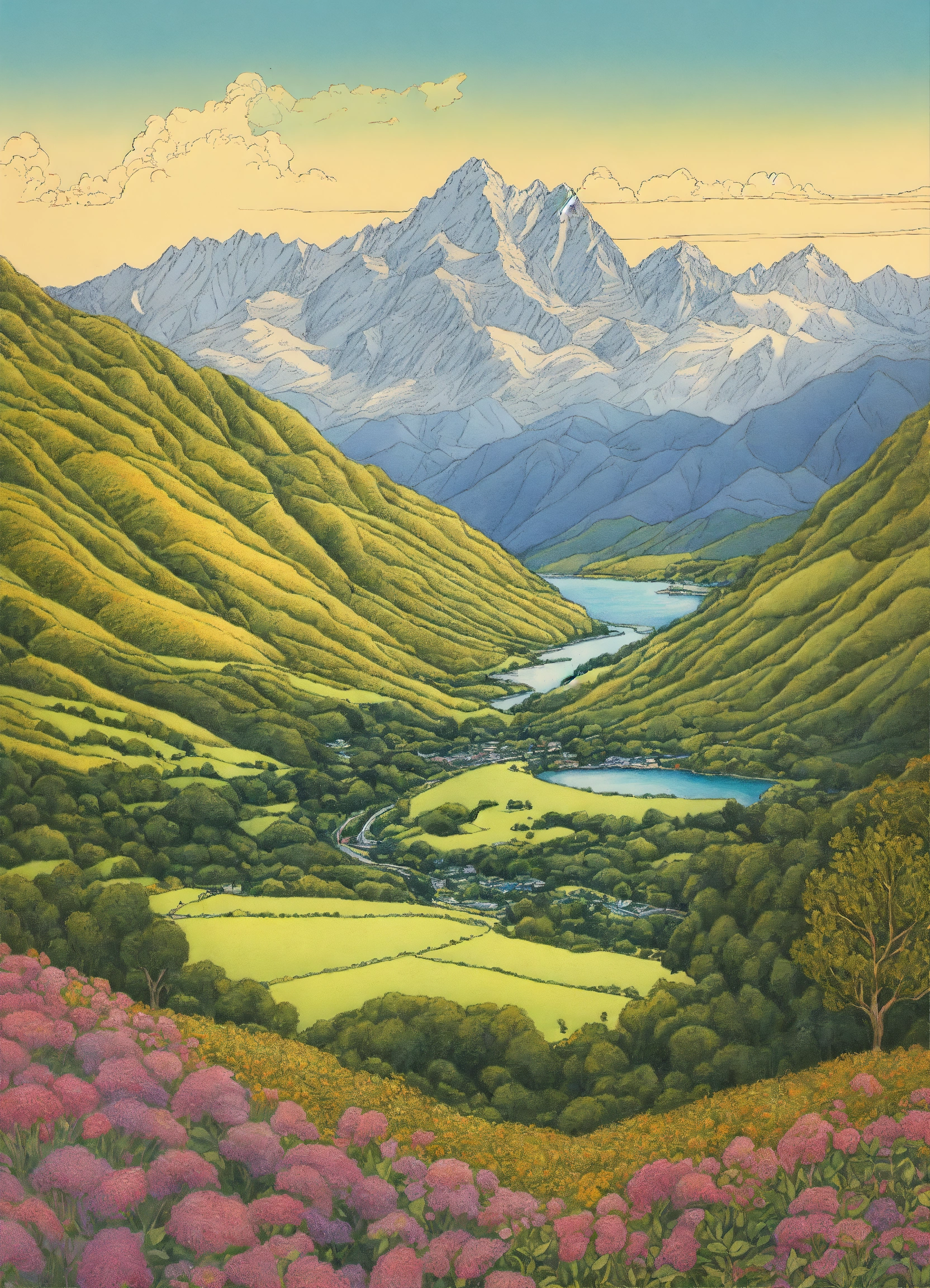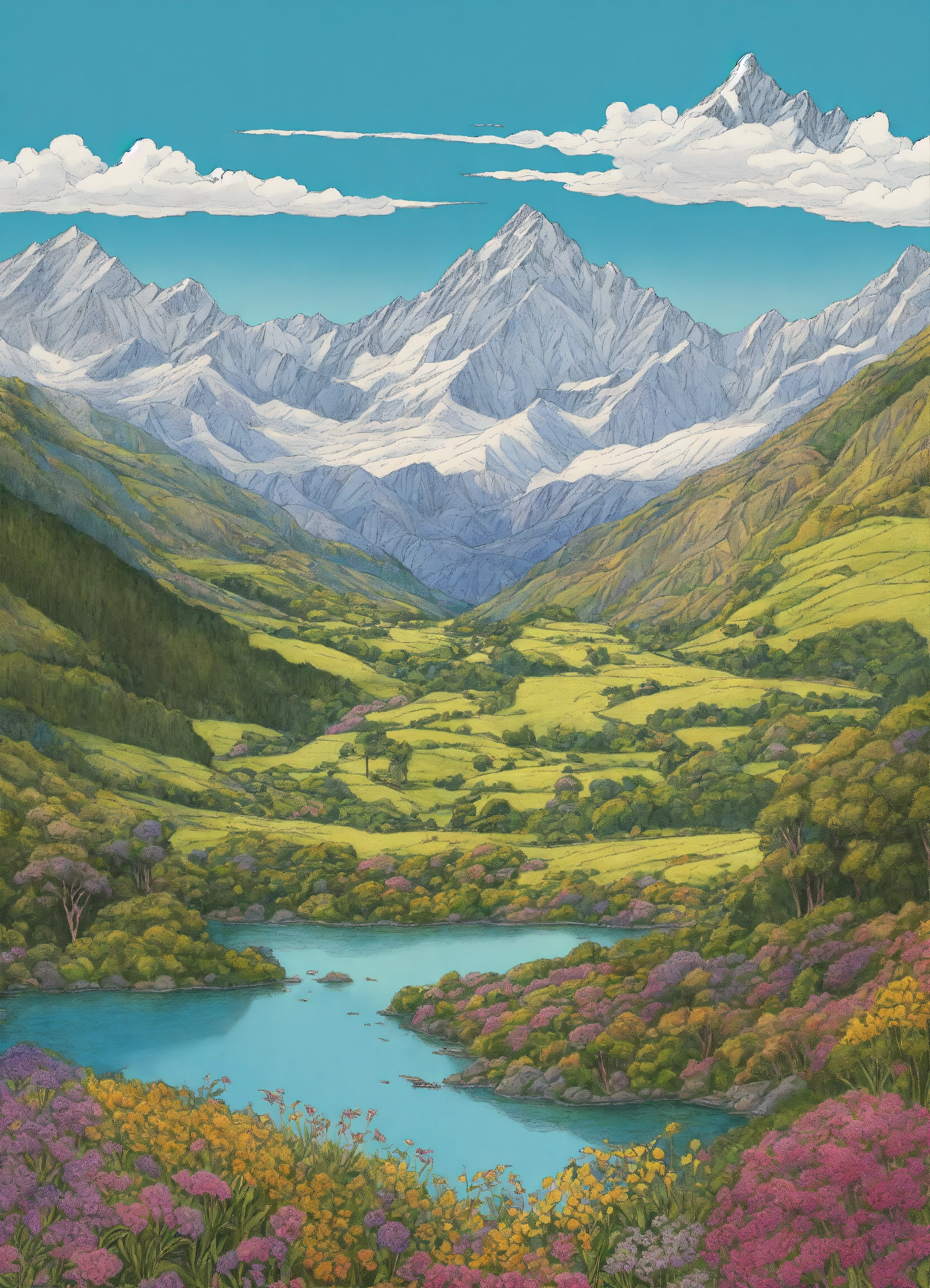 Drawing the southern alps (new zealand) in summer. line drawing, clean clear lines, coloring book style, bright colors, intricate details, elegant, discreete, serene, magical, peaceful, fine detail, pastel pencils, winsor mccay style.