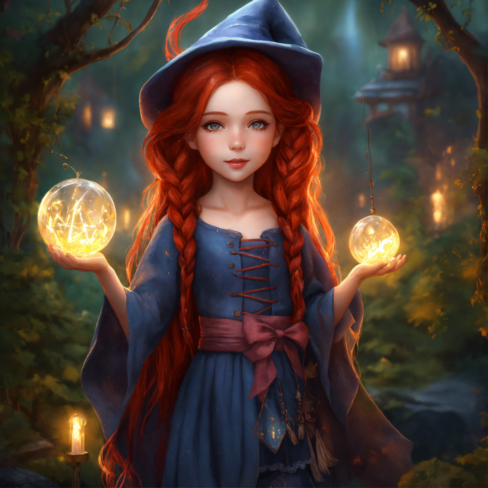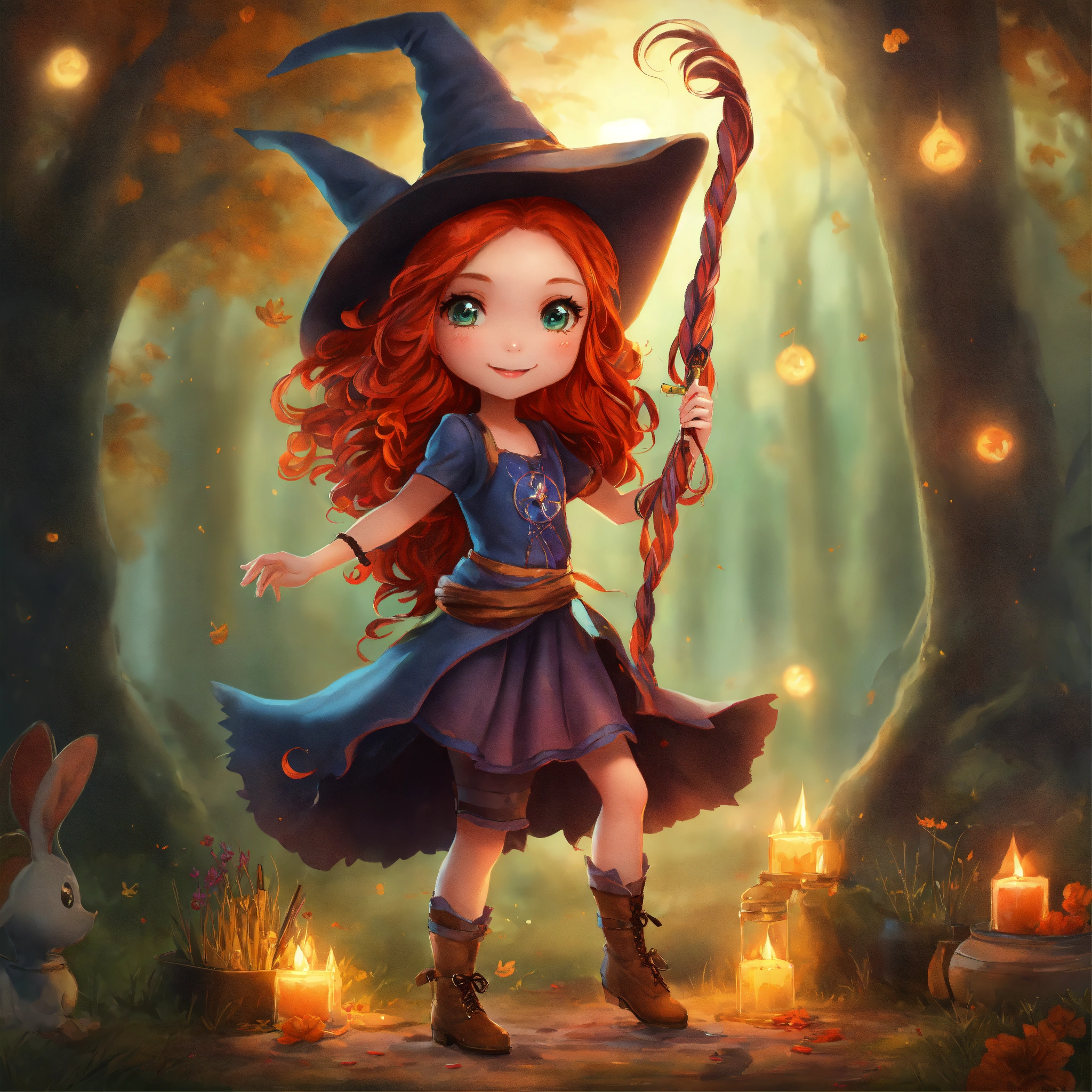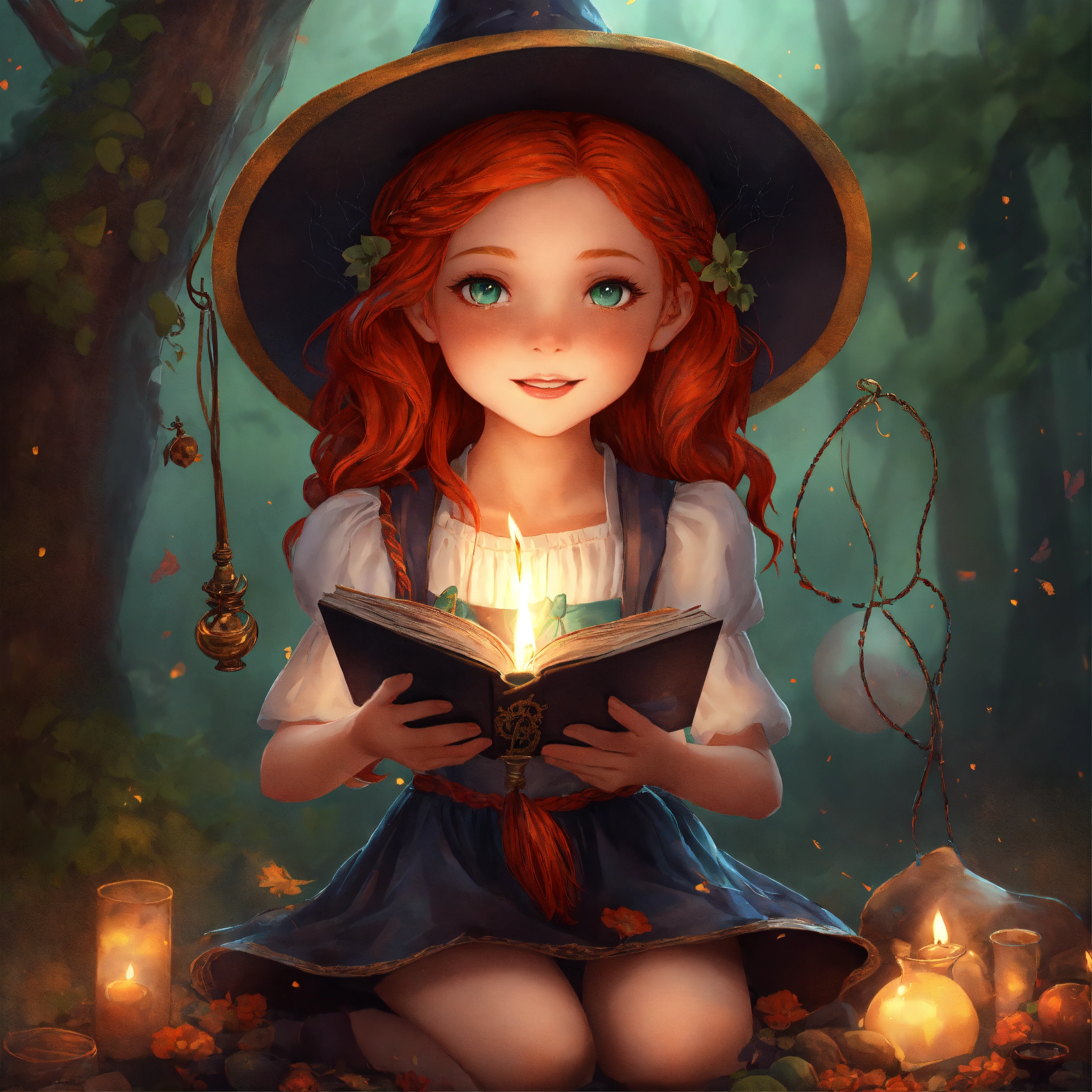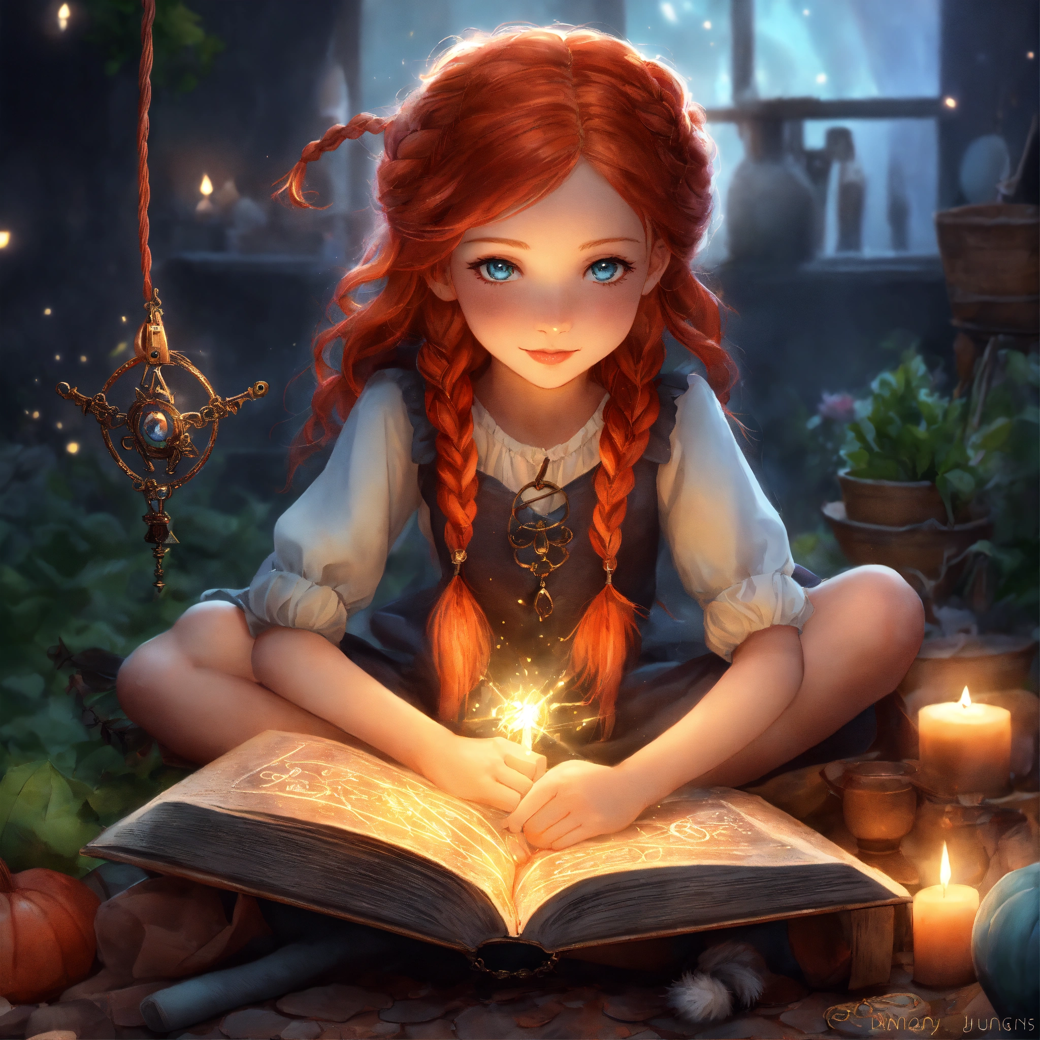 Young cute happy witch girl making spells, 10 years old character, redhair girl, diferent pose and wearing two longs braids in her hair full body shot, illustration, fantasy, magic, hq, white background, very detailed, by mandy jungens, nadja baxter, anne stokes, nicoletta ceccoli, full colors