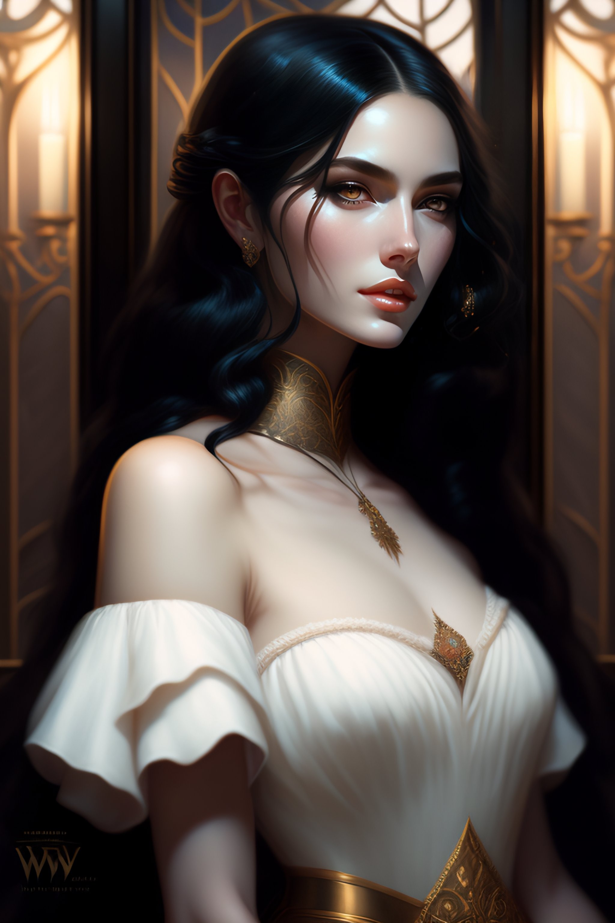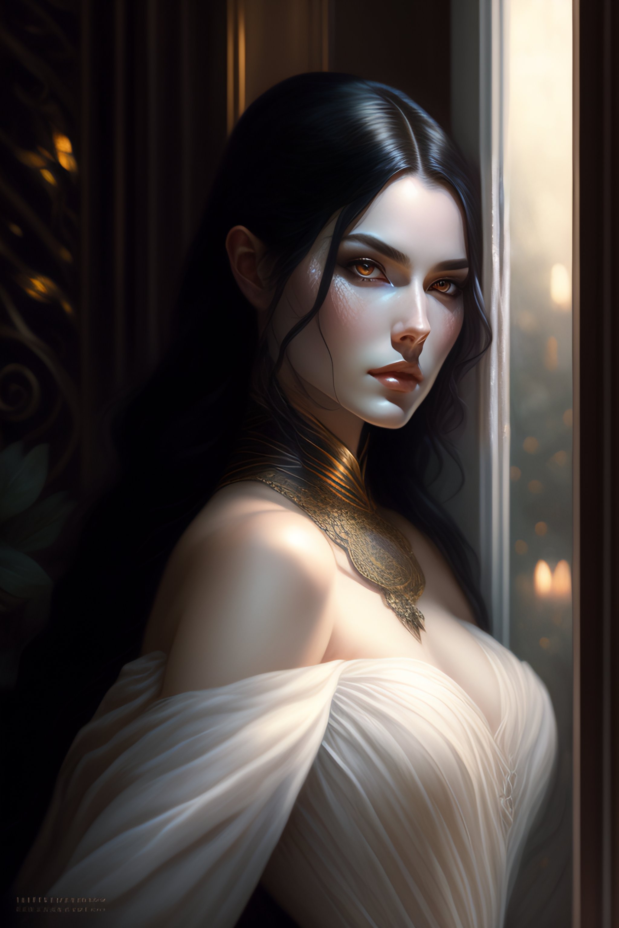 Black hair vampire woman, white skin, pale skin looking through the window, dress, dark light night, intricate, elegant, sharp focus, illustration, highly detailed, digital painting, concept art, matte, art by wlop and artgerm and greg rutkowski and alphonse mucha, masterpiece