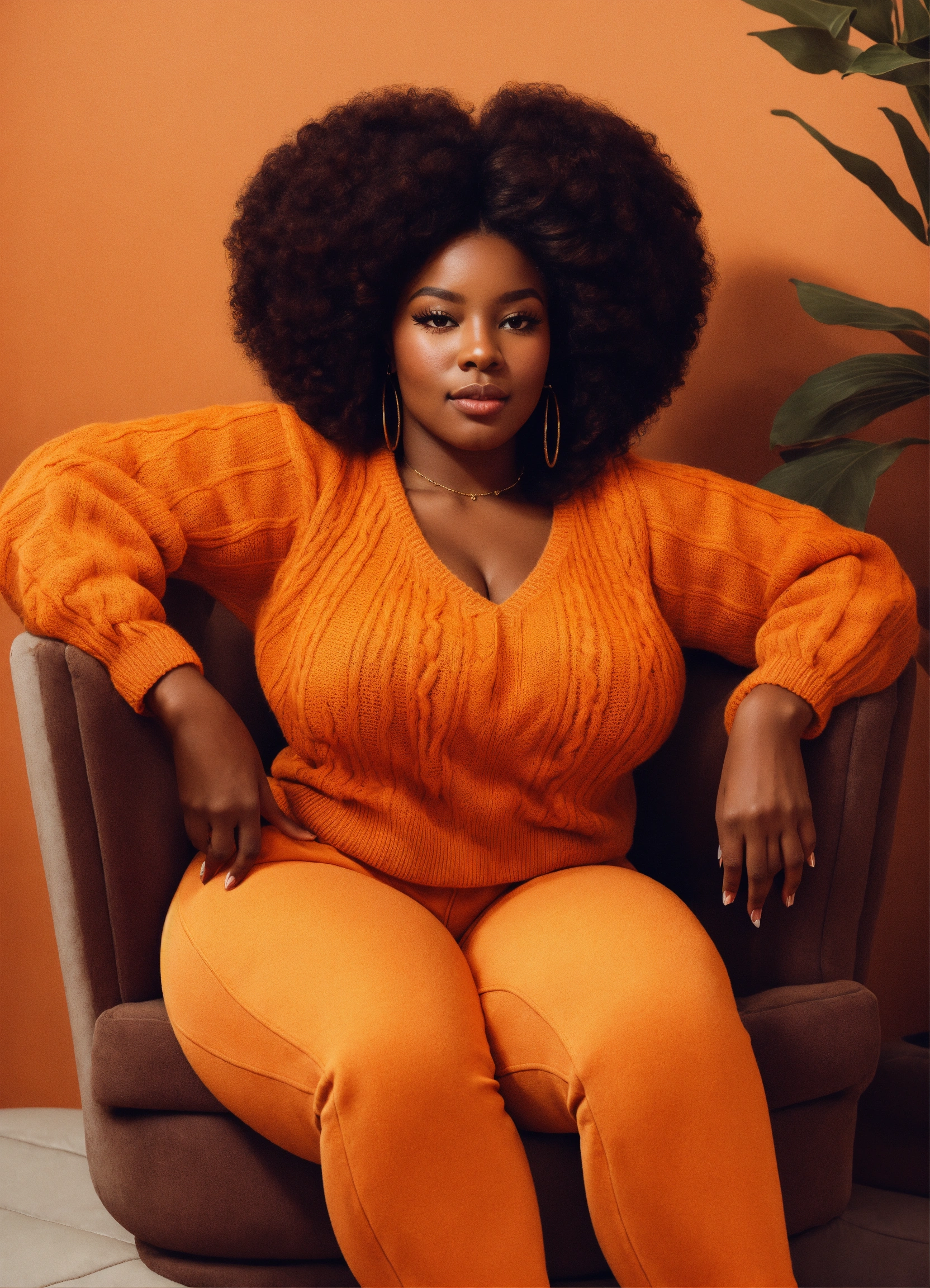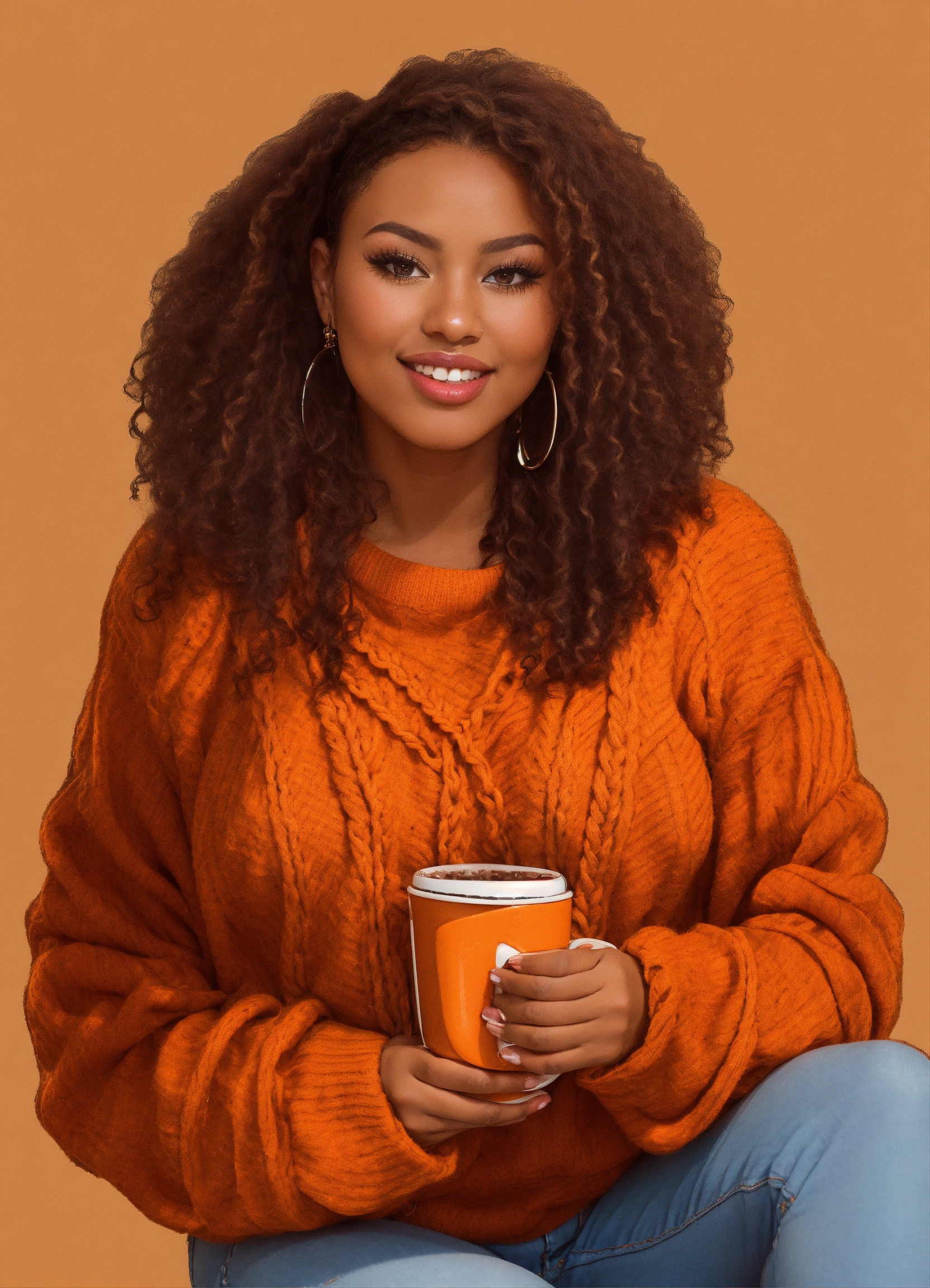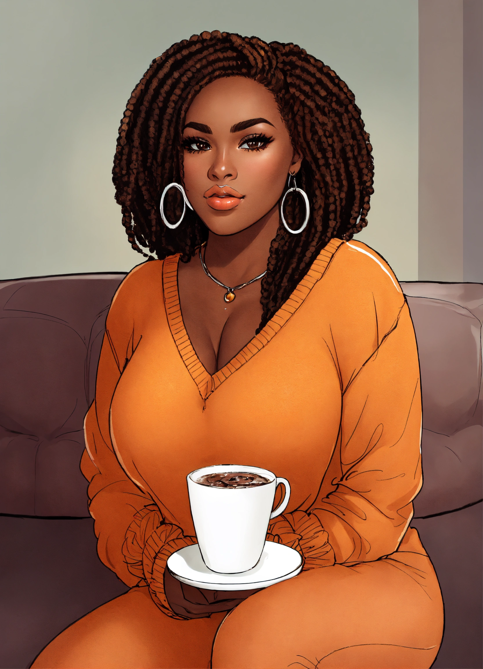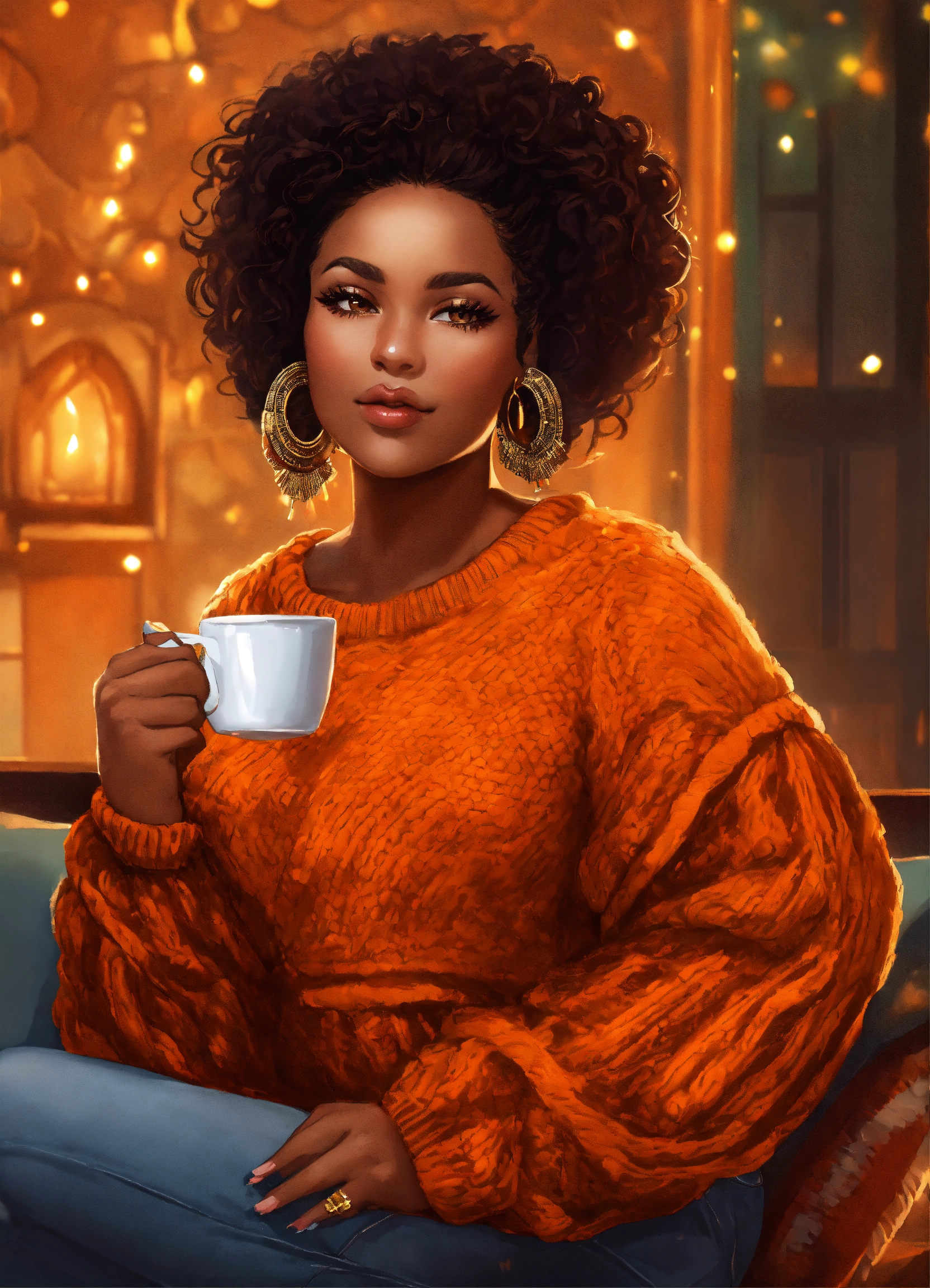 Illustration of a gorgeous full-figured black woman with almond-shaped eyes, enhanced by long lashes, and her full lips in a soft smile. she is garbed in an eye-catching orange and brown sweater with voluminous puffy sleeves, along with ripped jeans and chic boots. her luxurious dark brown hair is braided with threads of blonde, adding a stunning contrast. seated comfortably, she is enjoying a warm cup of hot chocolate, which adds to the cozy and stylish atmosphere of the scene.