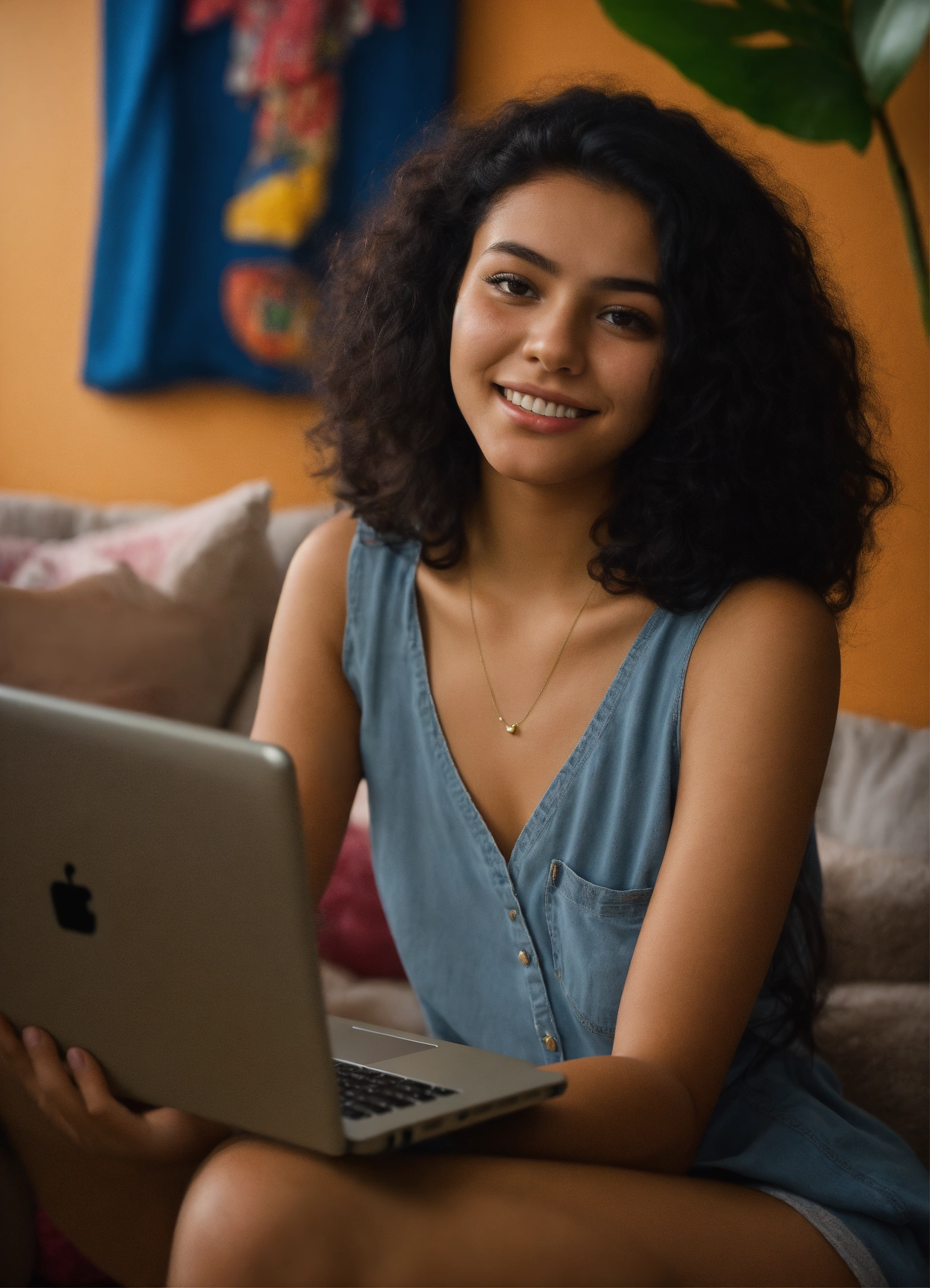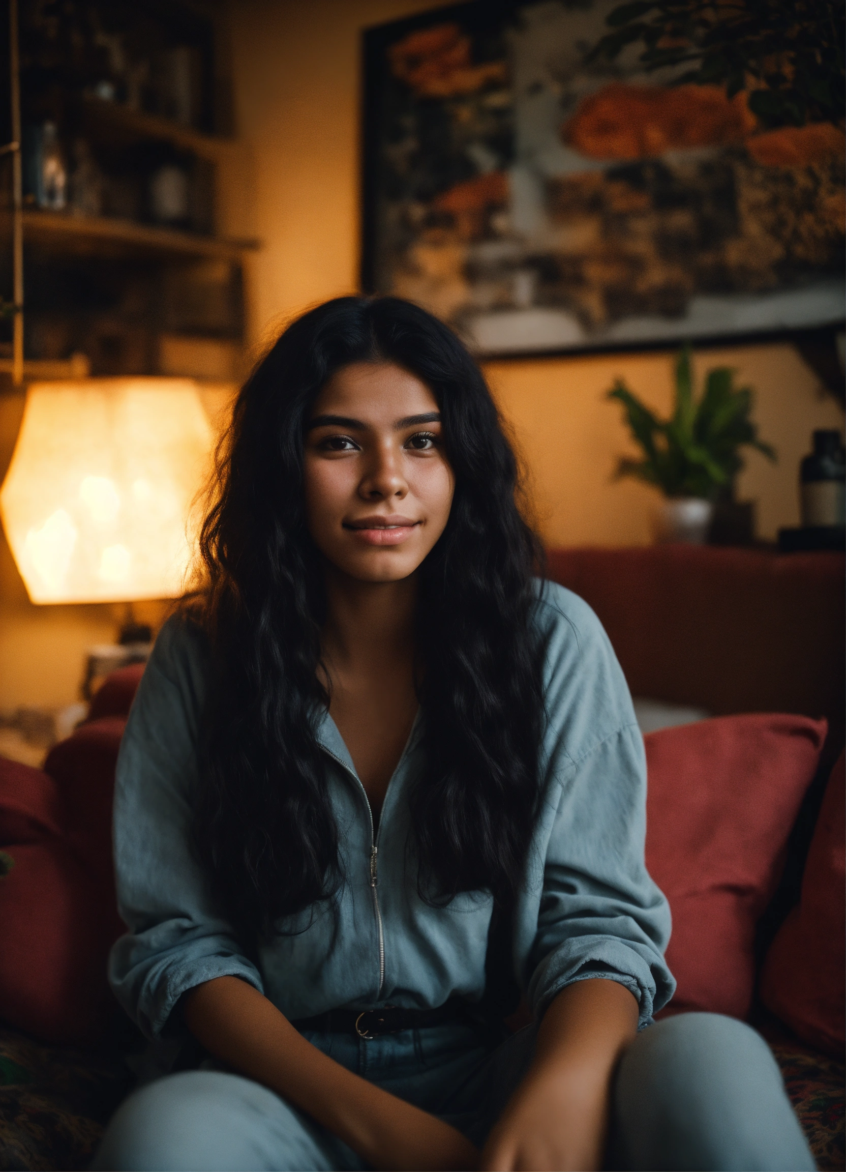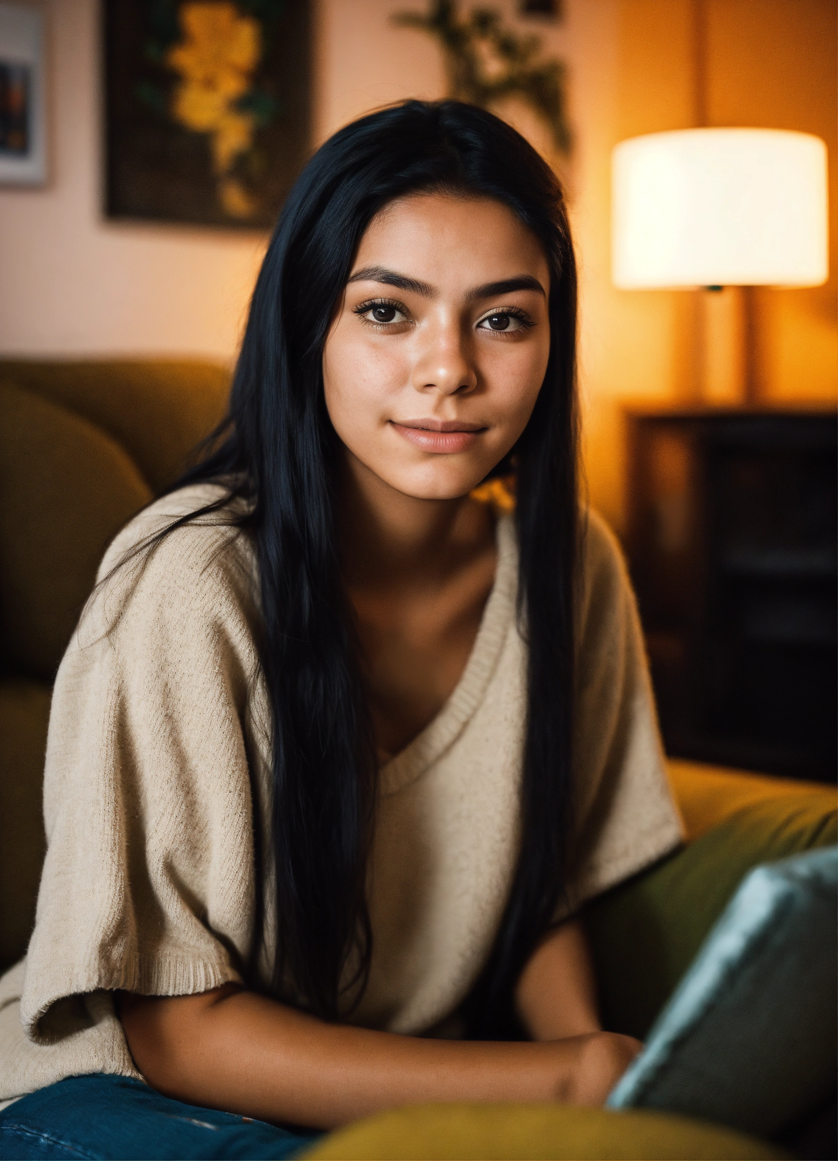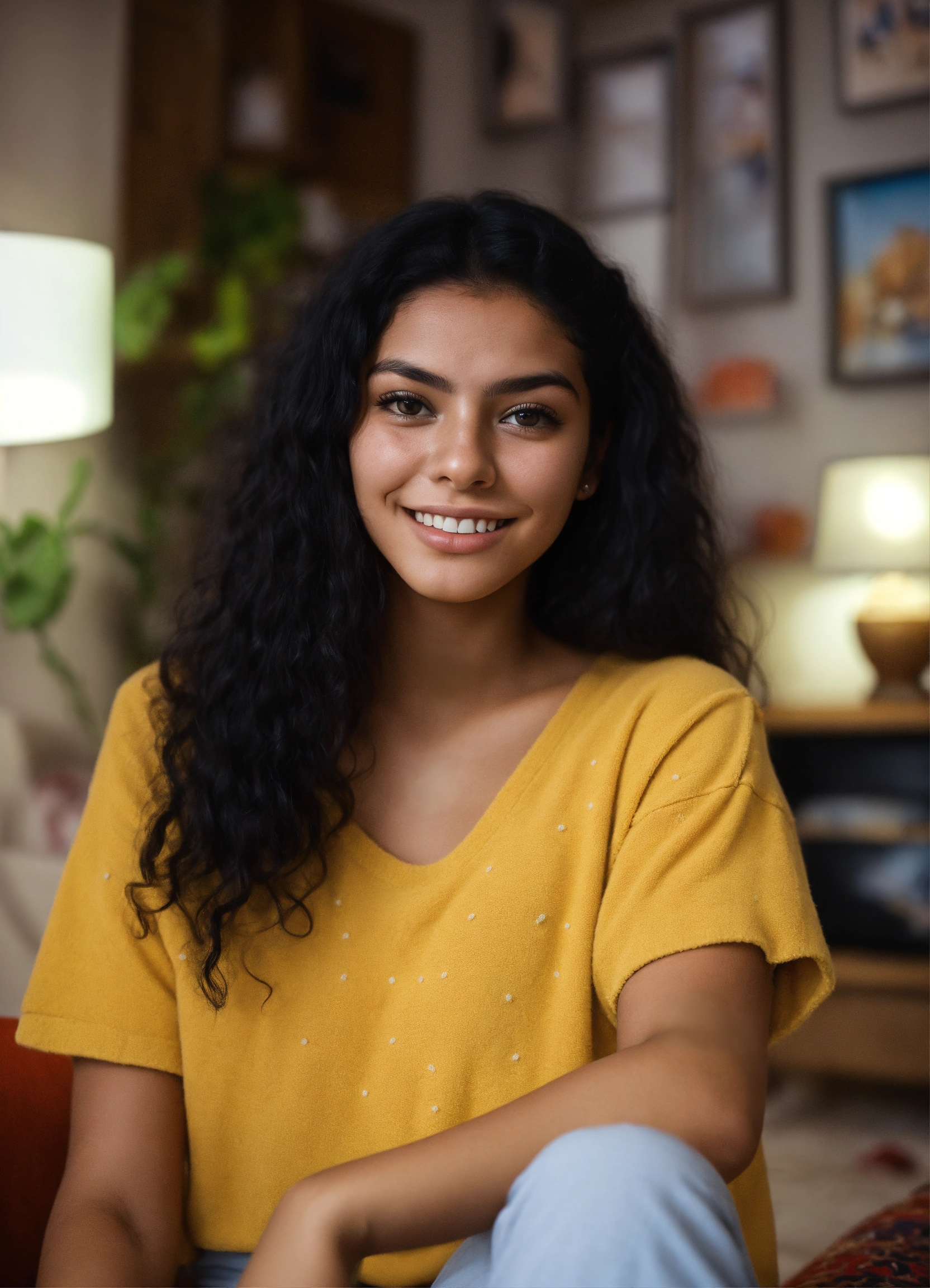A 18 - year - old brazilian woman with black hair looks at the camera and gives a video presentation. she is in her cozy living room. not smiling. the photo is of the highest quality, 4k