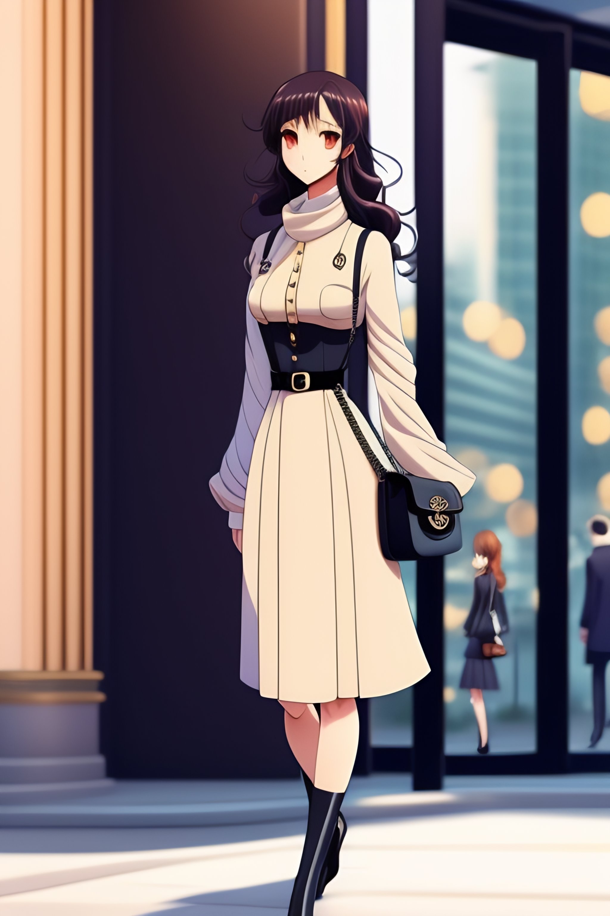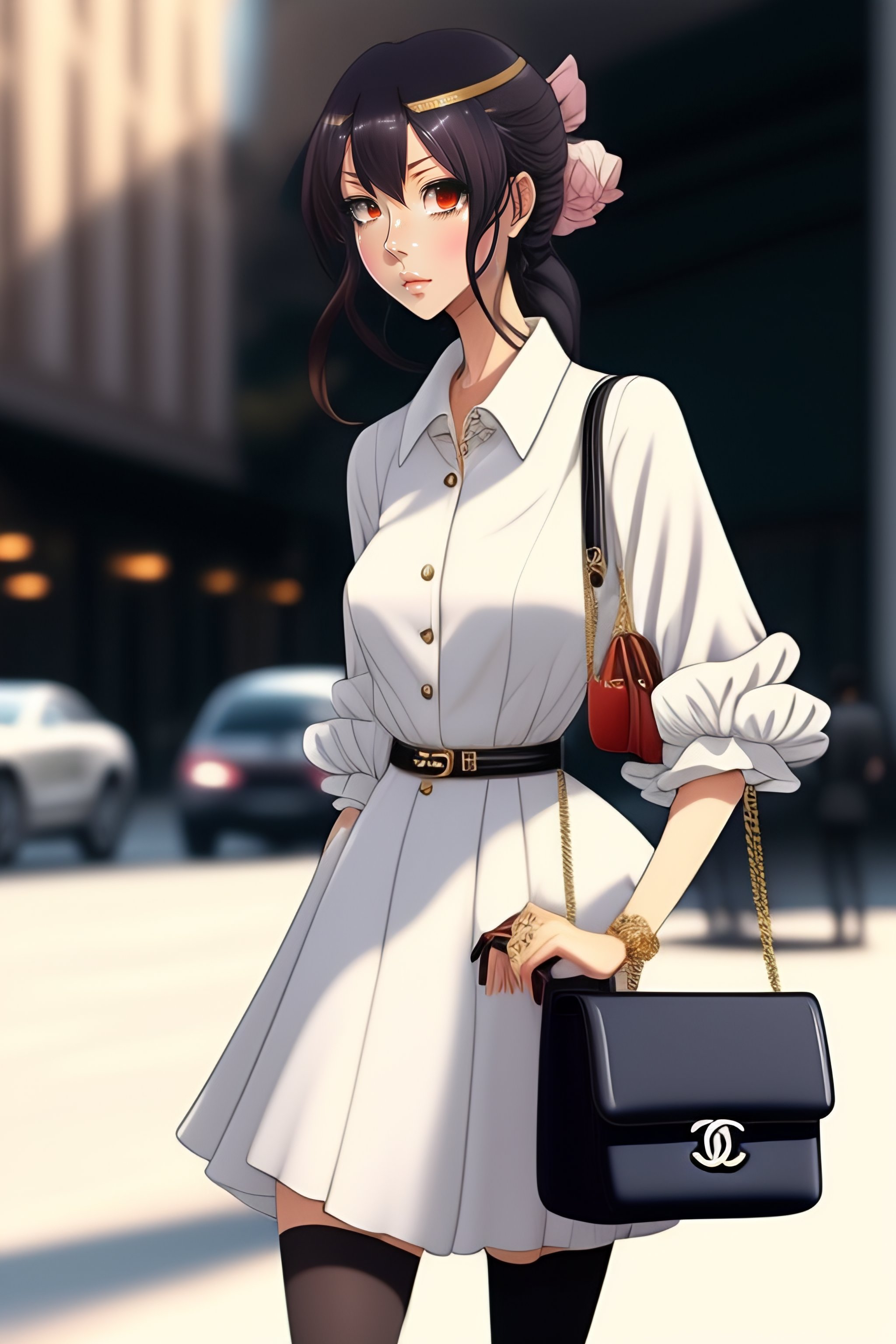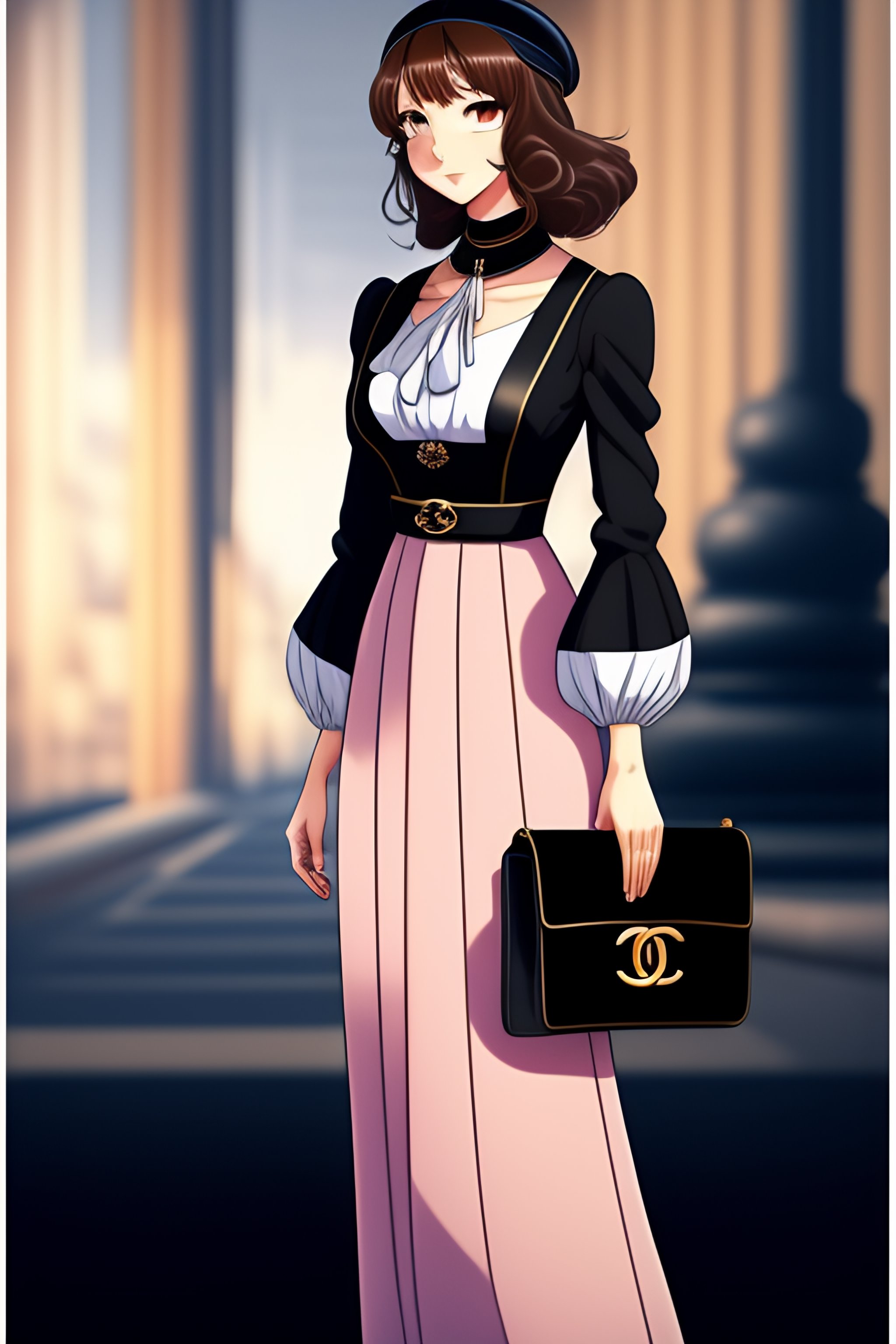 Anime cartoon of a woman wearing an elegant modest dress below the knee to go to work carrying a chanel black bag