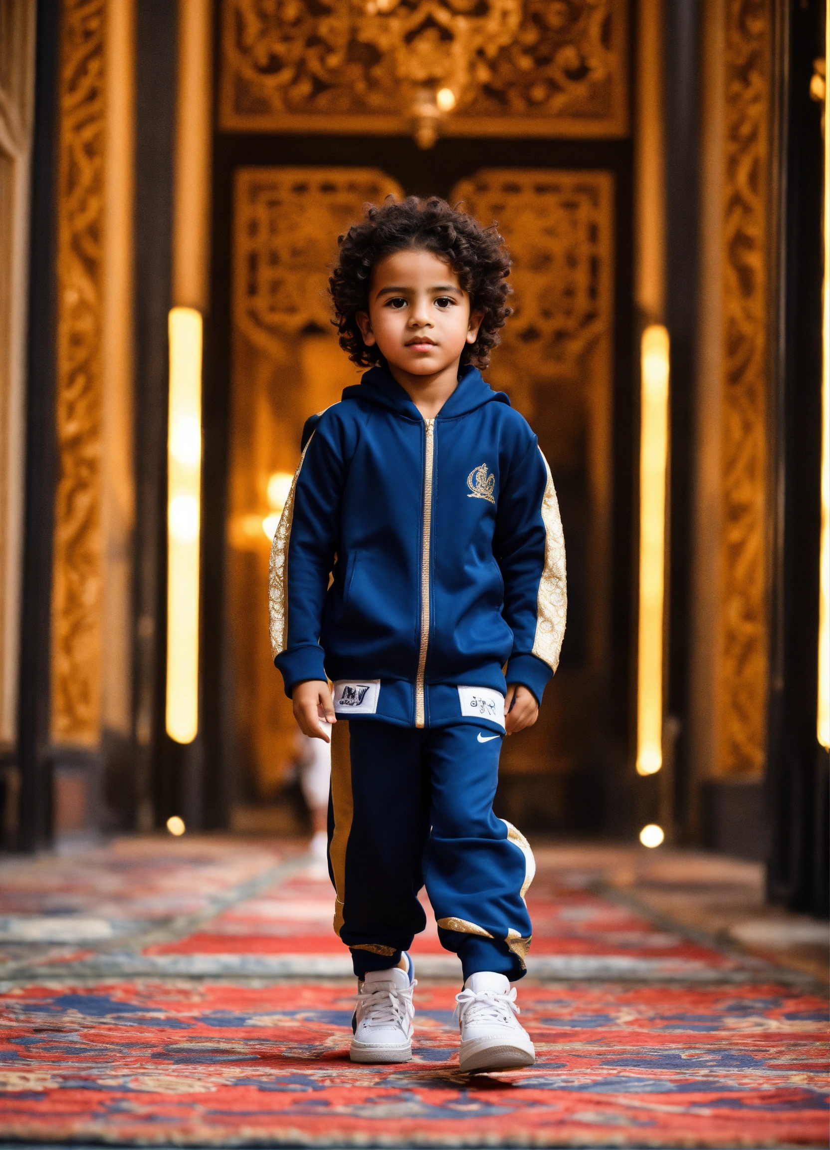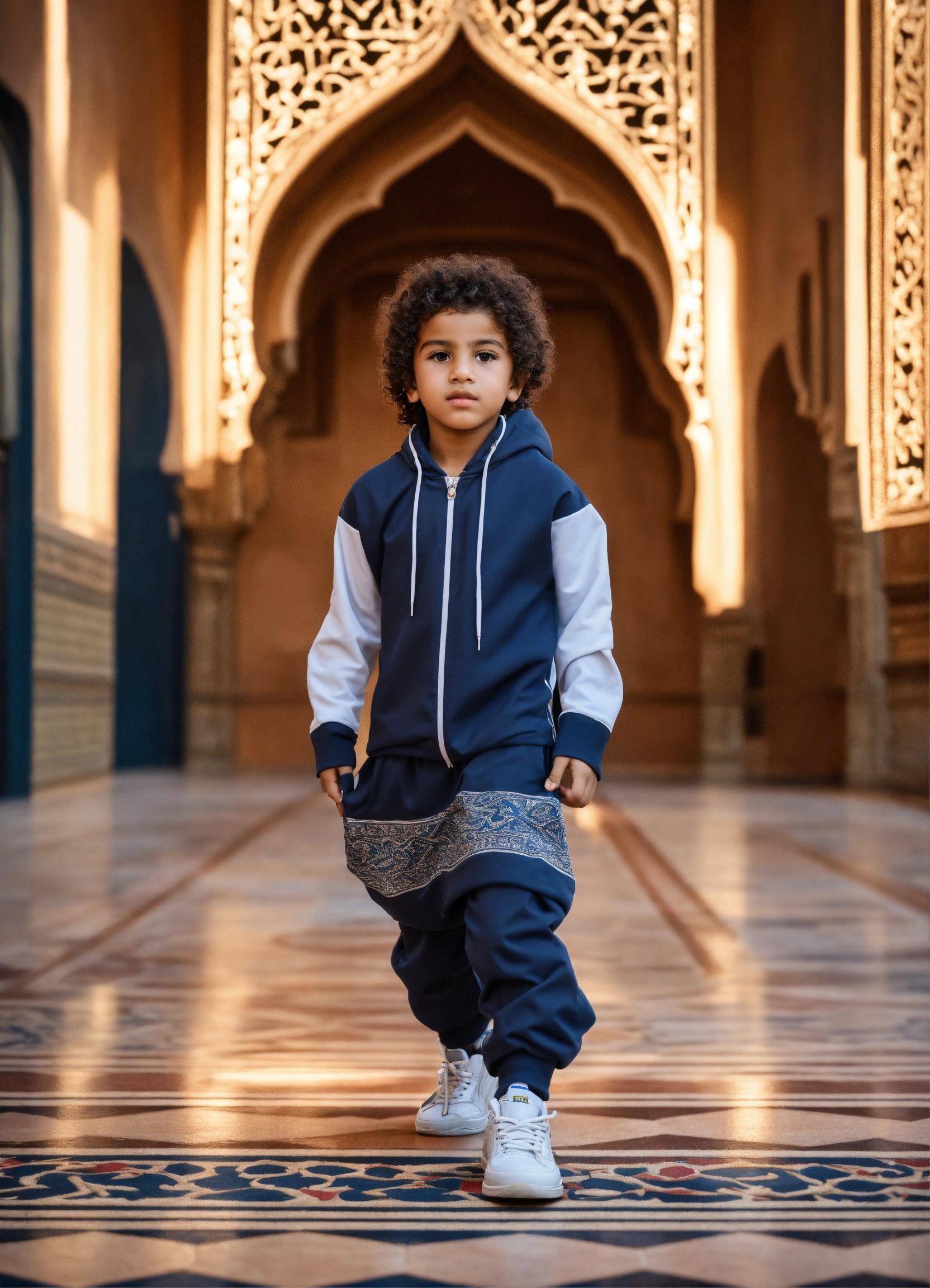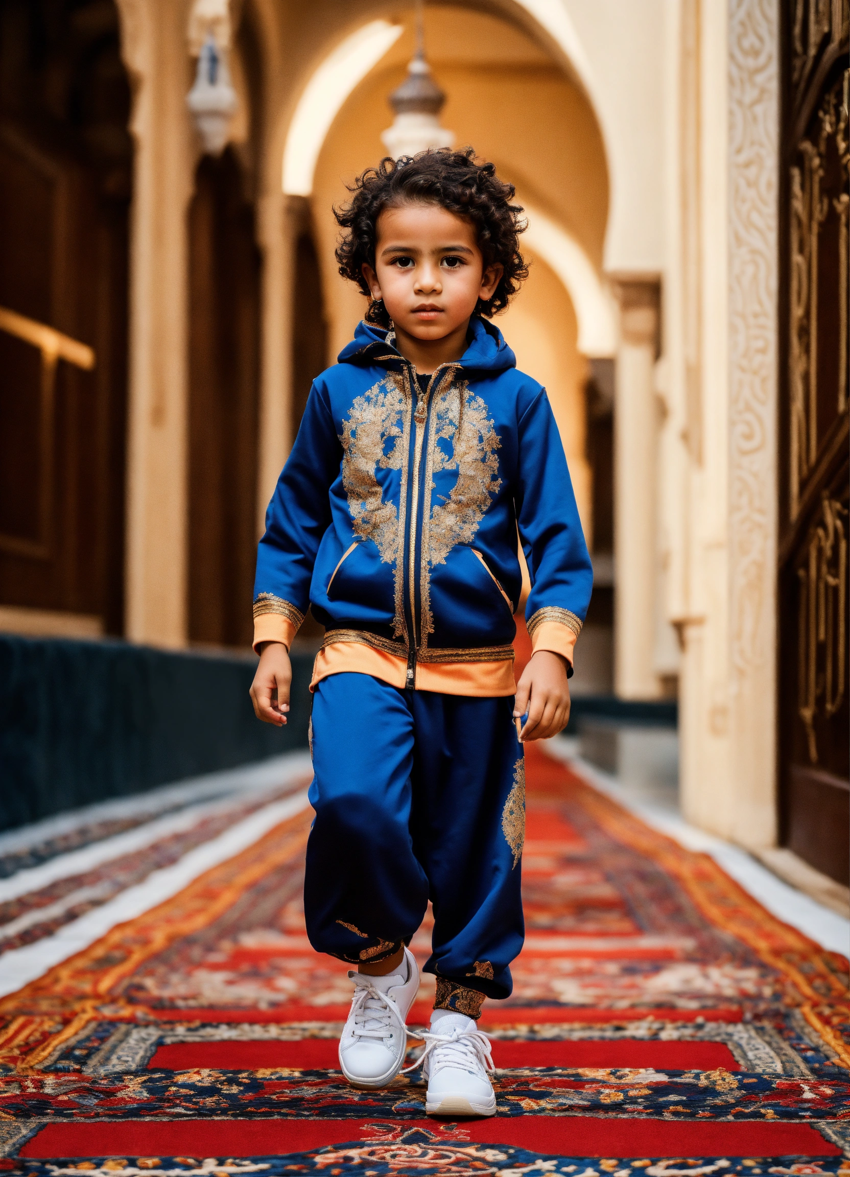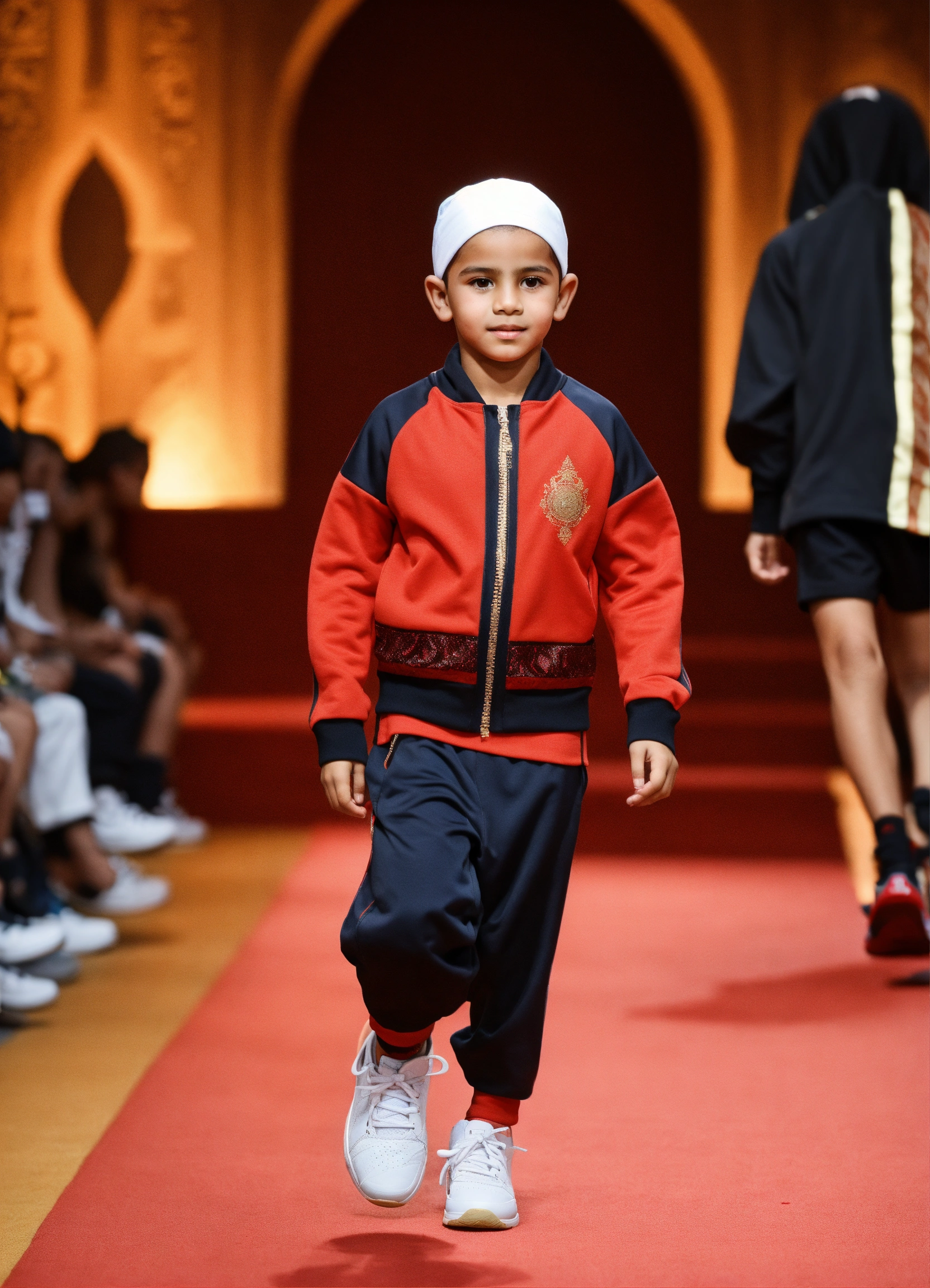 Beautiful little morrocan boy, wearing sport wear, with arabic touch morrocan style, luxury fabric, with luxury sneakers sport, with beautiful hair, no hood, haute couture, fashion photorealistic, in front decor runaway walk fashion show