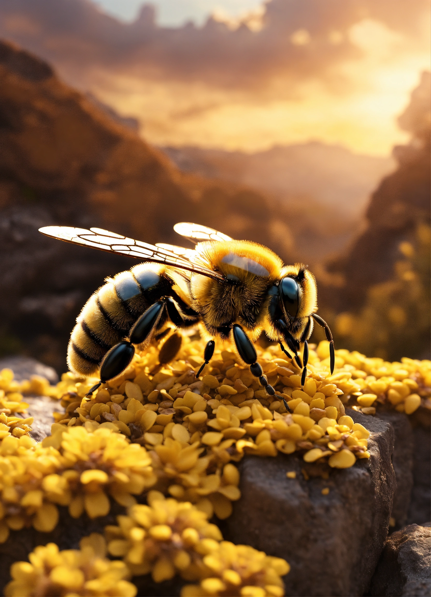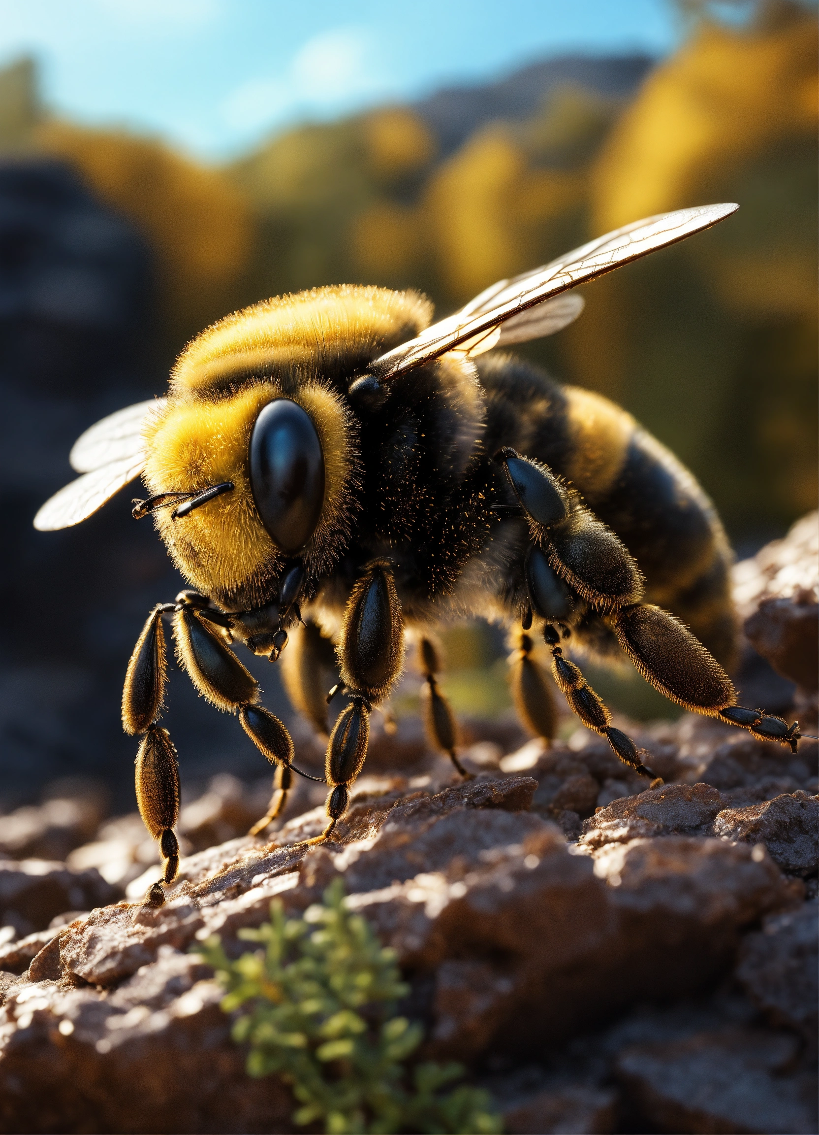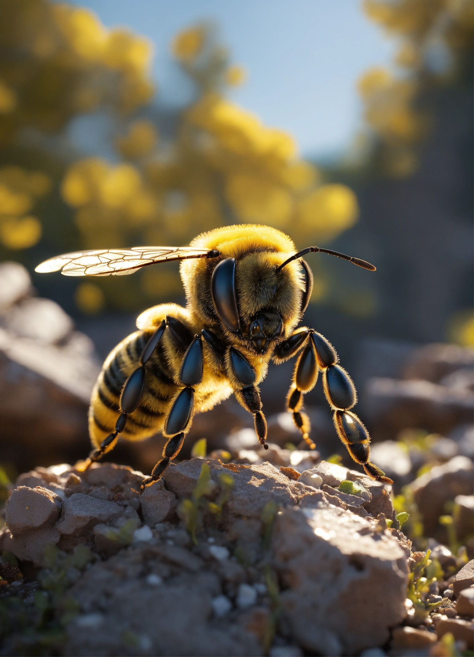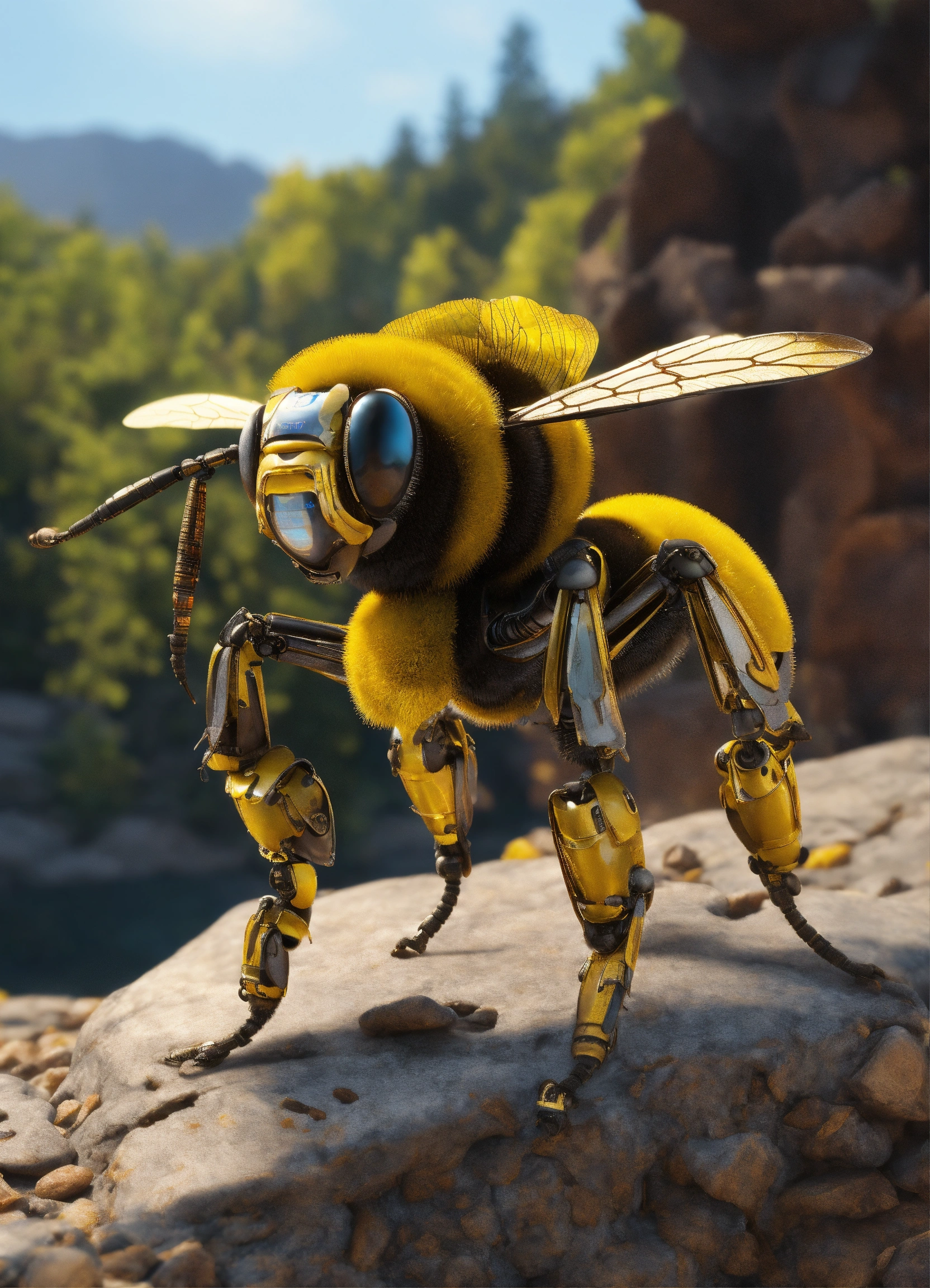 1️⃣ a bee that looks like a robot flying over a rocky road, in the style of realistic, detailed rendering, industrial decay, vray, frequent use of yellow, shot on 70mm, chromepunk, hudson river school