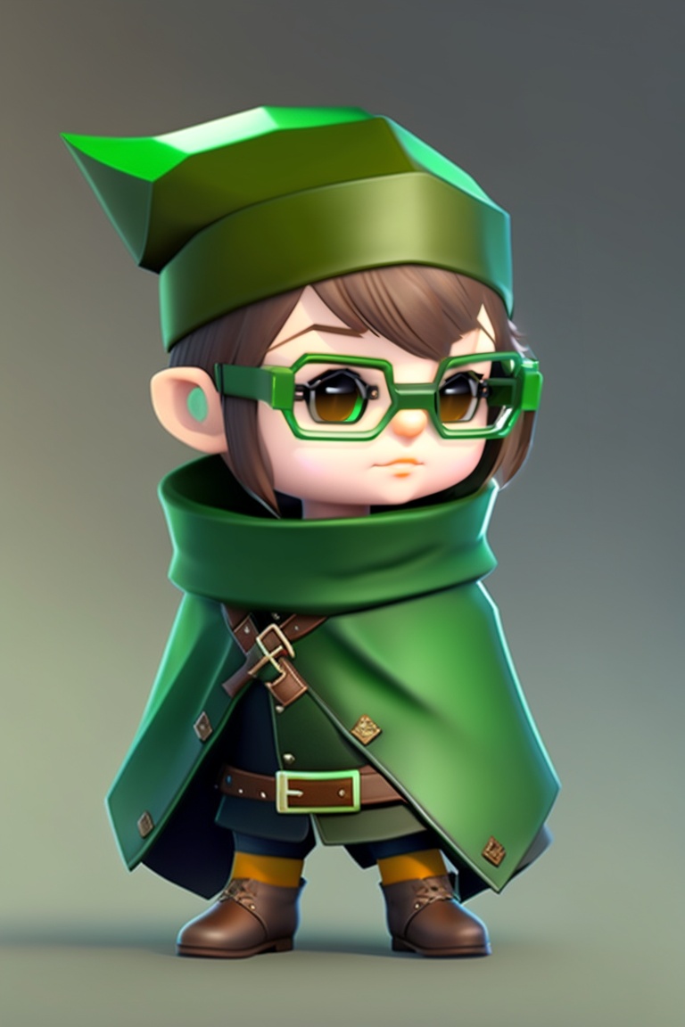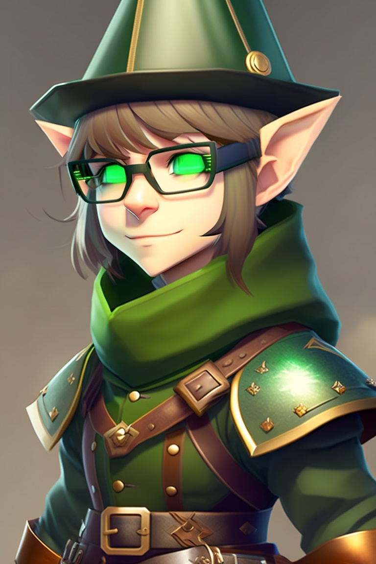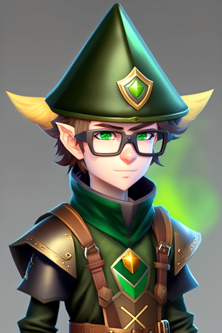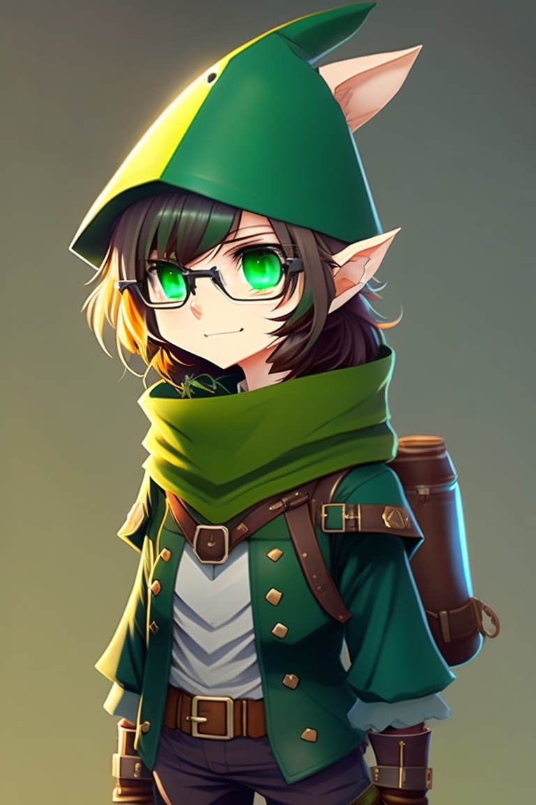 A young forest gnome with glasses a pointy green hat, dark green leather tunic/armor, glasses, brown hair, 2 daggers in a anime style