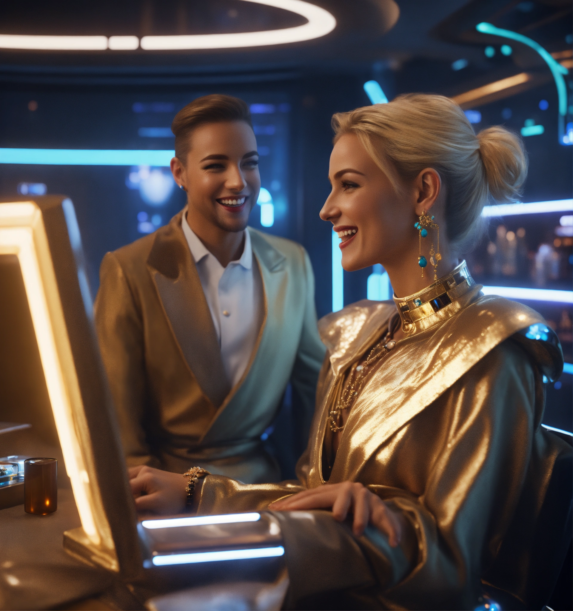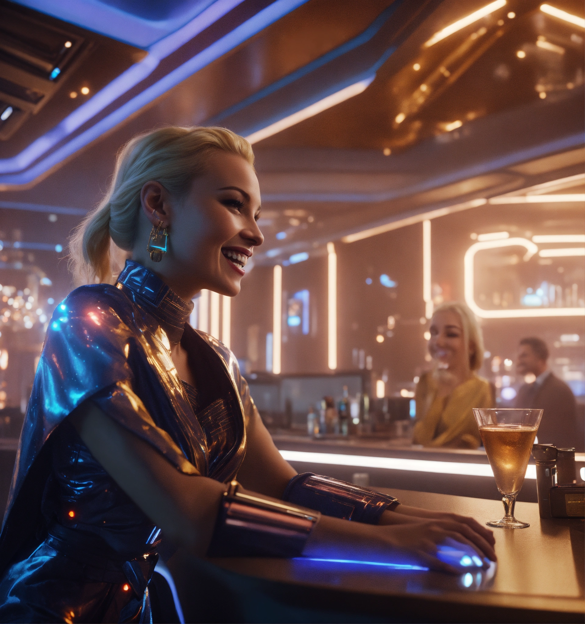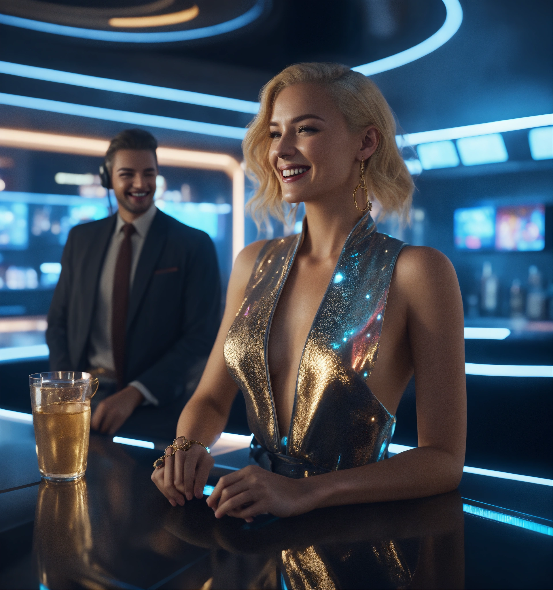 Zoom out from an alluring blonde wearing a fancy space robe and jewelry in a futuristic space bar hotel laughing with a man, realistic, futuristic, sci-fi, 8k, unreal engine