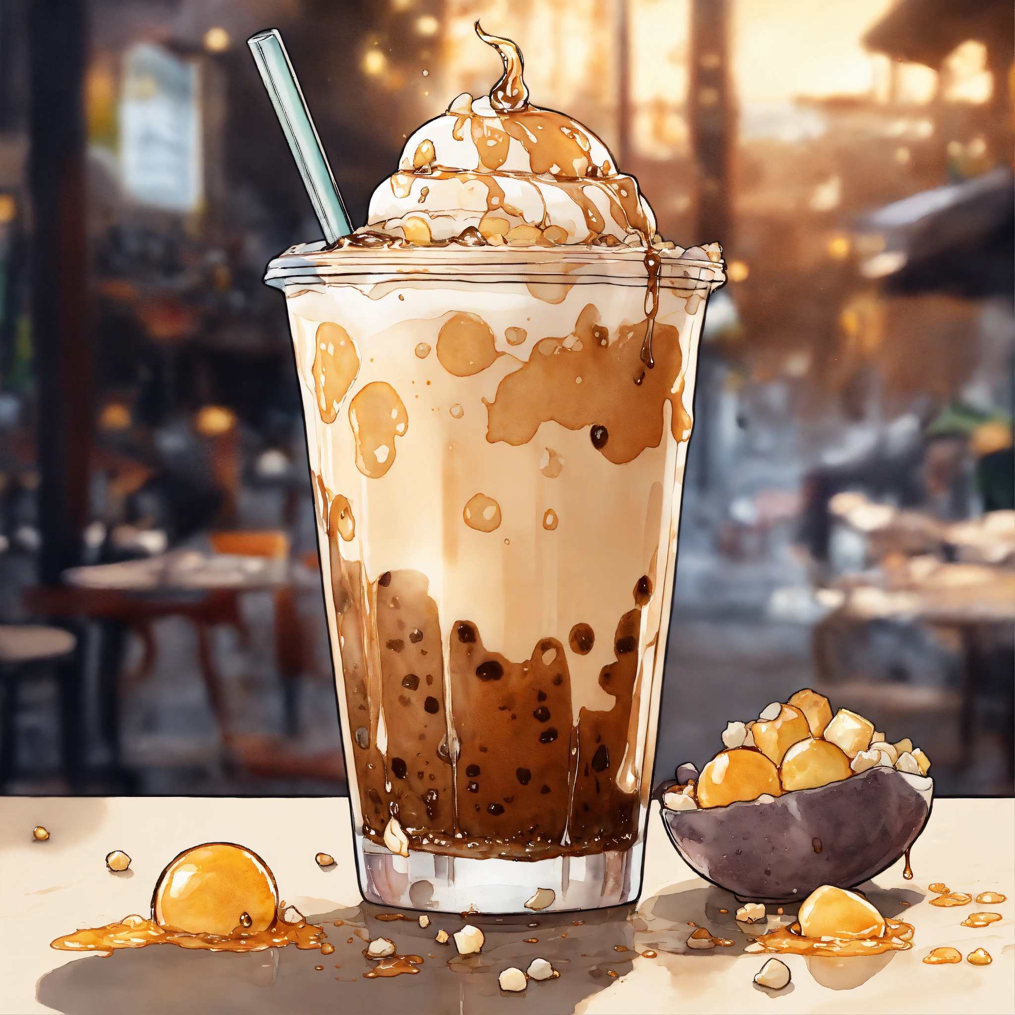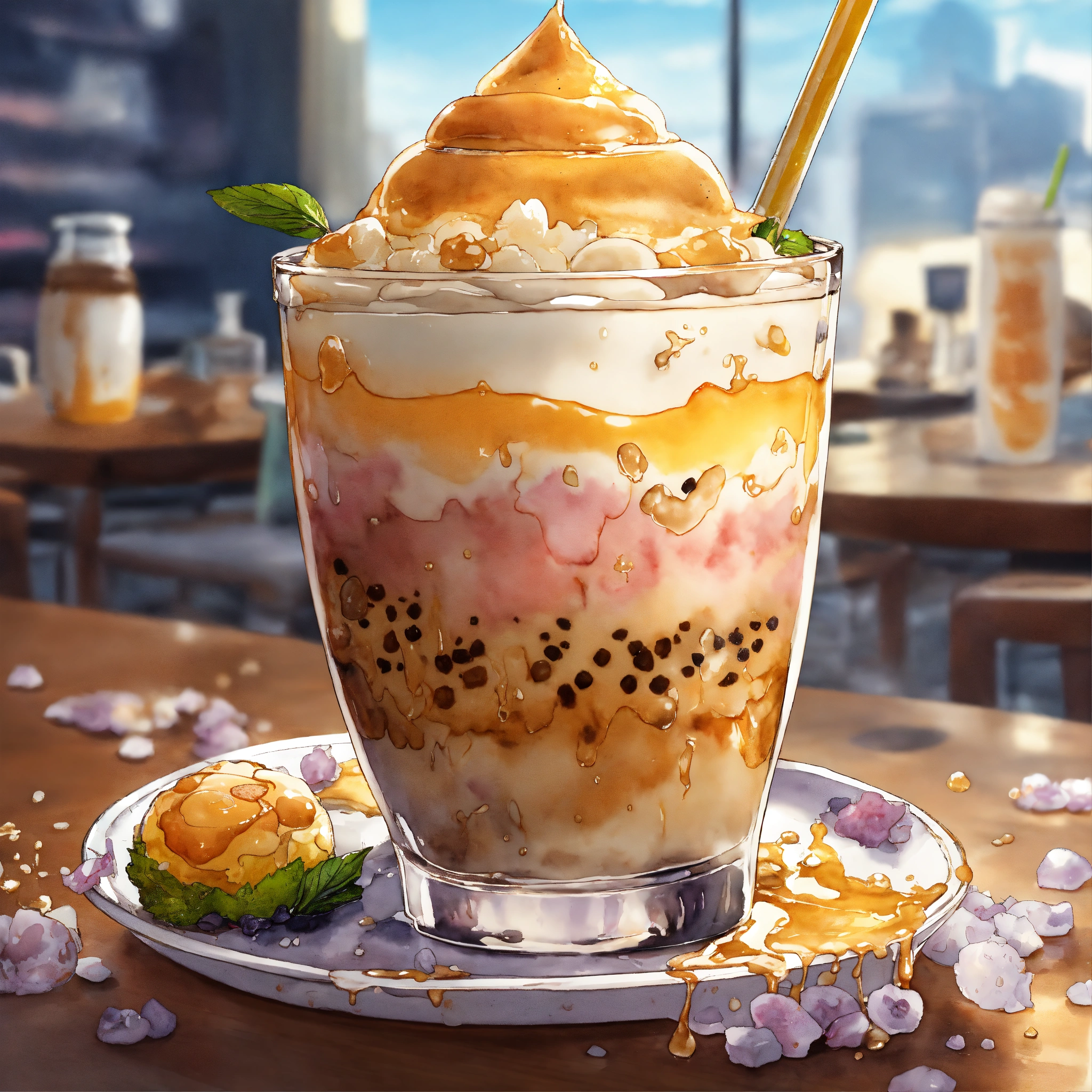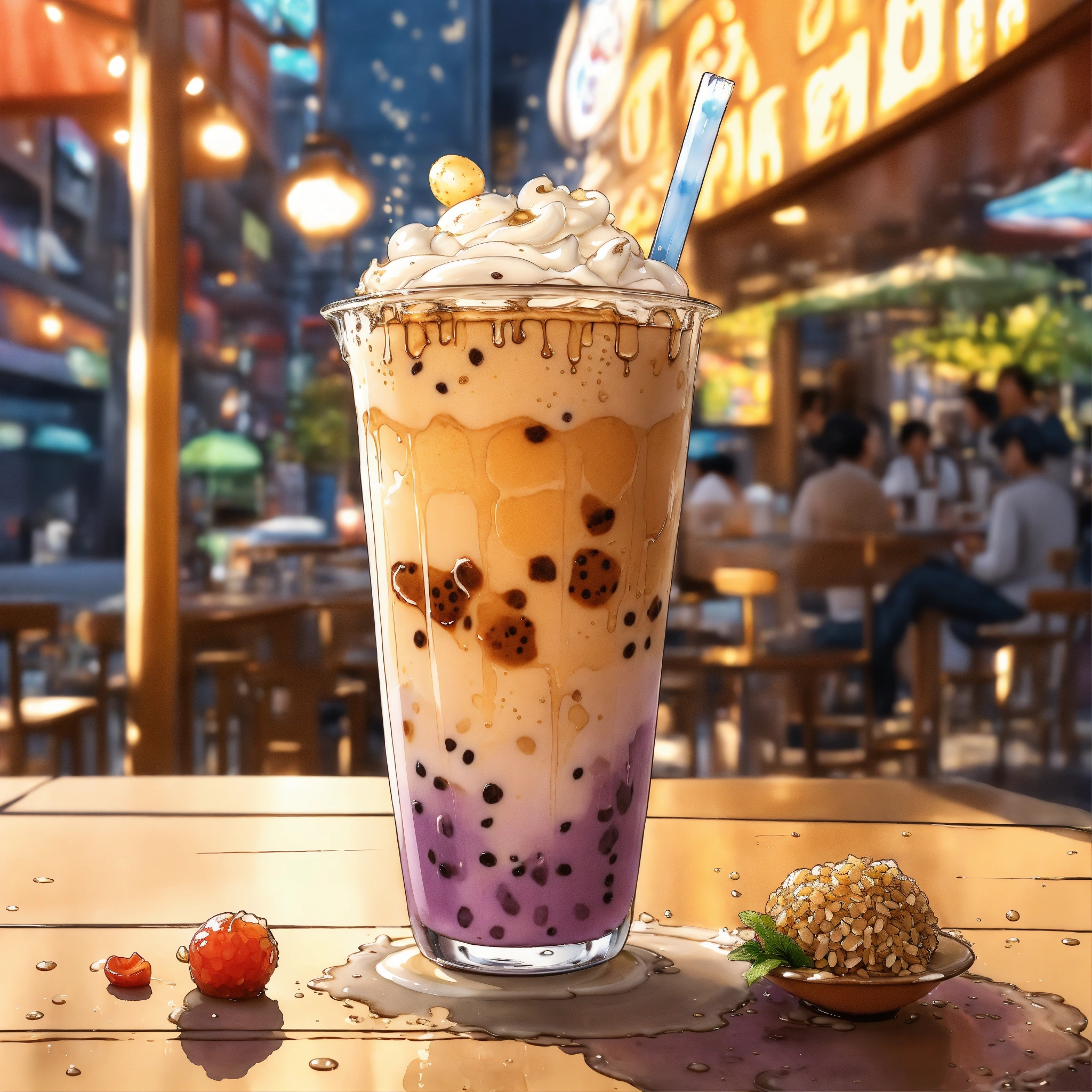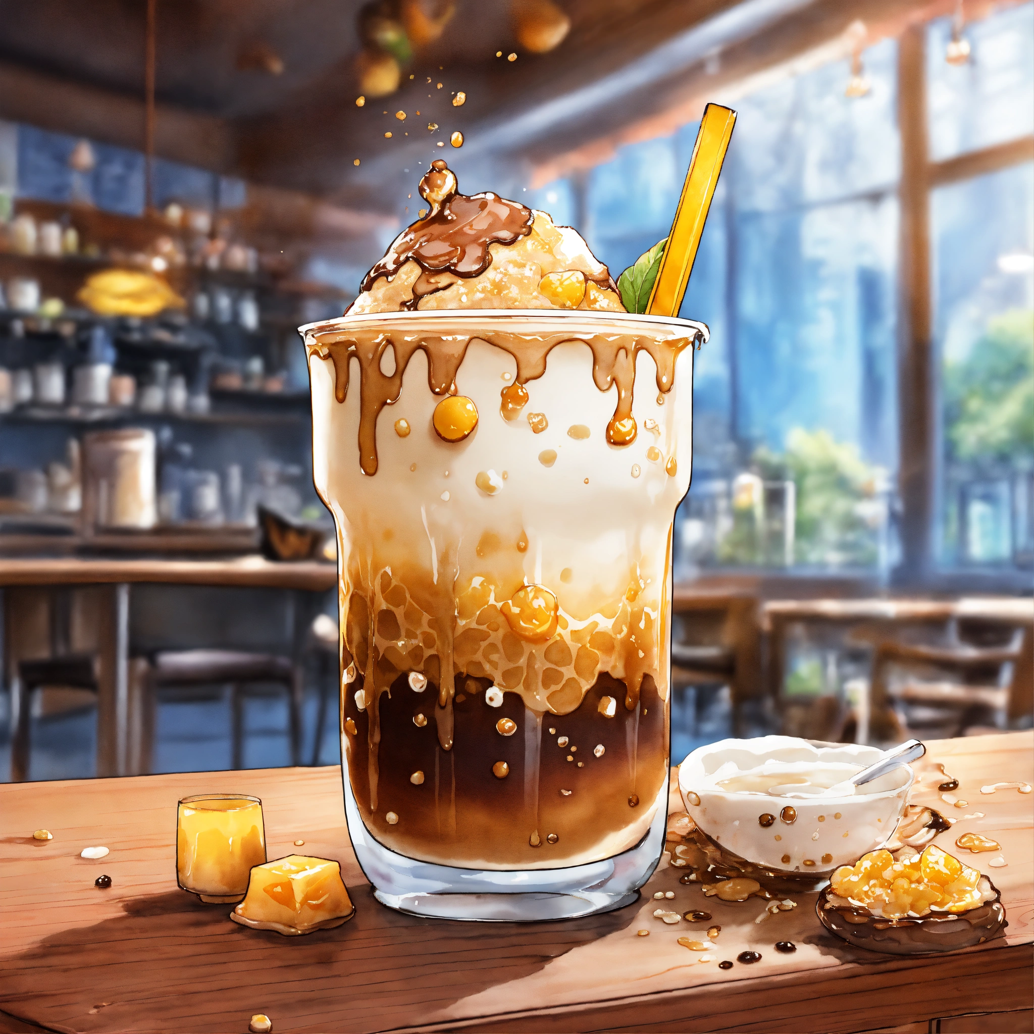 Manga cartoon dc comic style. a mouth-watering taro with honey drizzle milk tea with boba, where each layer from the boba to drizzle to the toppings seems to be pouring lazily into a mix of a liquid goodness of flavor. the scene captures the very moment of chaotic assembly, with milk, tea and honey draining into the glass and ingredients swirling together . medium realistic watercolor salt wicking style manga dc comic drawing inspiration from moments of blending showcasing the dynamic nature of the milk tea. lighting variegated vignette yet focused, casting slight shadows to give depth to each ingredient. colors bold with muted saturation making the drink look irresistibly delicious. resolution 3d hd focusing on the central explosion of flavors