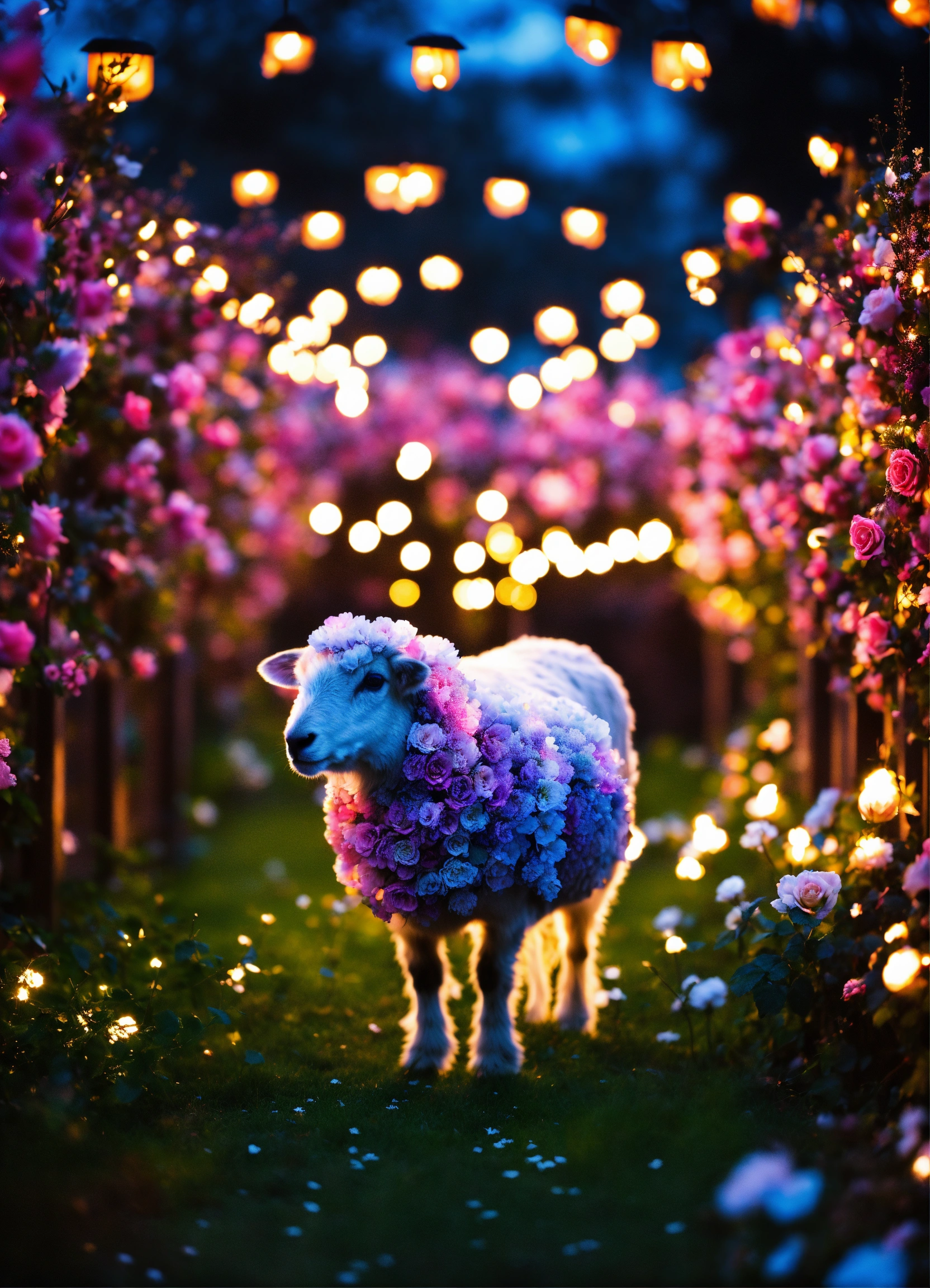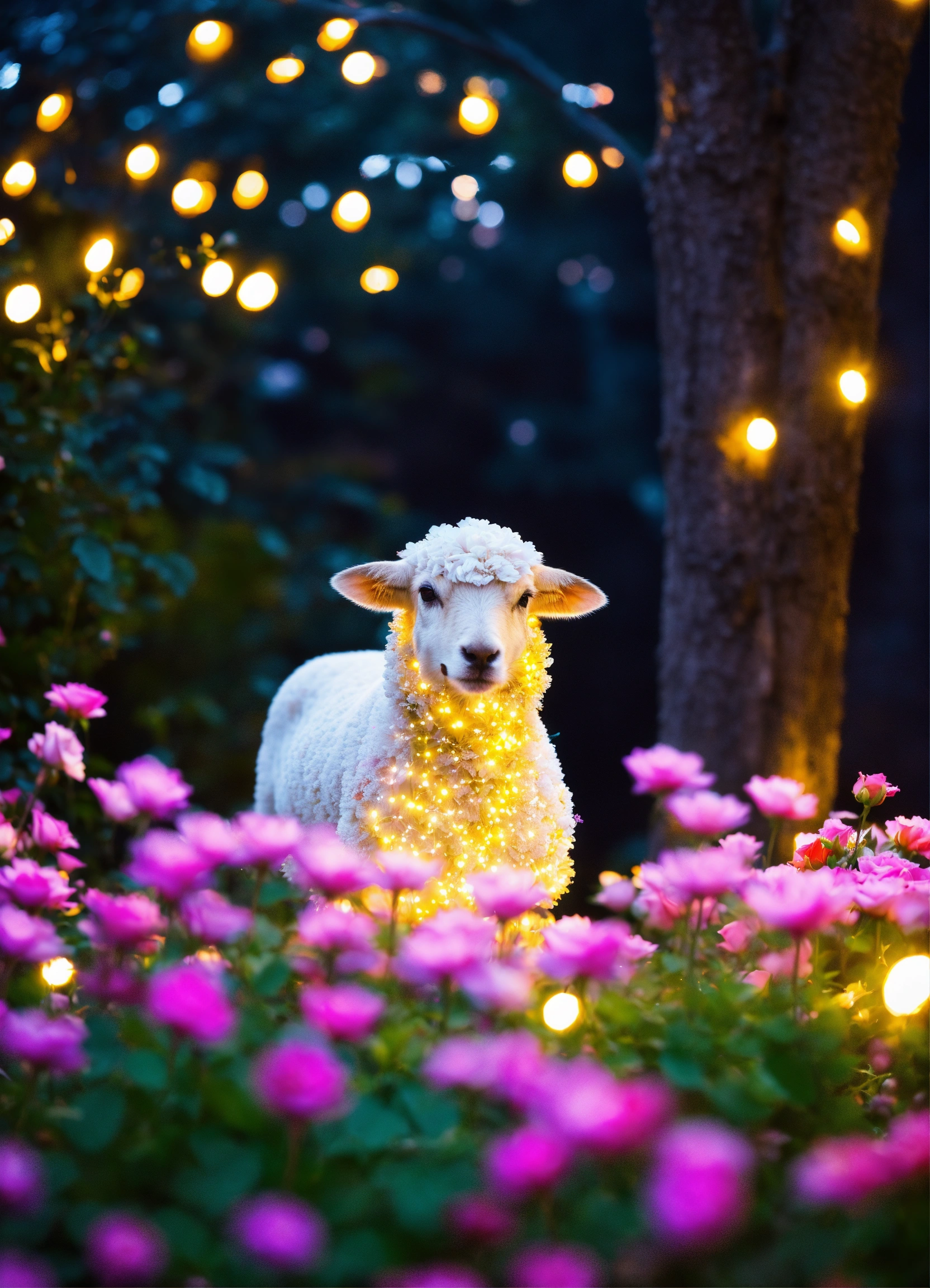 Mouton très qui fait de la lumière forte, dans un jardin de fleurs la nuit très sombre, plan éloigné, lucioles, brillants, confettis, art numérique, bookeh rose