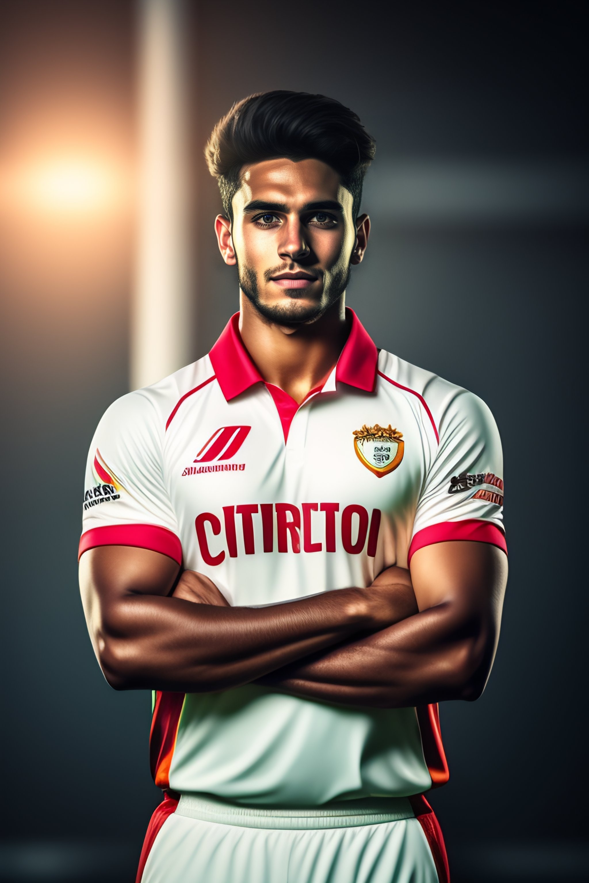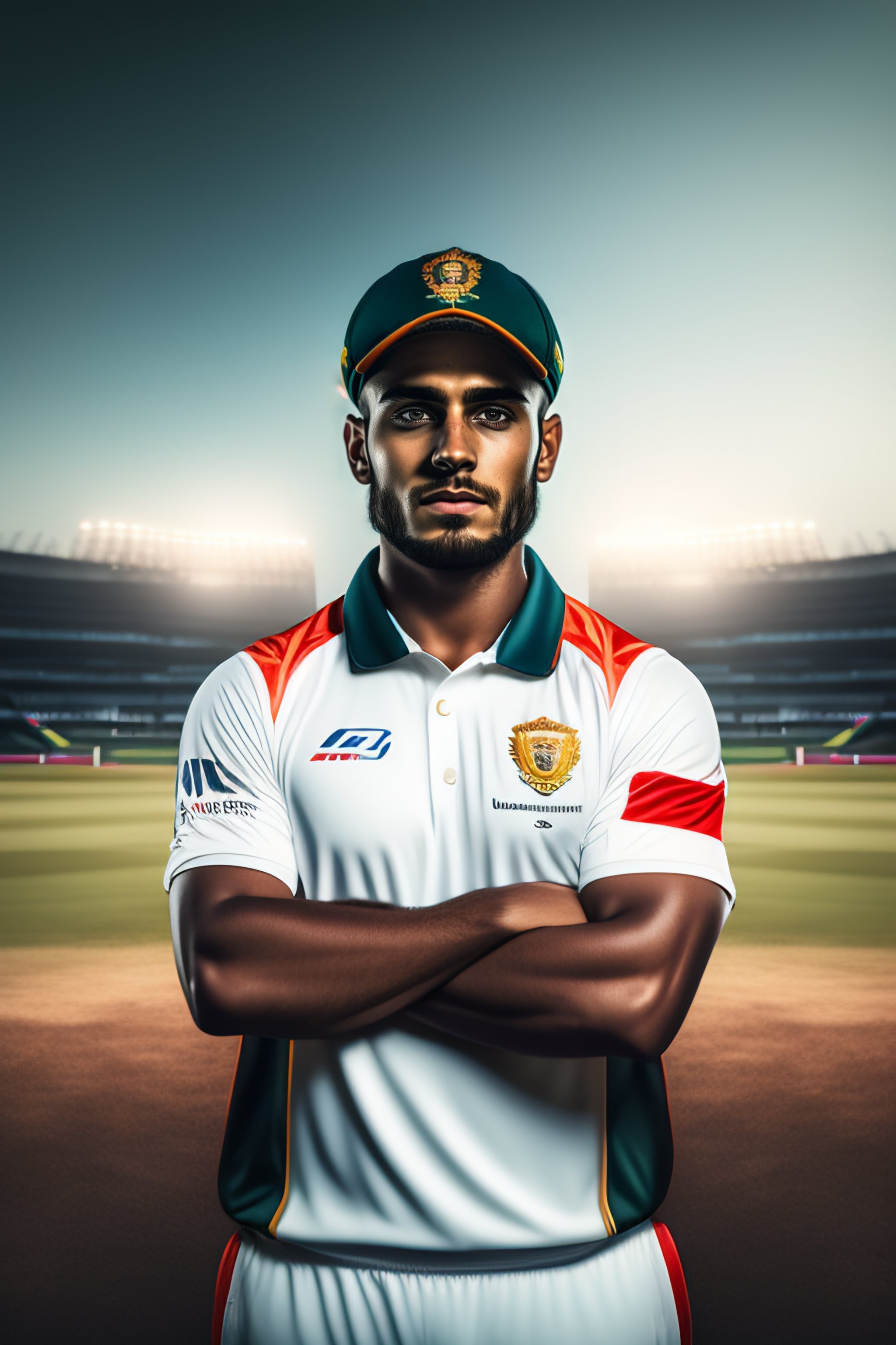 A professional photograph of 22 year old cricket player, portrait look at the camera, headshot realistic, highly-detailed, smooth, sharp focus, octane render, 8k, 4k, beautiful, post-processing