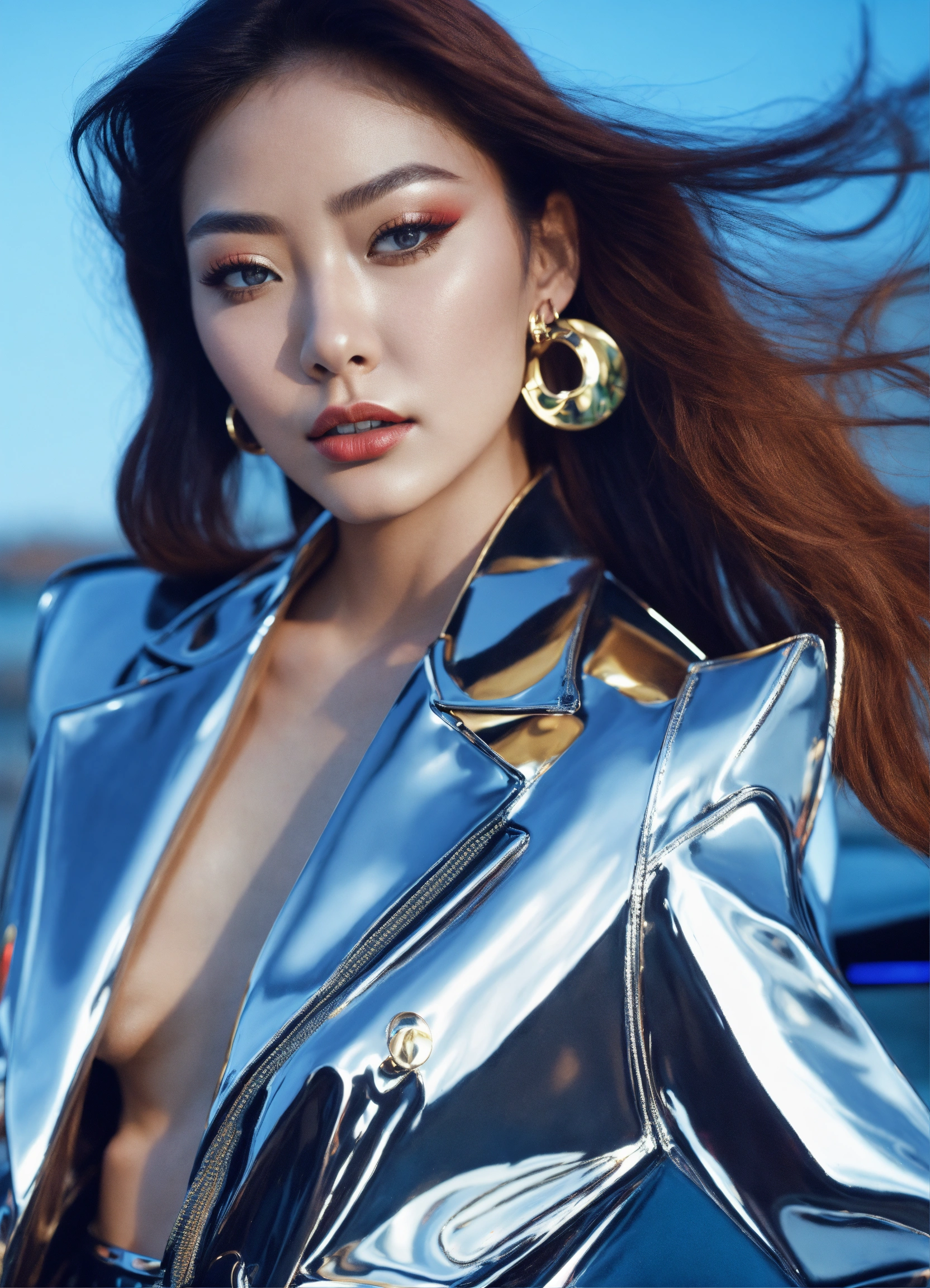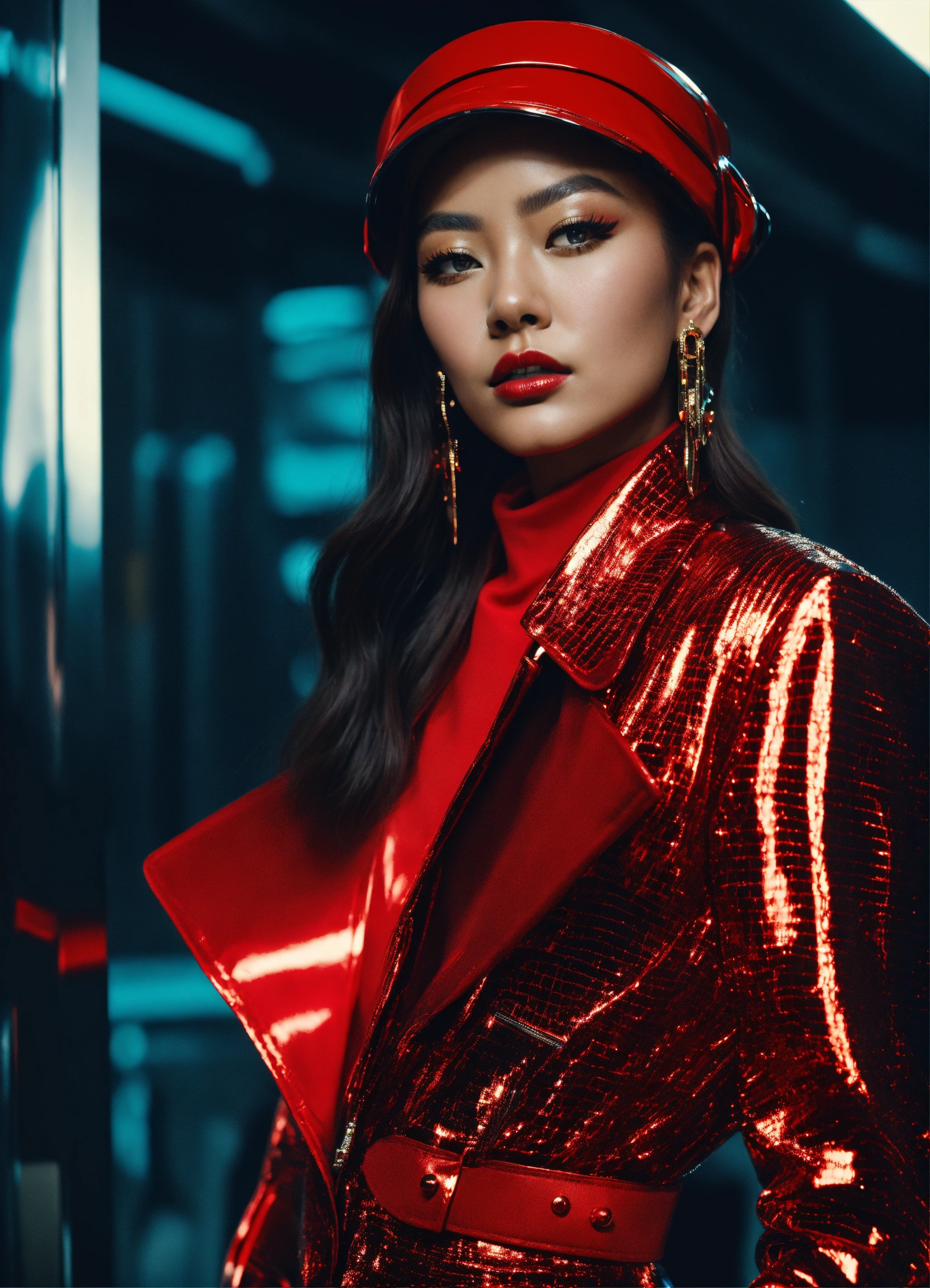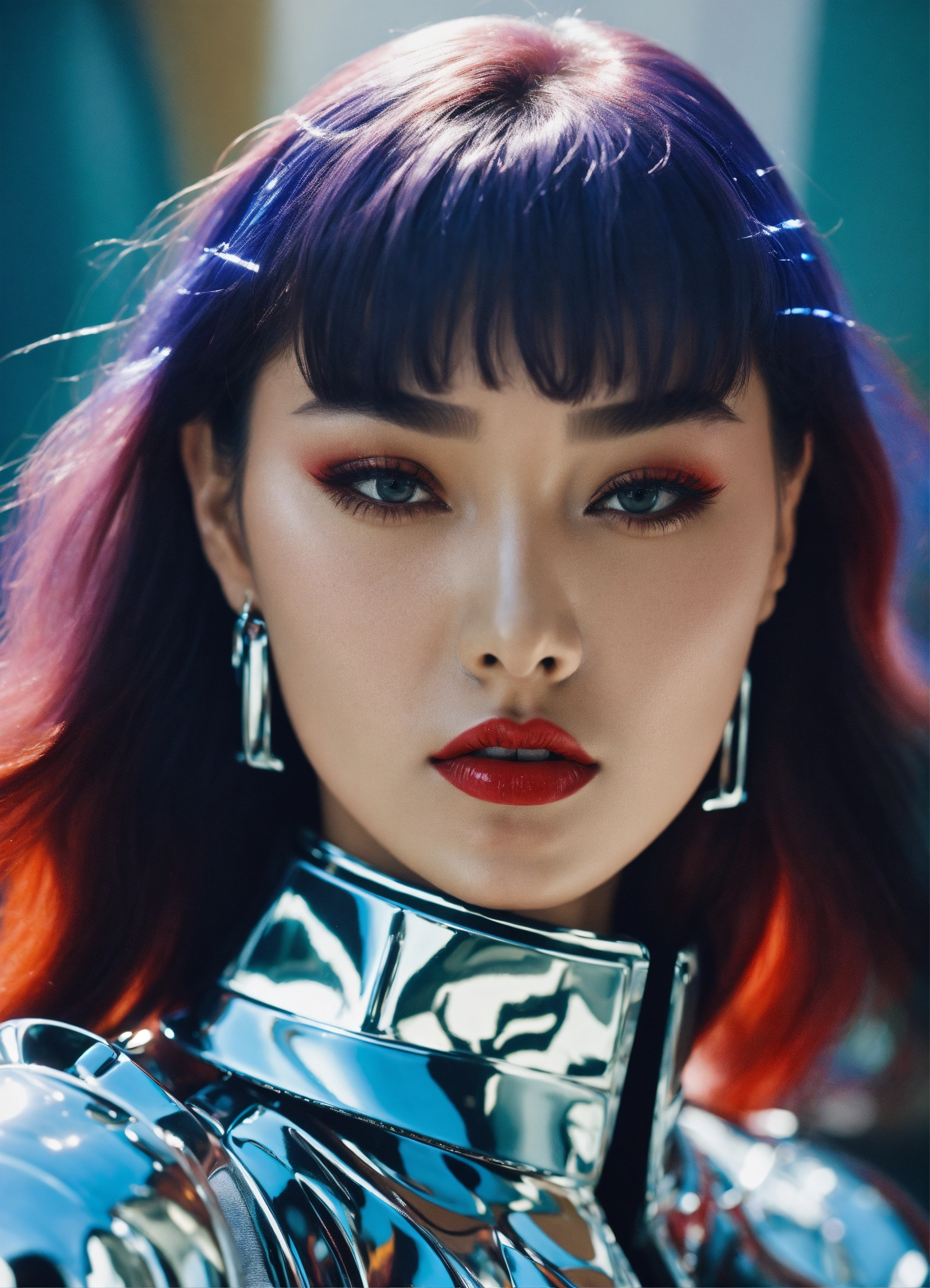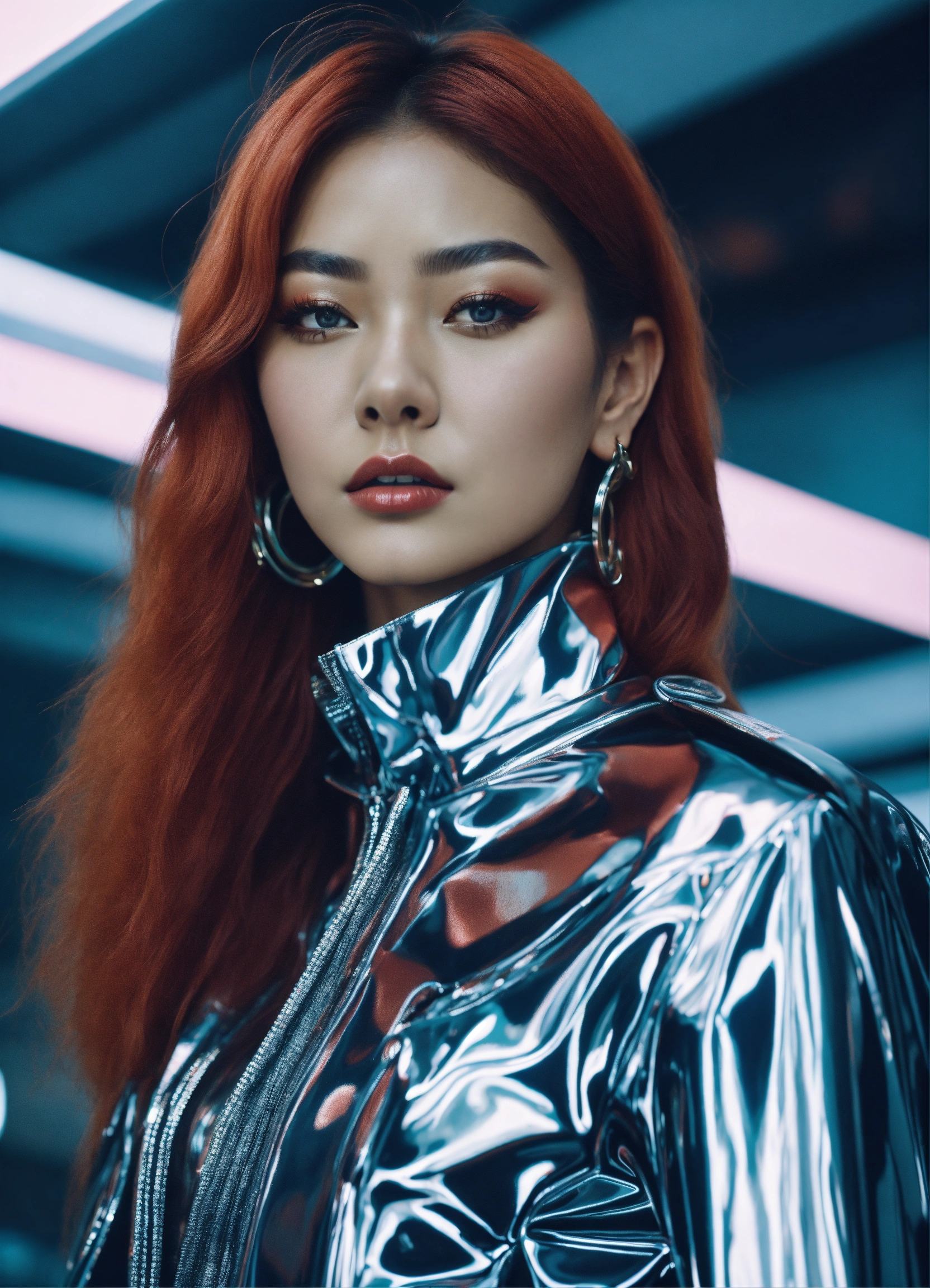 Ultra hd! realistic! vogue photoshoot, futuristic fashion, seulgi posing, chrome outfit, photo in 90's fashion style, cinematic, surrealistic, 8k
