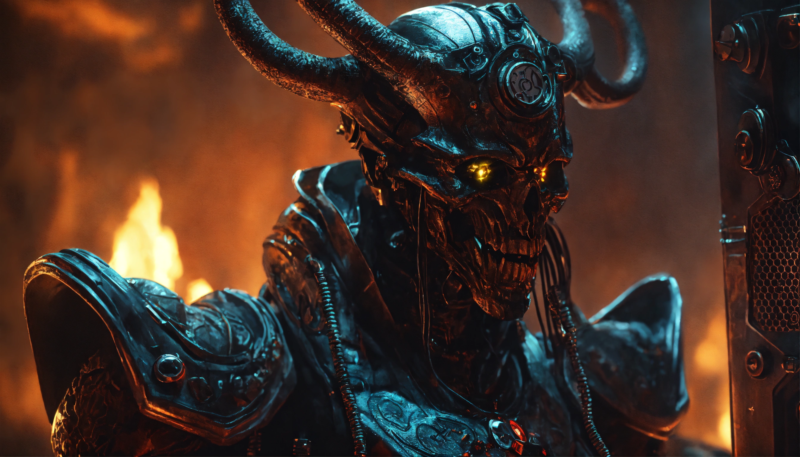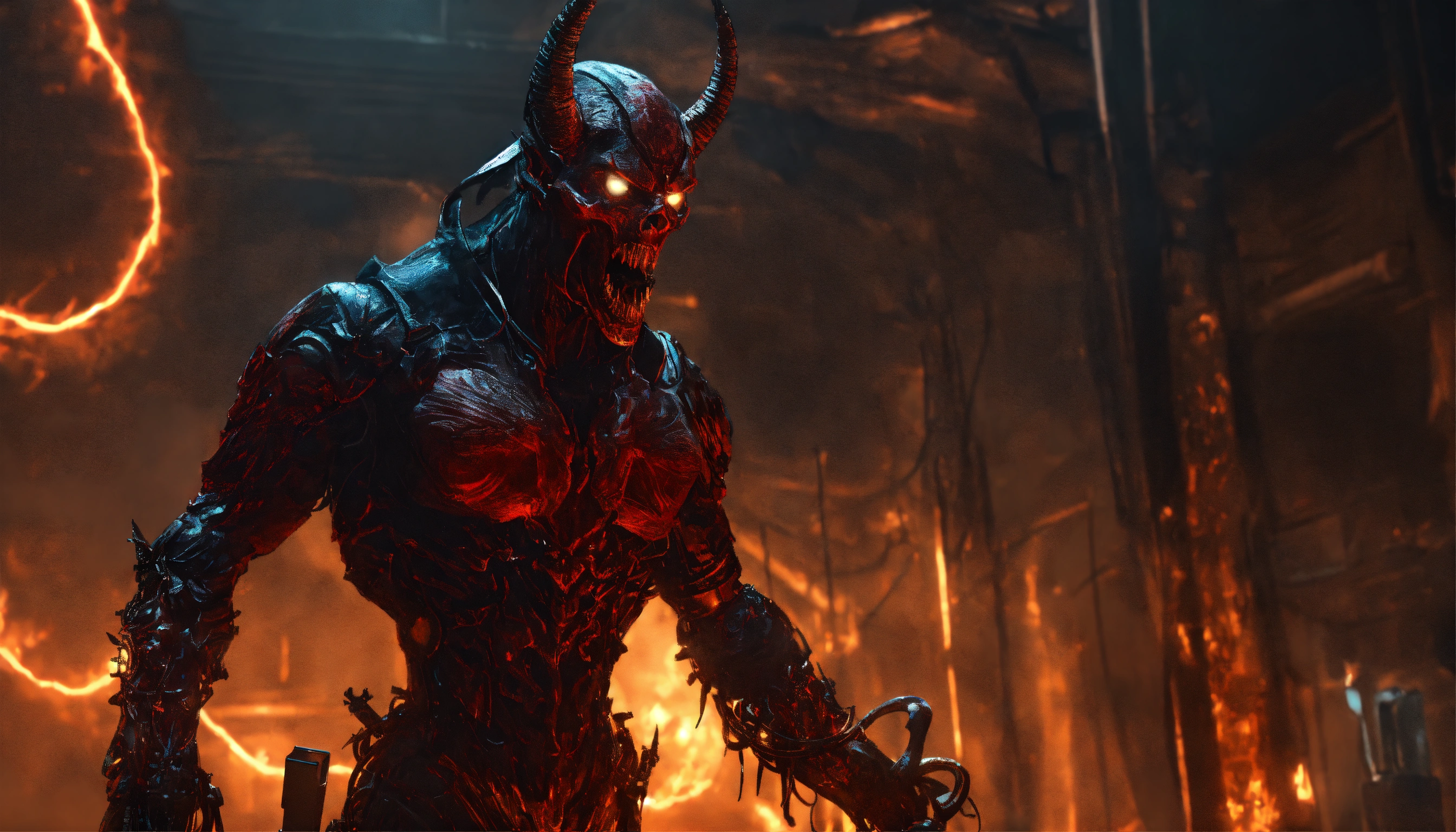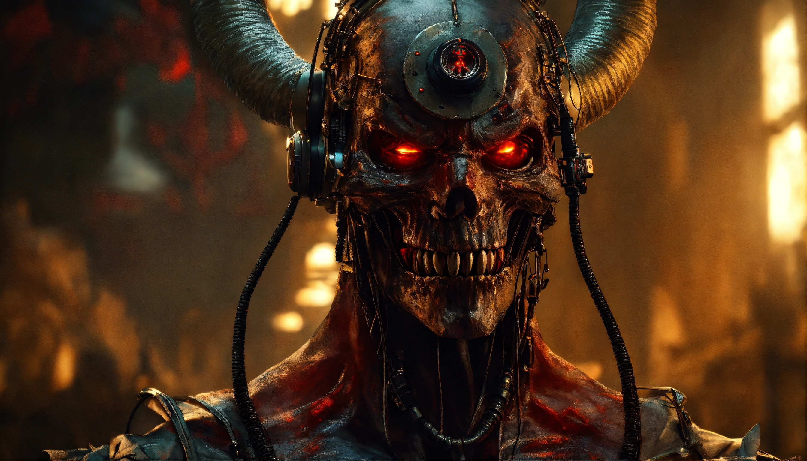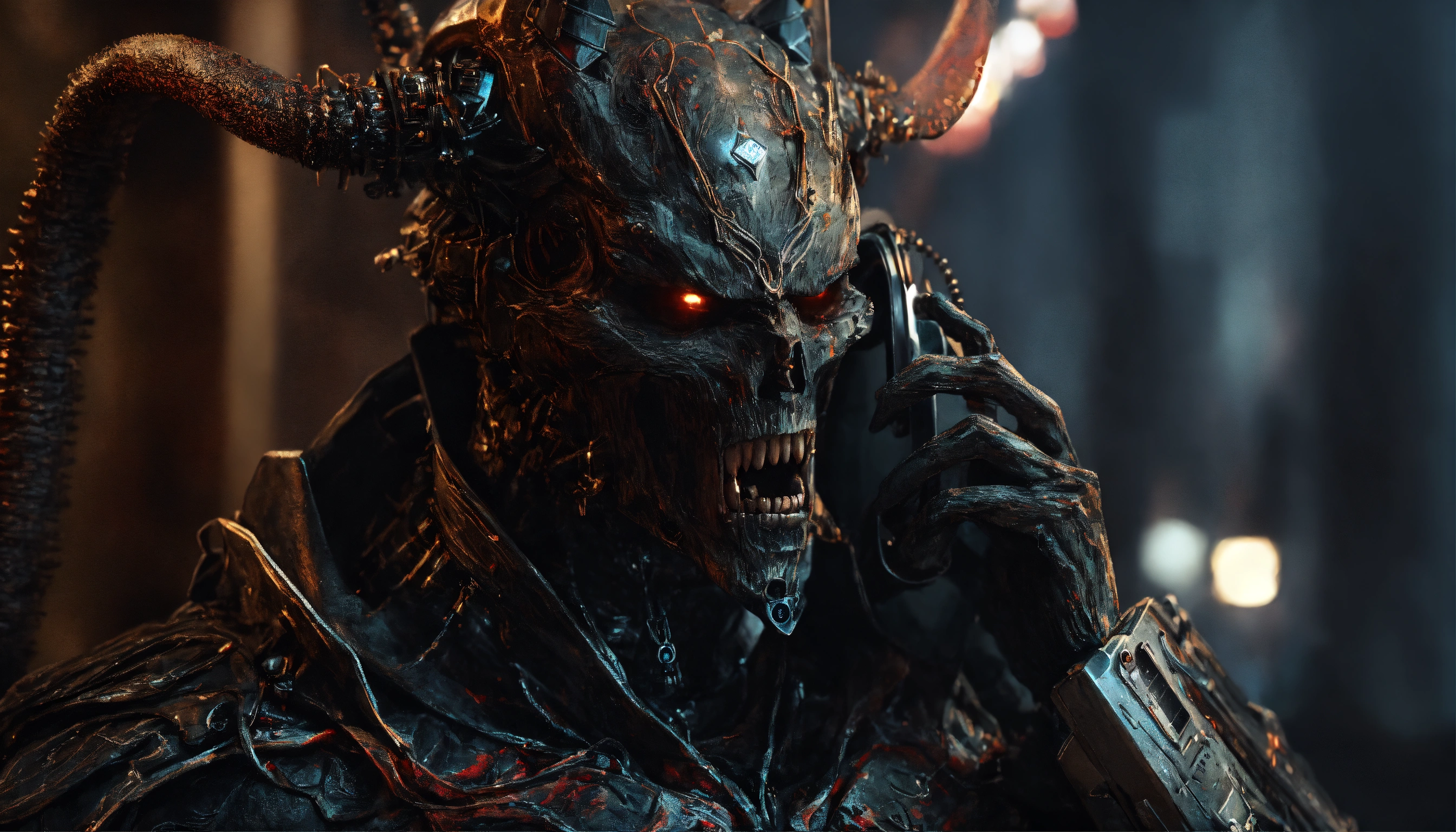 Evil demonic character talking on the phone, the phone has sent a frequency and activated a nanotechnology inside of their body, ominous, extremely detailed and realistic, inspired by apollyon