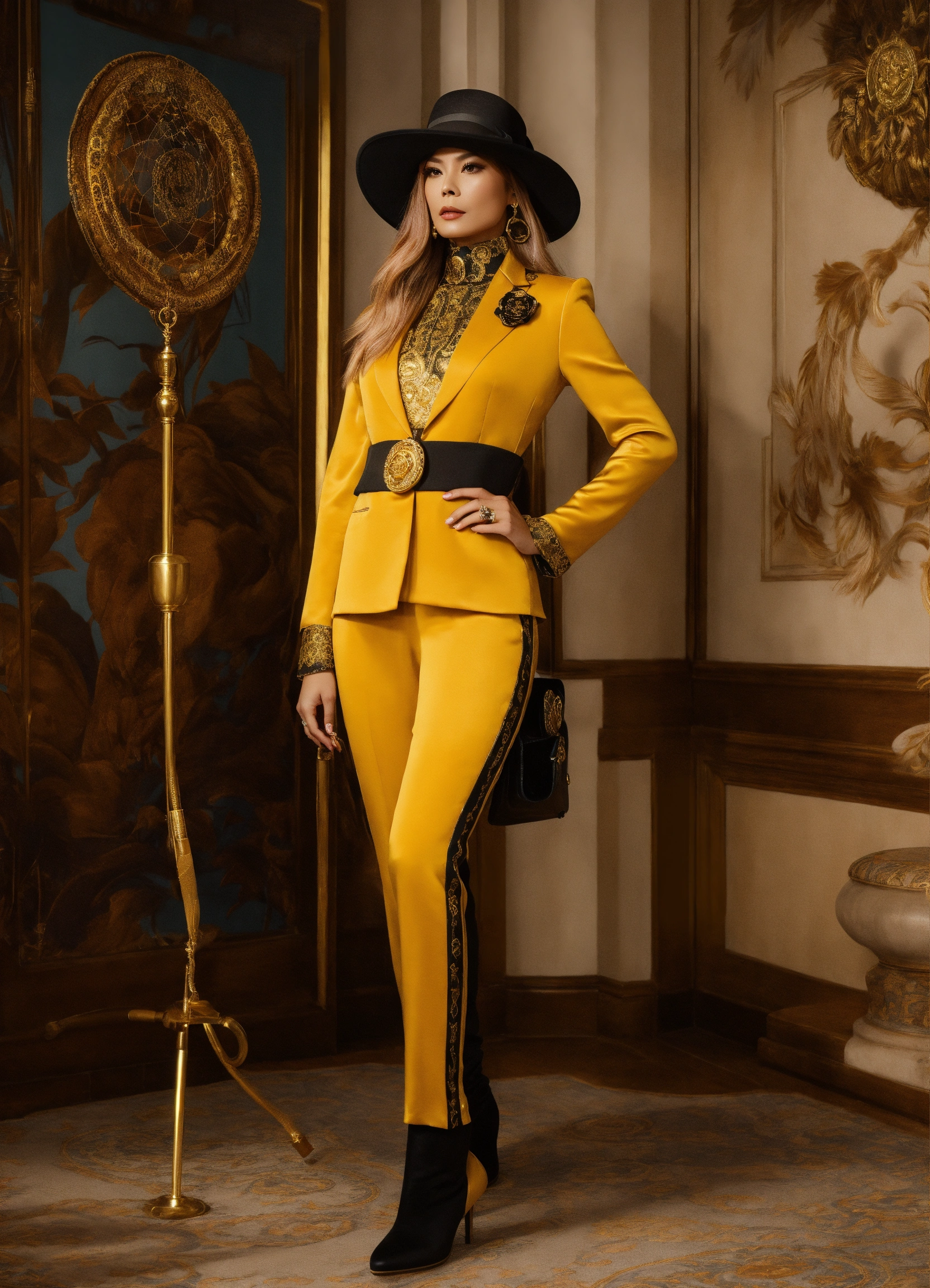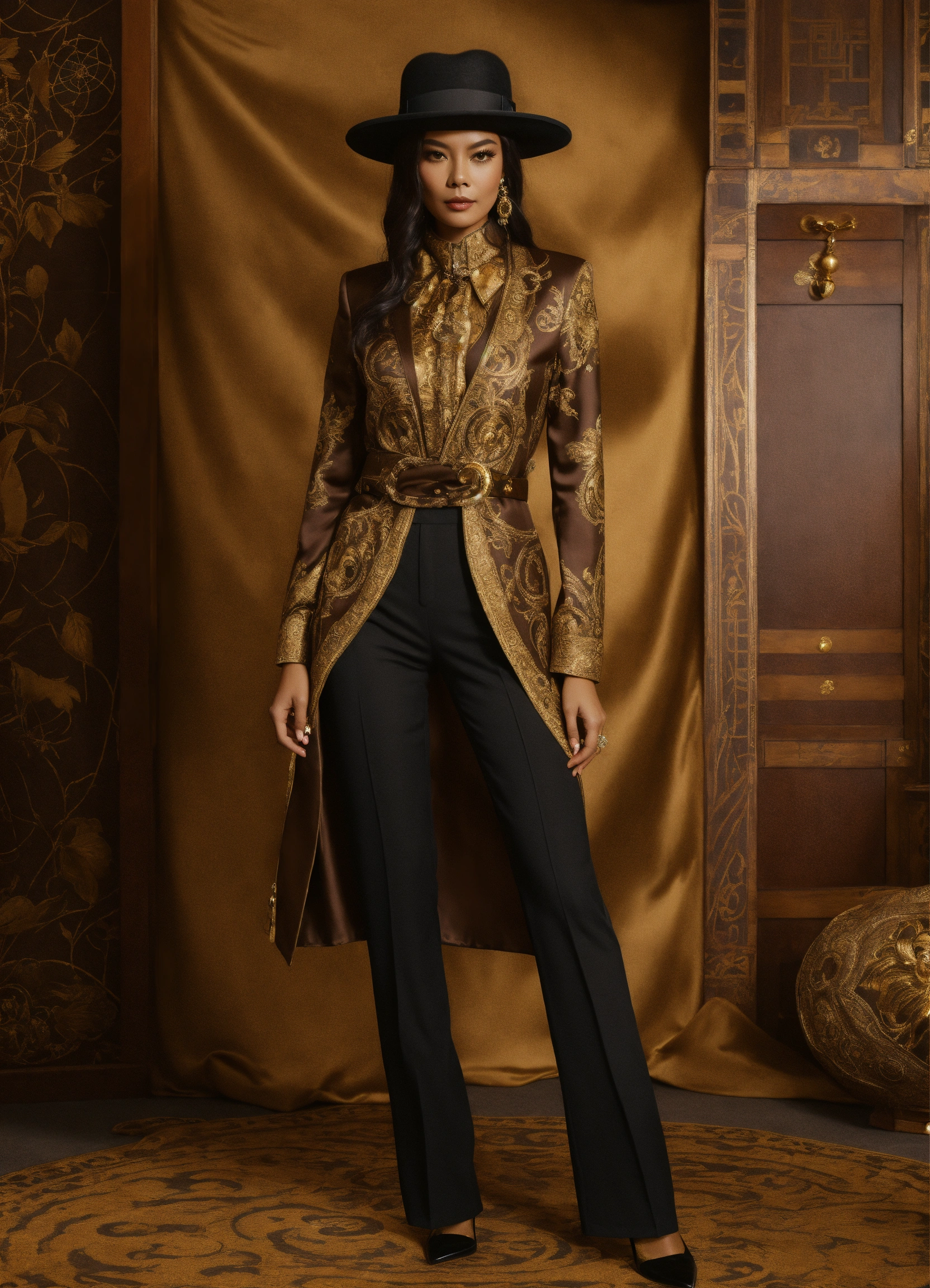 Dreamcatcher jiu glamorous brown and gold versace style silk outfit with pants and heeled boots and a bowler hat