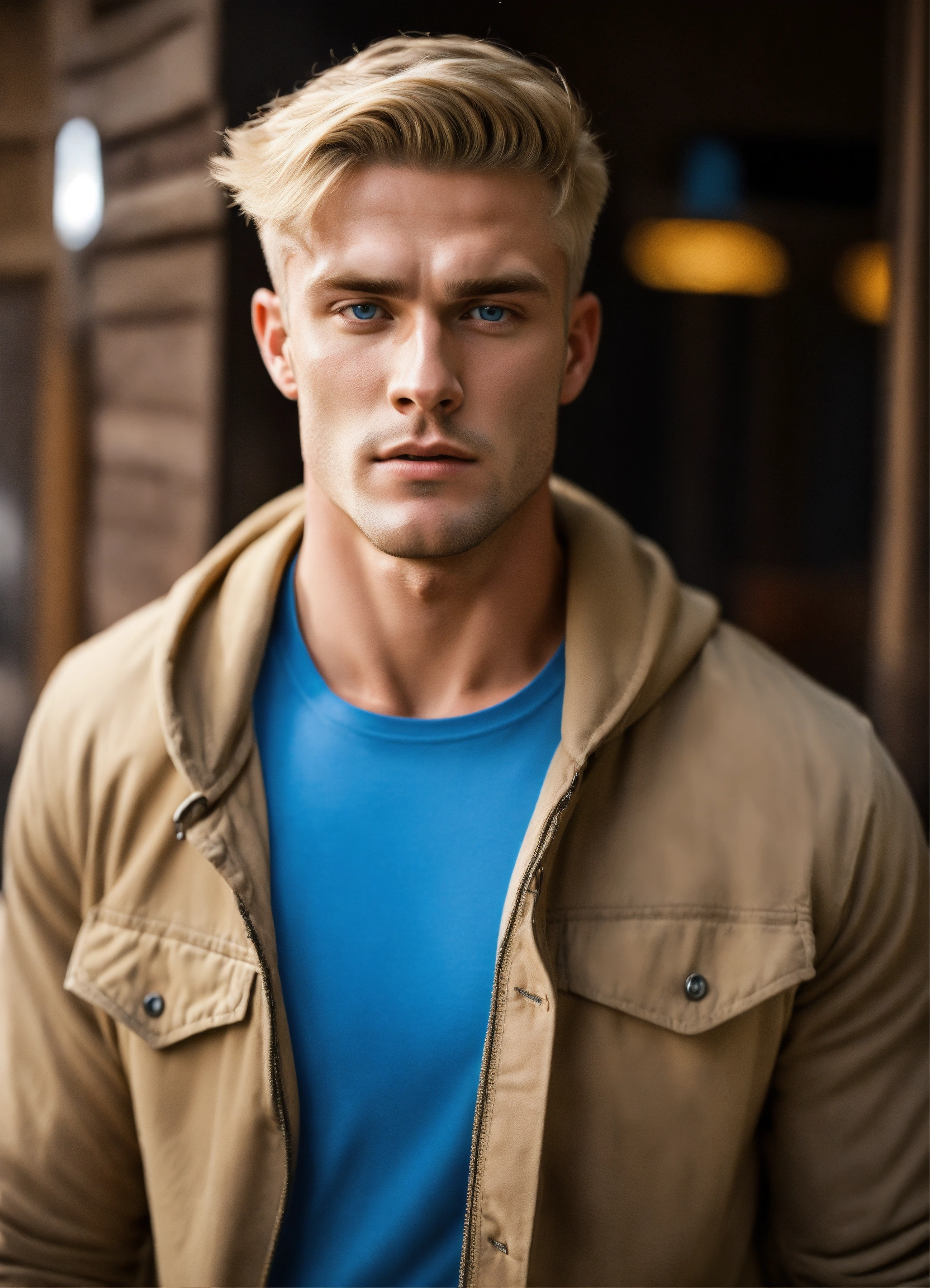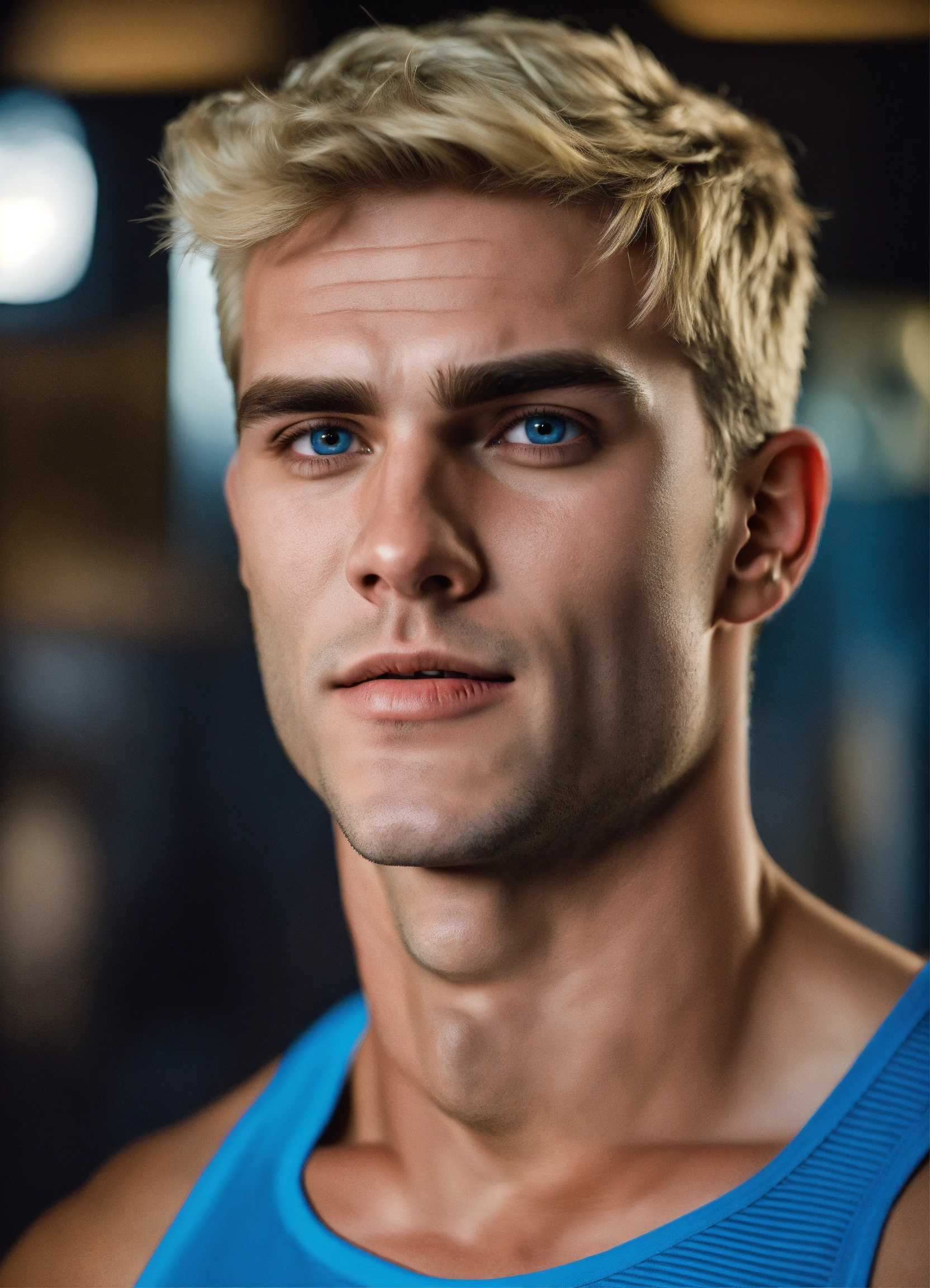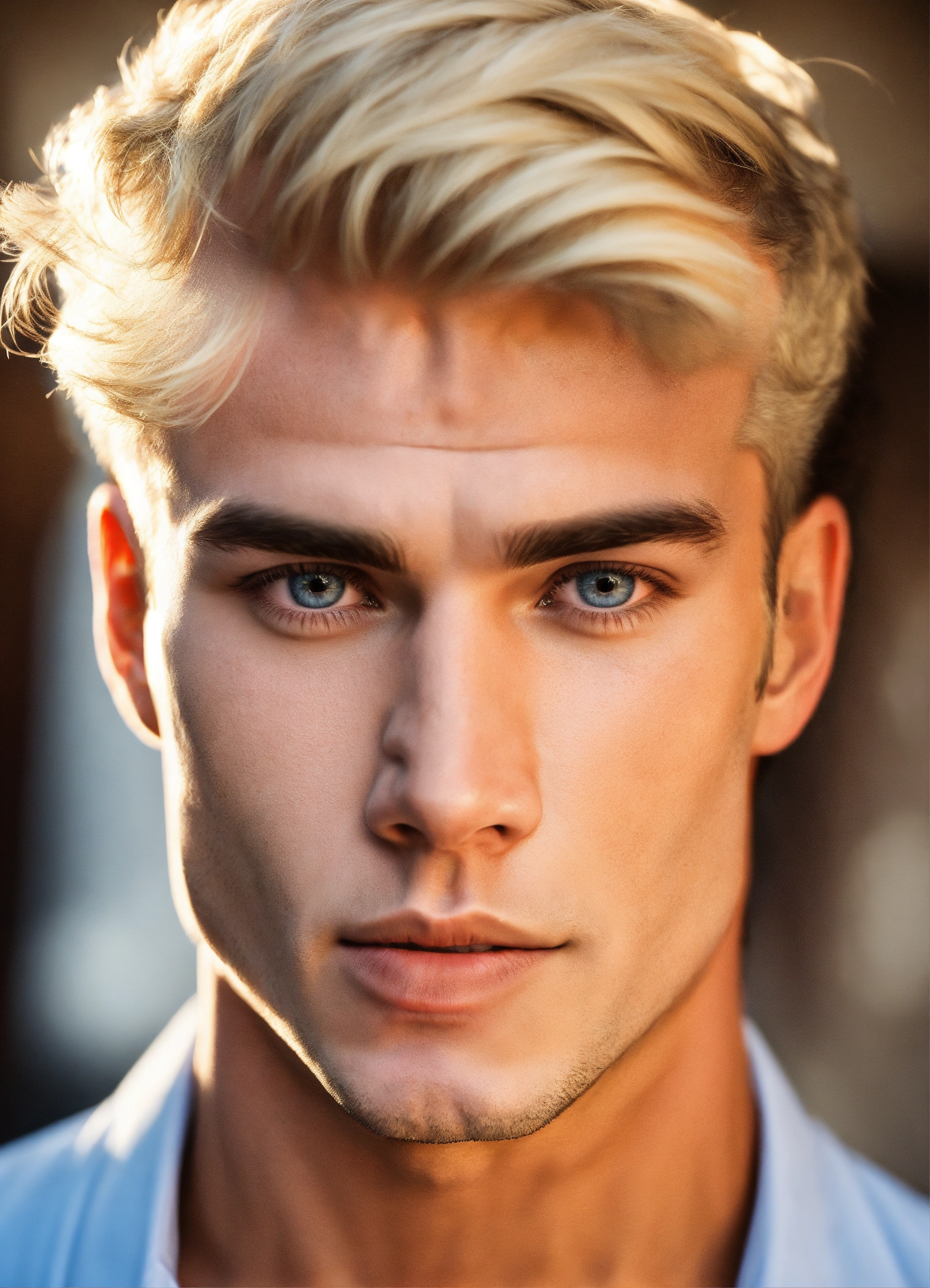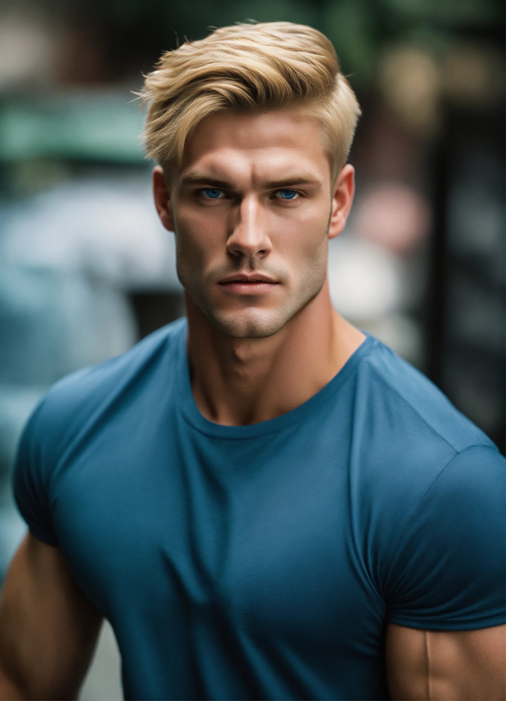 A strong muscular fit perfect face clean-shaven aryan man with short blonde hair blue eyes and square jaws, masculine