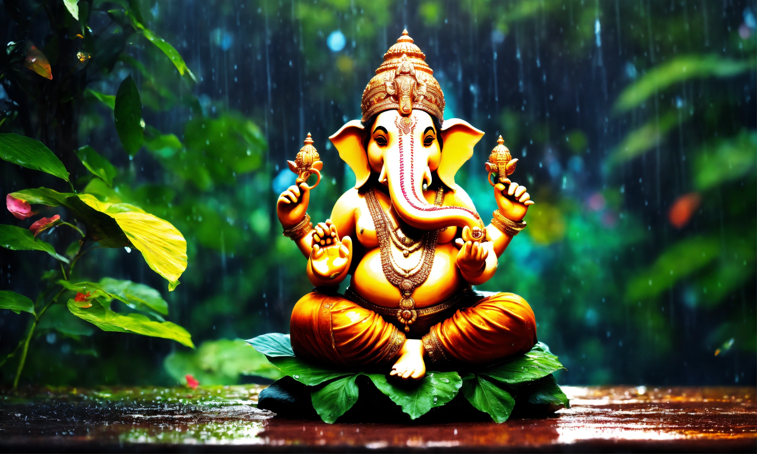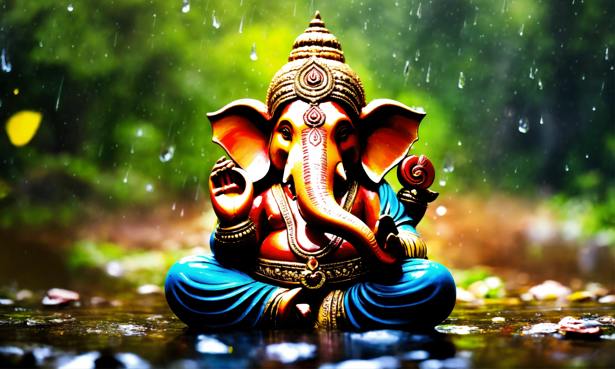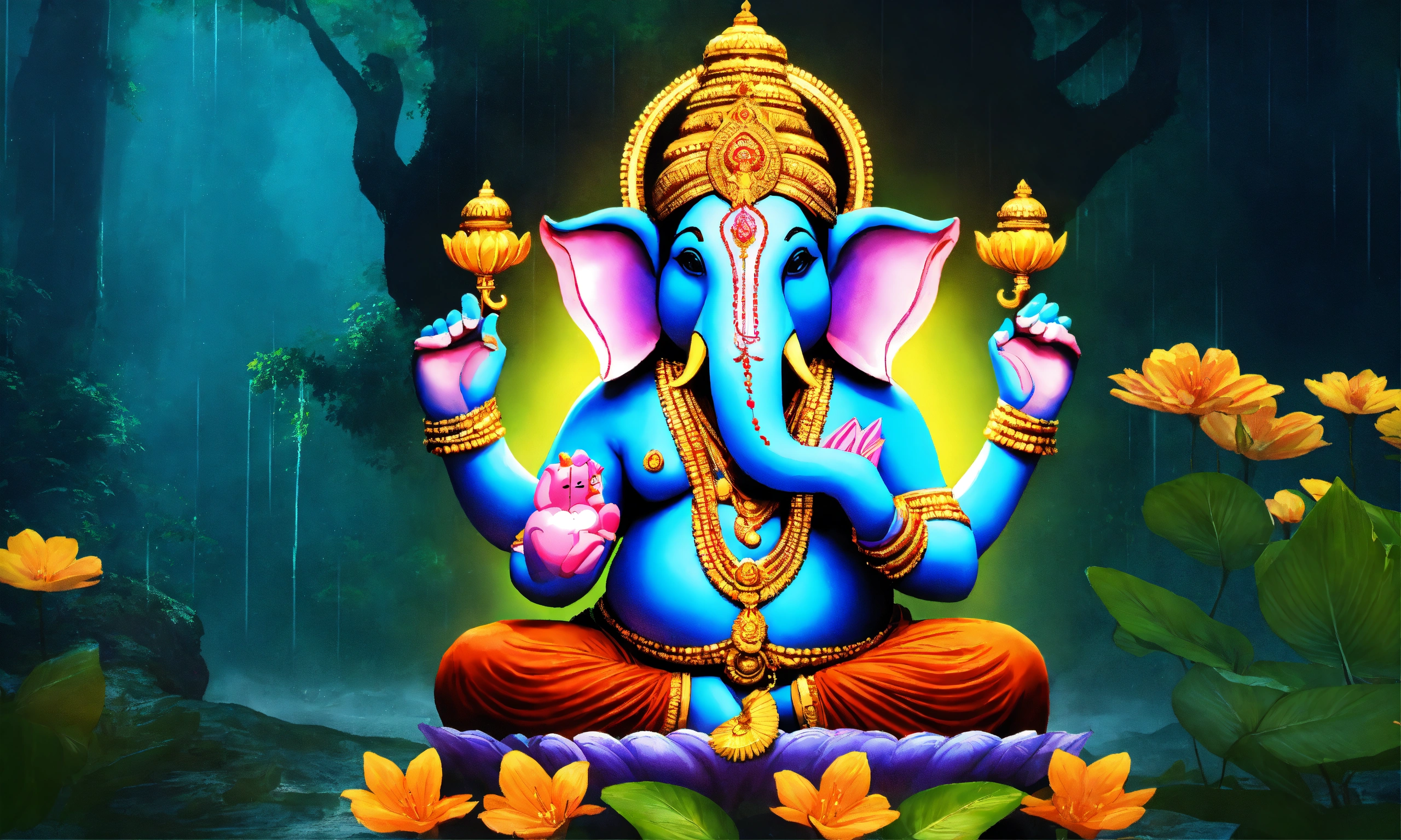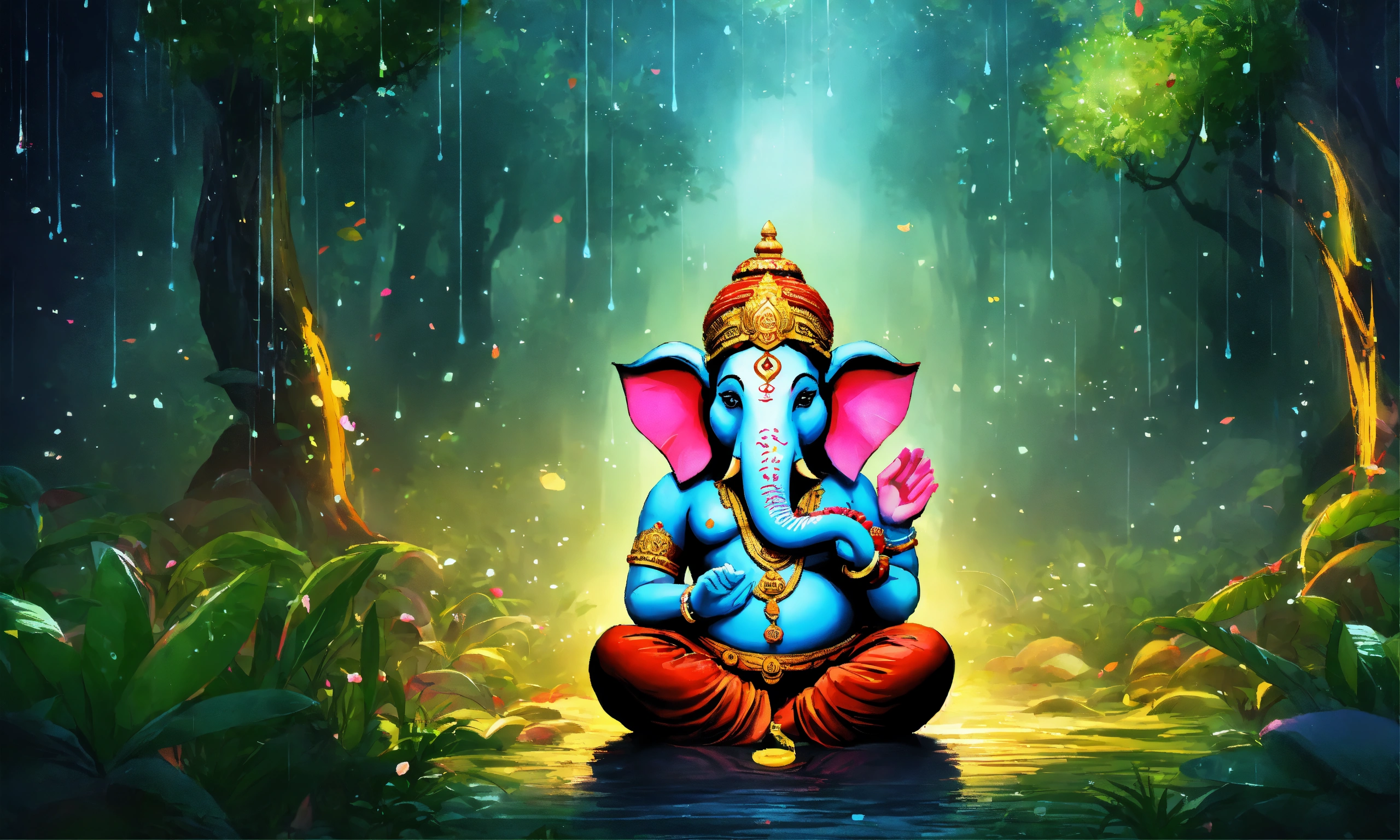 Lord ganesha with illustration, dark background, colorful, in rain and forest, wide view and 169 ratio