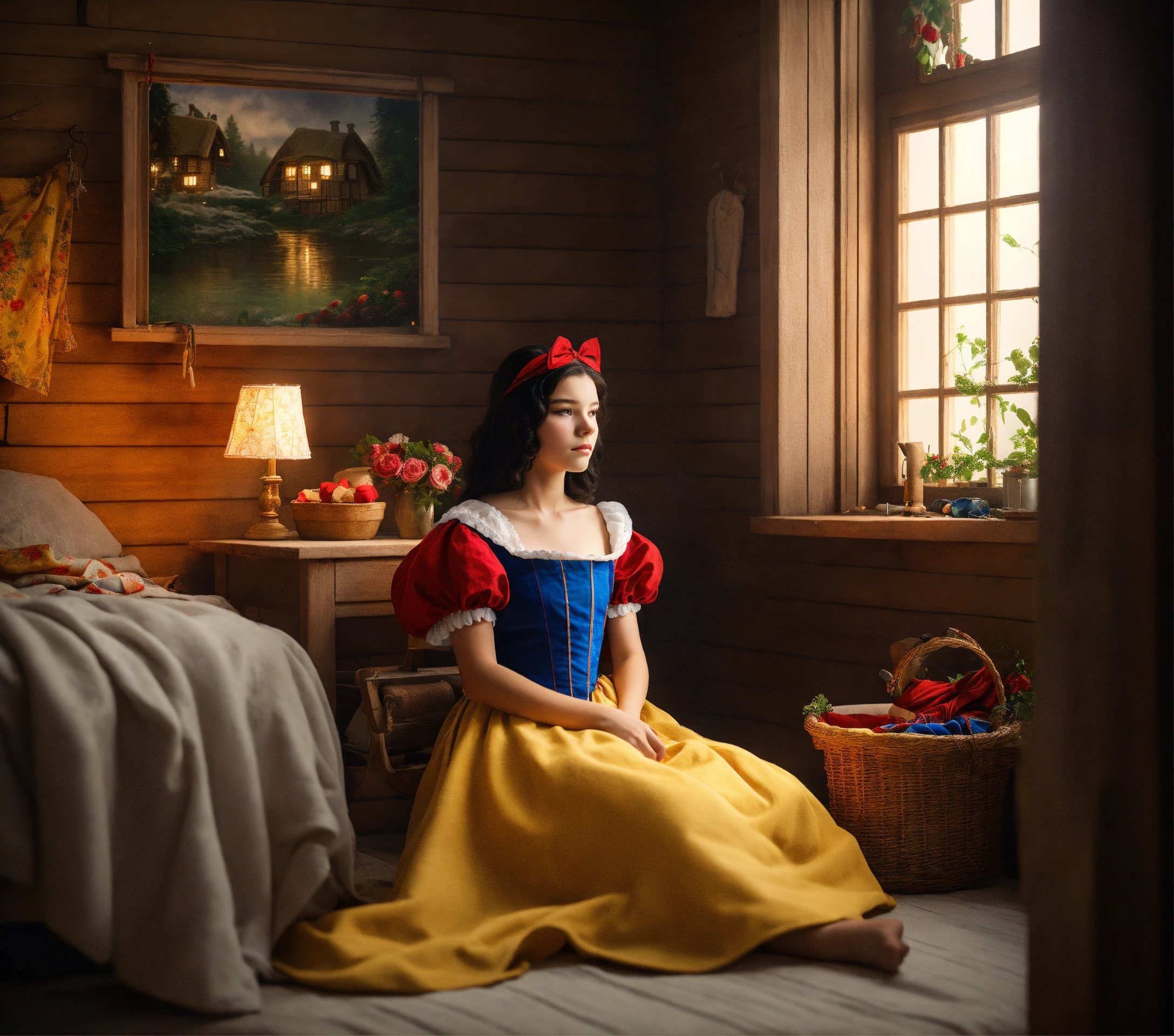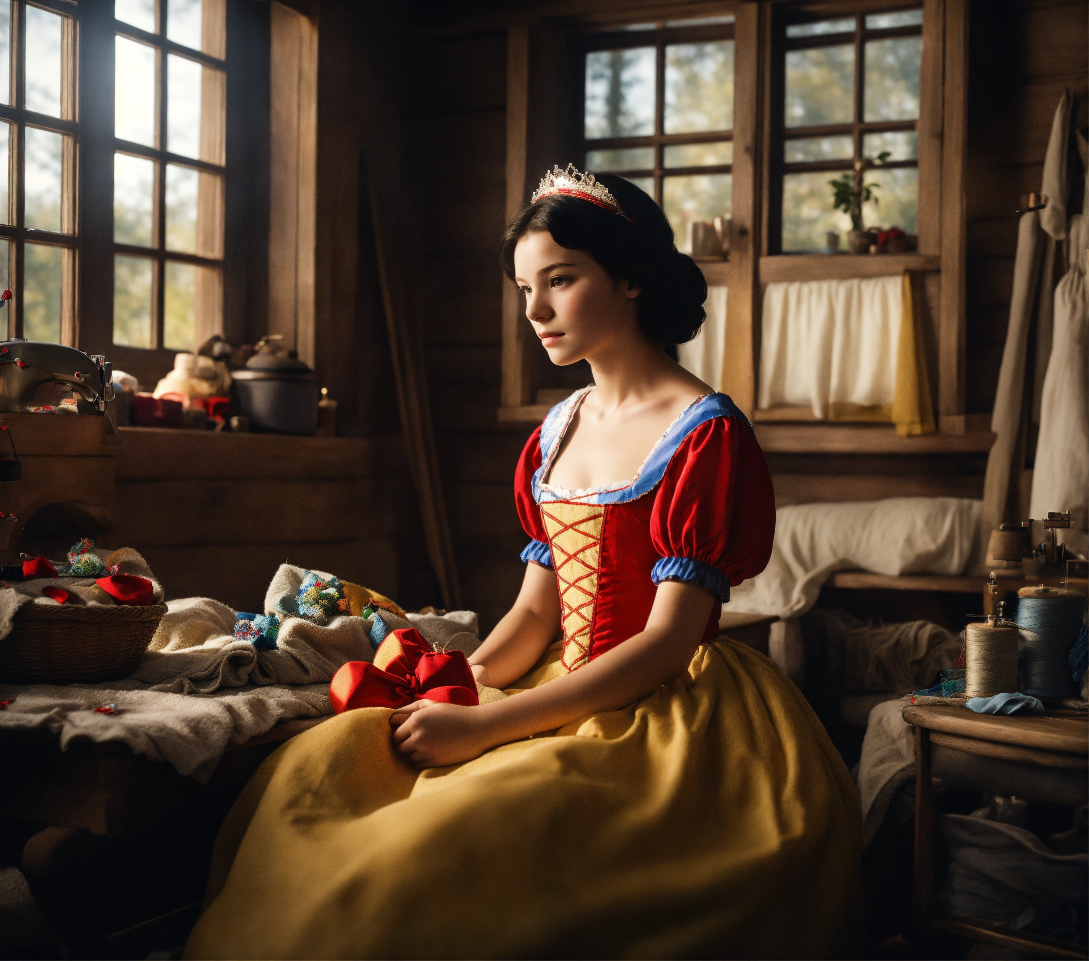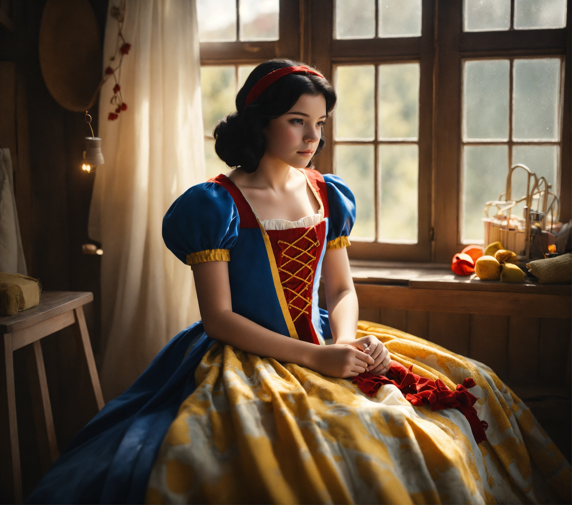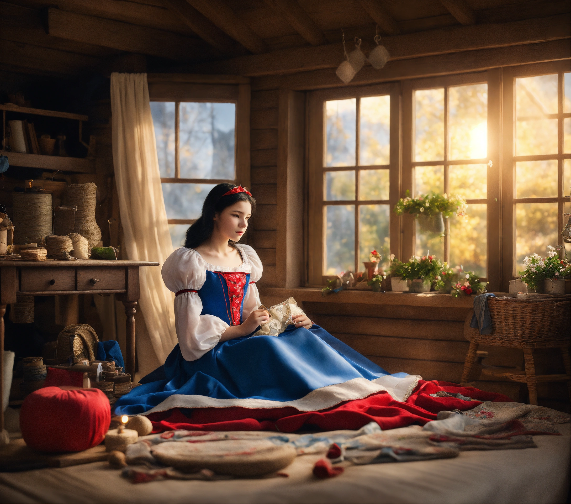 Princess snow white 15 years old in the cottage bedroom, sitting near a window and sewing a fabric, realistic photograph 8k